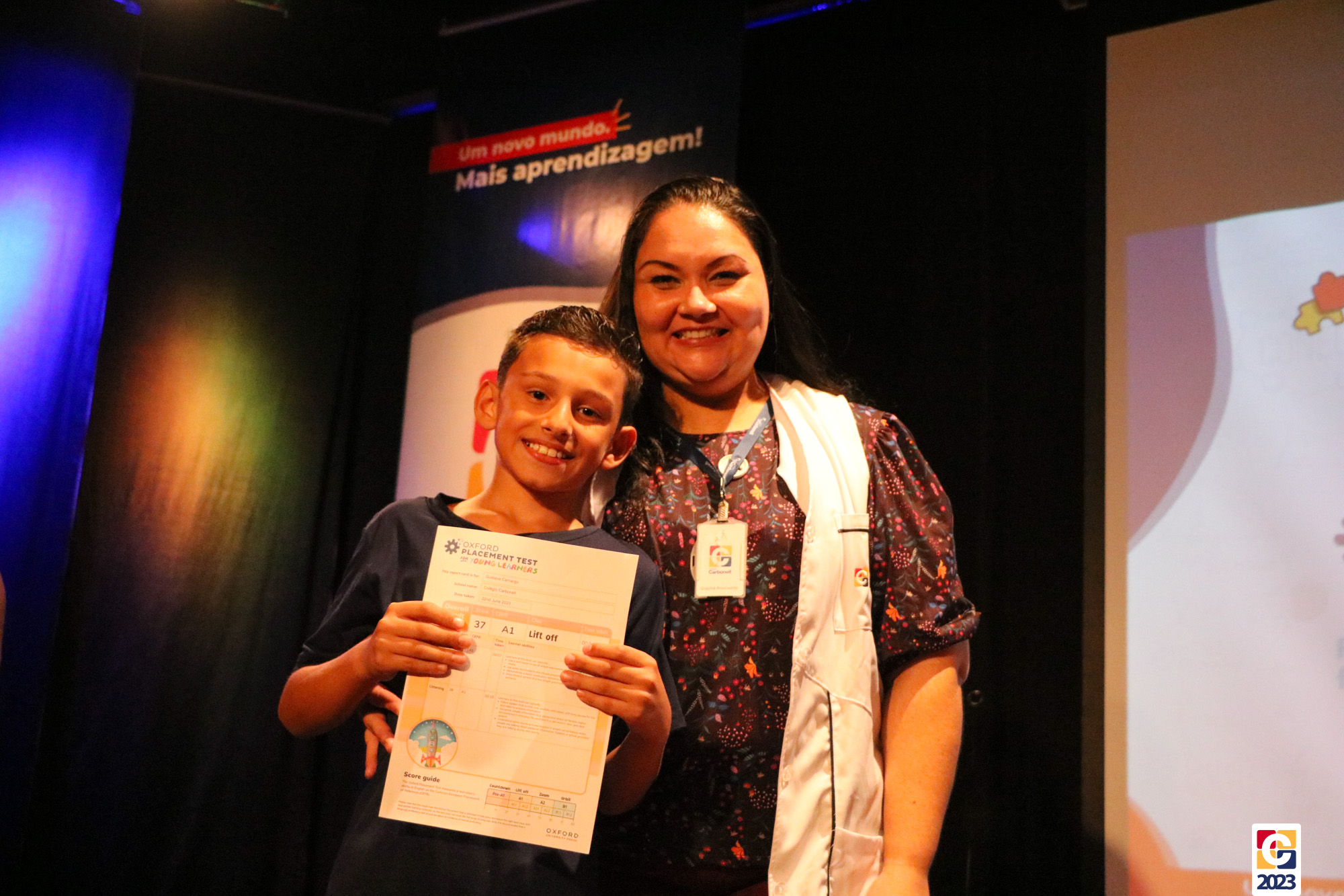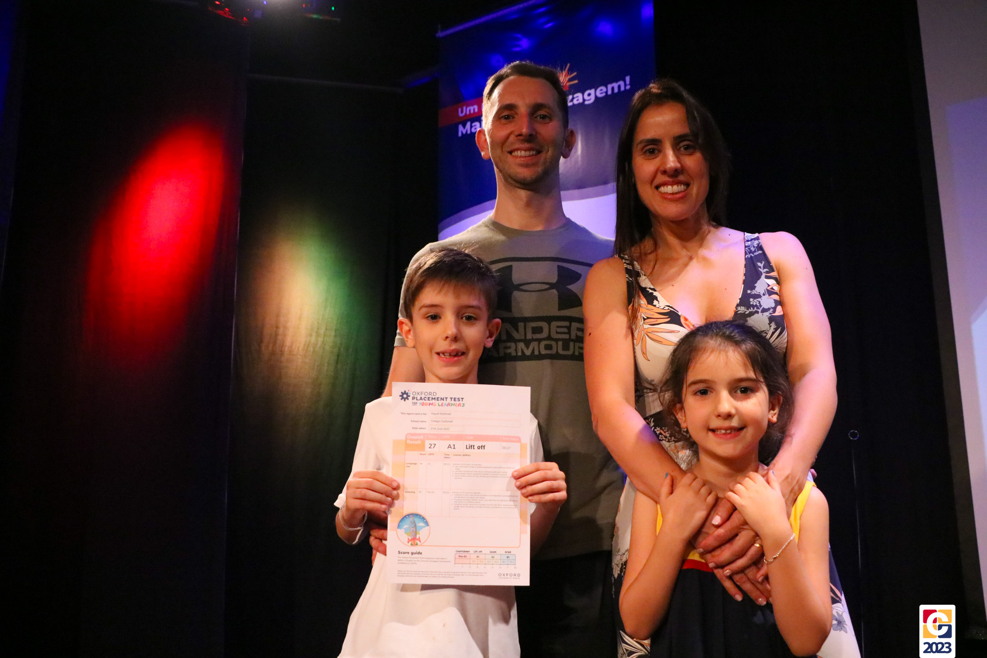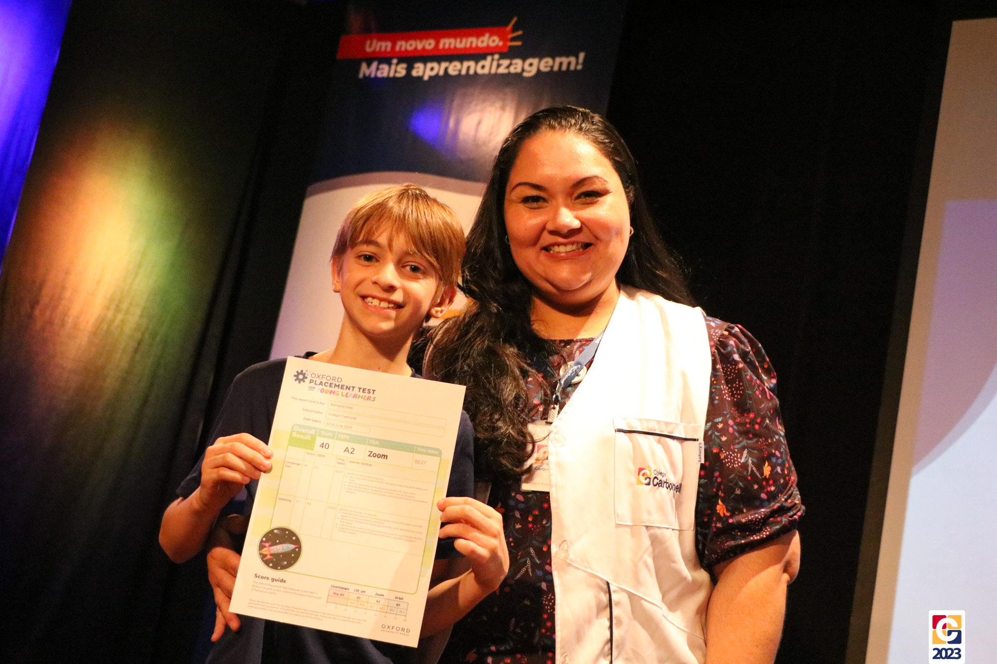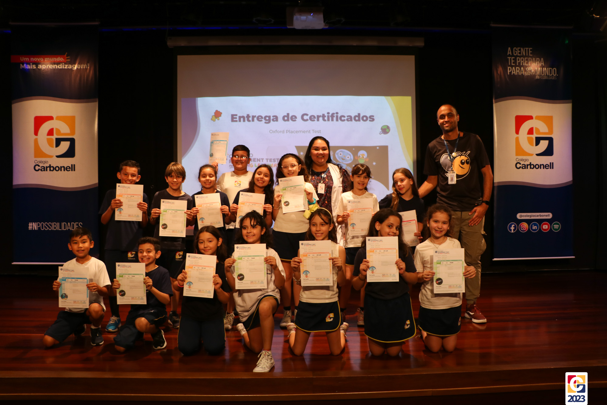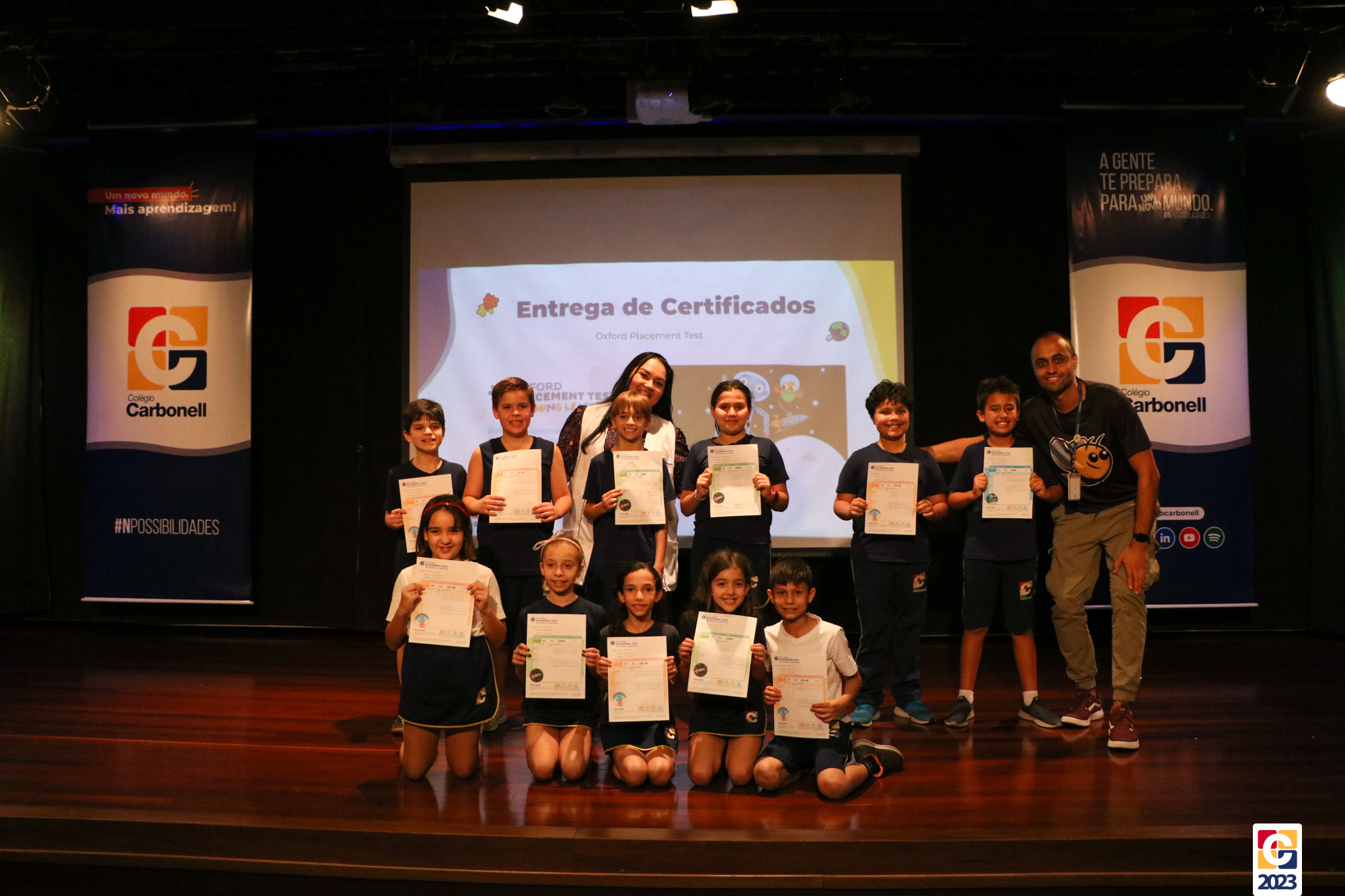 Em setembro, estudantes das turmas dos anos iniciais, de 3º ao 5º anos, receberam os certificados do Oxford Placement Test no palco do Teatro Oswaldo Mazoni. 🎭