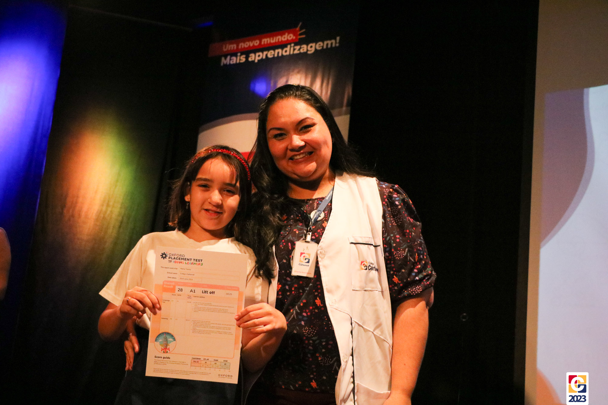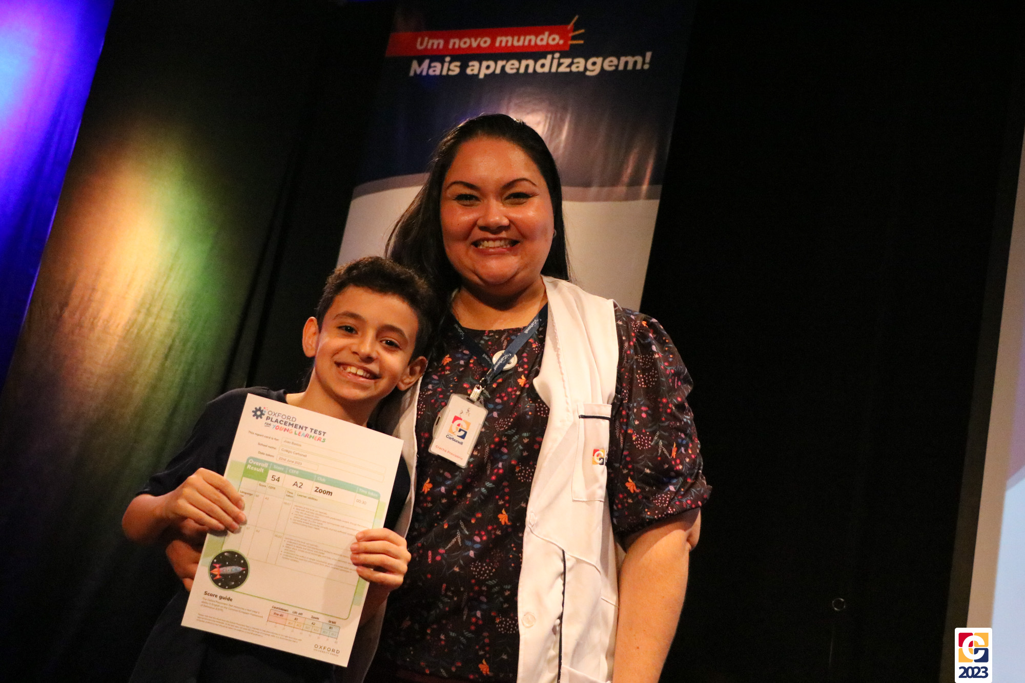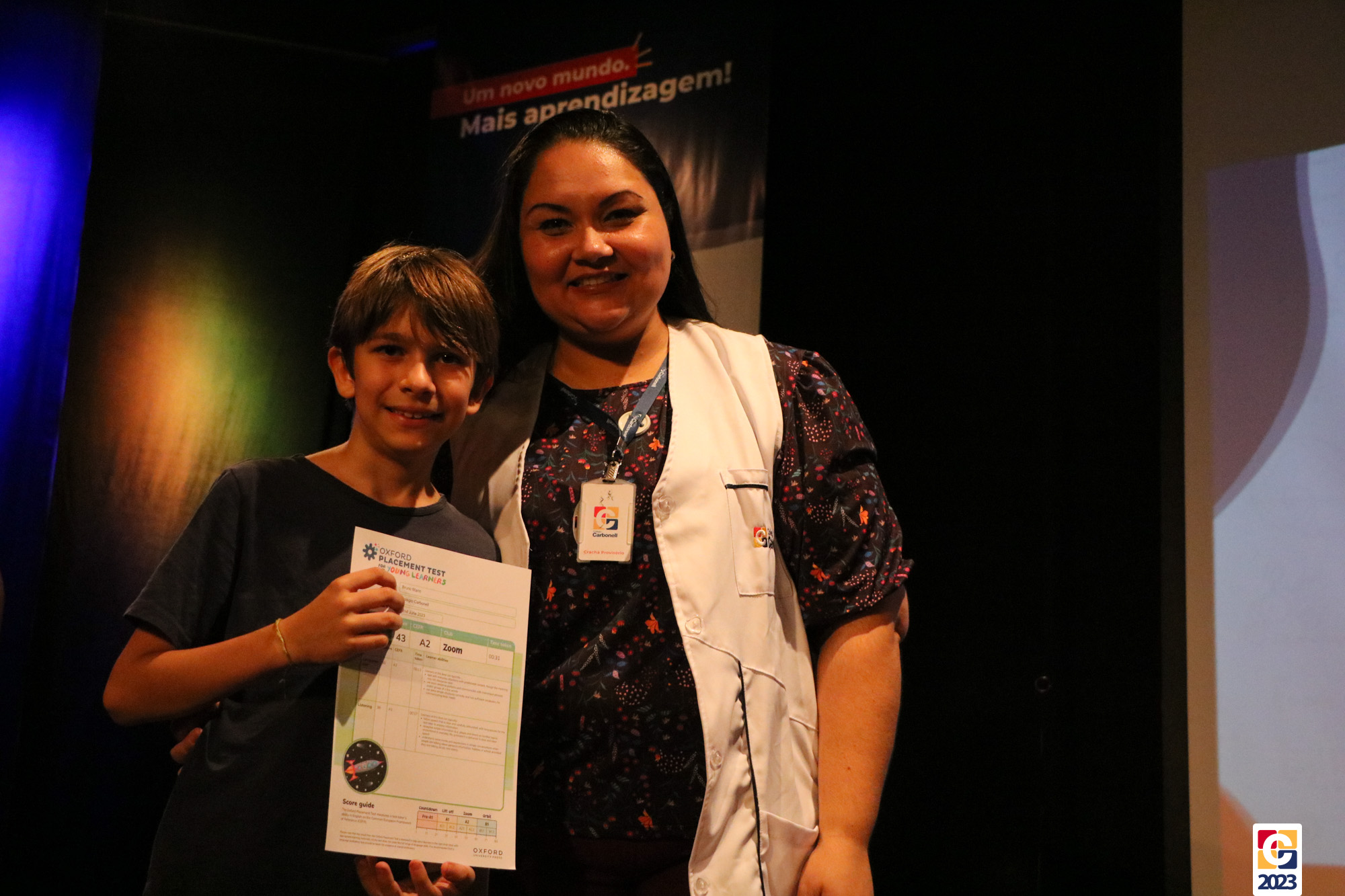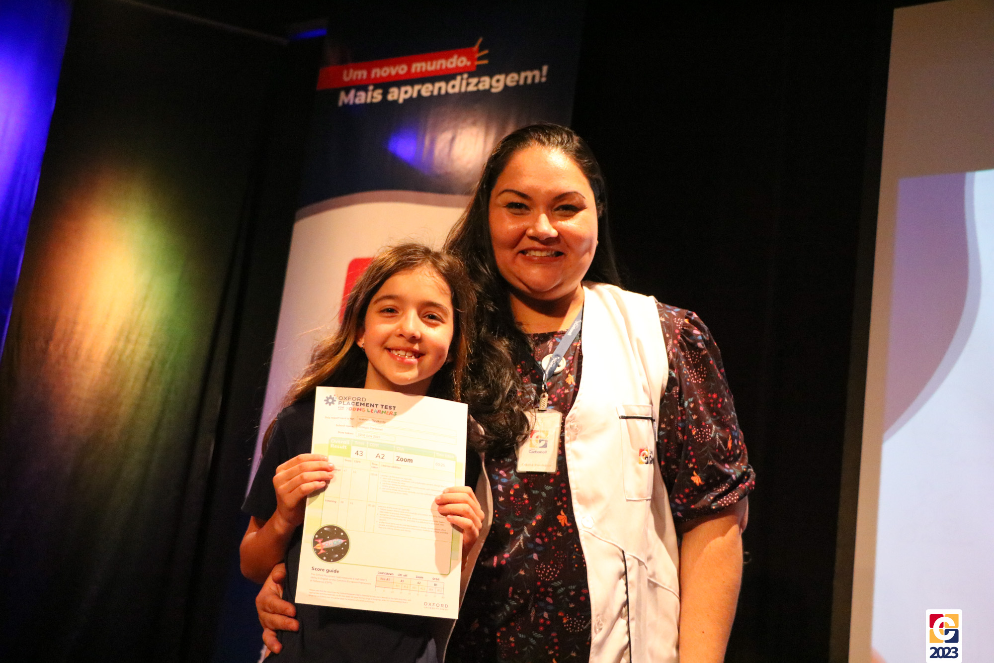 Em setembro, estudantes das turmas dos anos iniciais, de 3º ao 5º anos, receberam os certificados do Oxford Placement Test no palco do Teatro Oswaldo Mazoni. 🎭