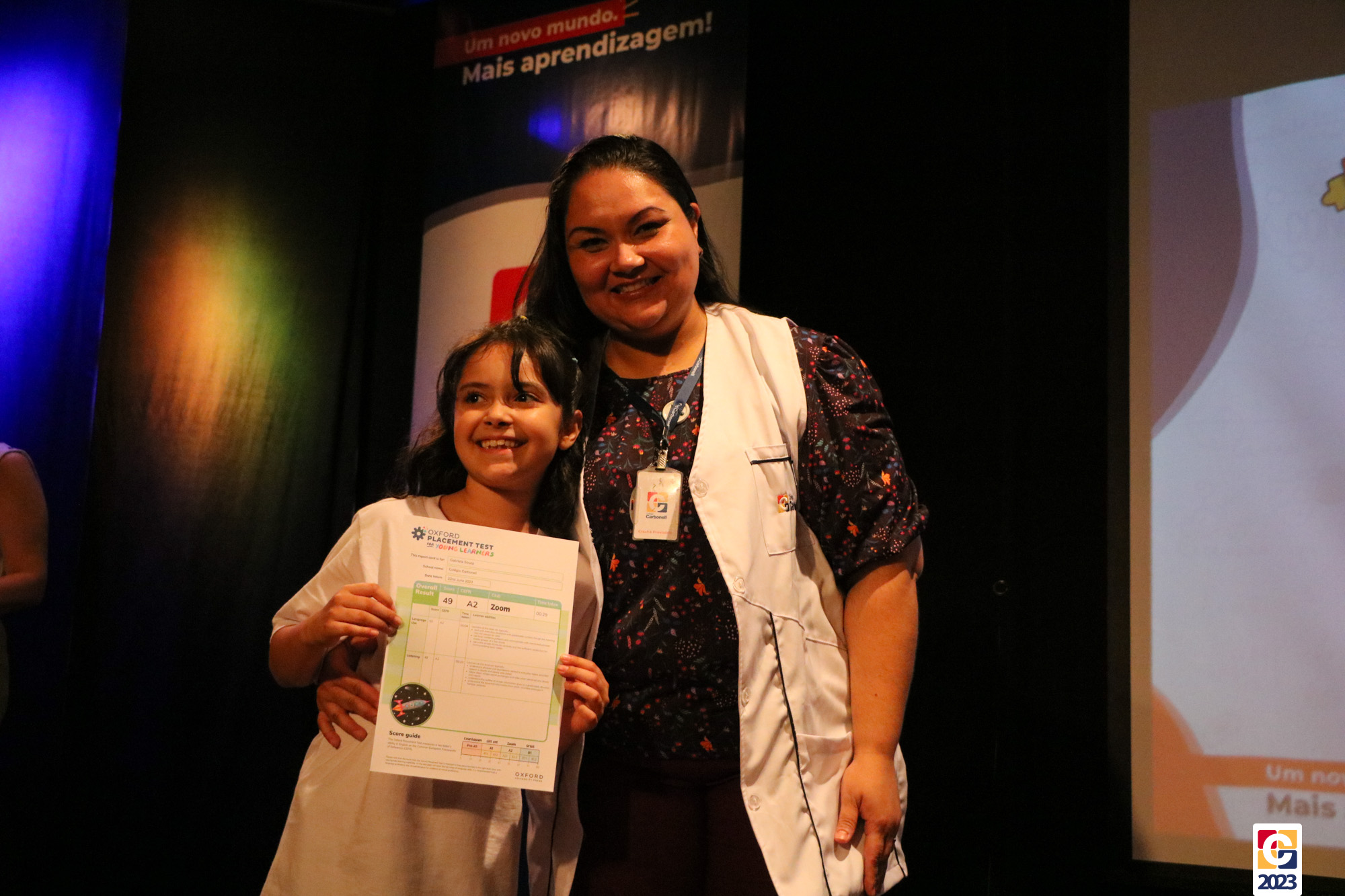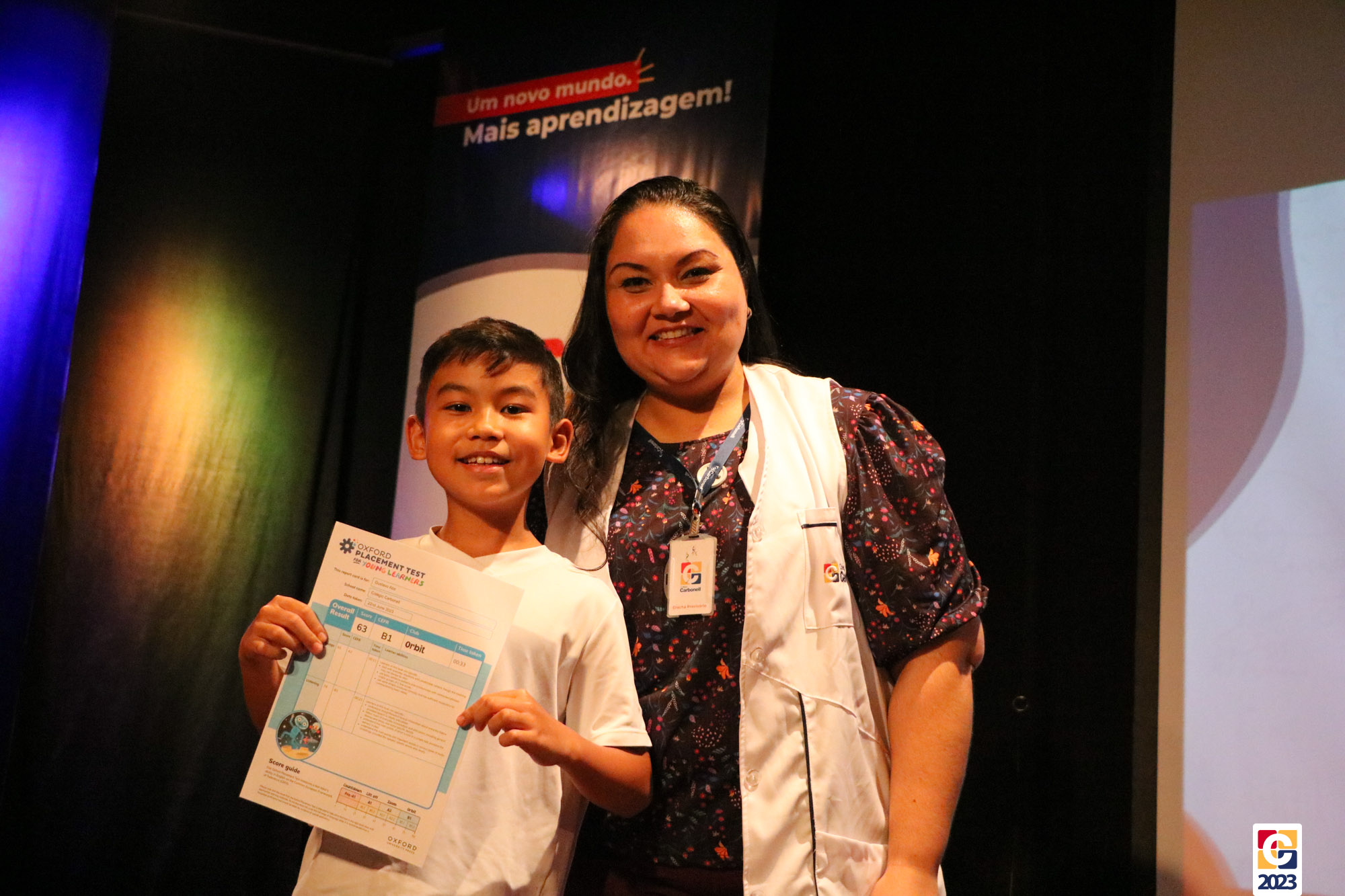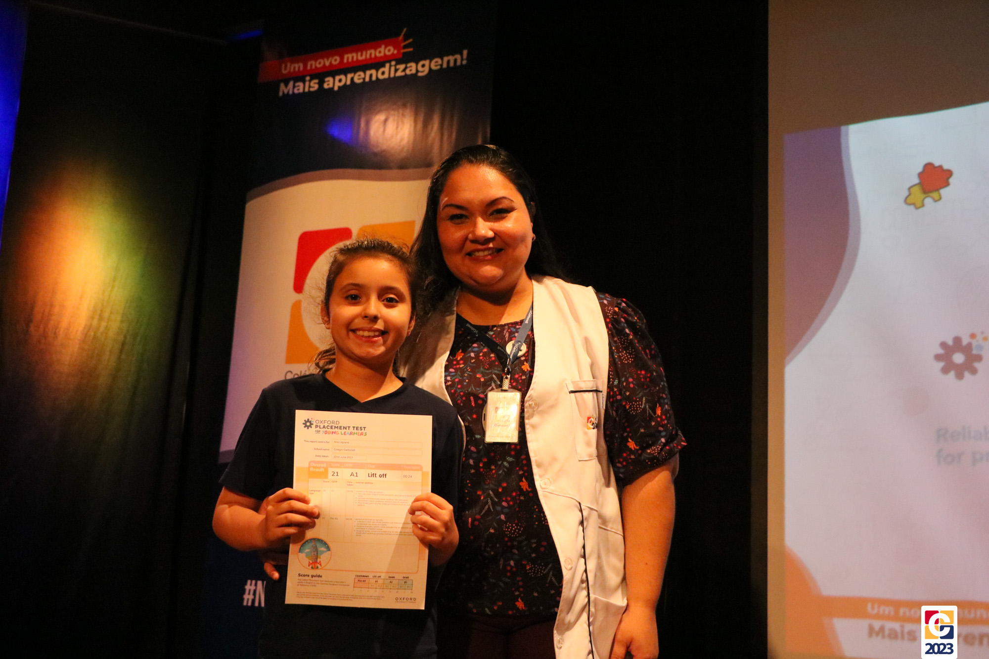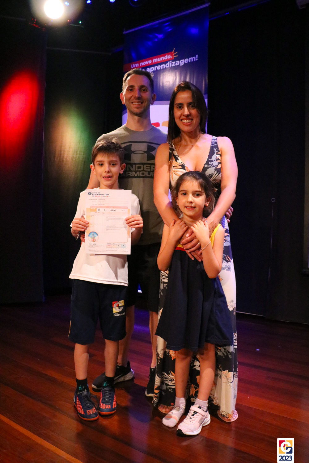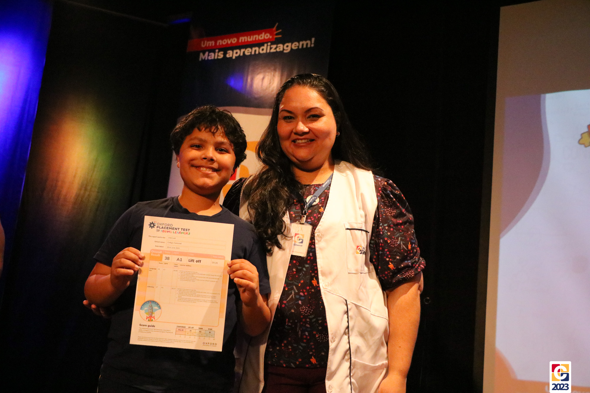 Em setembro, estudantes das turmas dos anos iniciais, de 3º ao 5º anos, receberam os certificados do Oxford Placement Test no palco do Teatro Oswaldo Mazoni. 🎭