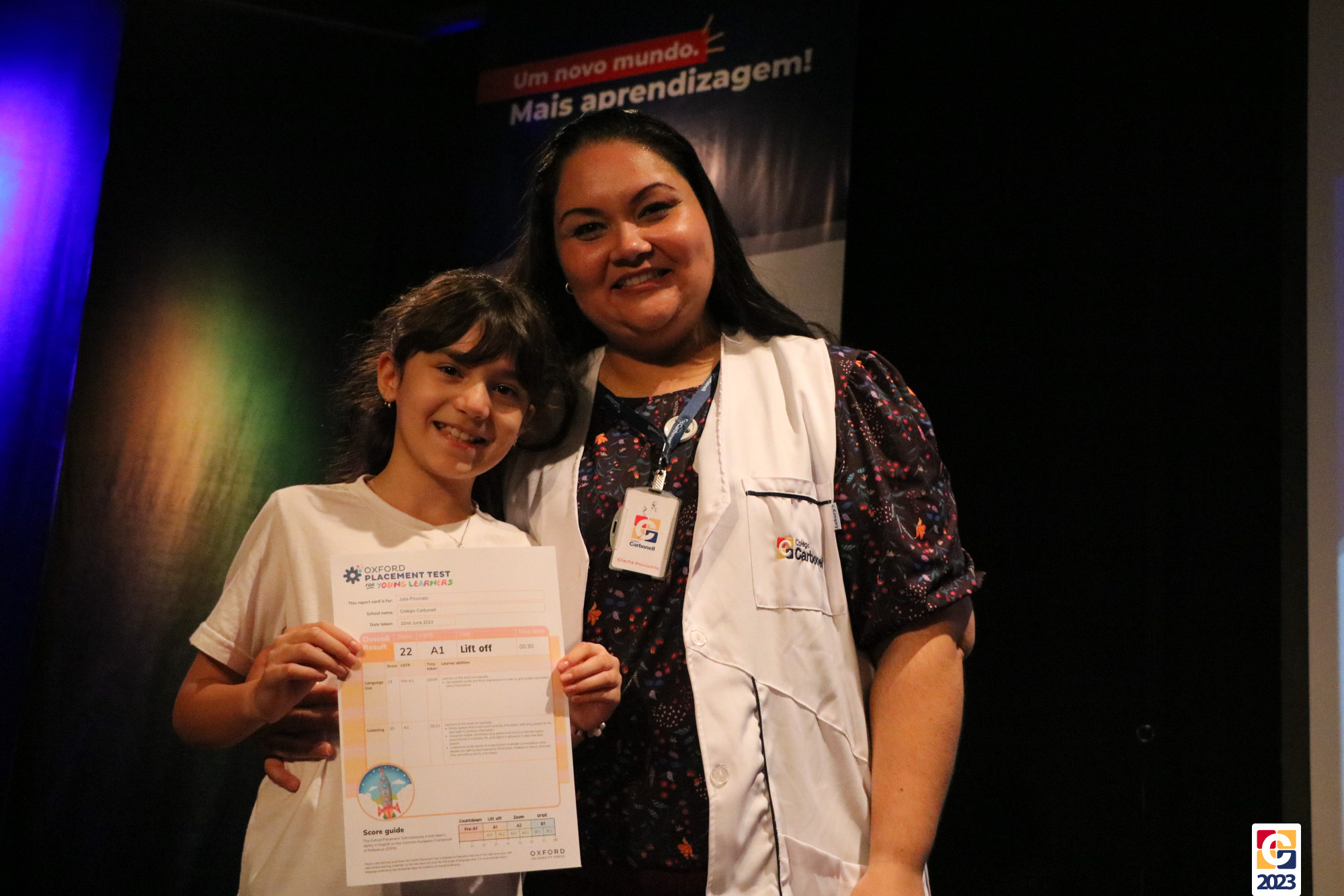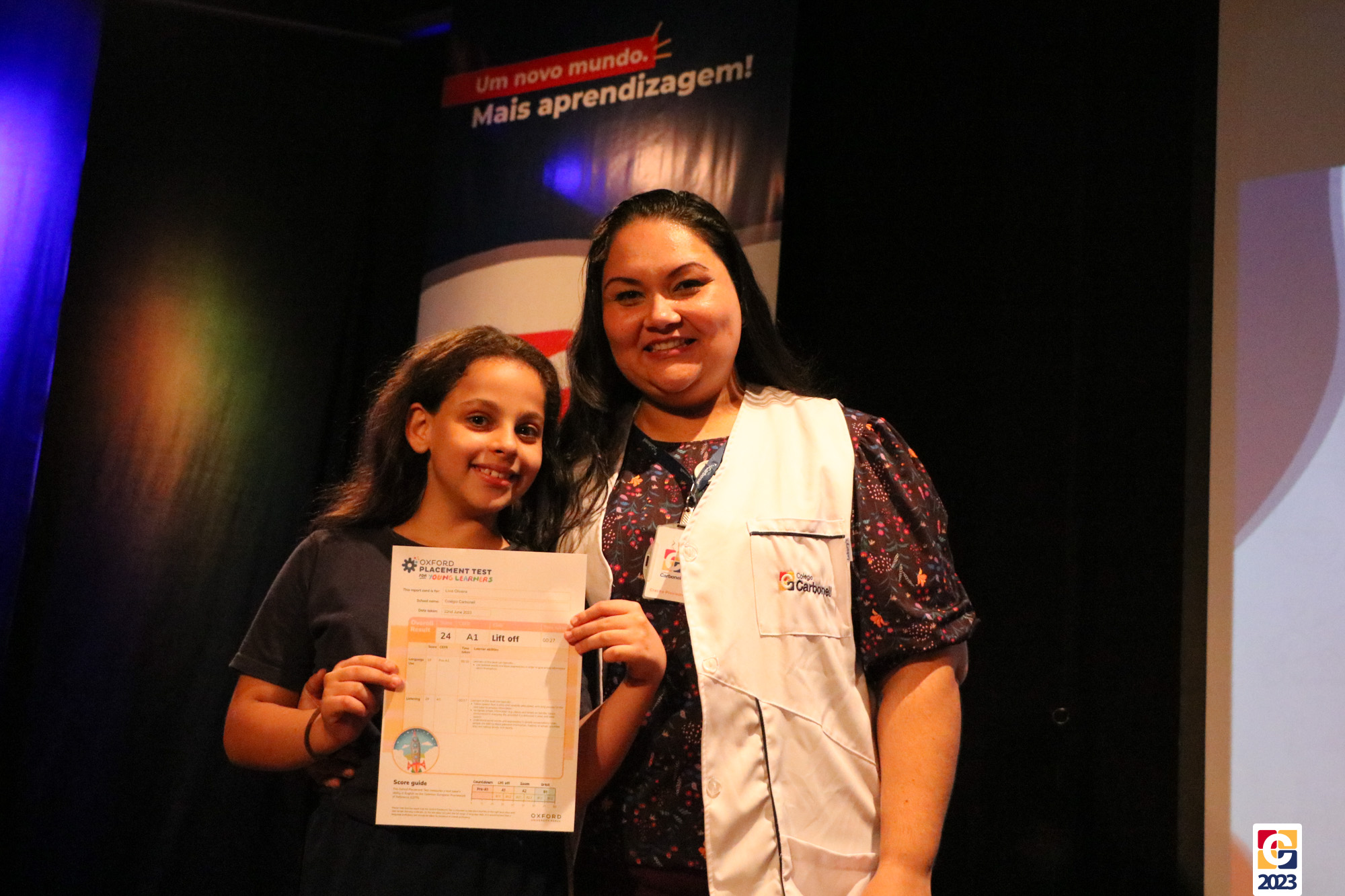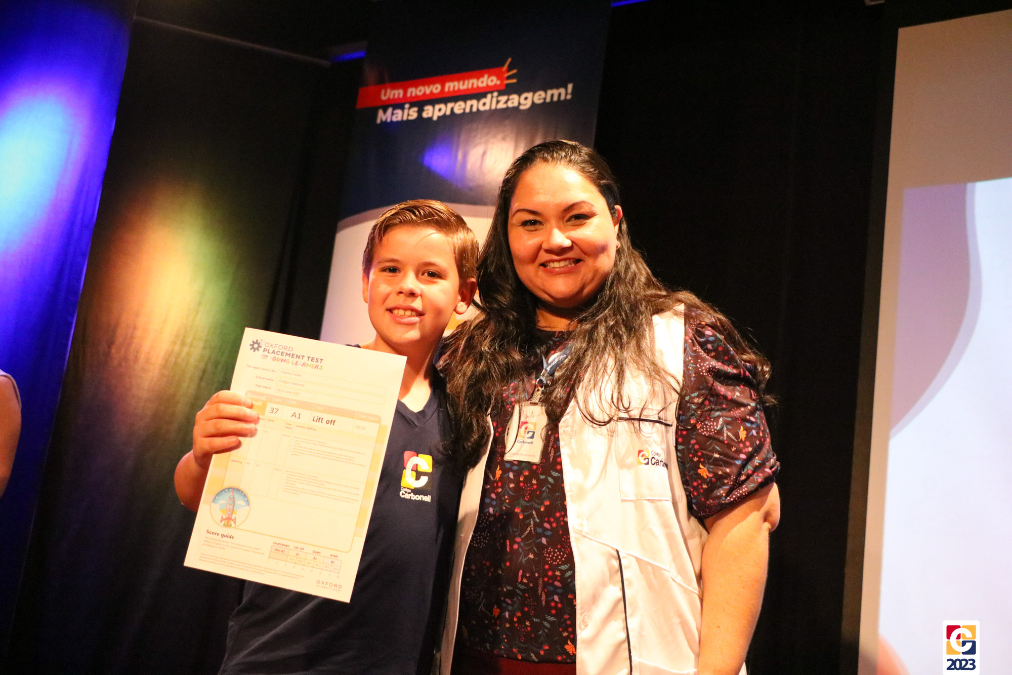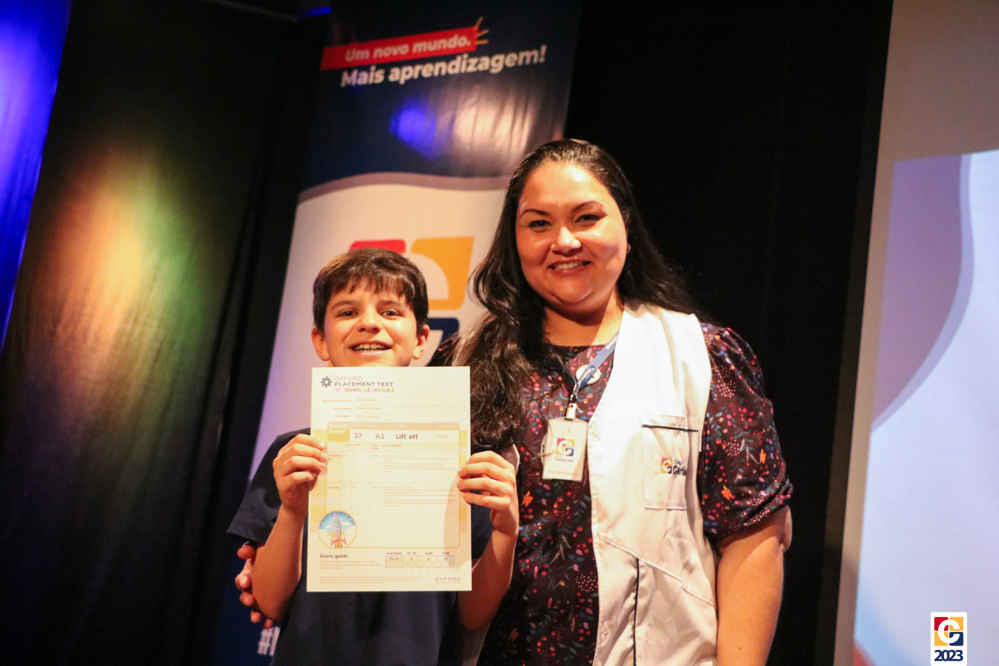 Em setembro, estudantes das turmas dos anos iniciais, de 3º ao 5º anos, receberam os certificados do Oxford Placement Test no palco do Teatro Oswaldo Mazoni. 🎭
