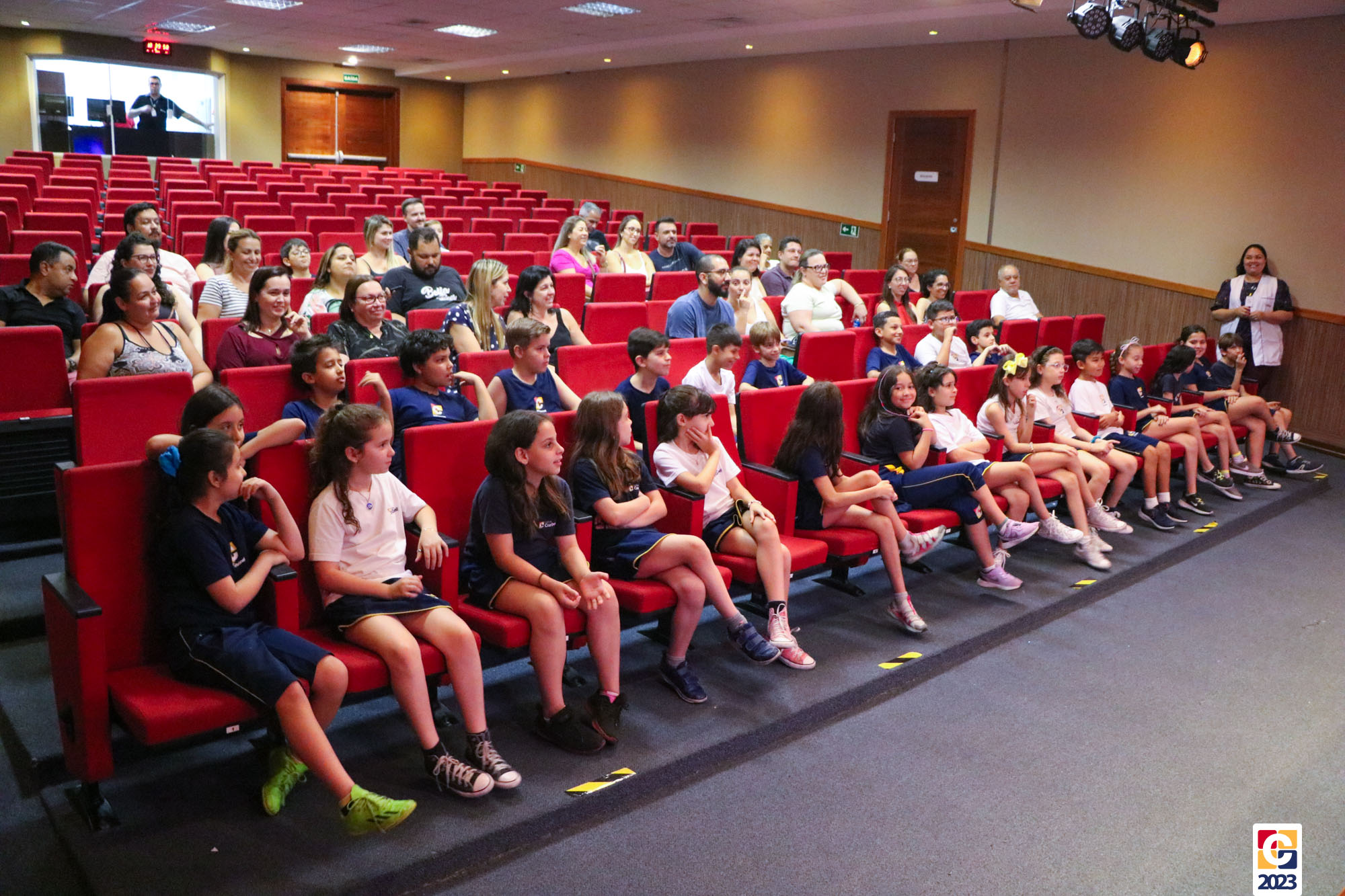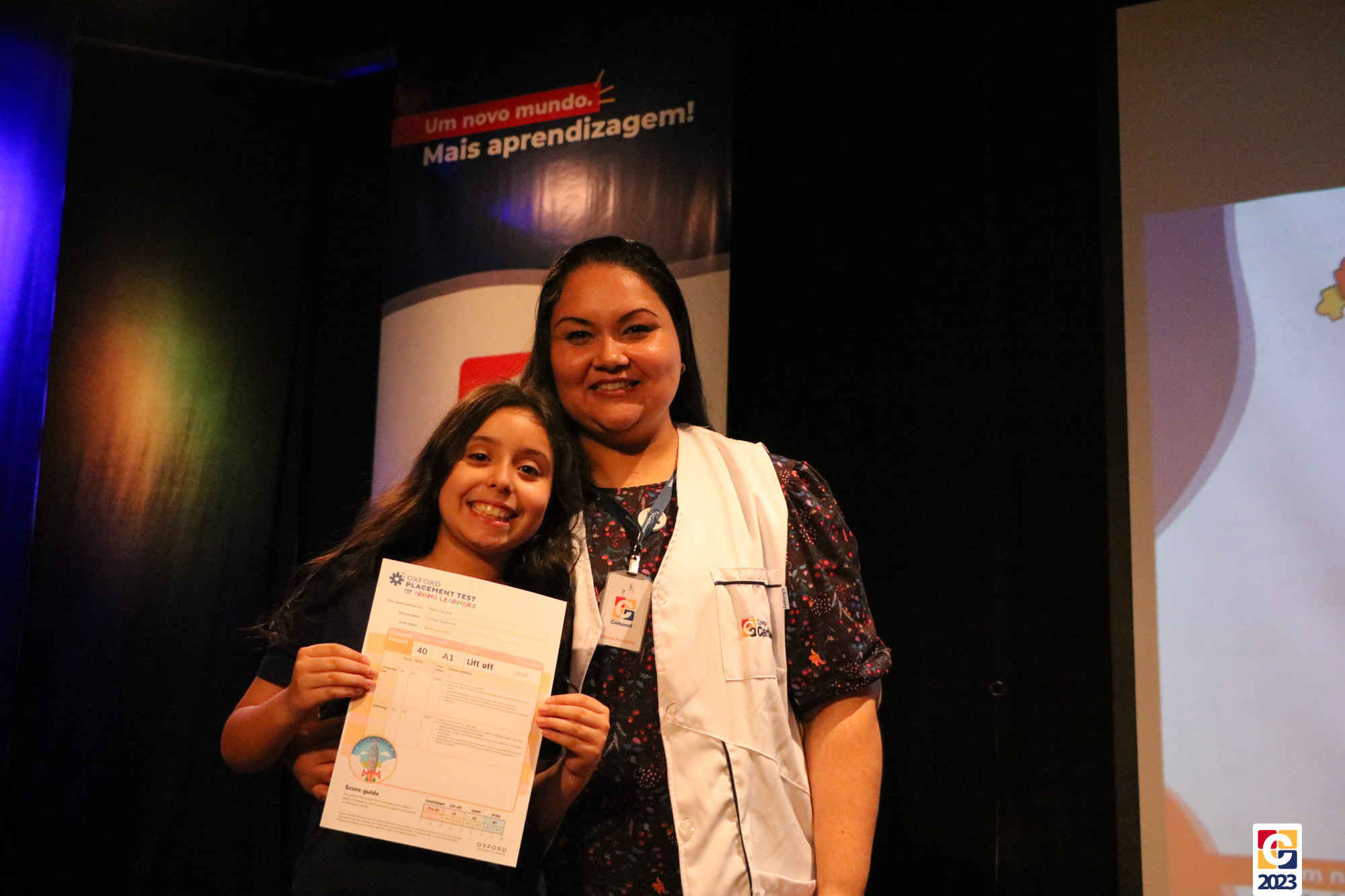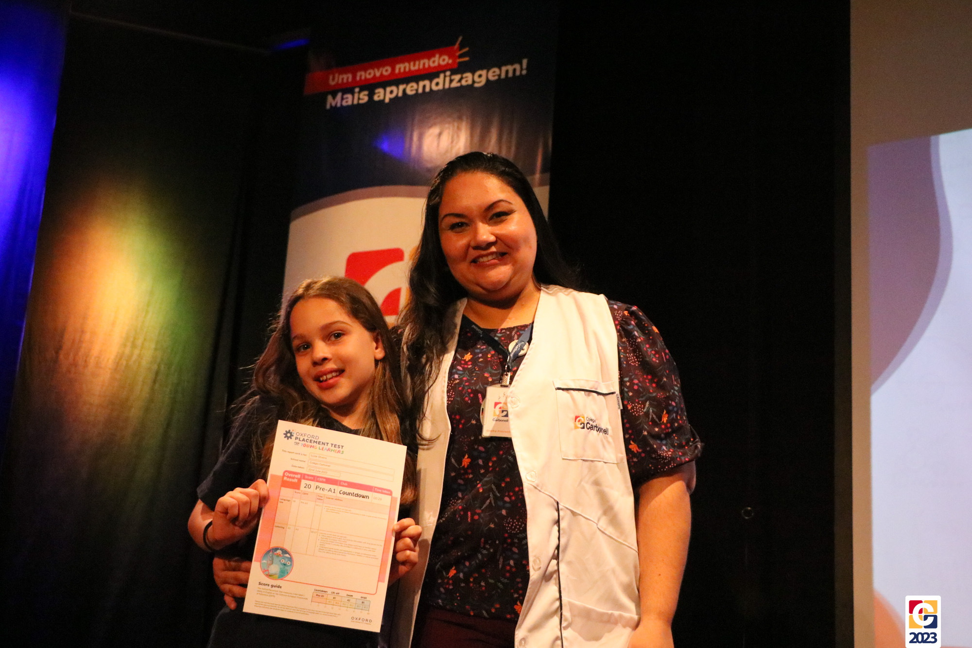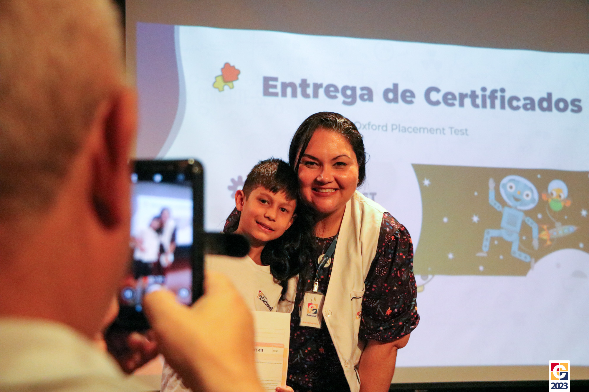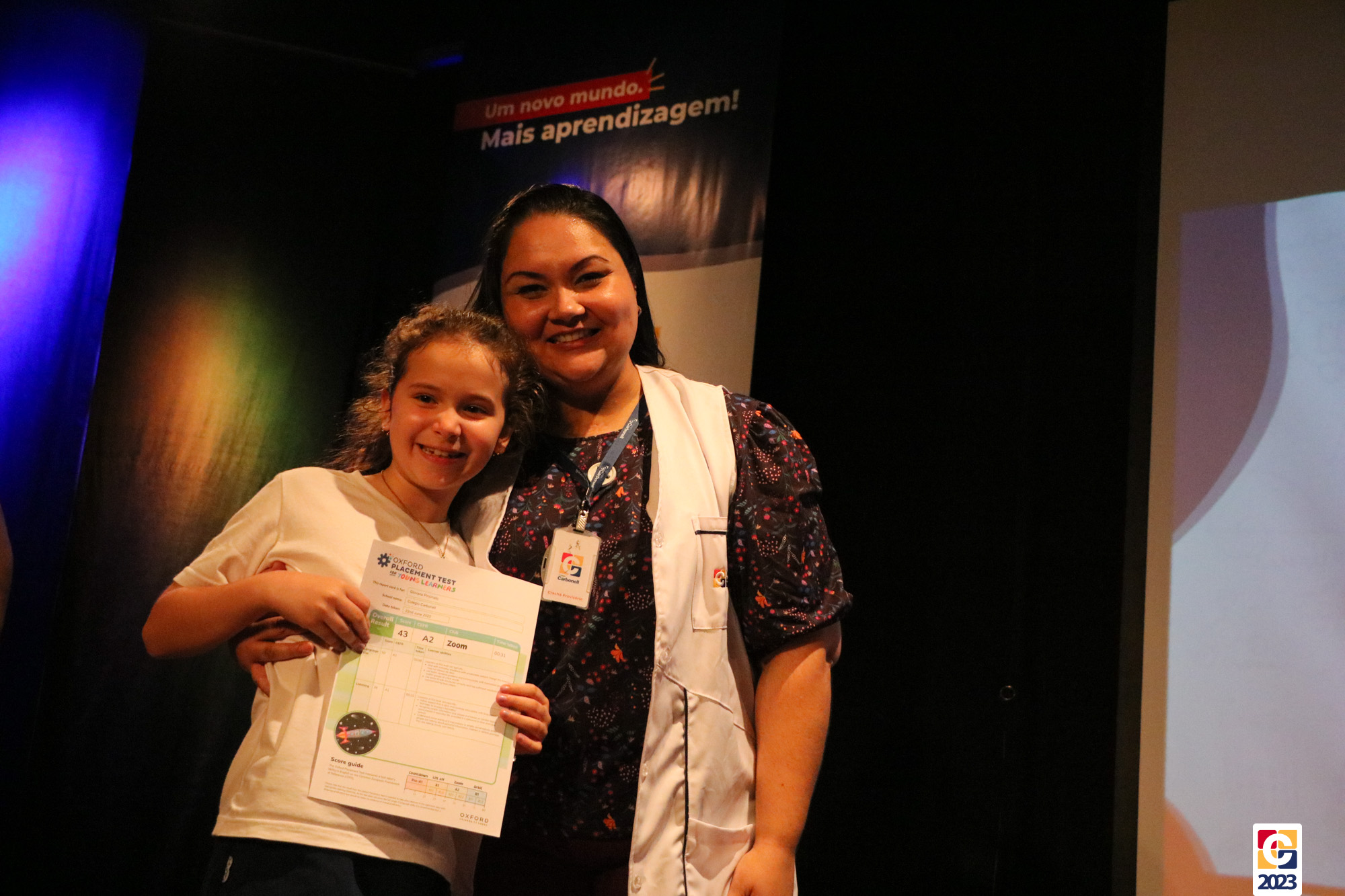 Em setembro, estudantes das turmas dos anos iniciais, de 3º ao 5º anos, receberam os certificados do Oxford Placement Test no palco do Teatro Oswaldo Mazoni. 🎭