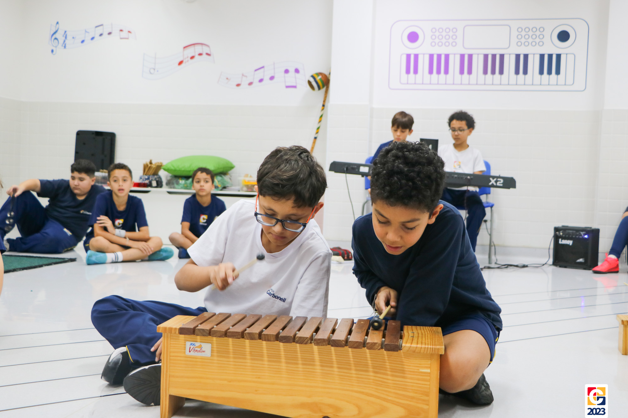 Utilizando instrumentos de percussão como xilofone, pandeiro, tambor, flauta e teclado, a aula tem como objetivo desenvolver ritmo, musicalidade, sensibilidade e percepção auditiva, entre outras habilidades. 🎹🥁