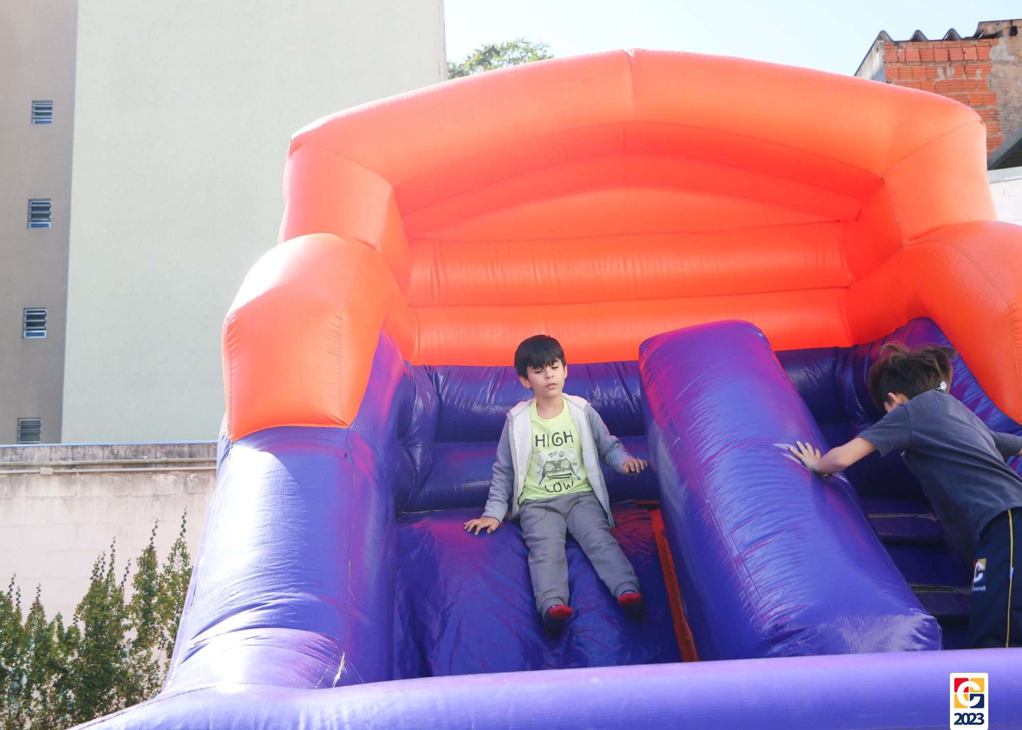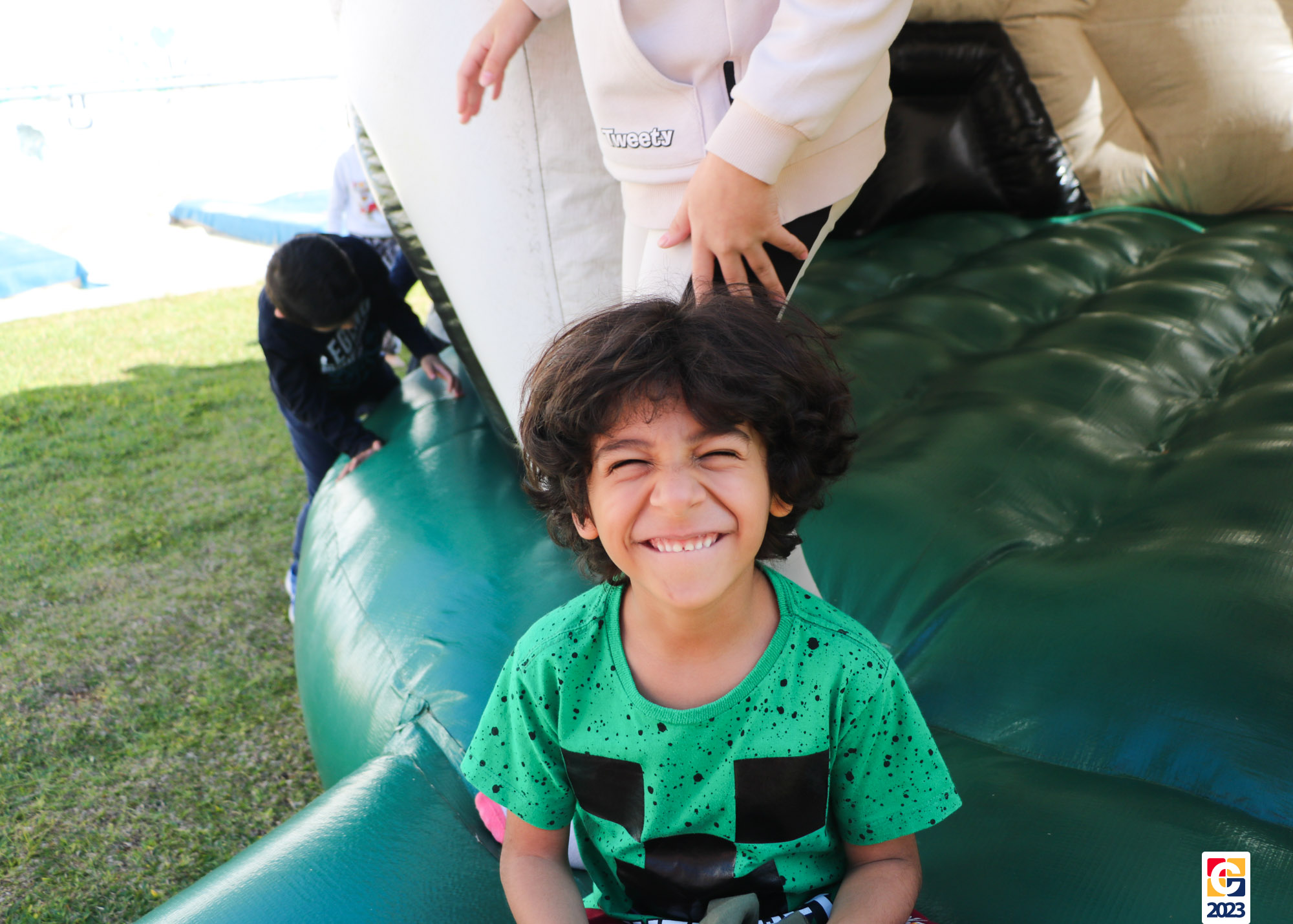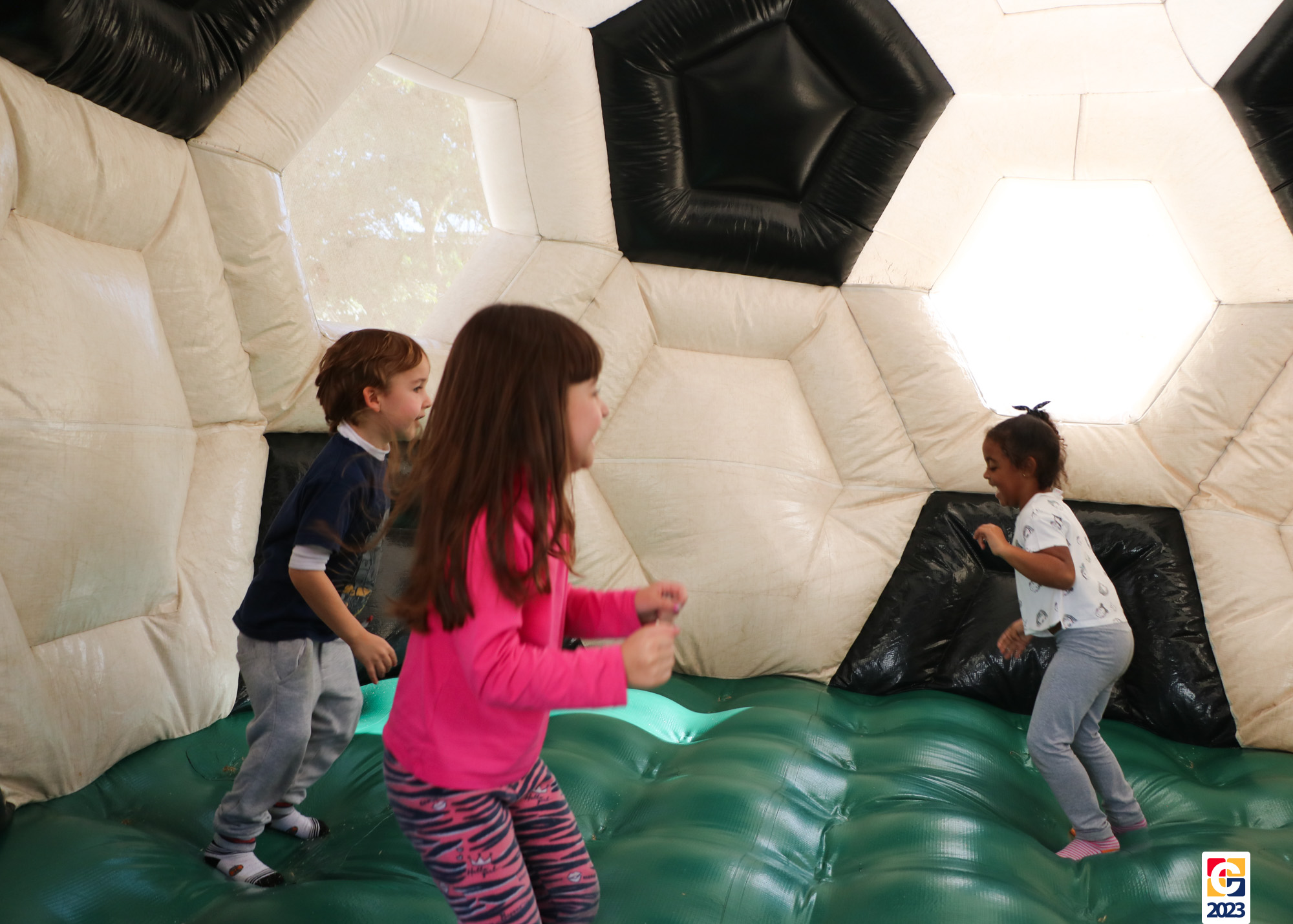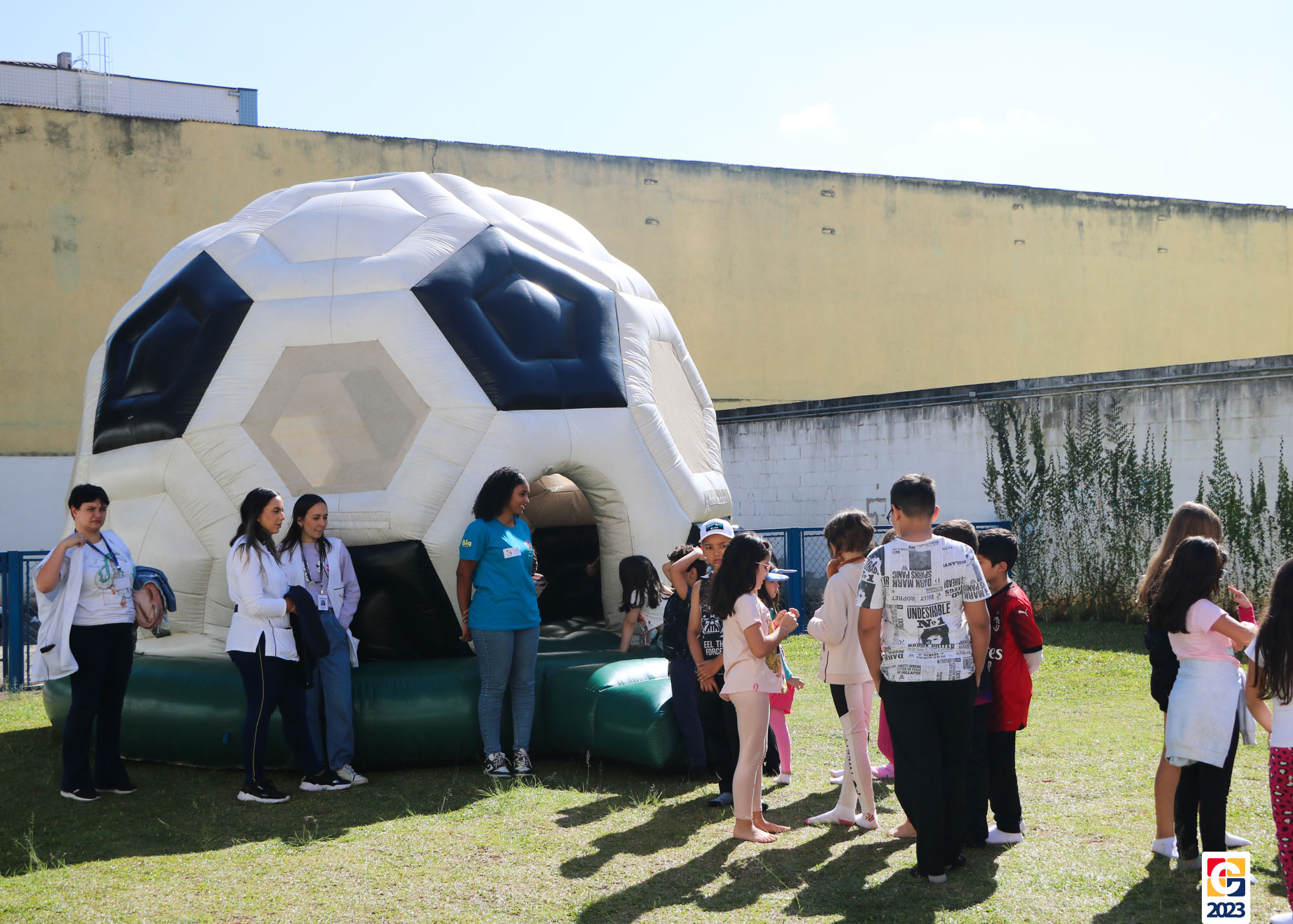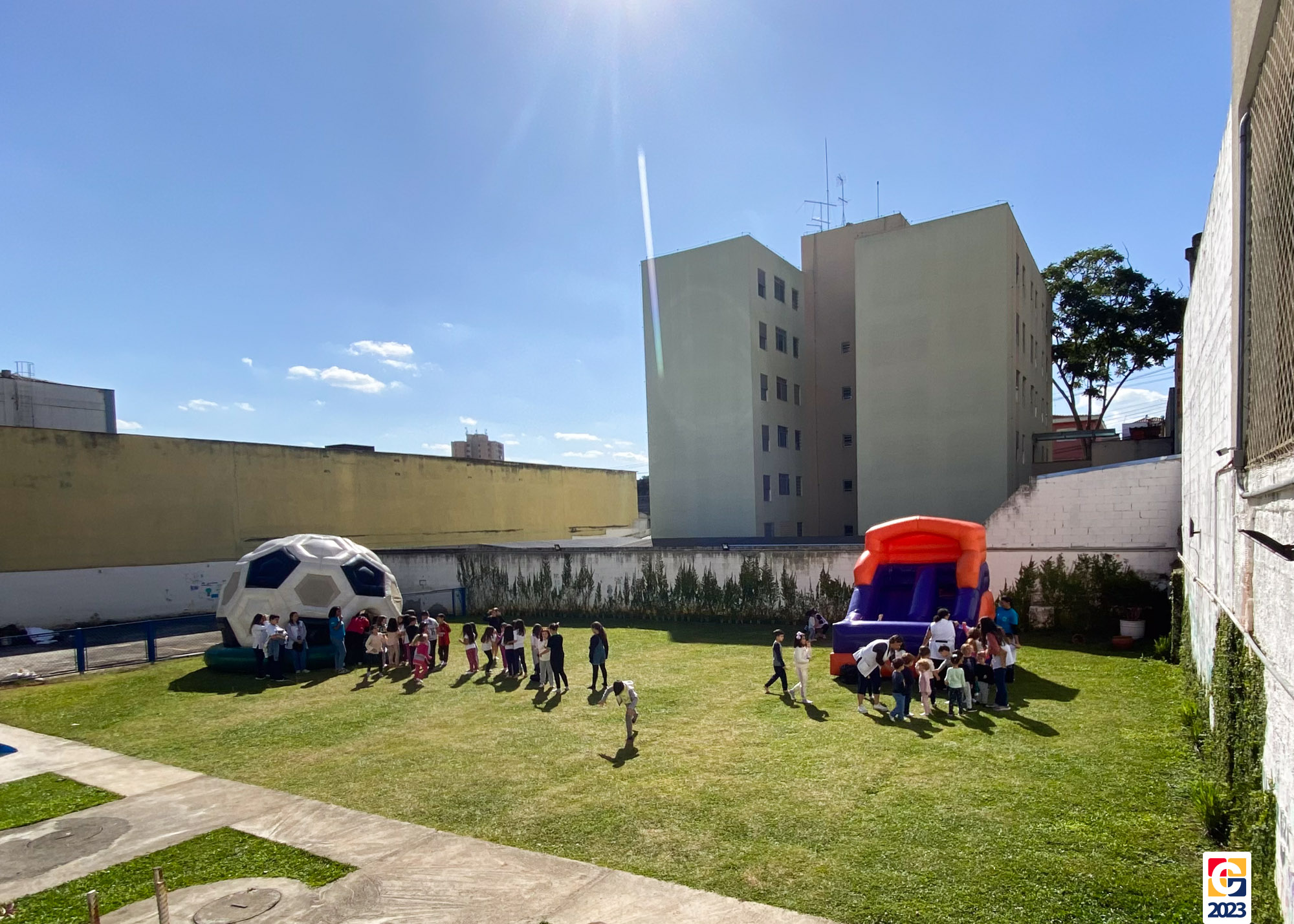No Curso de Férias, ambas as turmas ainda compartilharam uma tarde cheia de diversão, ocasião em que saíram para o gramado e surpreenderam-se com brinquedos infláveis; teve lanchinho especial, com salgados e bolo de chocolate! 🥳