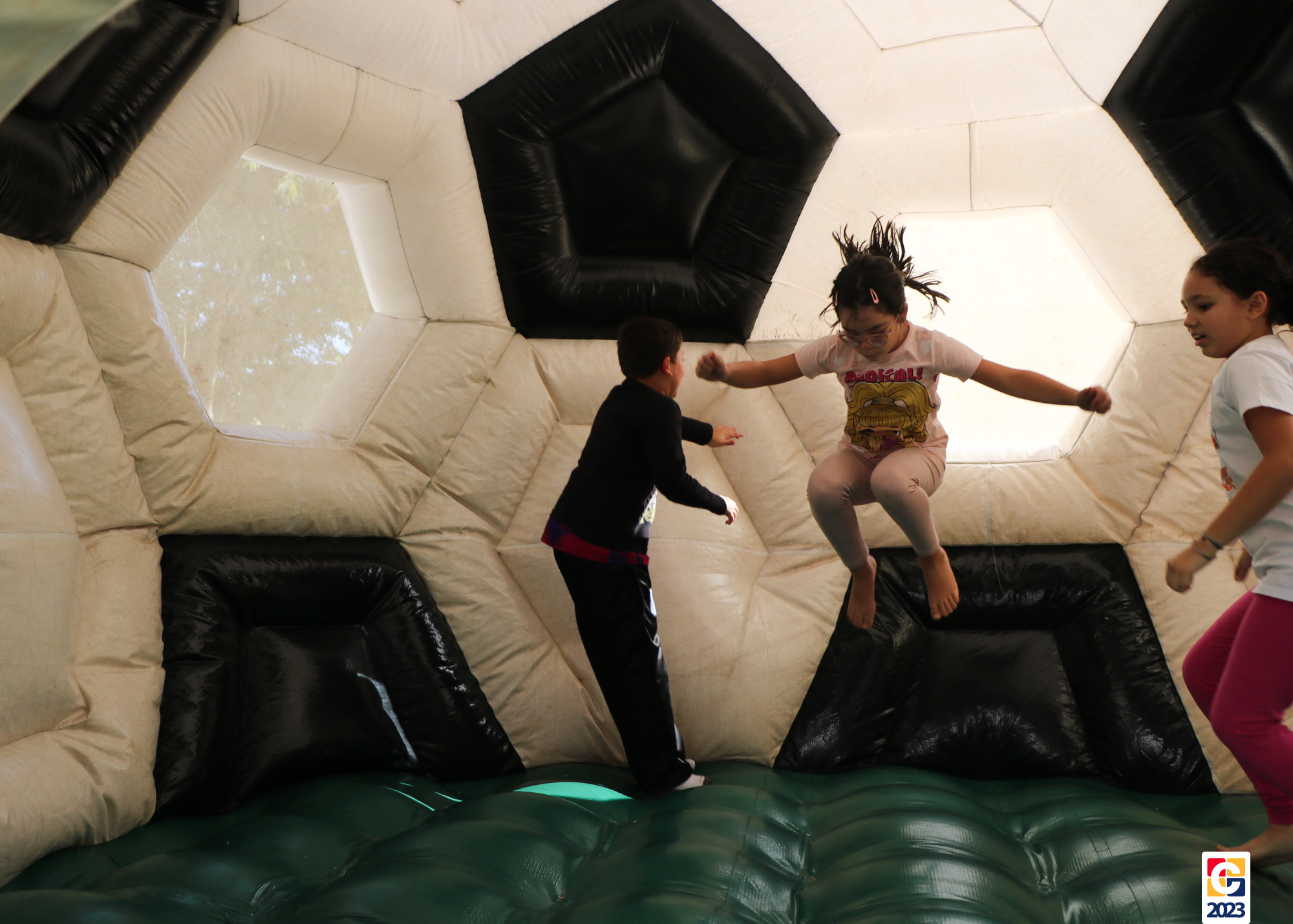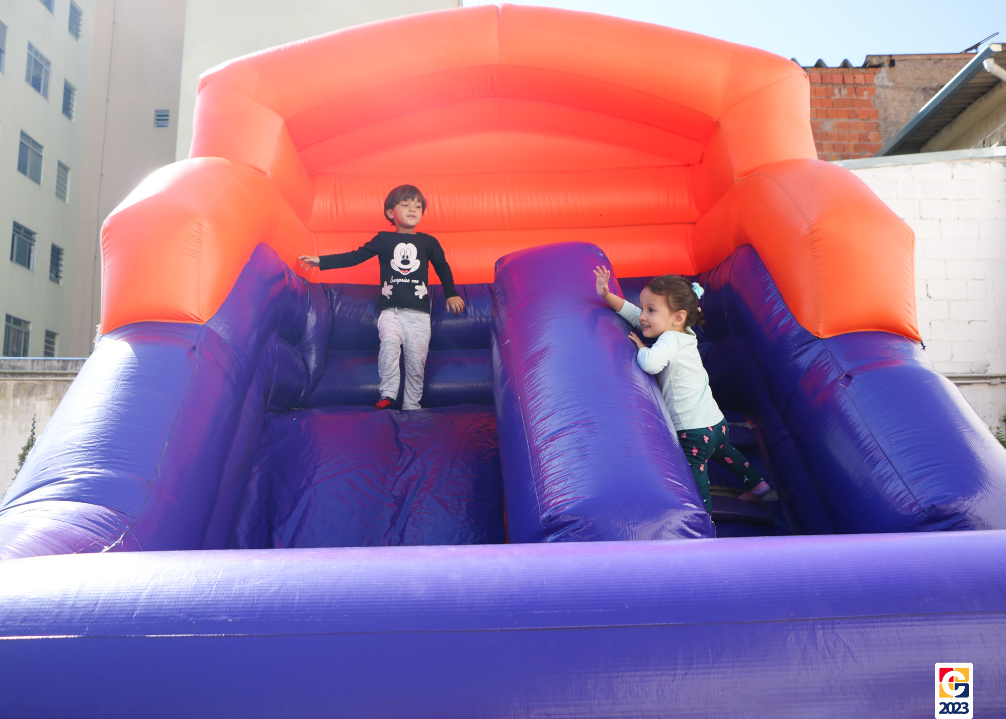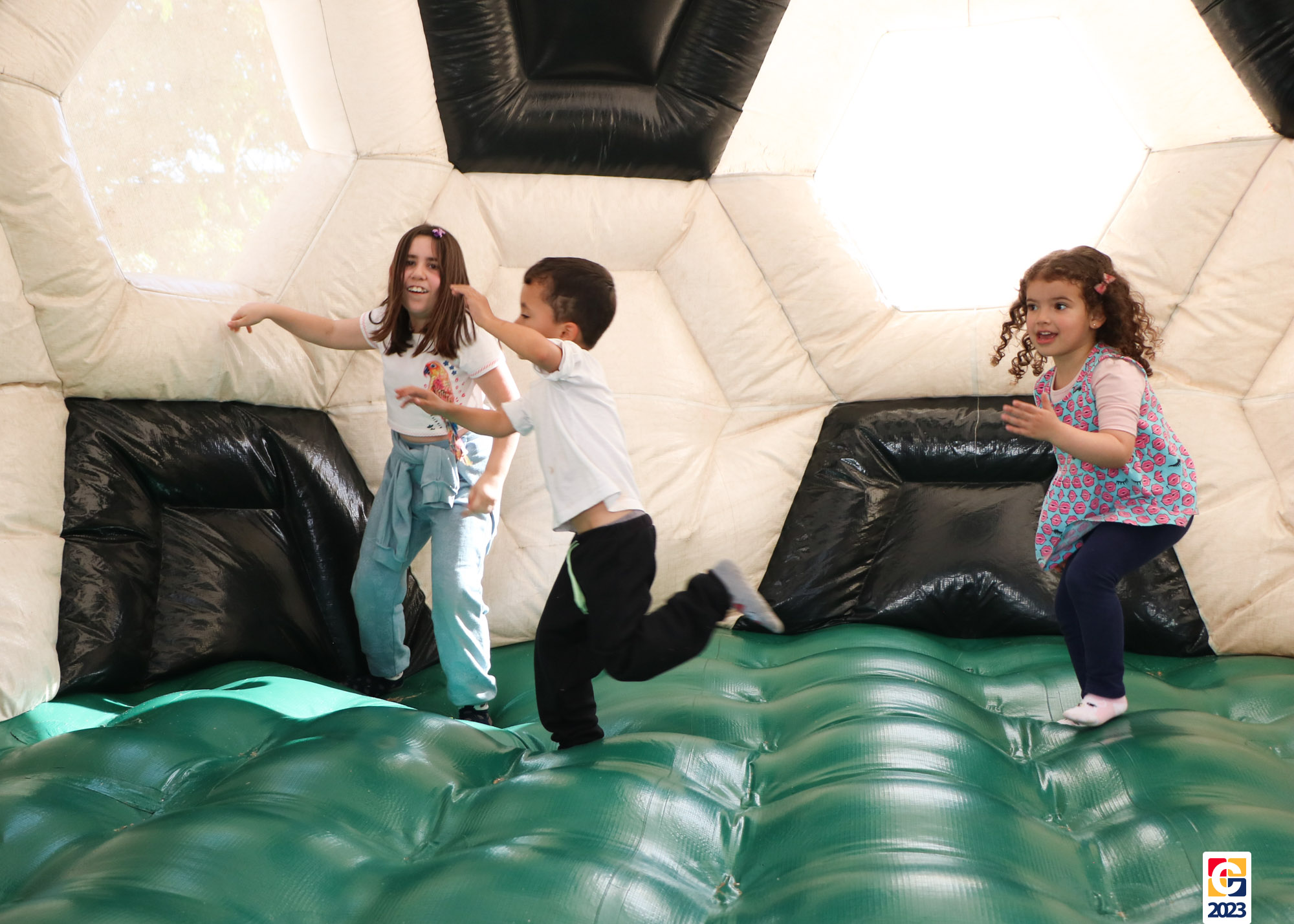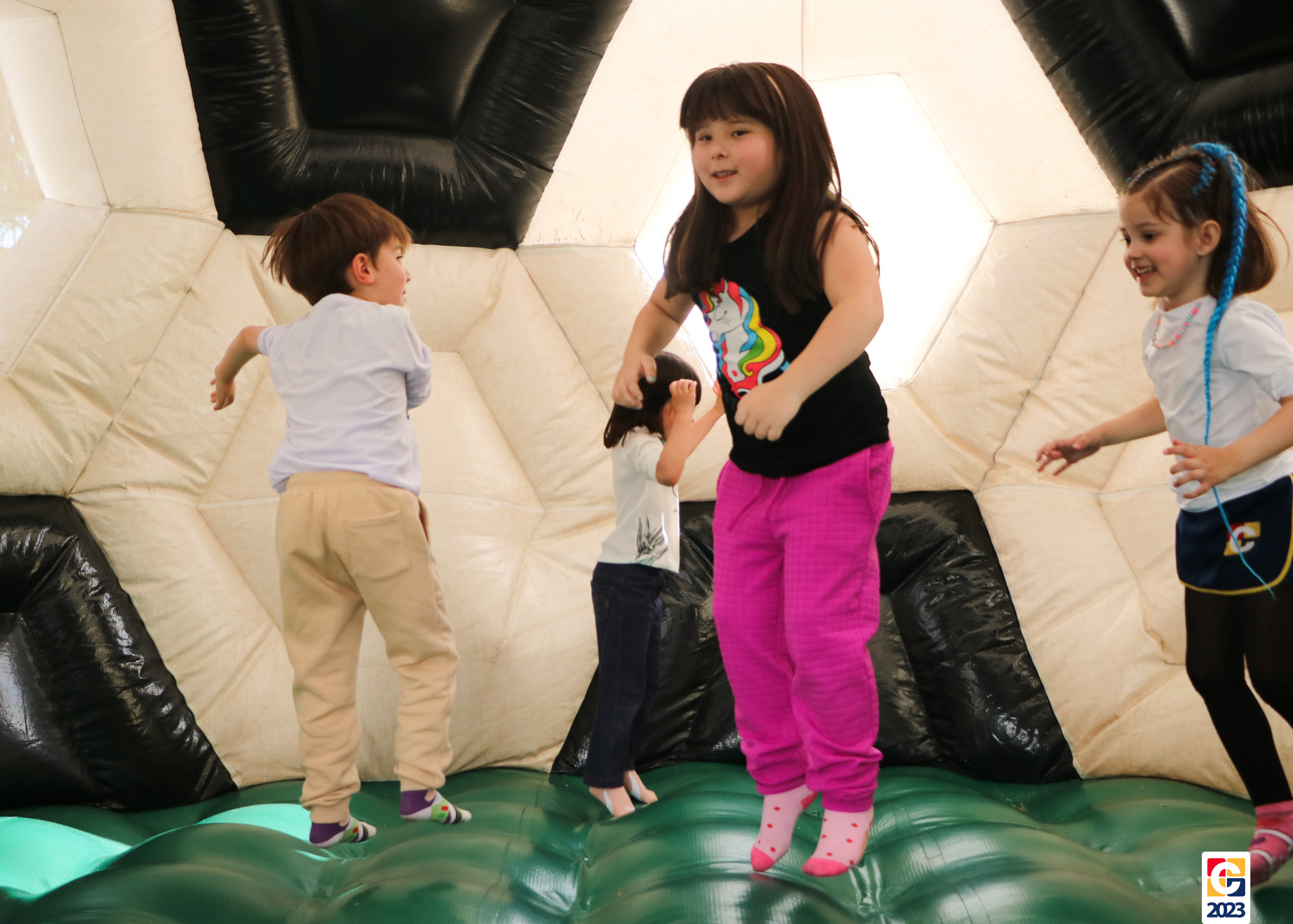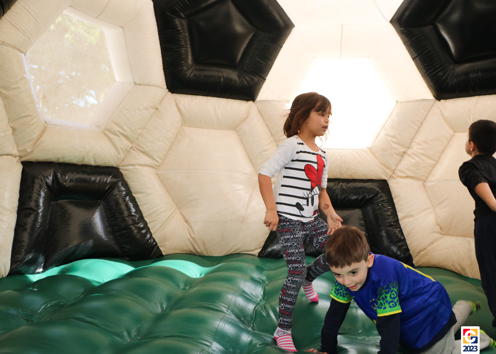No Curso de Férias, ambas as turmas ainda compartilharam uma tarde cheia de diversão, ocasião em que saíram para o gramado e surpreenderam-se com brinquedos infláveis; teve lanchinho especial, com salgados e bolo de chocolate! 🥳