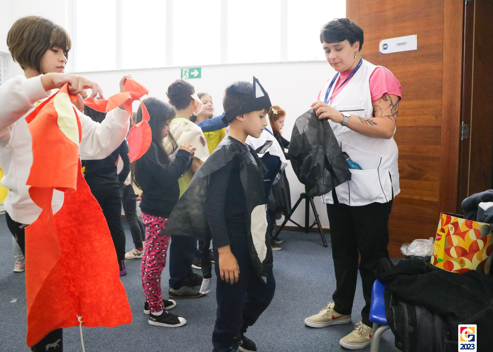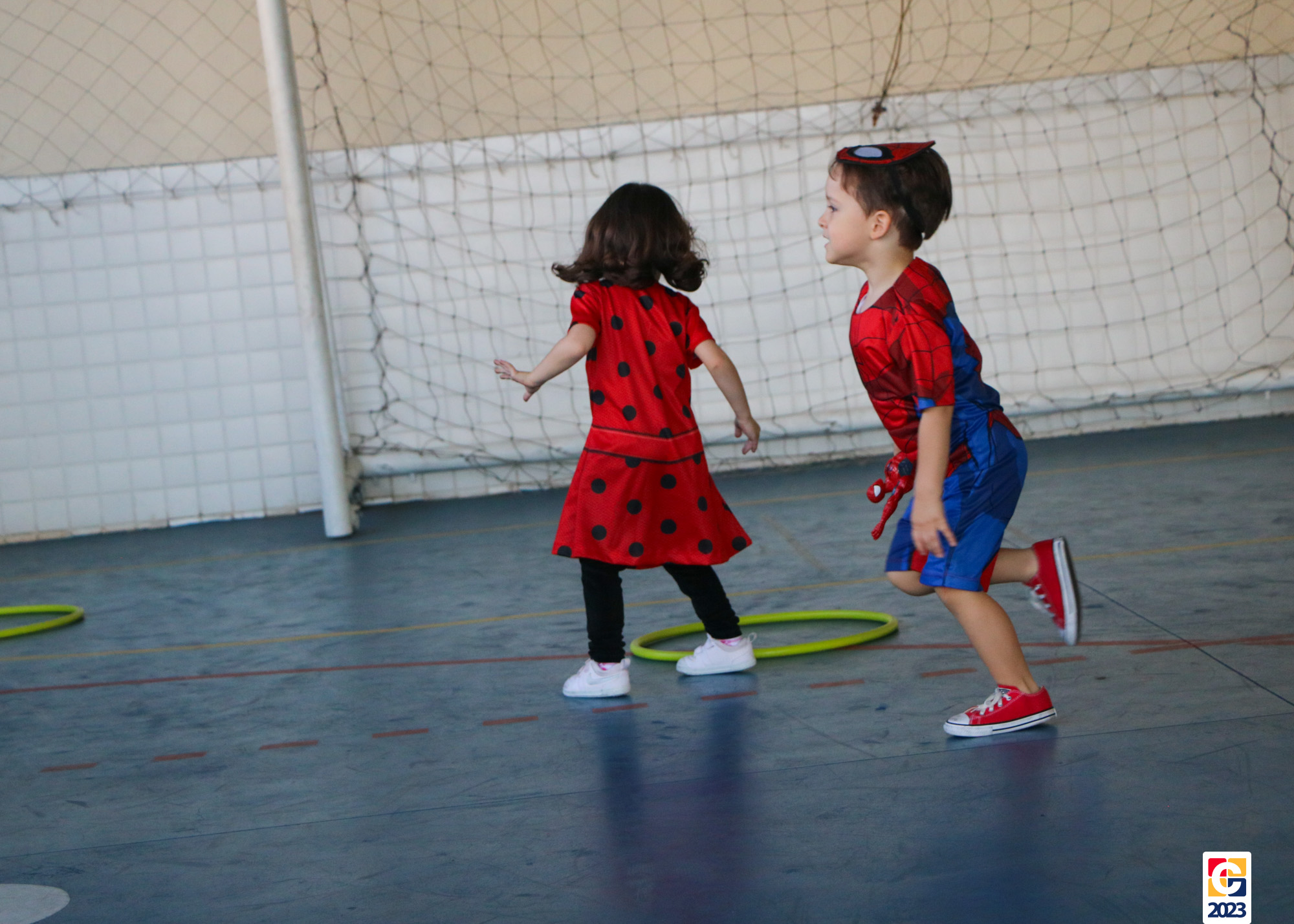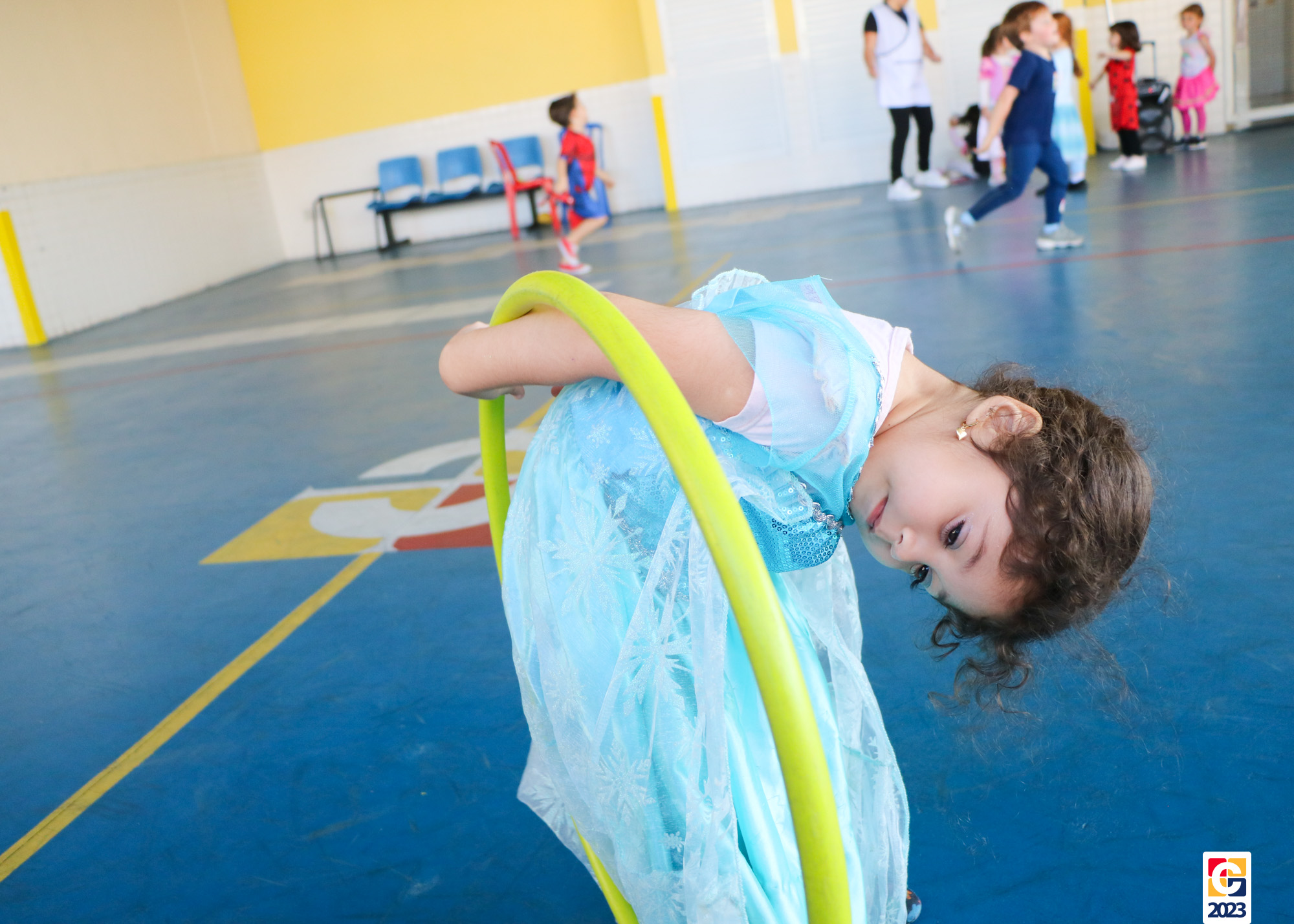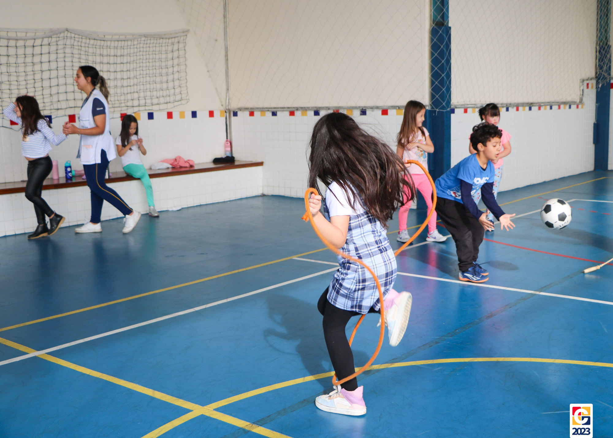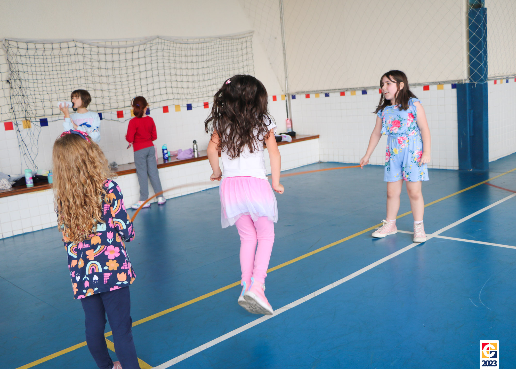 Pertinho dali, crianças dos Anos Iniciais continuaram a produzir os figurinos para a releitura de Saltimbancos, obra de Chico Buarque, e também puderam aproveitar momentos de diversão com o circuito preparado pelas próprias professoras; brincaram de futebol, pular corda e bambolê. ⚽
