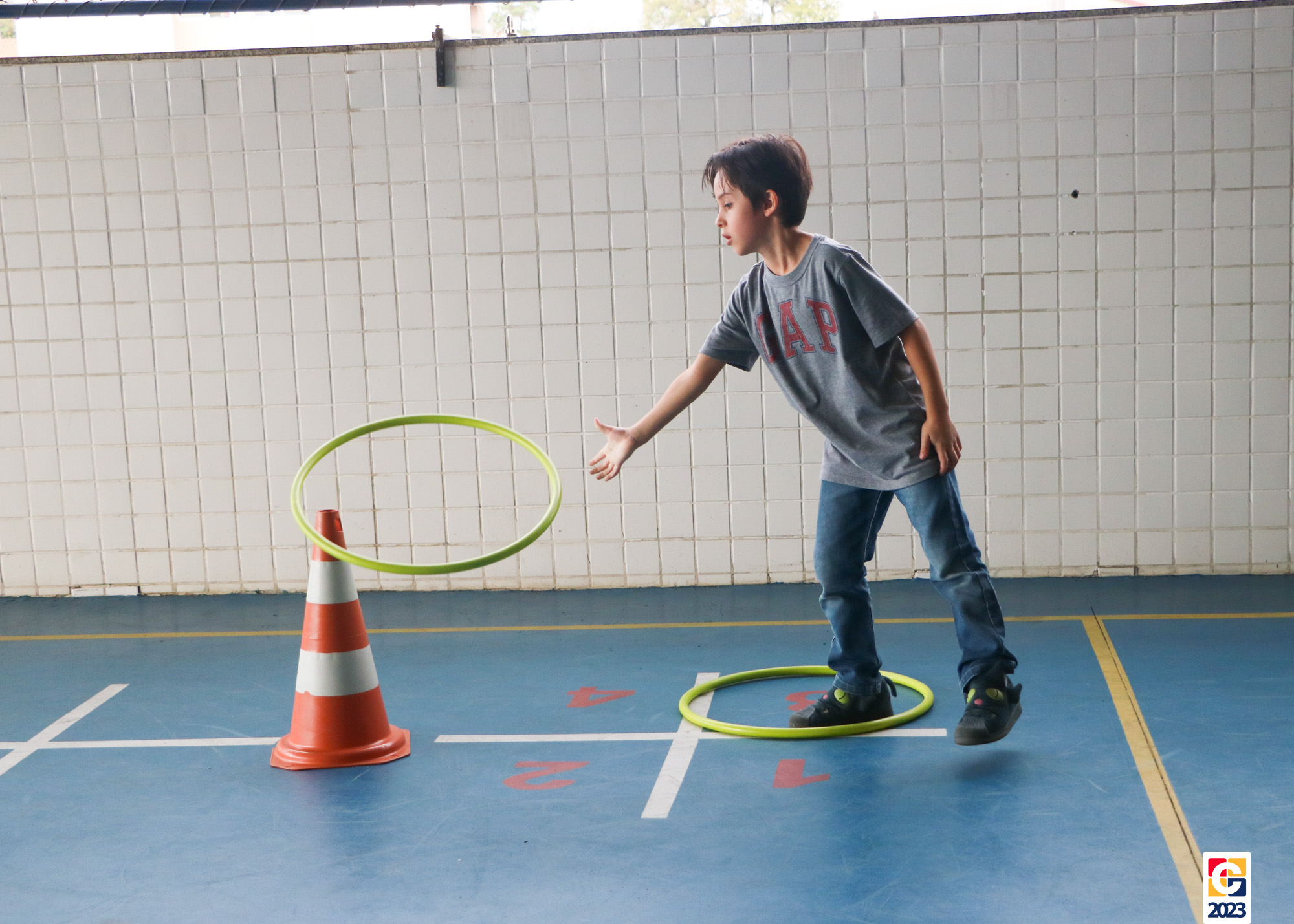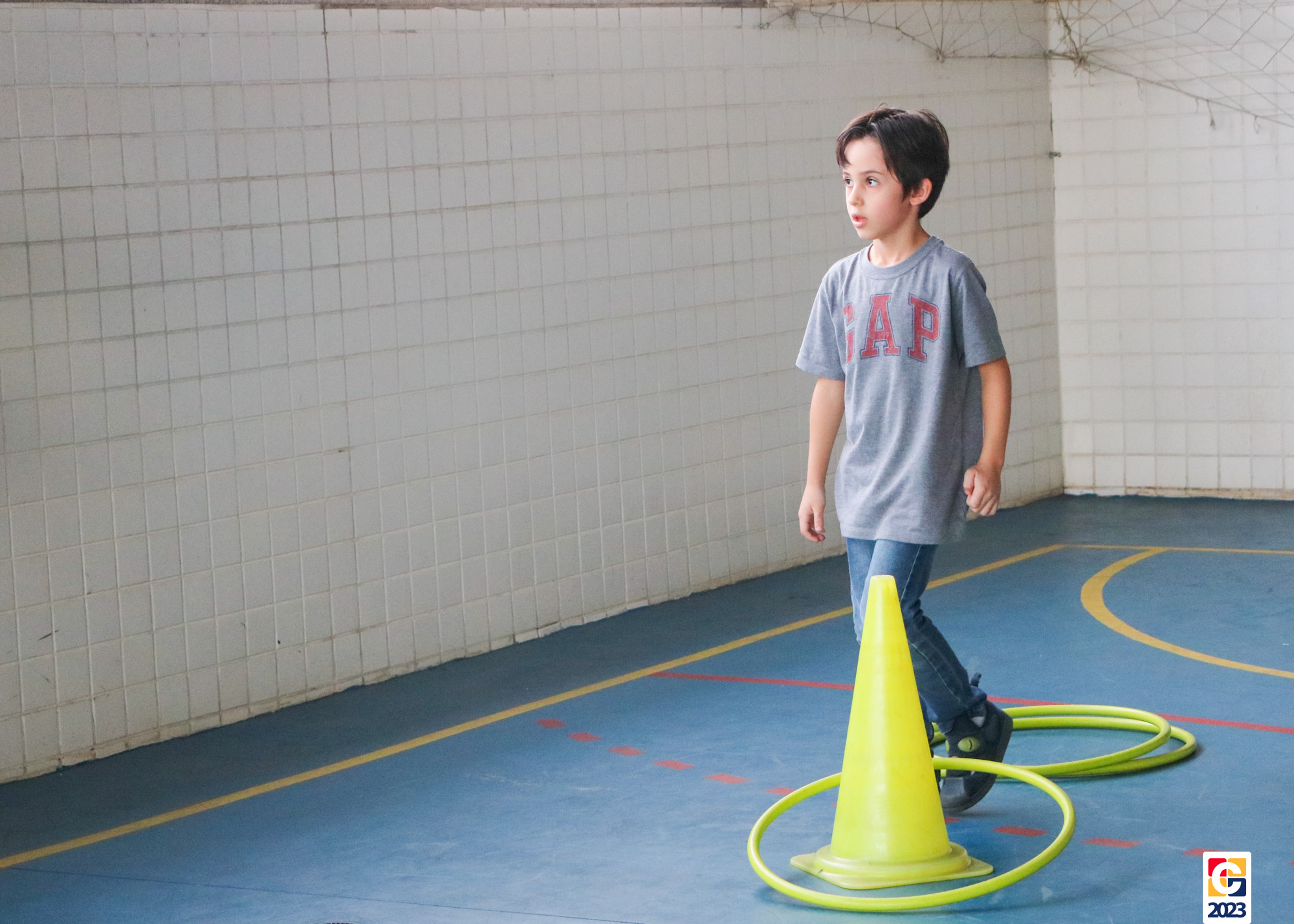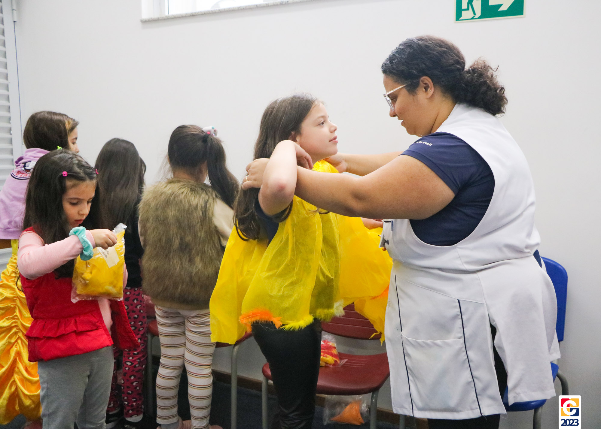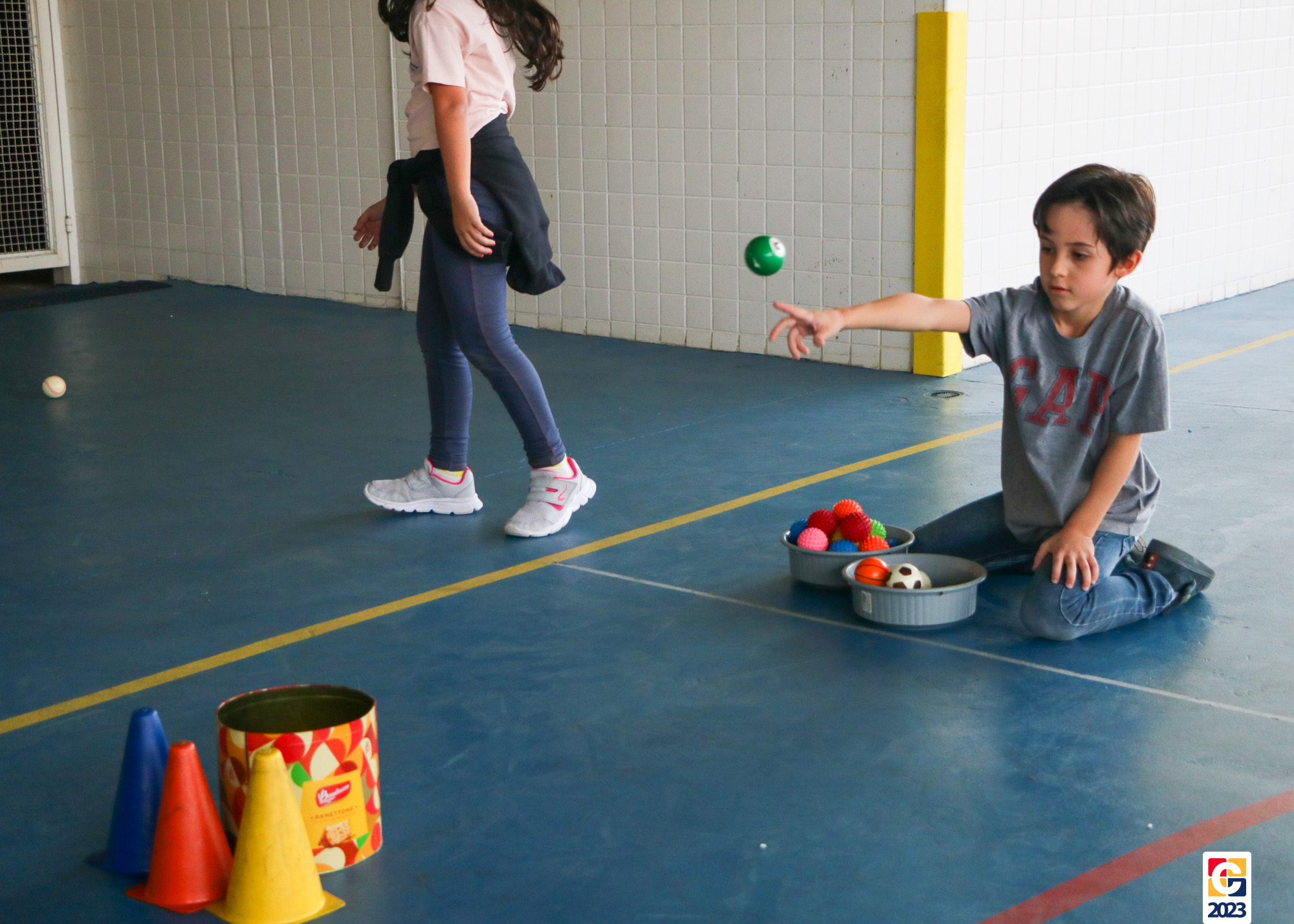 Pertinho dali, crianças dos Anos Iniciais continuaram a produzir os figurinos para a releitura de Saltimbancos, obra de Chico Buarque, e também puderam aproveitar momentos de diversão com o circuito preparado pelas próprias professoras; brincaram de futebol, pular corda e bambolê. ⚽