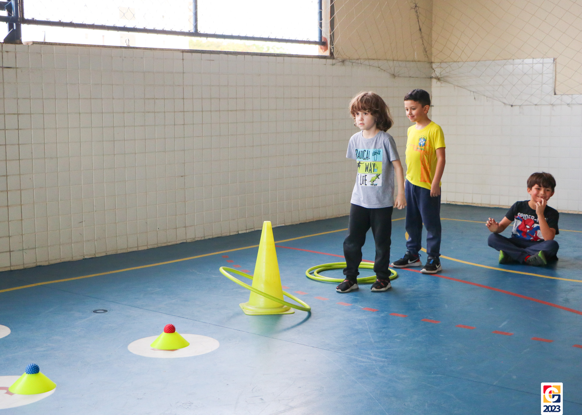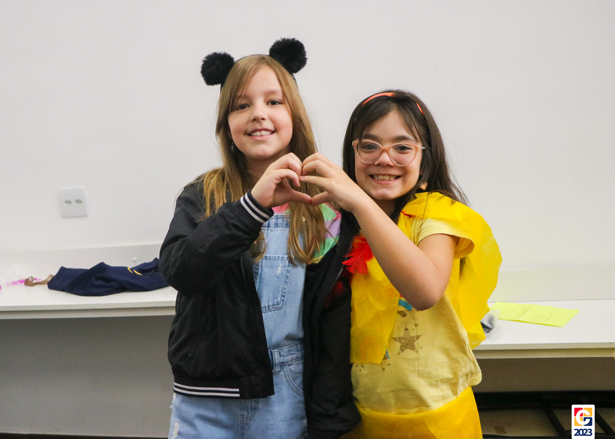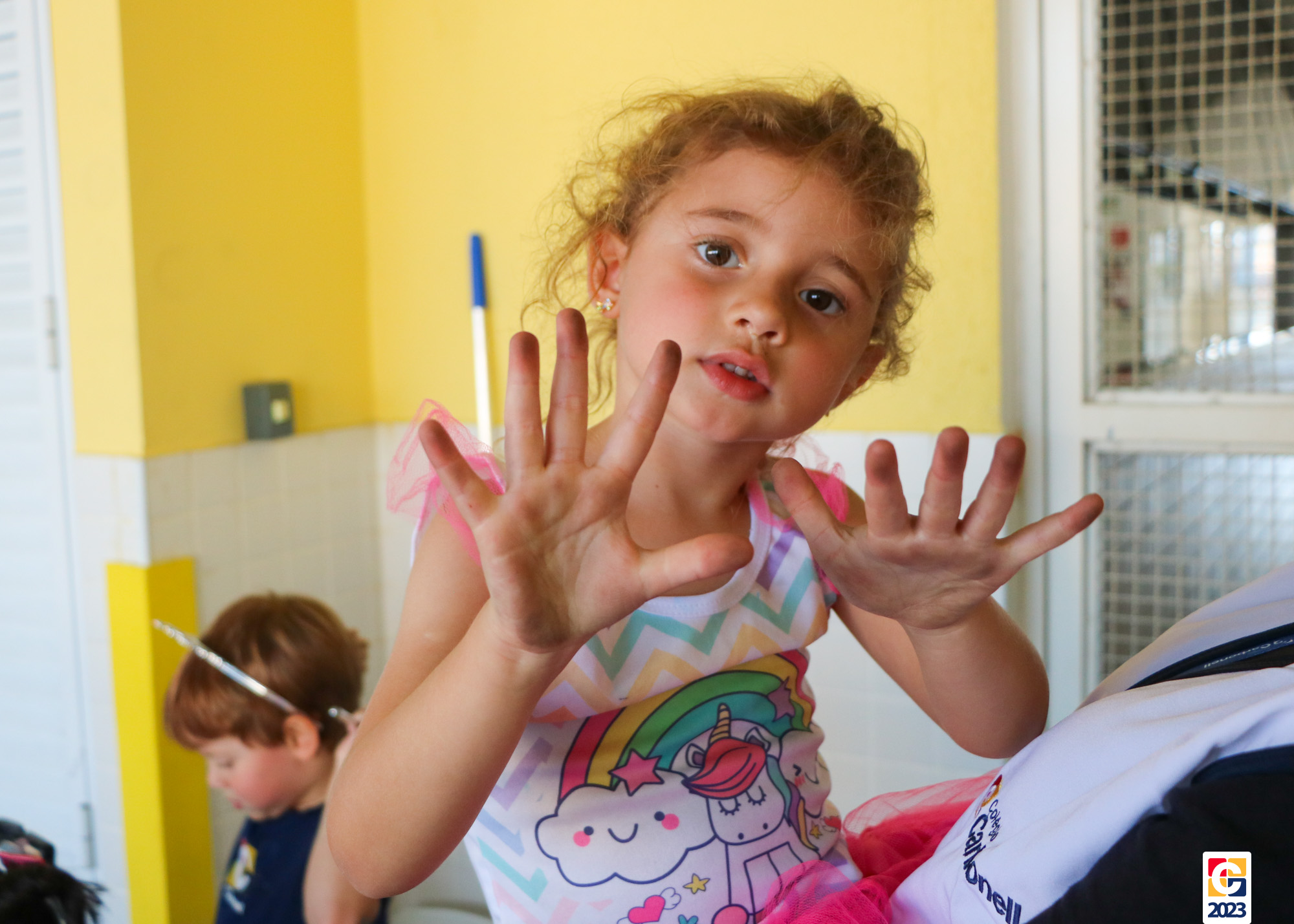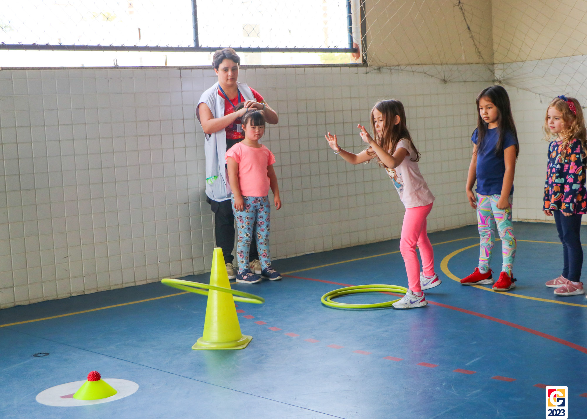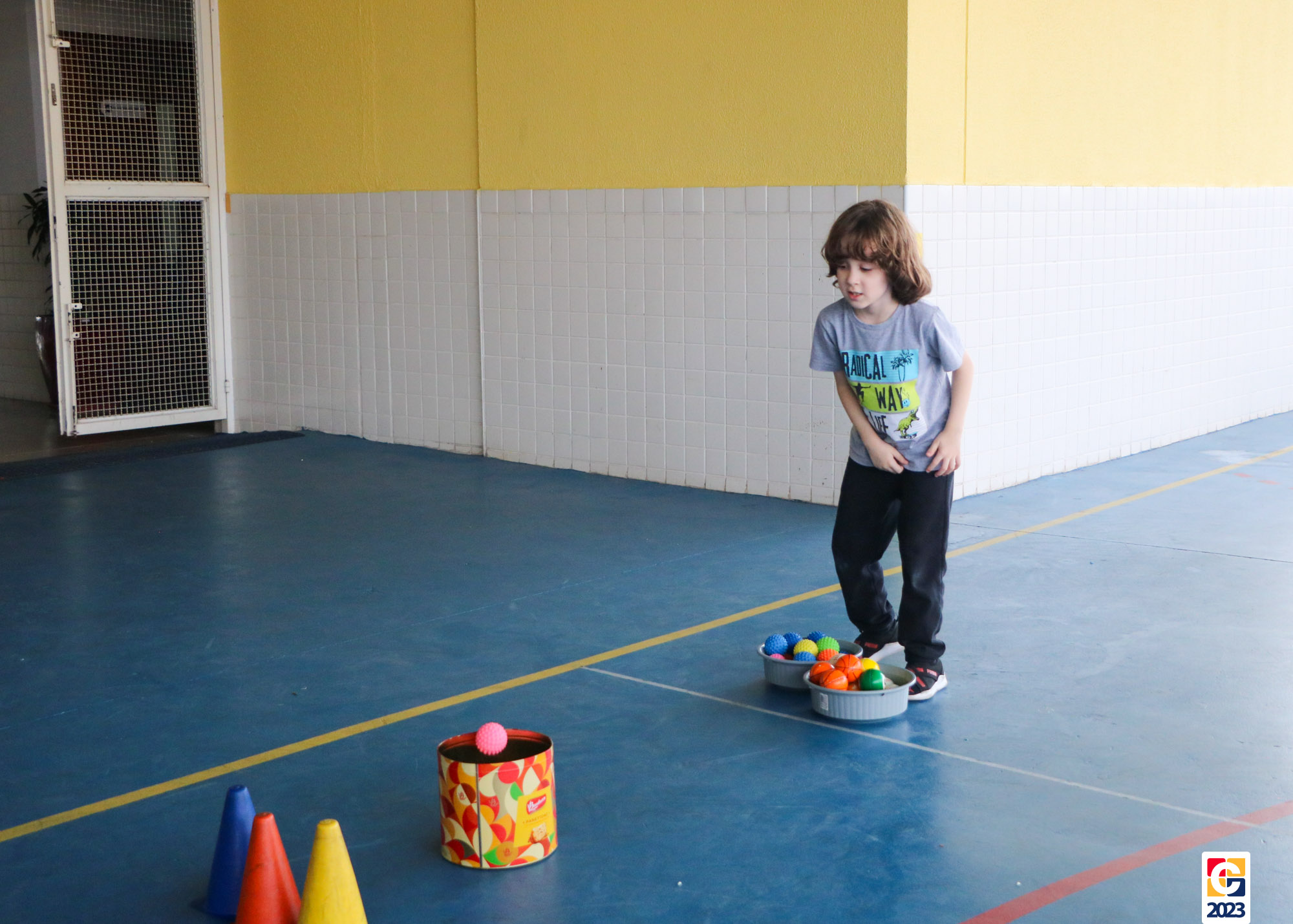 Pertinho dali, crianças dos Anos Iniciais continuaram a produzir os figurinos para a releitura de Saltimbancos, obra de Chico Buarque, e também puderam aproveitar momentos de diversão com o circuito preparado pelas próprias professoras; brincaram de futebol, pular corda e bambolê. ⚽