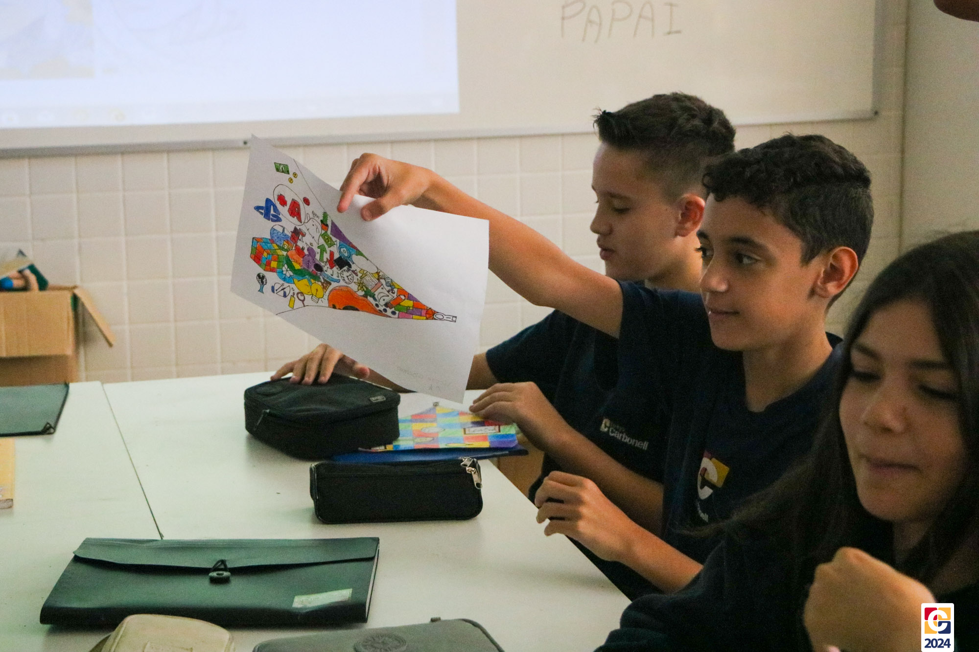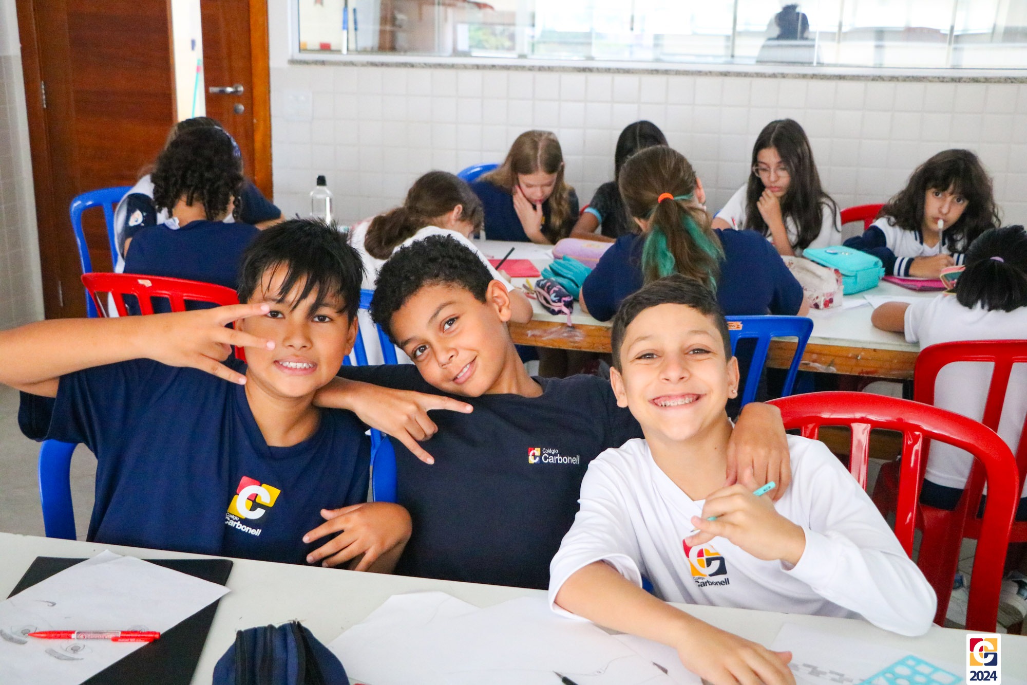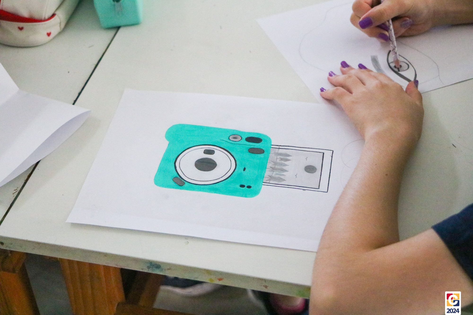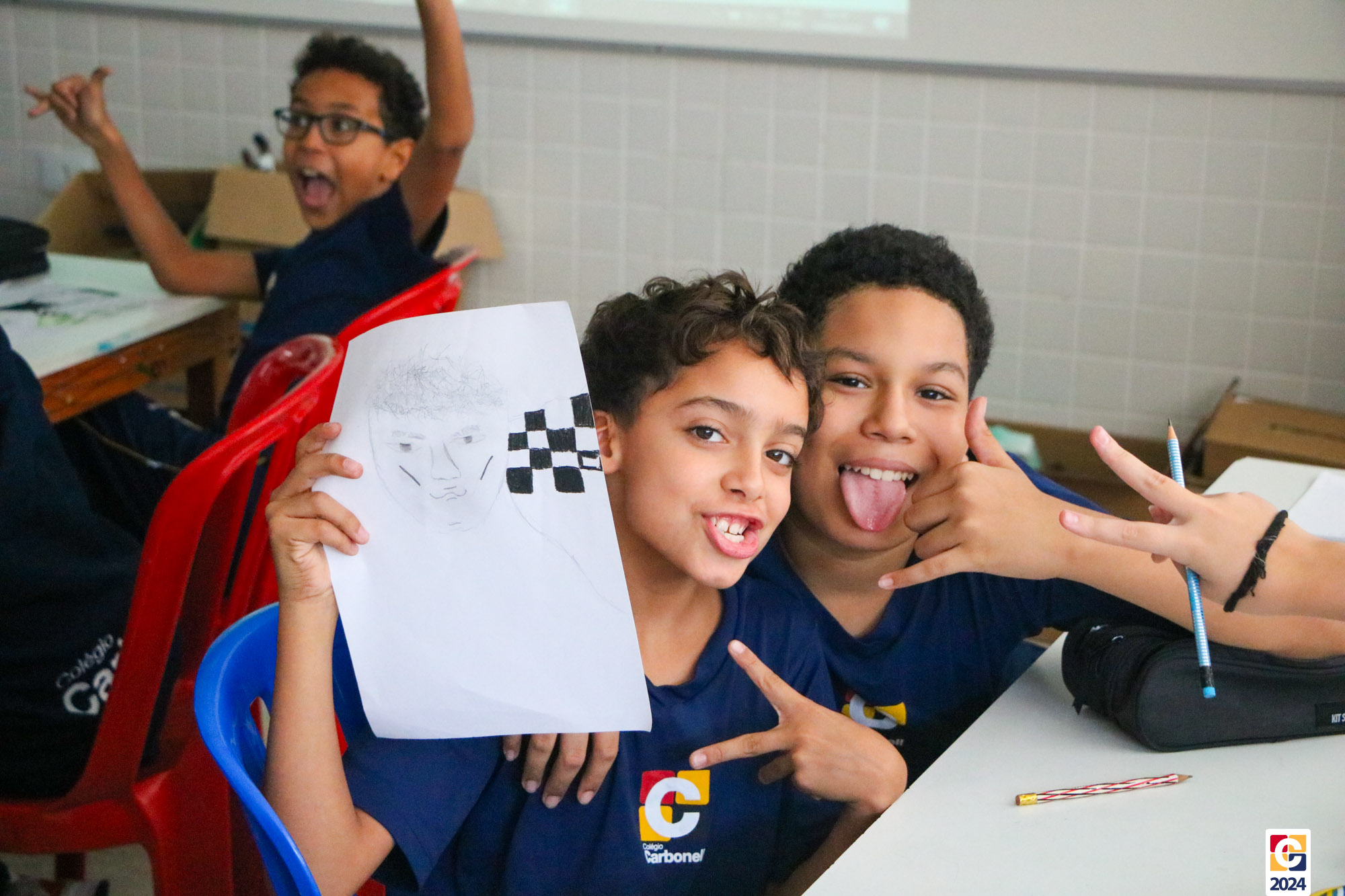 Ao lado, nossos estudantes de 6º ano também mergulharam em uma experiência de autorretrato, mas ali focando em técnicas de sombras ensinadas pela professora. Em sala, cada estudante deixou sua marca com sombras e da luz, que você acessa, curte e compartilha no álbum do site. 🖌️