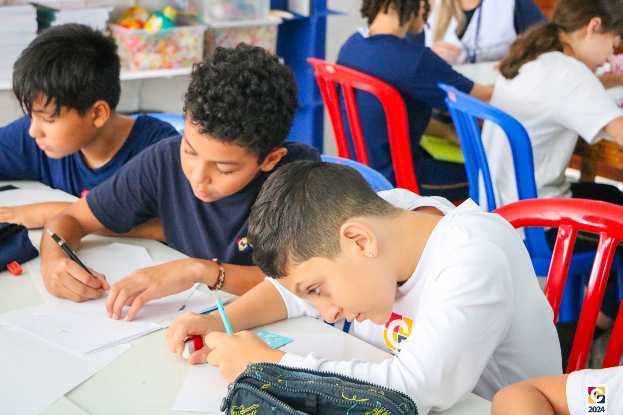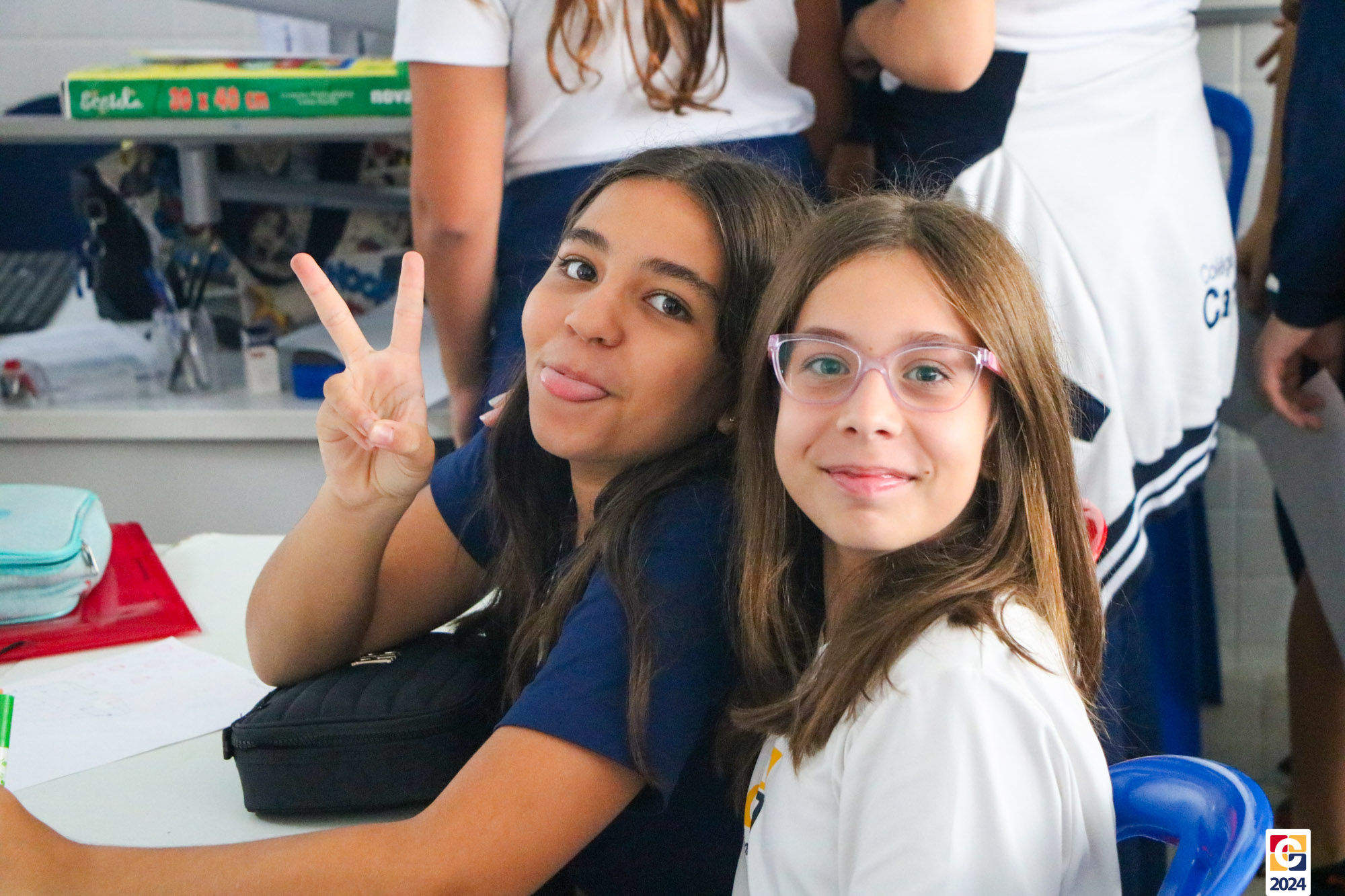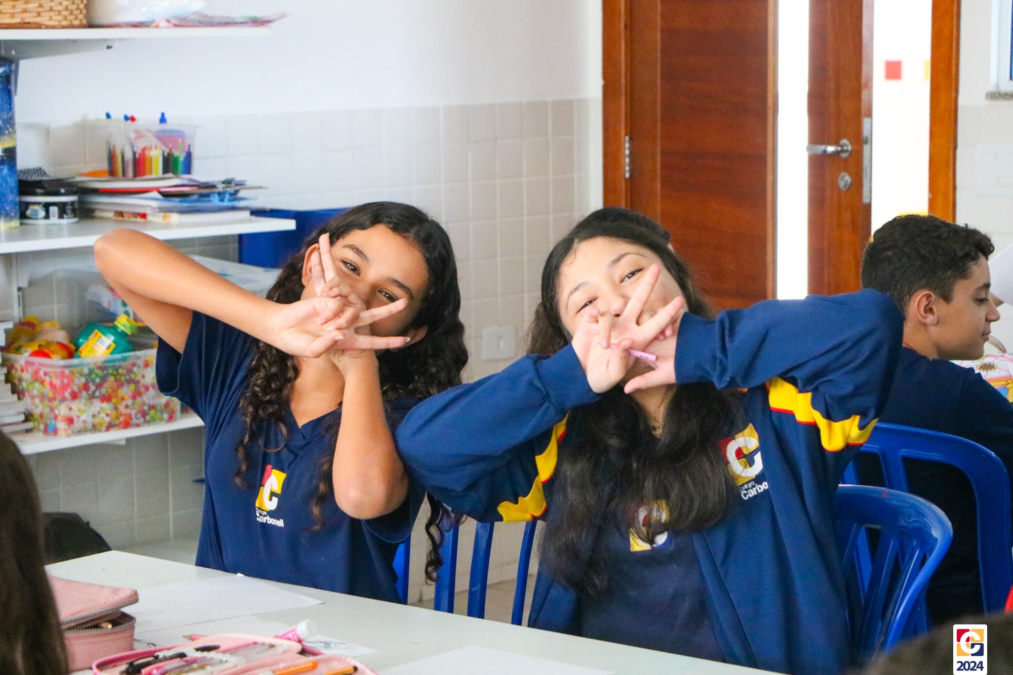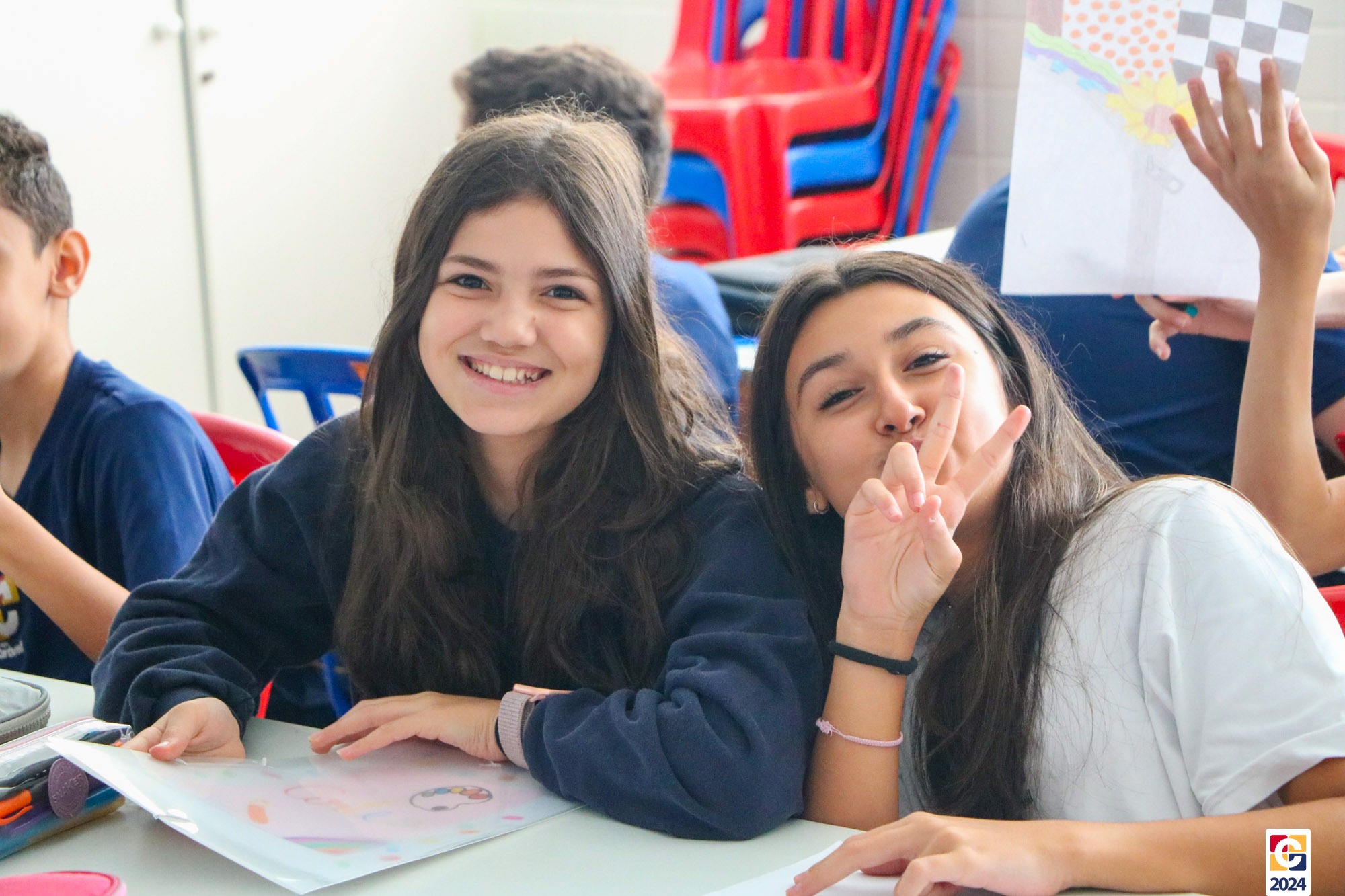 Ao lado, nossos estudantes de 6º ano também mergulharam em uma experiência de autorretrato, mas ali focando em técnicas de sombras ensinadas pela professora. Em sala, cada estudante deixou sua marca com sombras e da luz, que você acessa, curte e compartilha no álbum do site. 🖌️