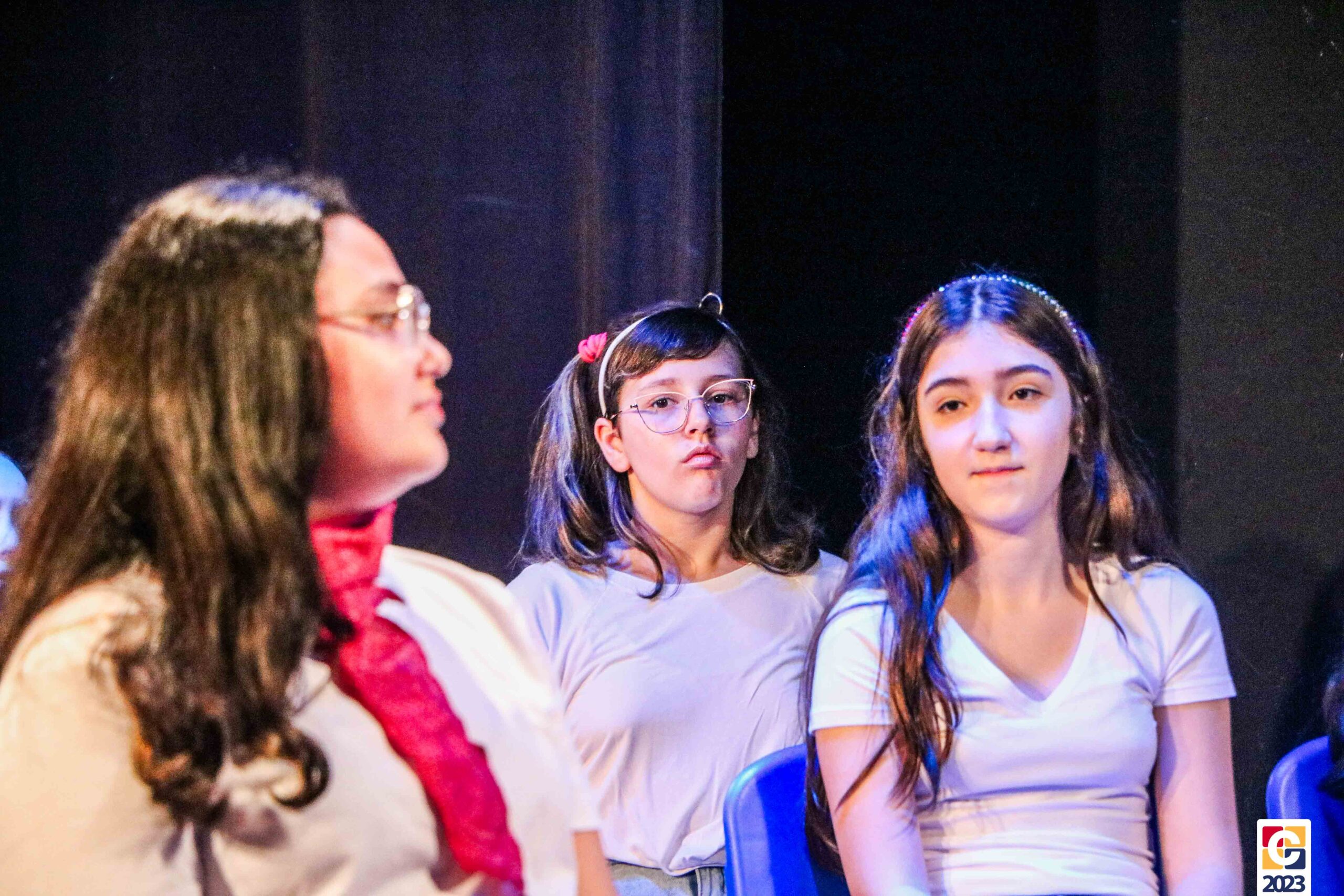 Atriz em formação, Clara Francisco de Moura é do 8º ano e falou sobre sua experiência: “Houve momentos em que fiquei bem ansiosa; acabei decorando tudo, inclusive o que os outros falavam. Para mim, foi ‘de boa’ entrar no palco porque já tinha me apresentado várias vezes antes. Li bastante e acabei me ajustando em como atuar e como falar para interpretar a personagem que eu fiz”. 🎦