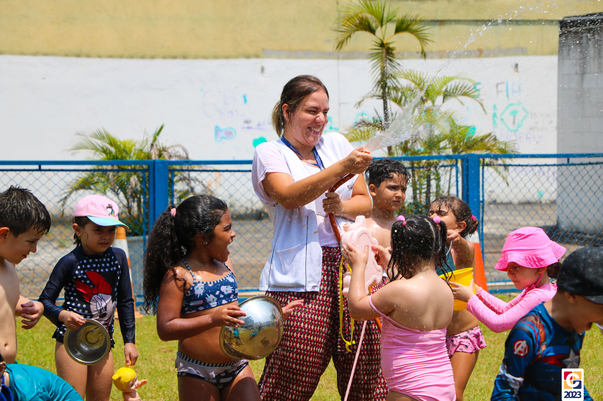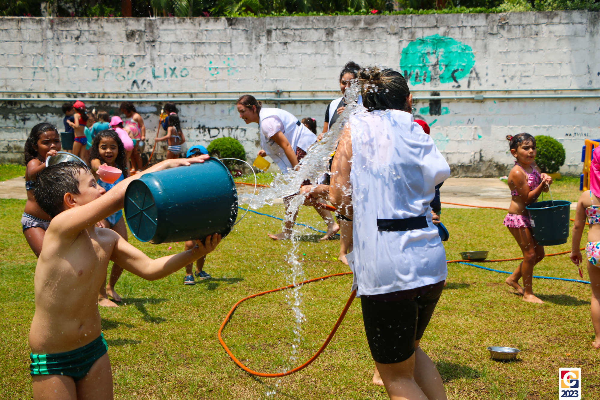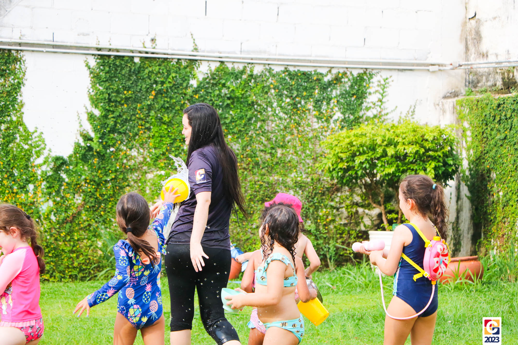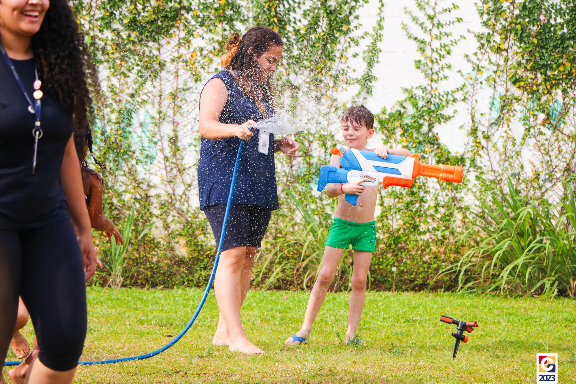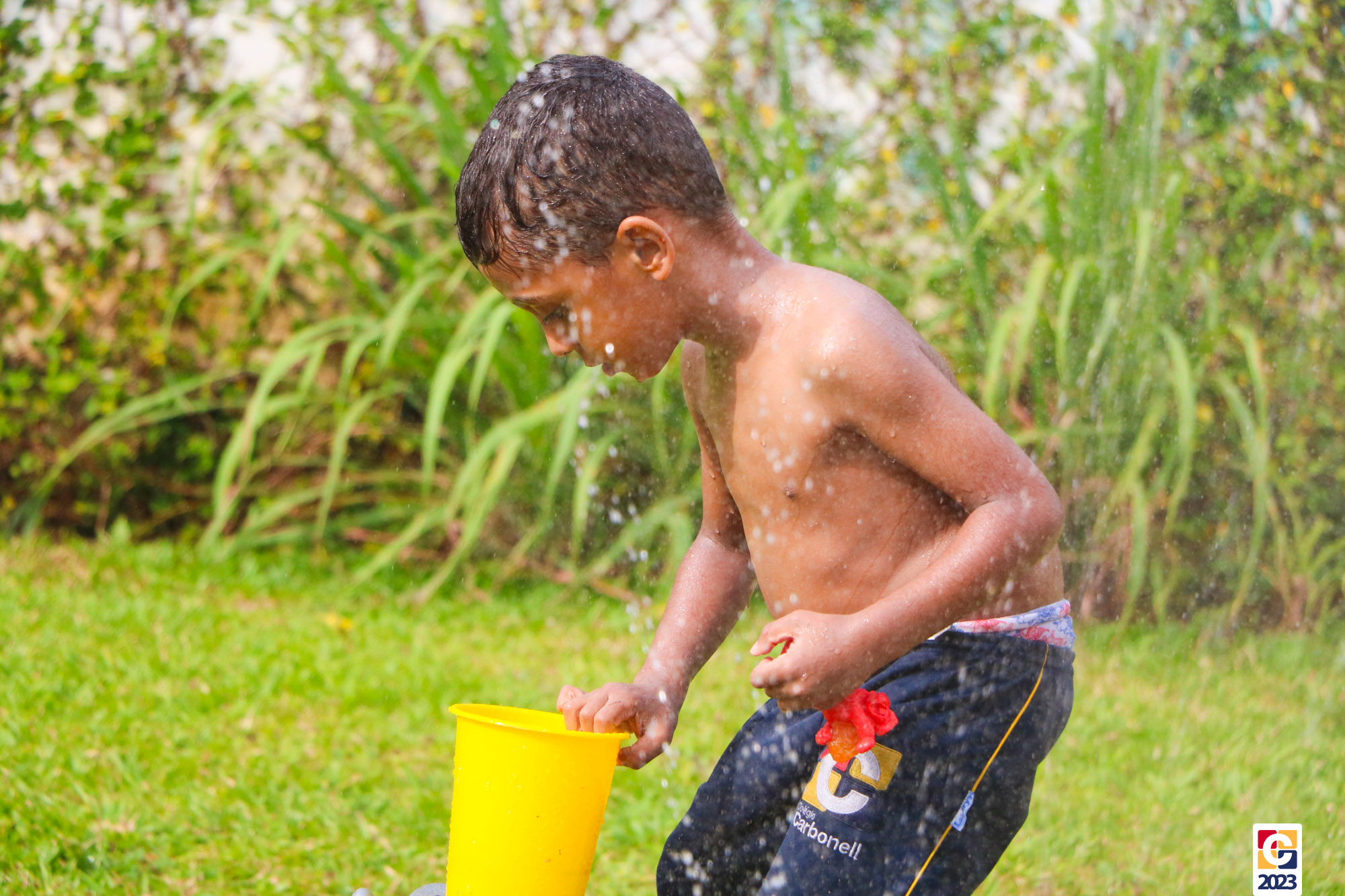 Professoras, assistentes e crianças, unidos pela alegria, esguichavam água uns nos outros em mais um dia mágico, desses que ficam gravados para sempre nas memórias de infância. 💧