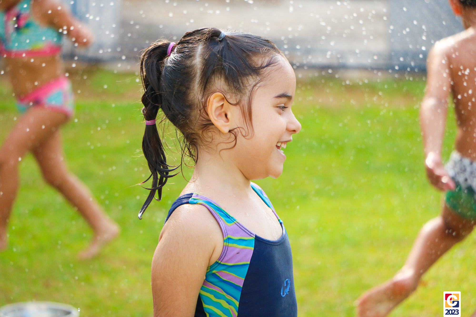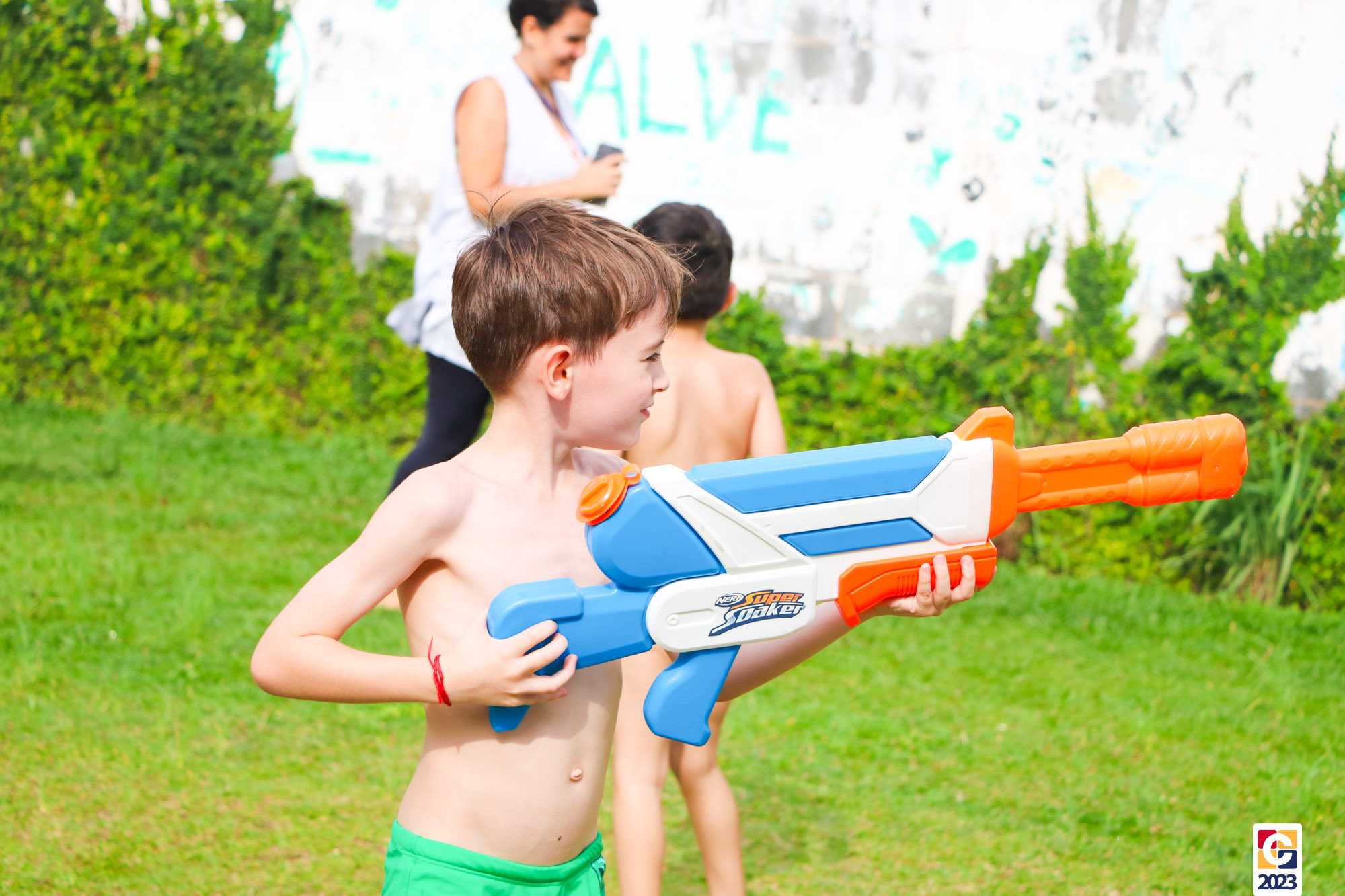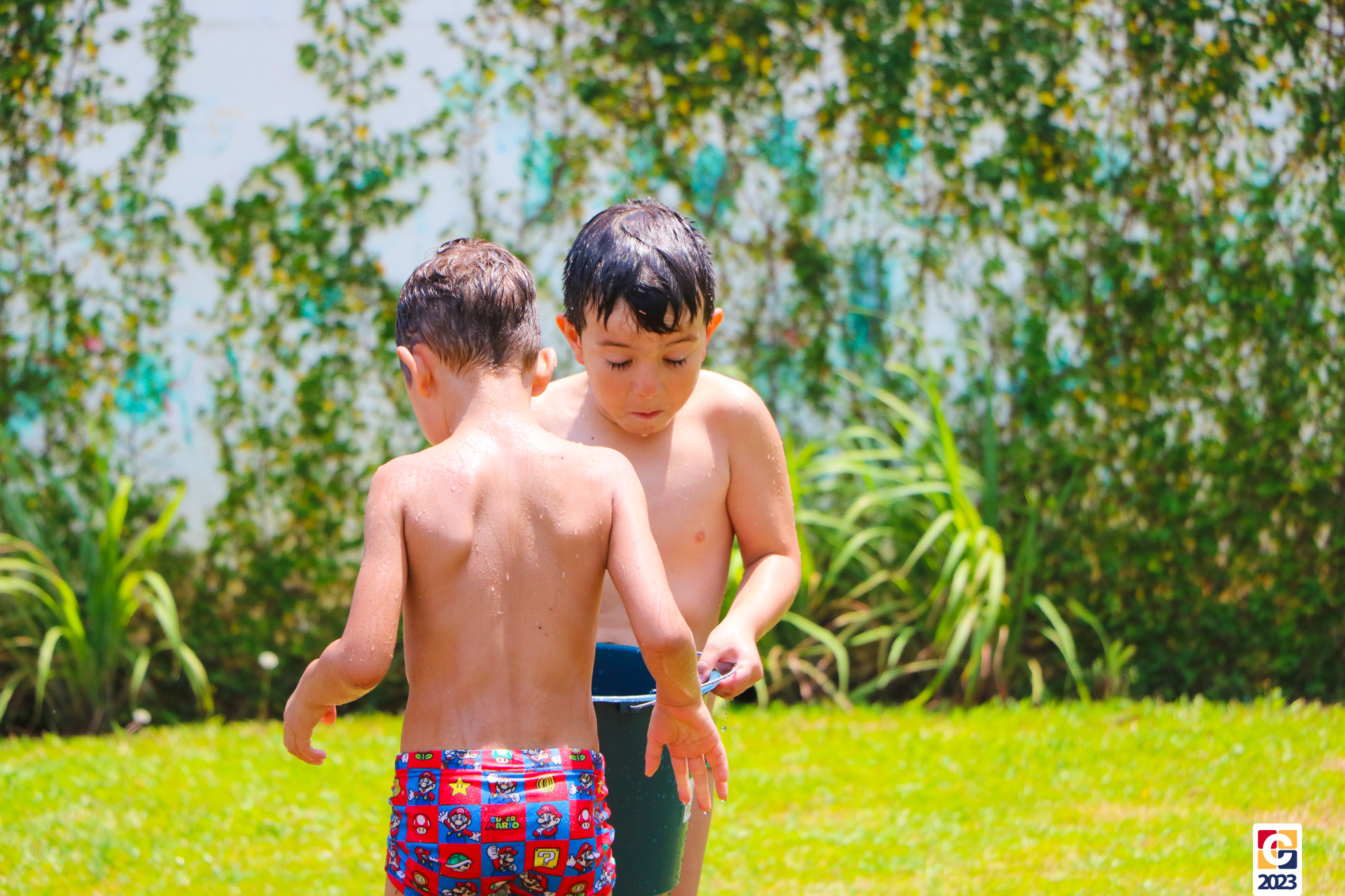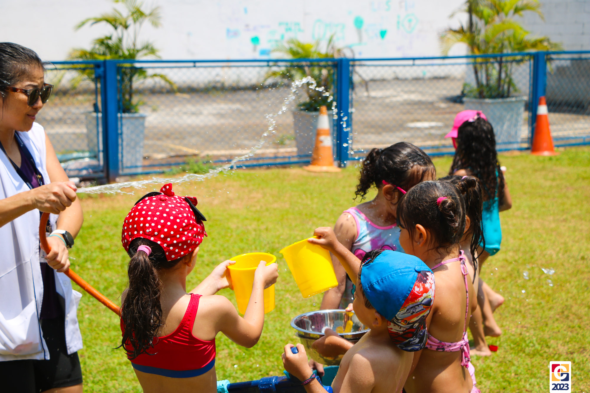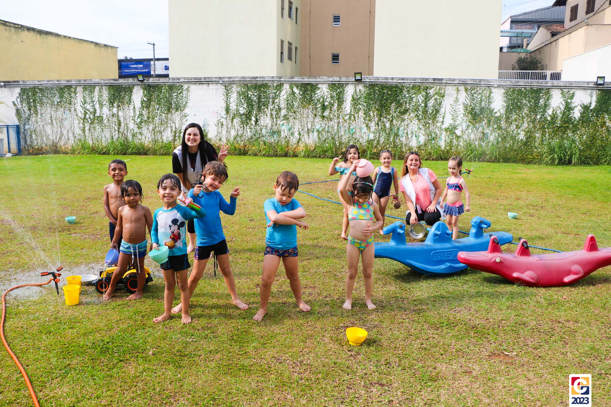 Professoras, assistentes e crianças, unidos pela alegria, esguichavam água uns nos outros em mais um dia mágico, desses que ficam gravados para sempre nas memórias de infância. 💧