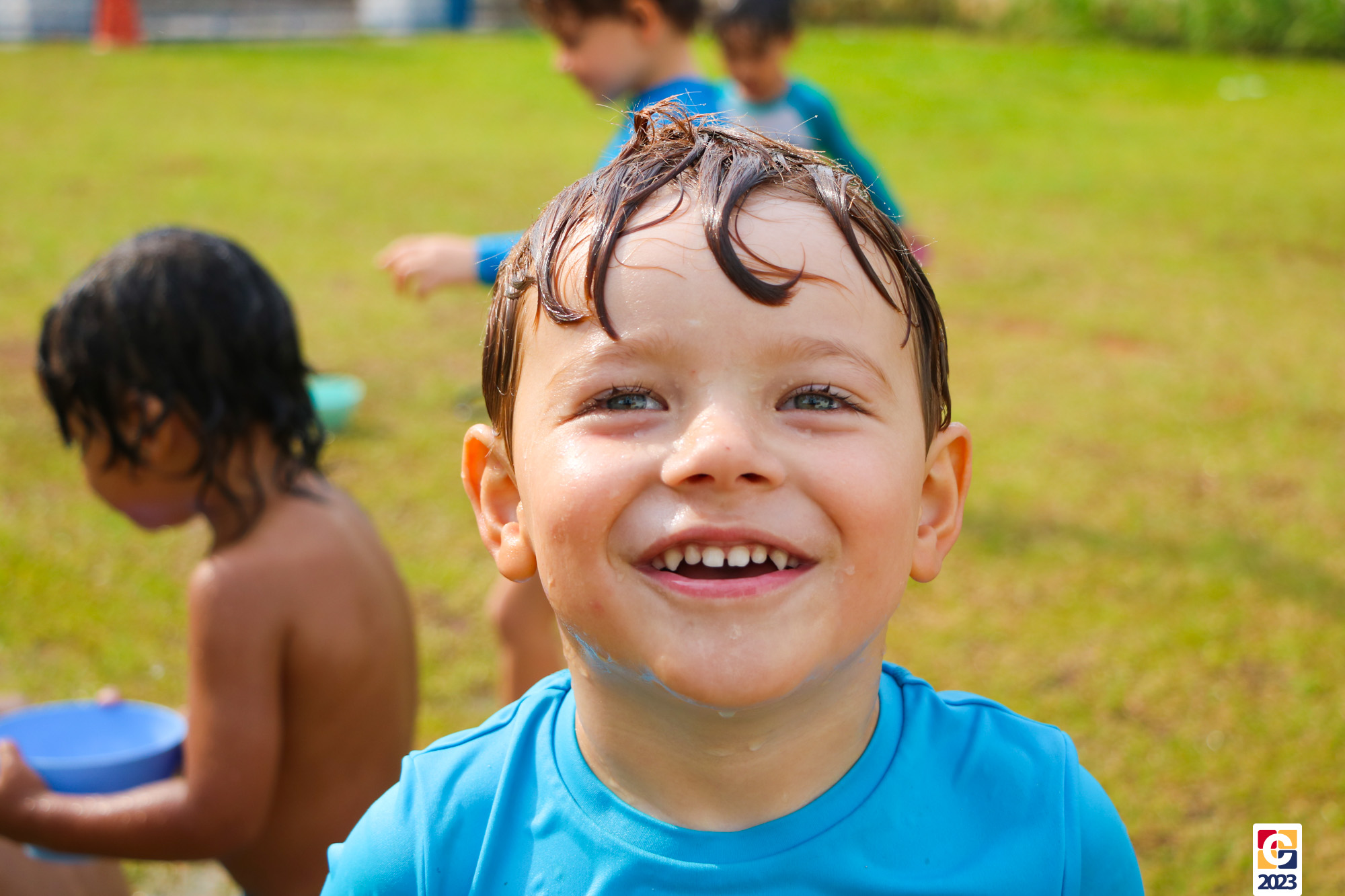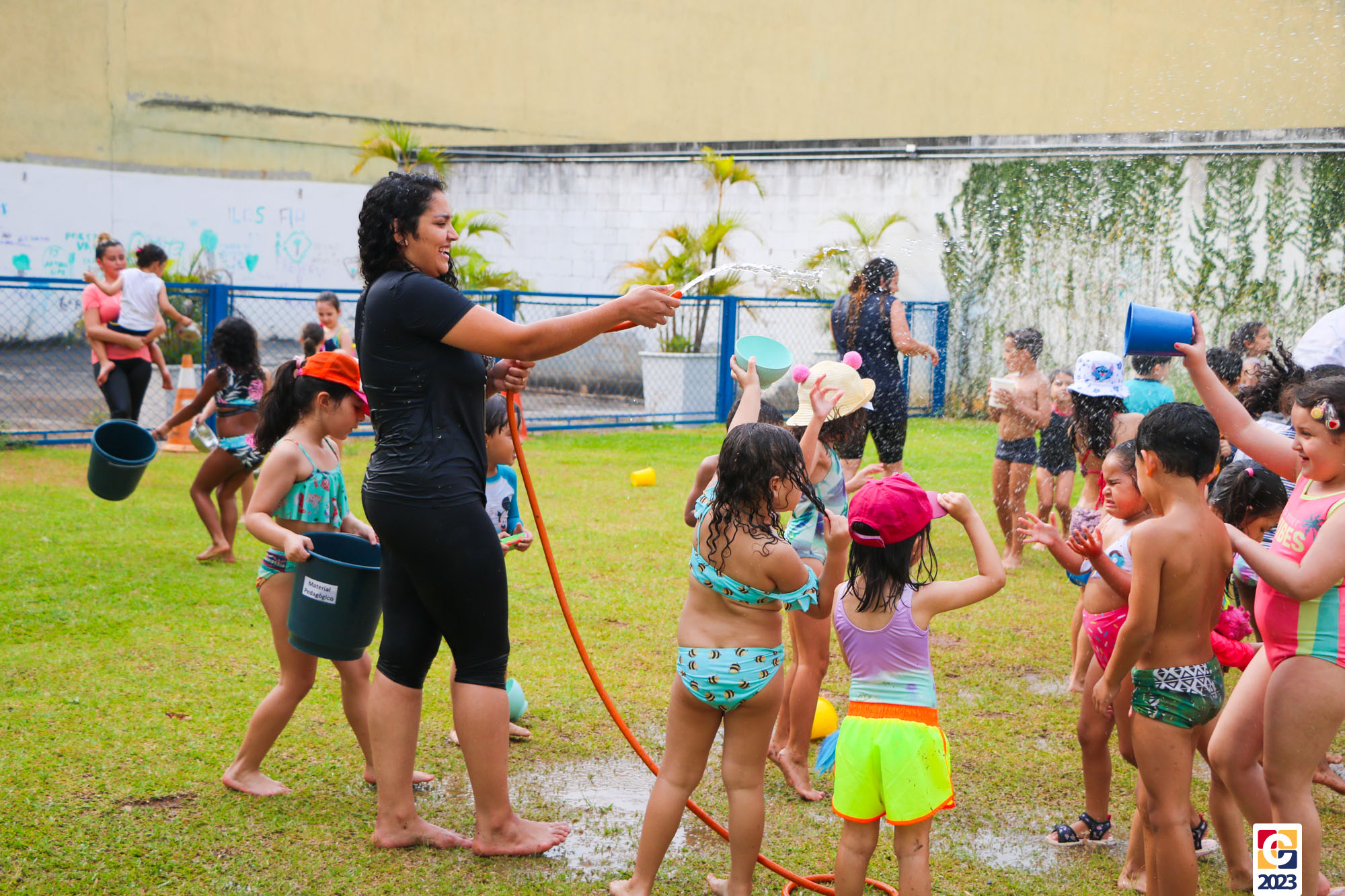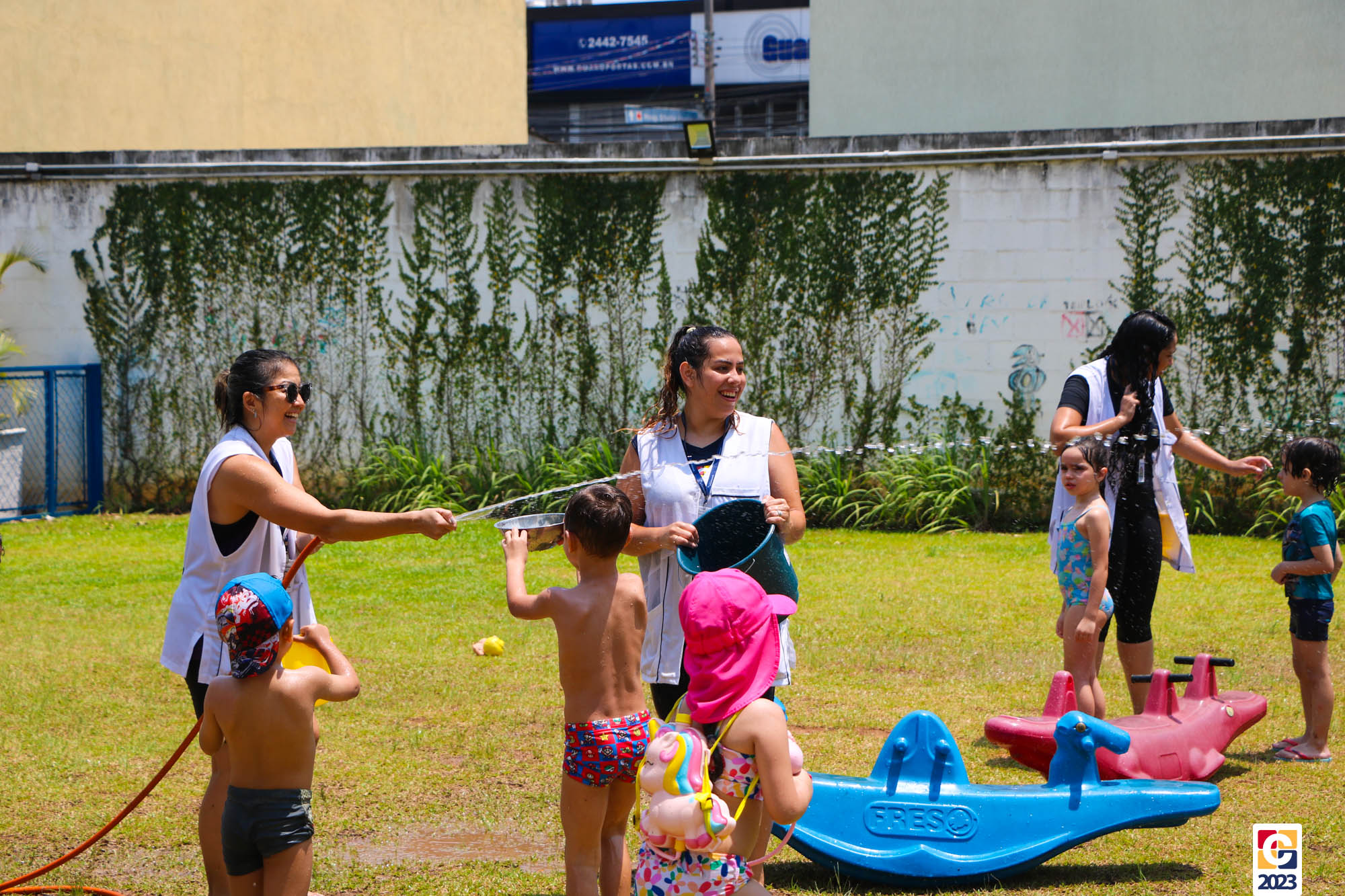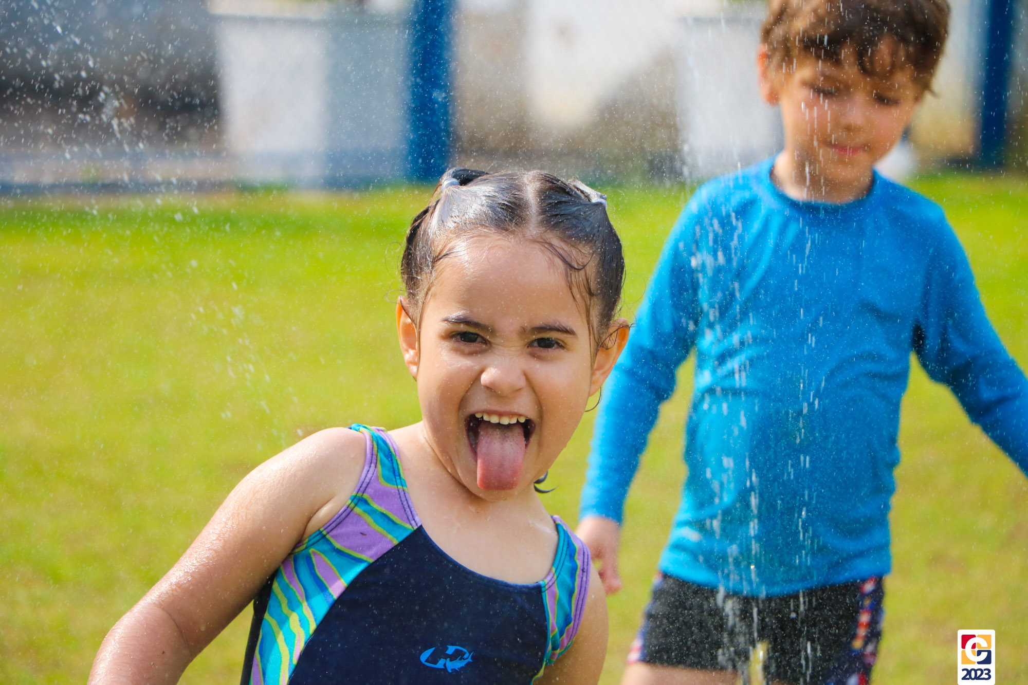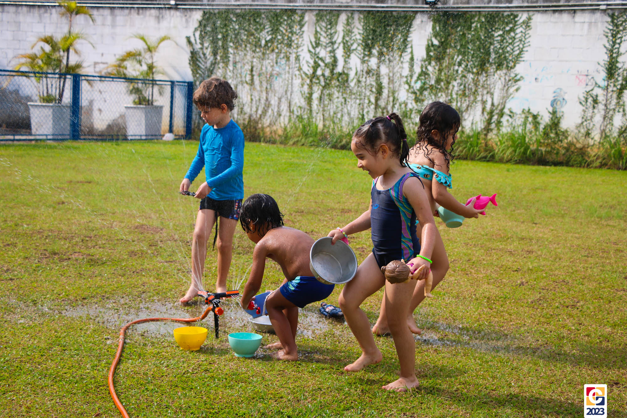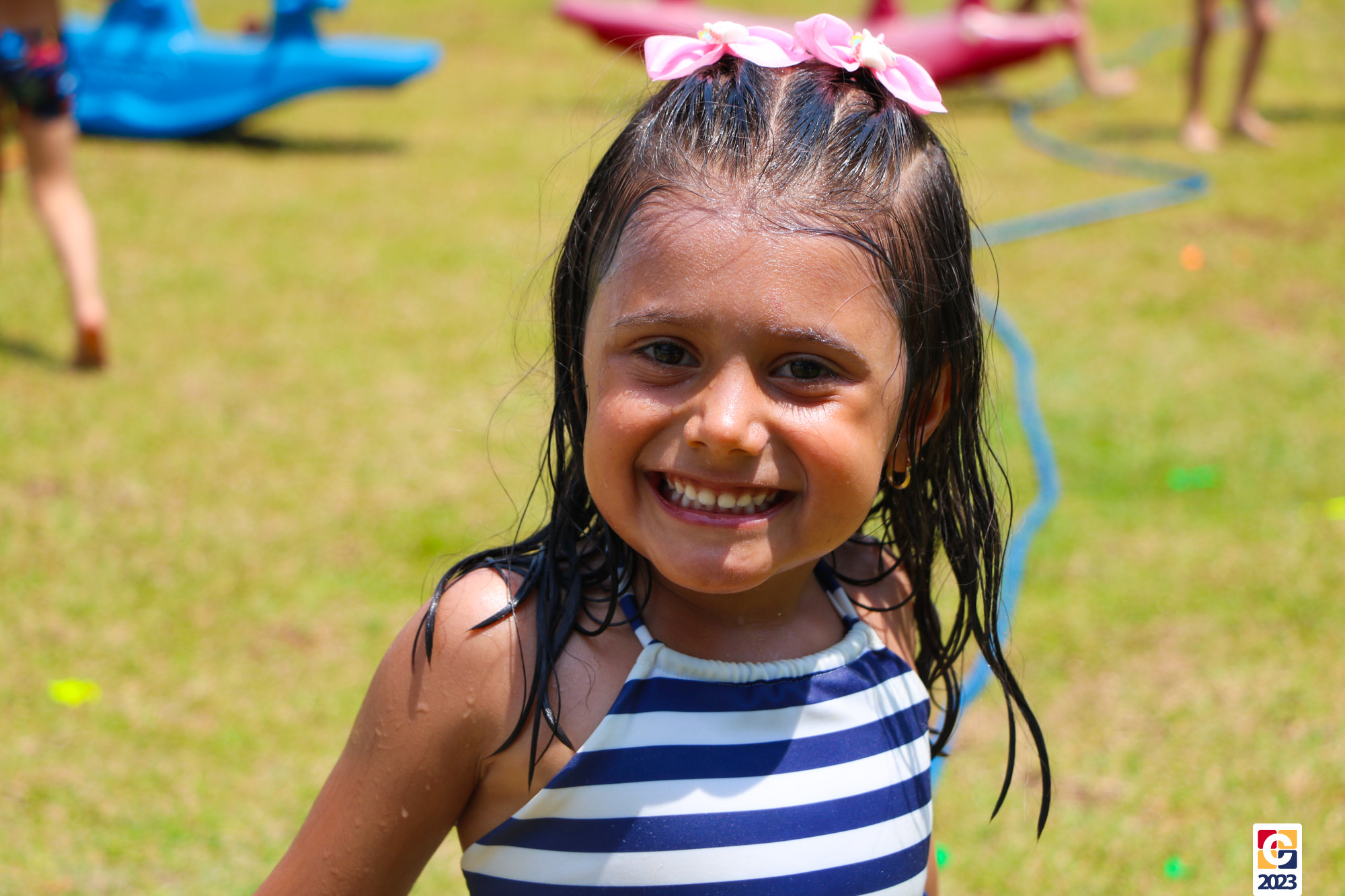 Professoras, assistentes e crianças, unidos pela alegria, esguichavam água uns nos outros em mais um dia mágico, desses que ficam gravados para sempre nas memórias de infância. 💧