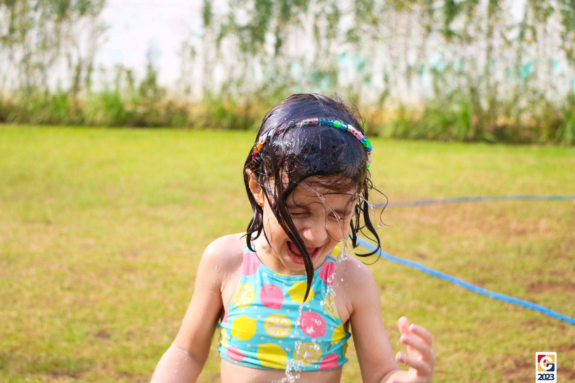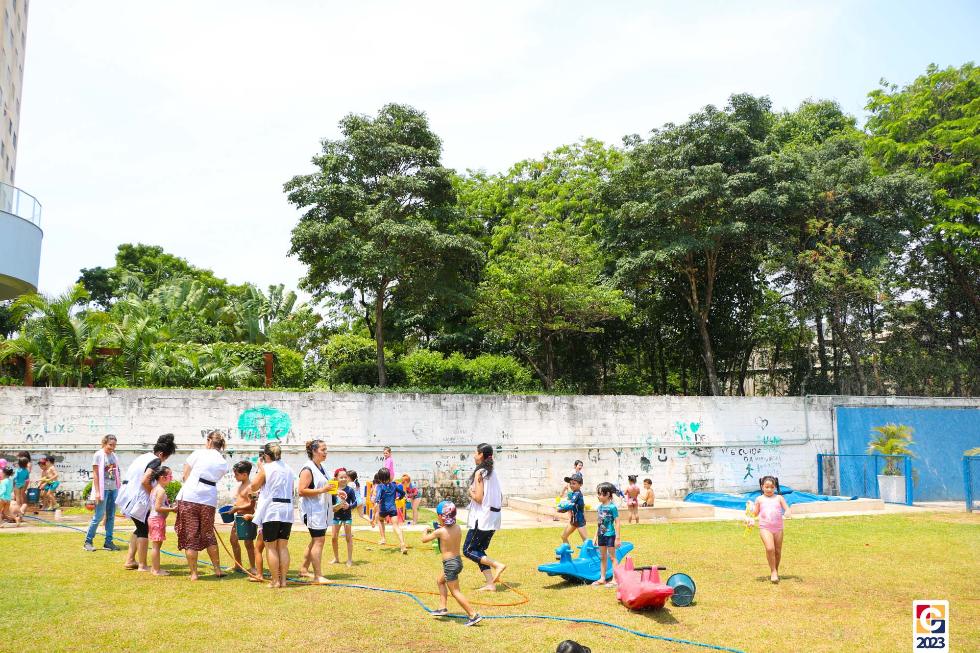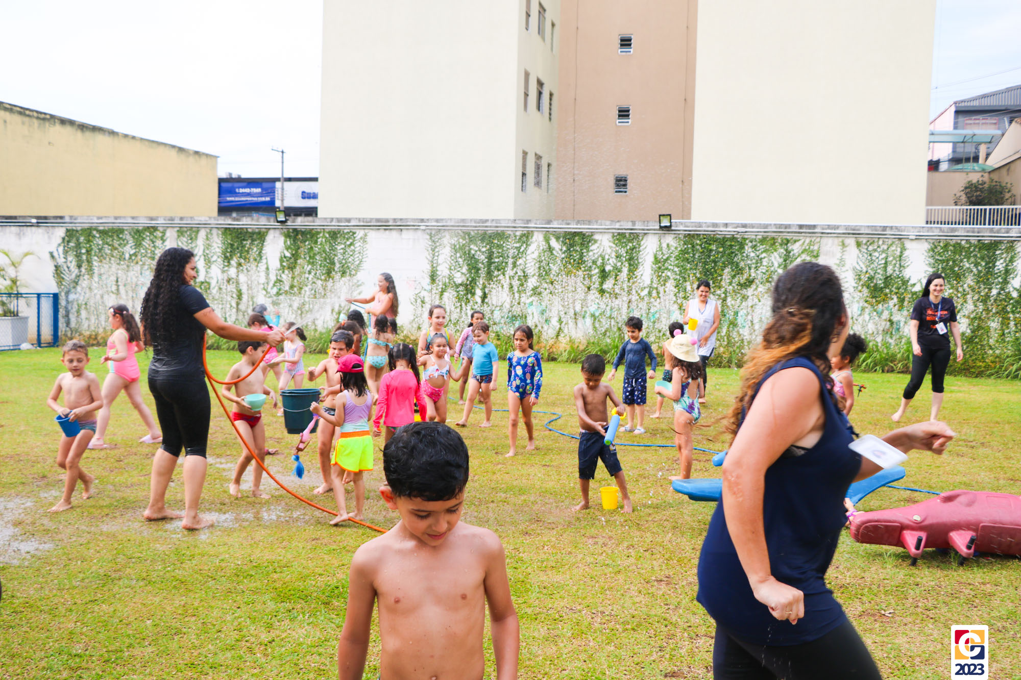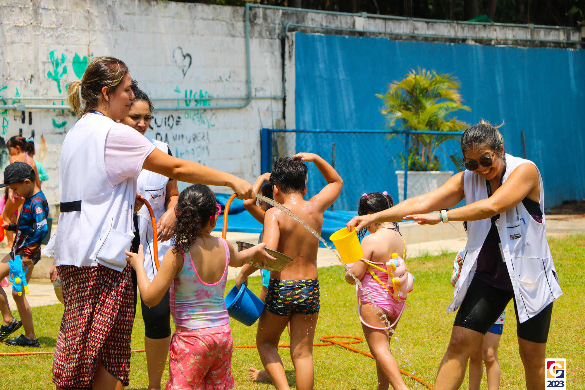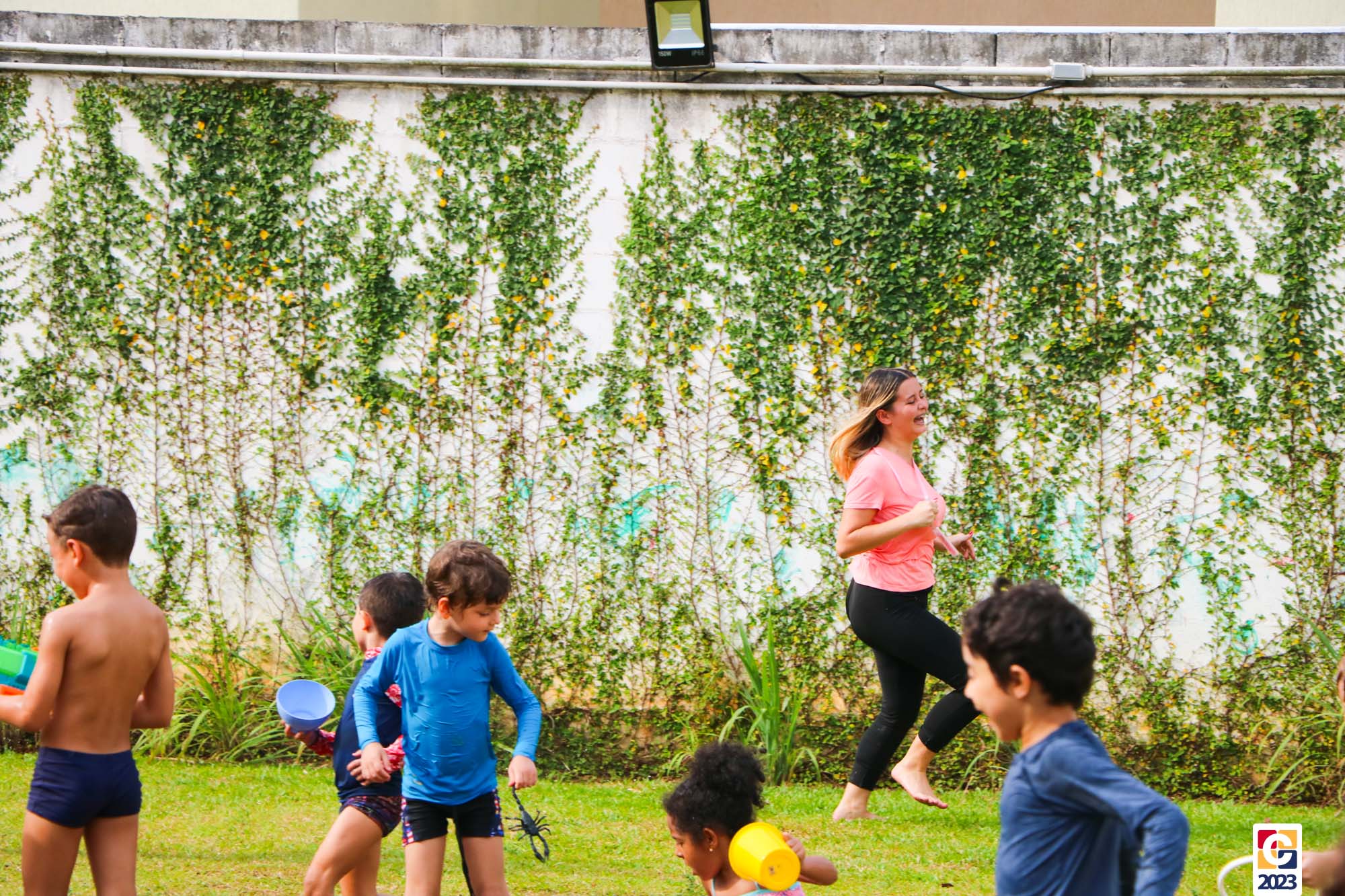 Professoras, assistentes e crianças, unidos pela alegria, esguichavam água uns nos outros em mais um dia mágico, desses que ficam gravados para sempre nas memórias de infância. 💧