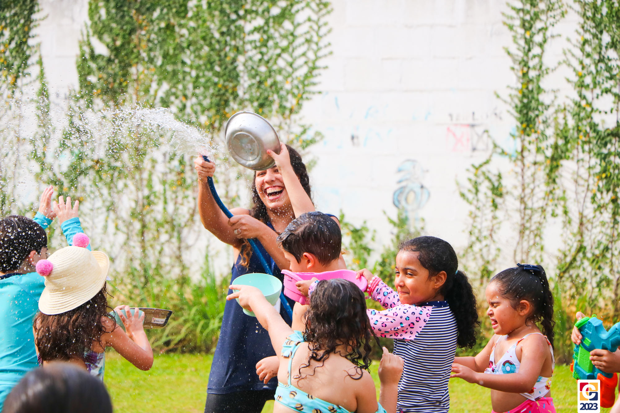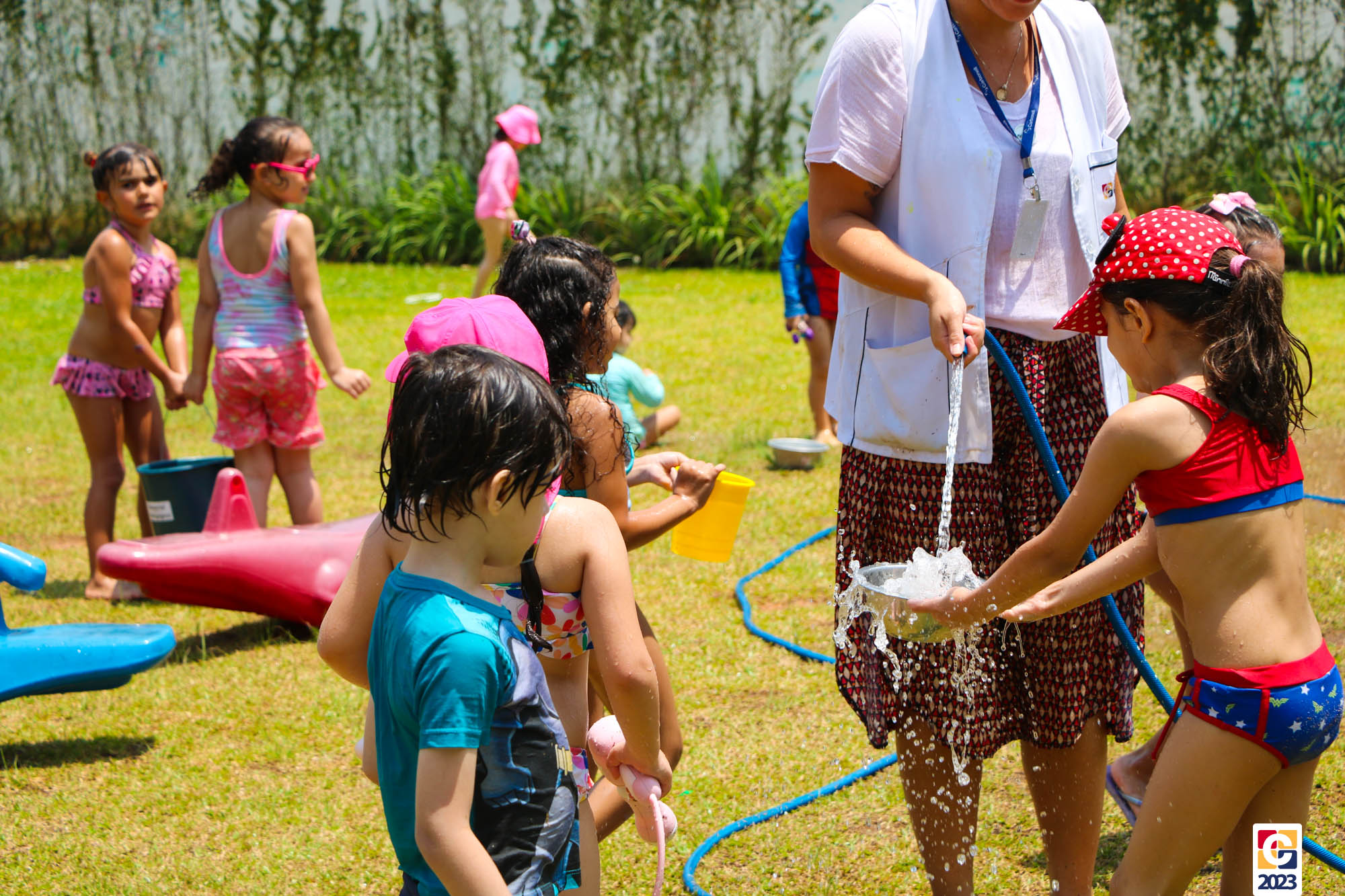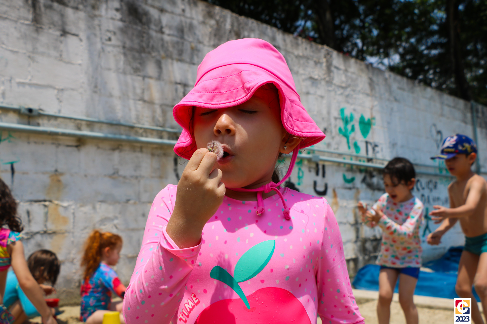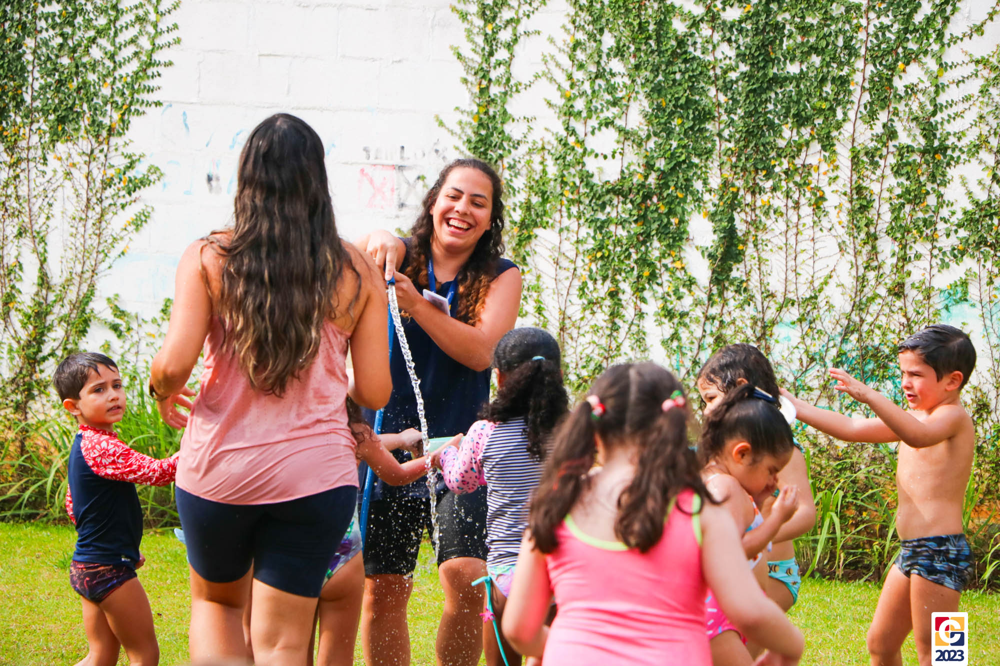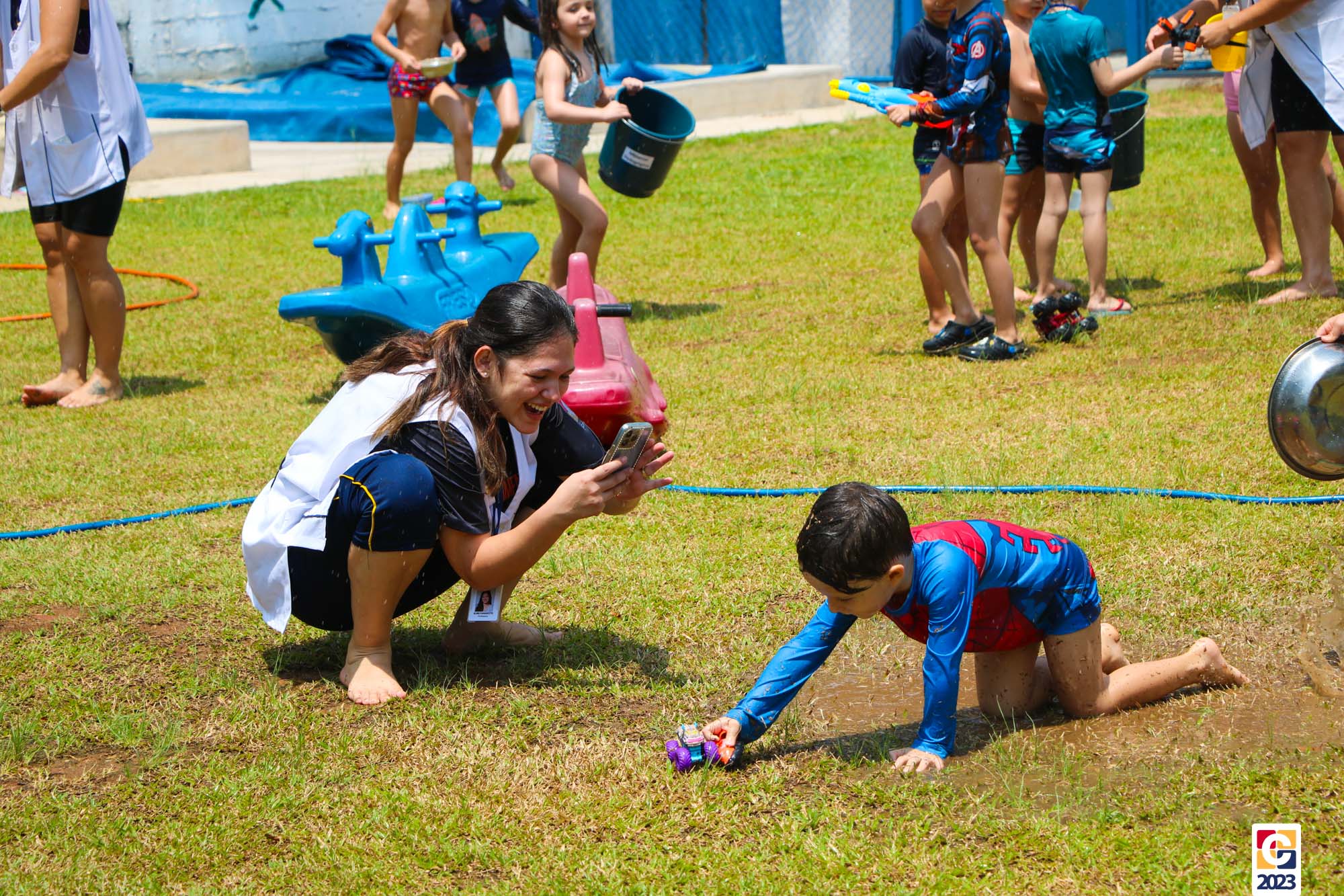 Professoras, assistentes e crianças, unidos pela alegria, esguichavam água uns nos outros em mais um dia mágico, desses que ficam gravados para sempre nas memórias de infância. 💧
