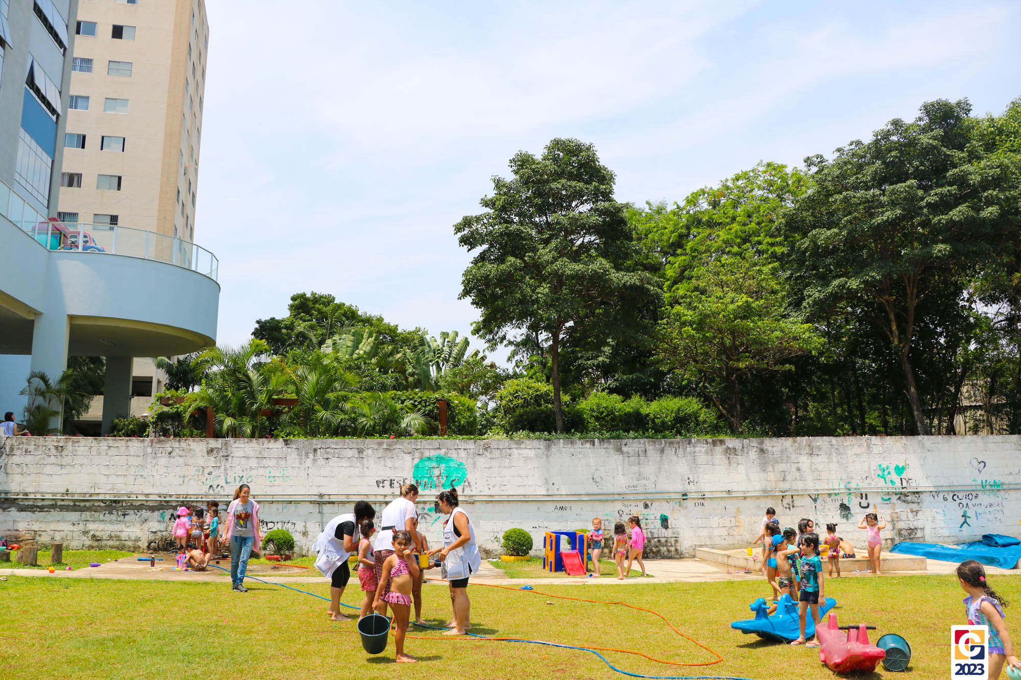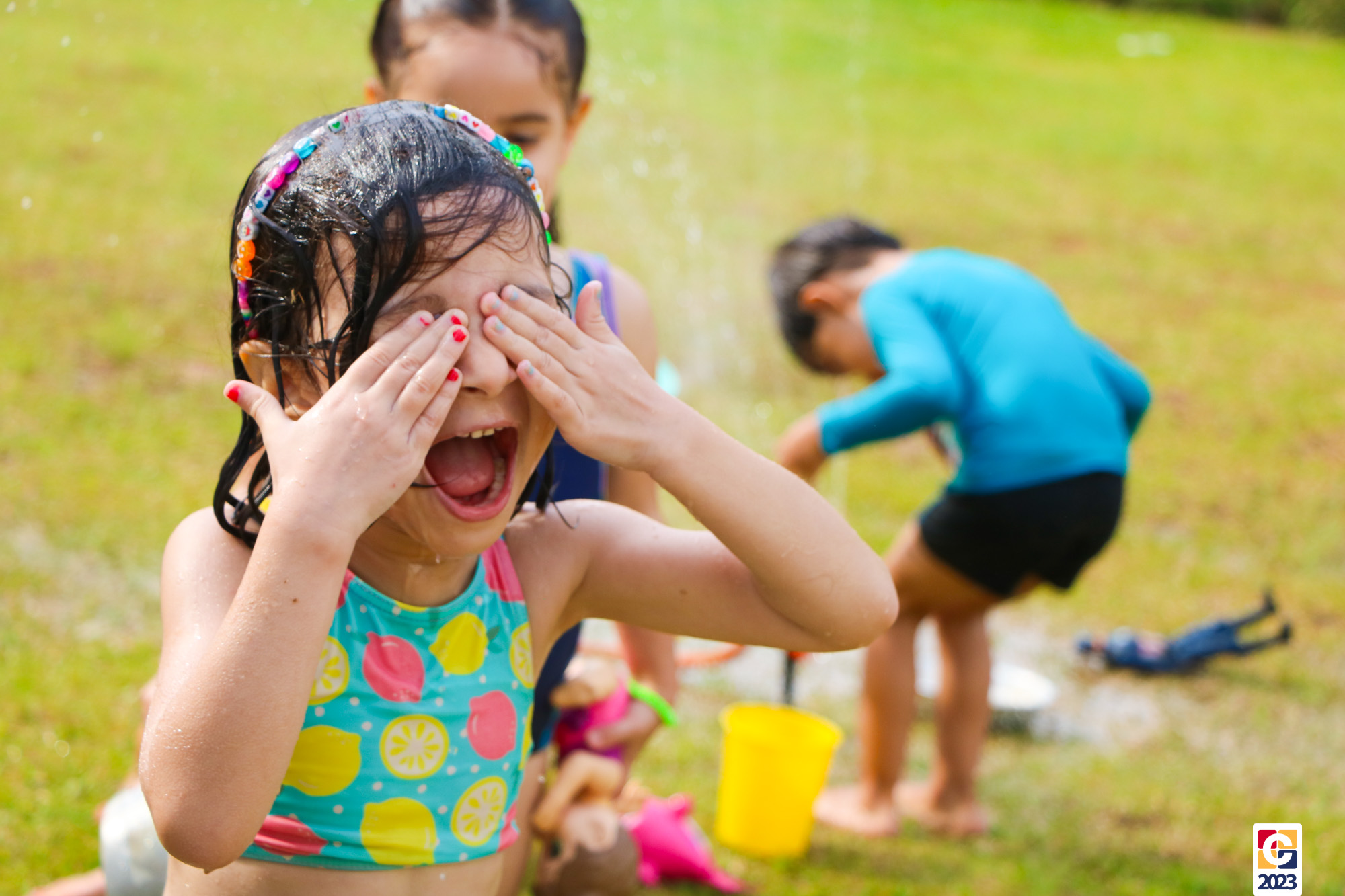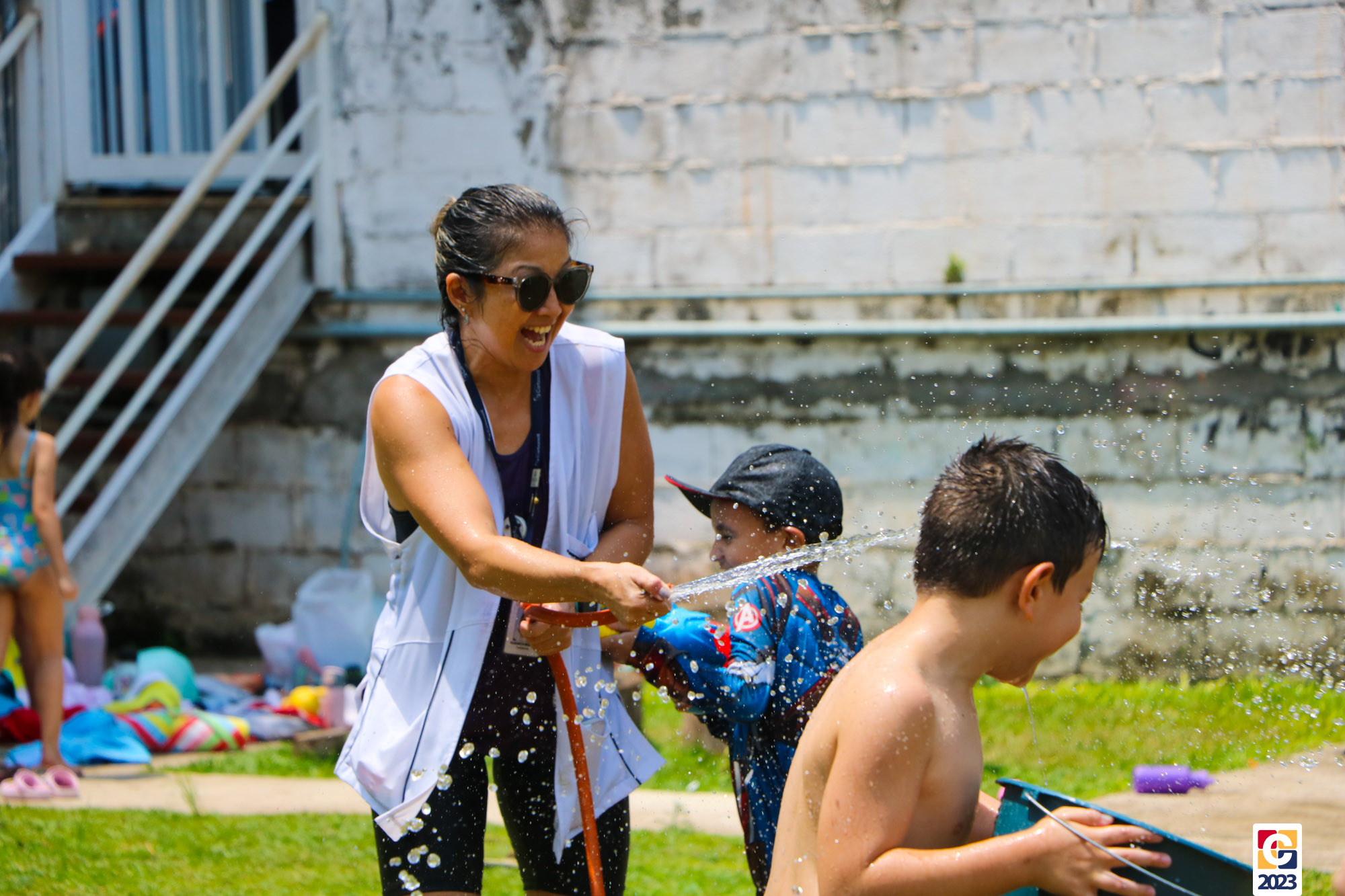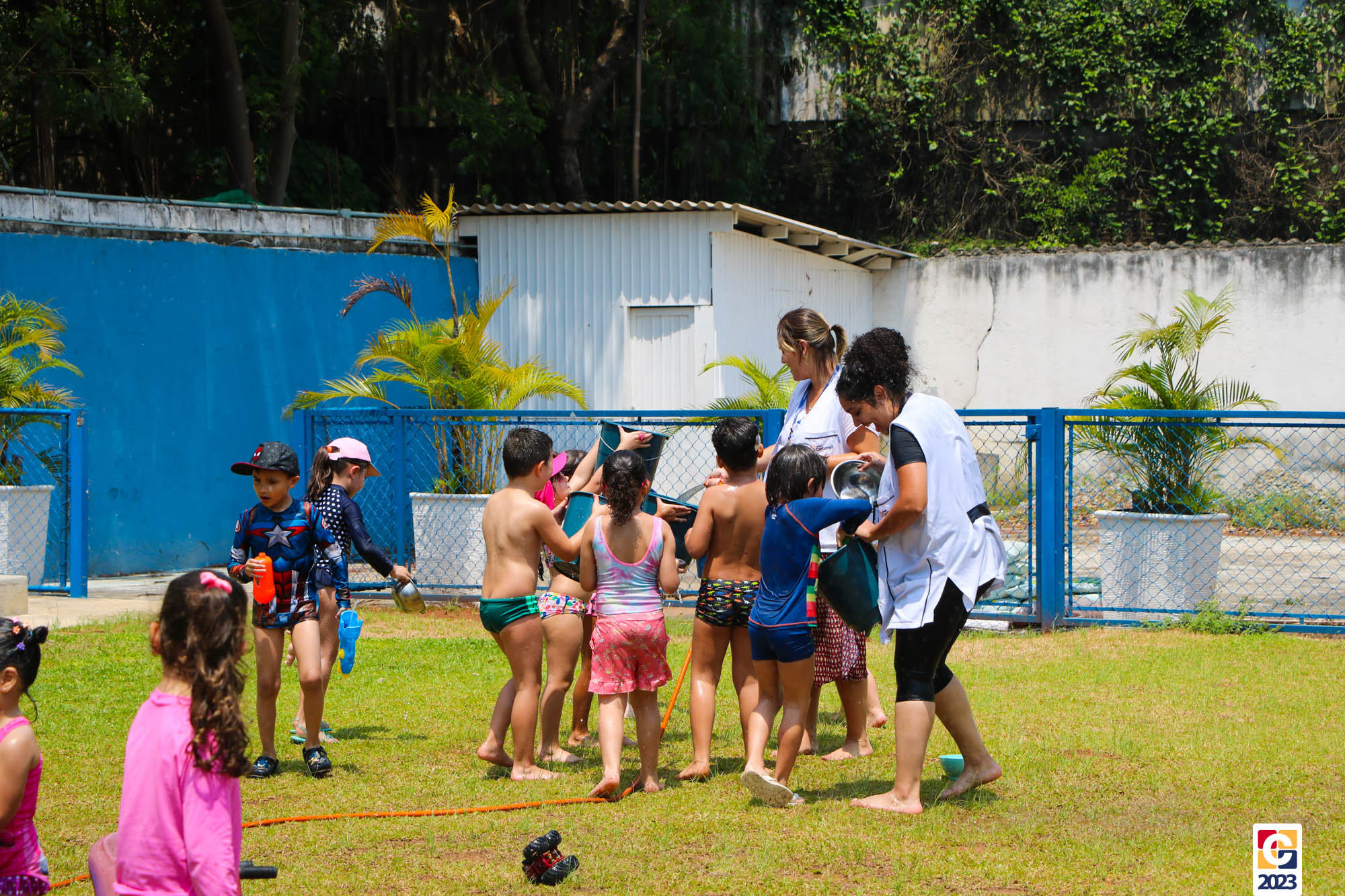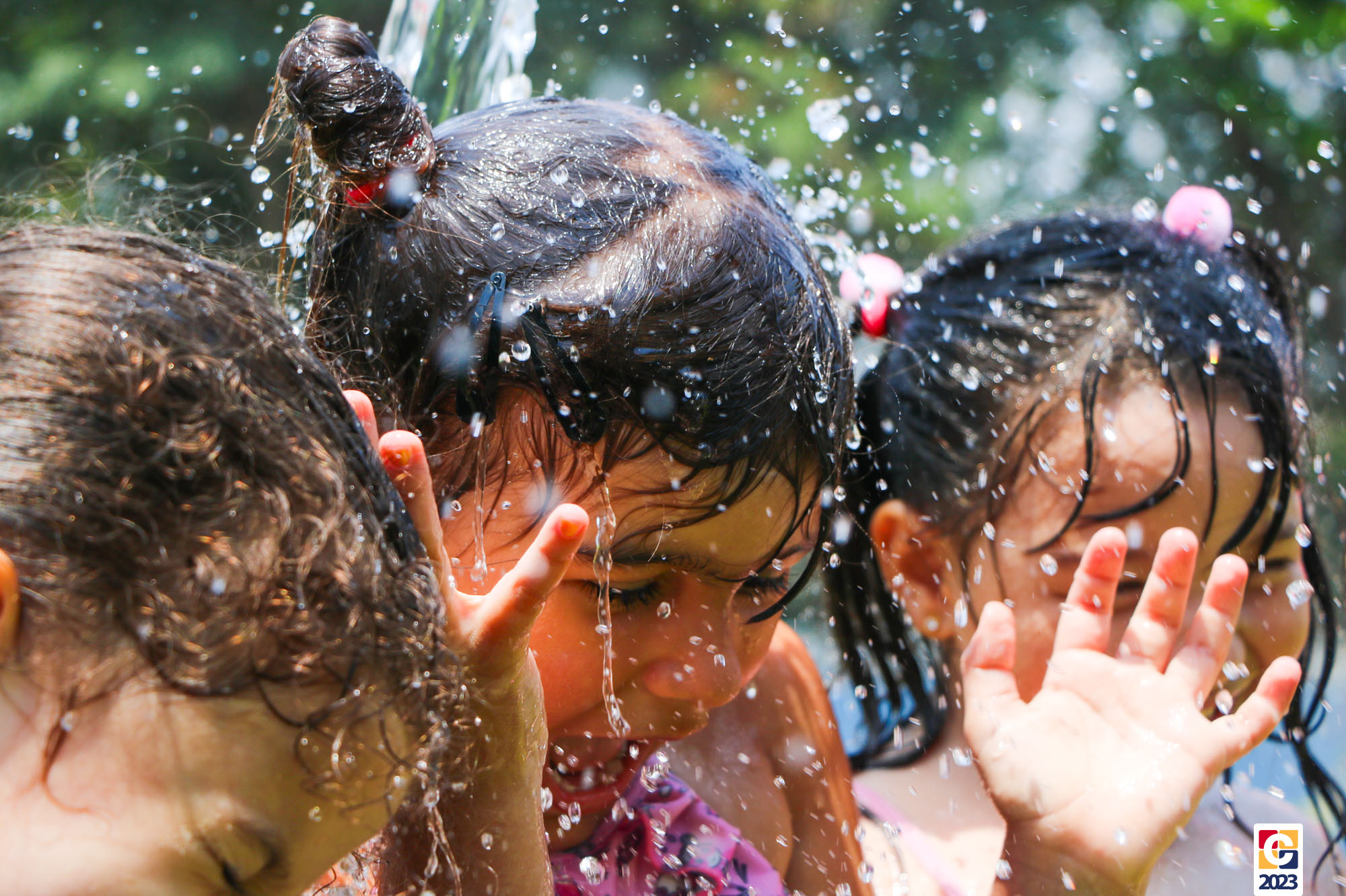 Professoras, assistentes e crianças, unidos pela alegria, esguichavam água uns nos outros em mais um dia mágico, desses que ficam gravados para sempre nas memórias de infância. 💧
