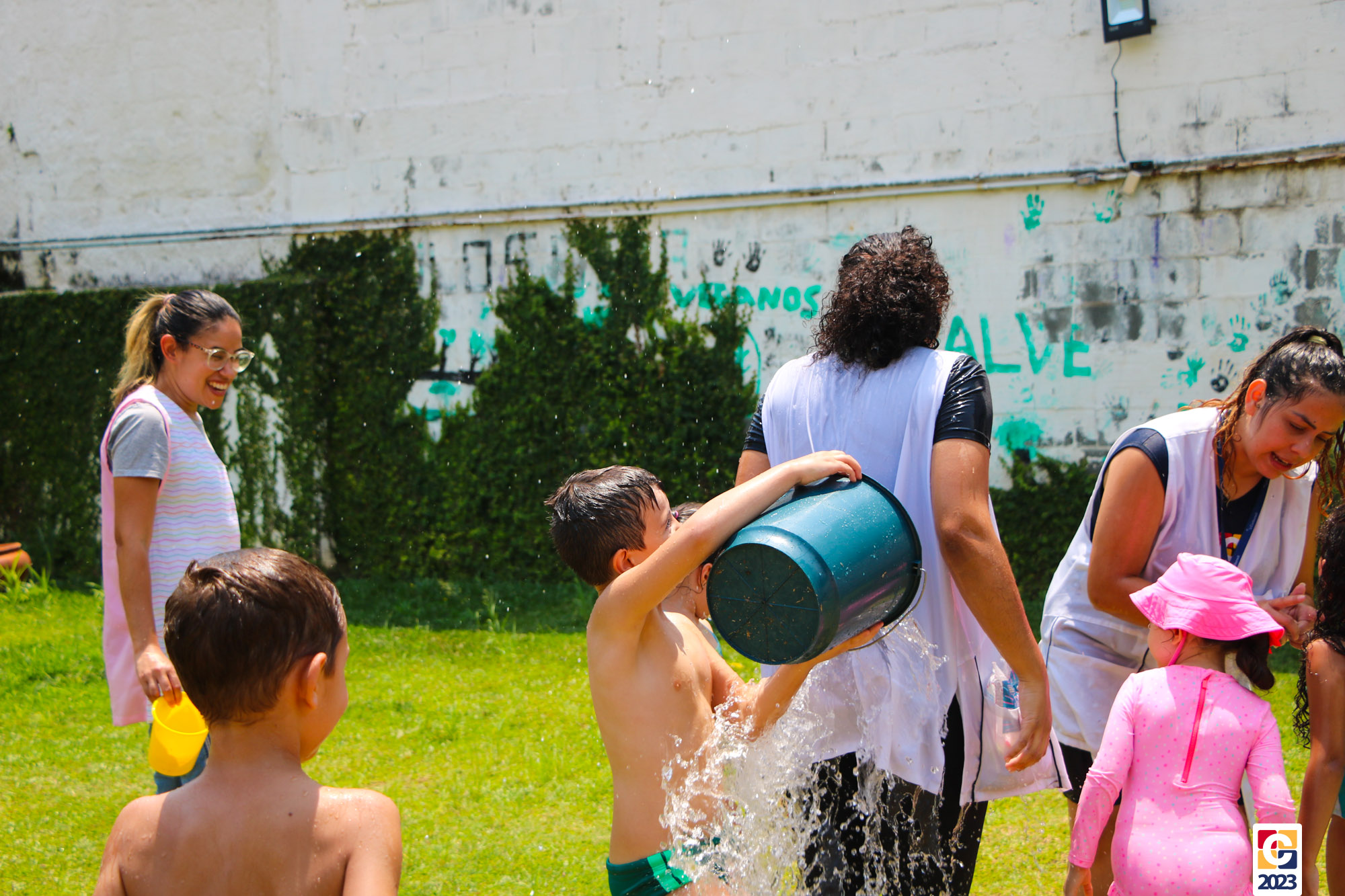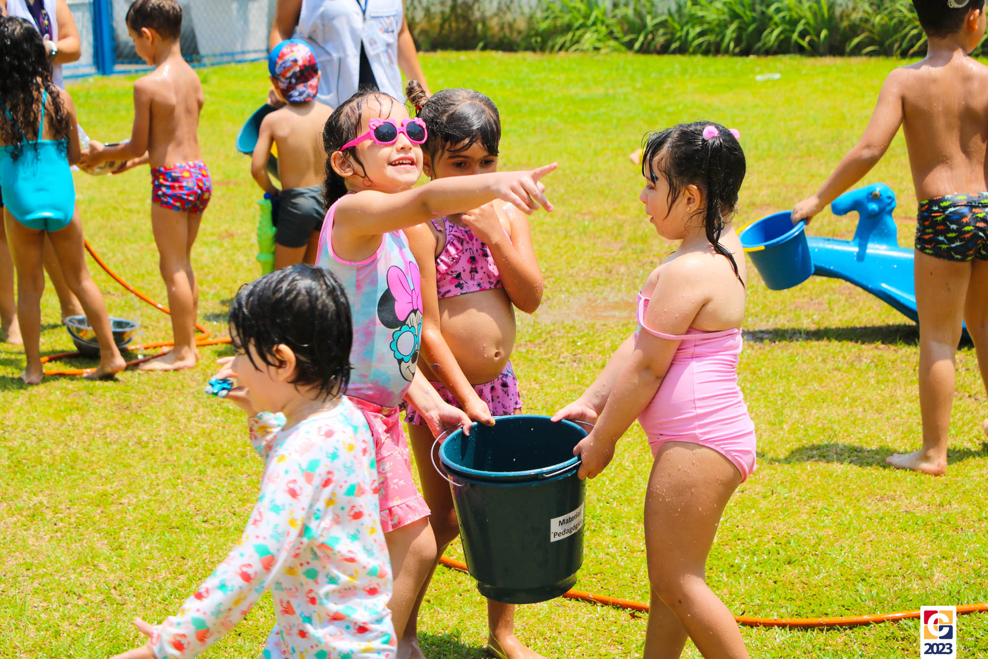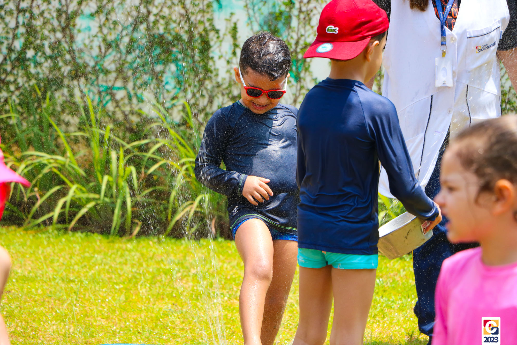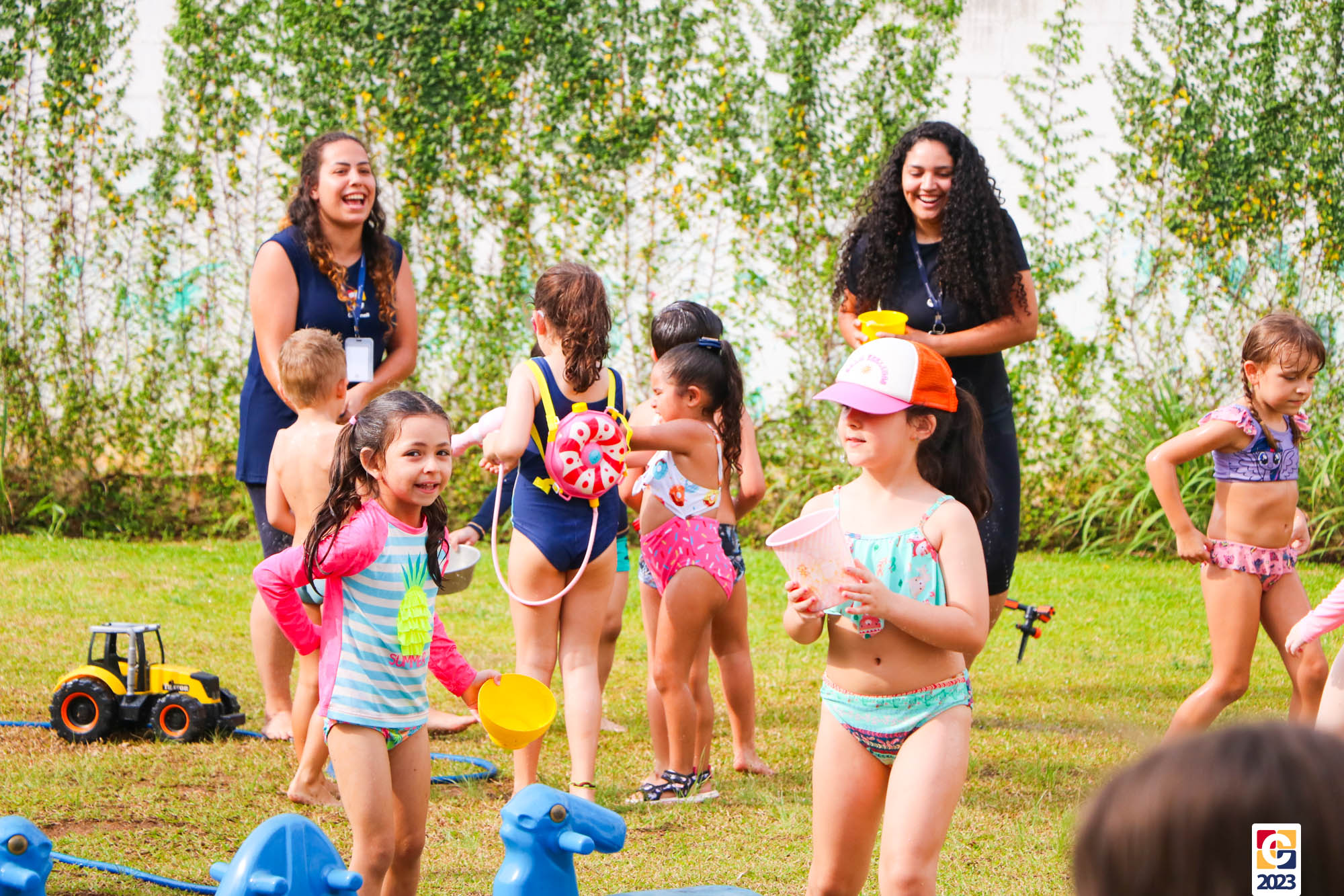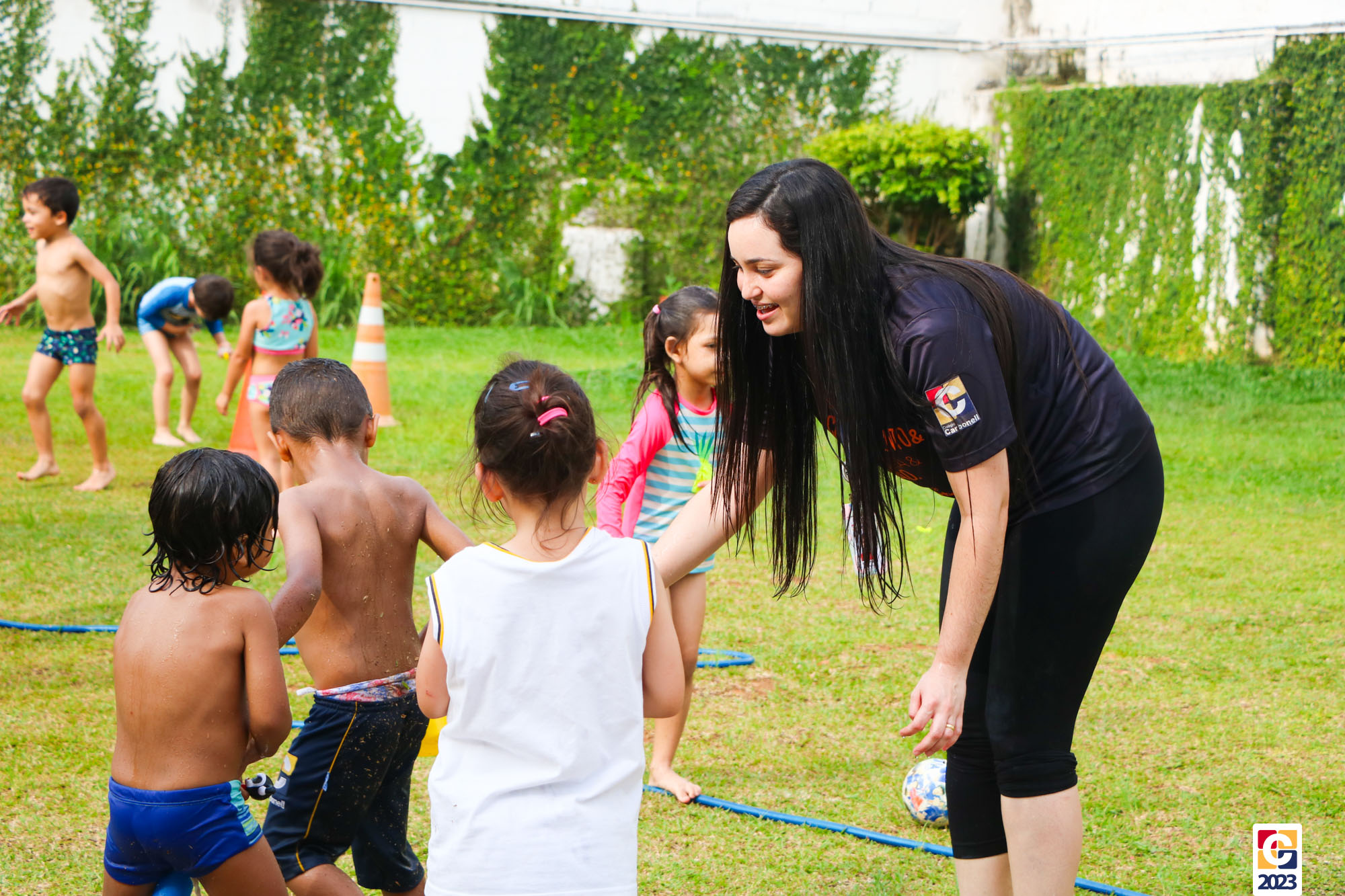 Professoras, assistentes e crianças, unidos pela alegria, esguichavam água uns nos outros em mais um dia mágico, desses que ficam gravados para sempre nas memórias de infância. 💧