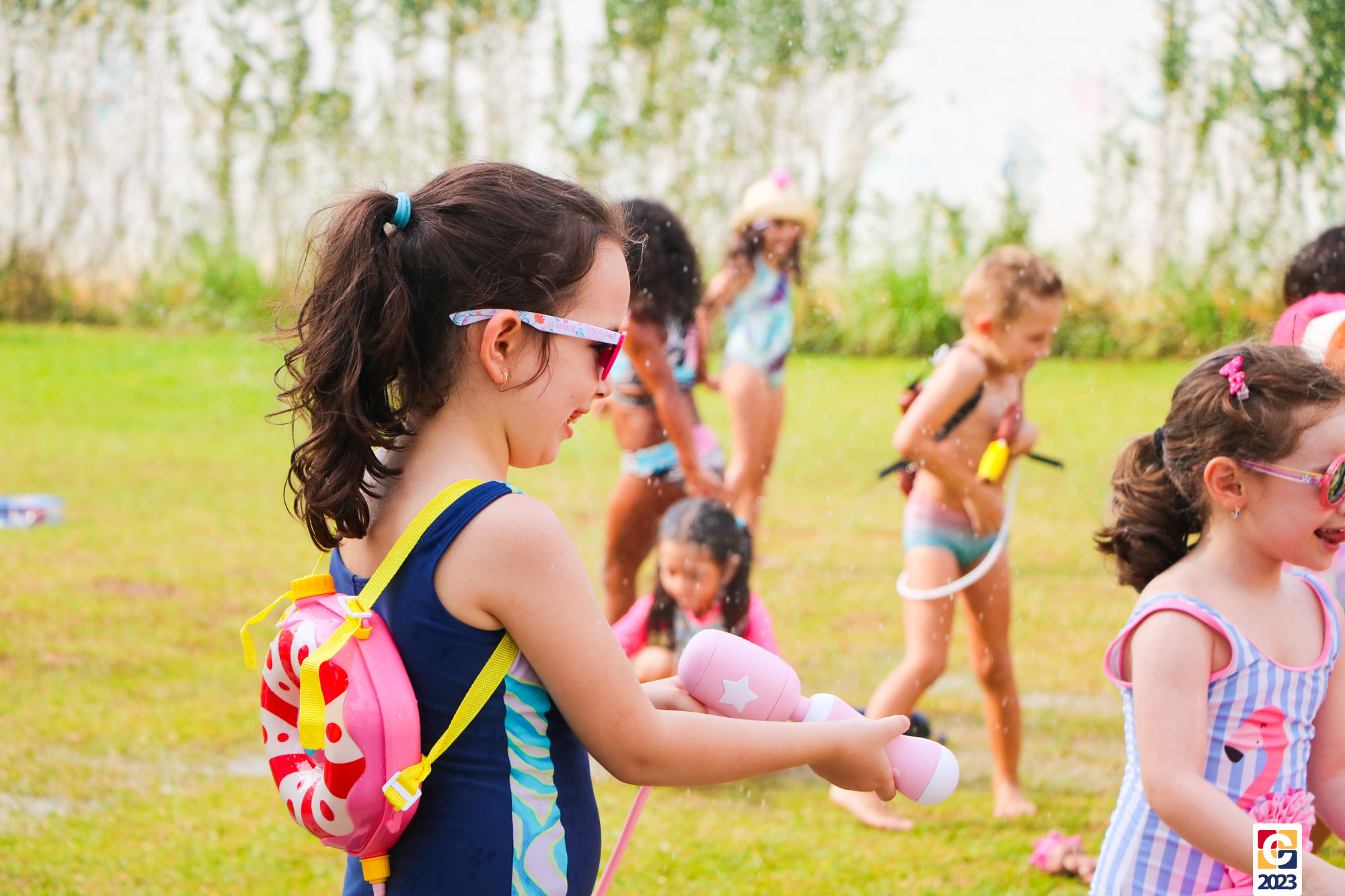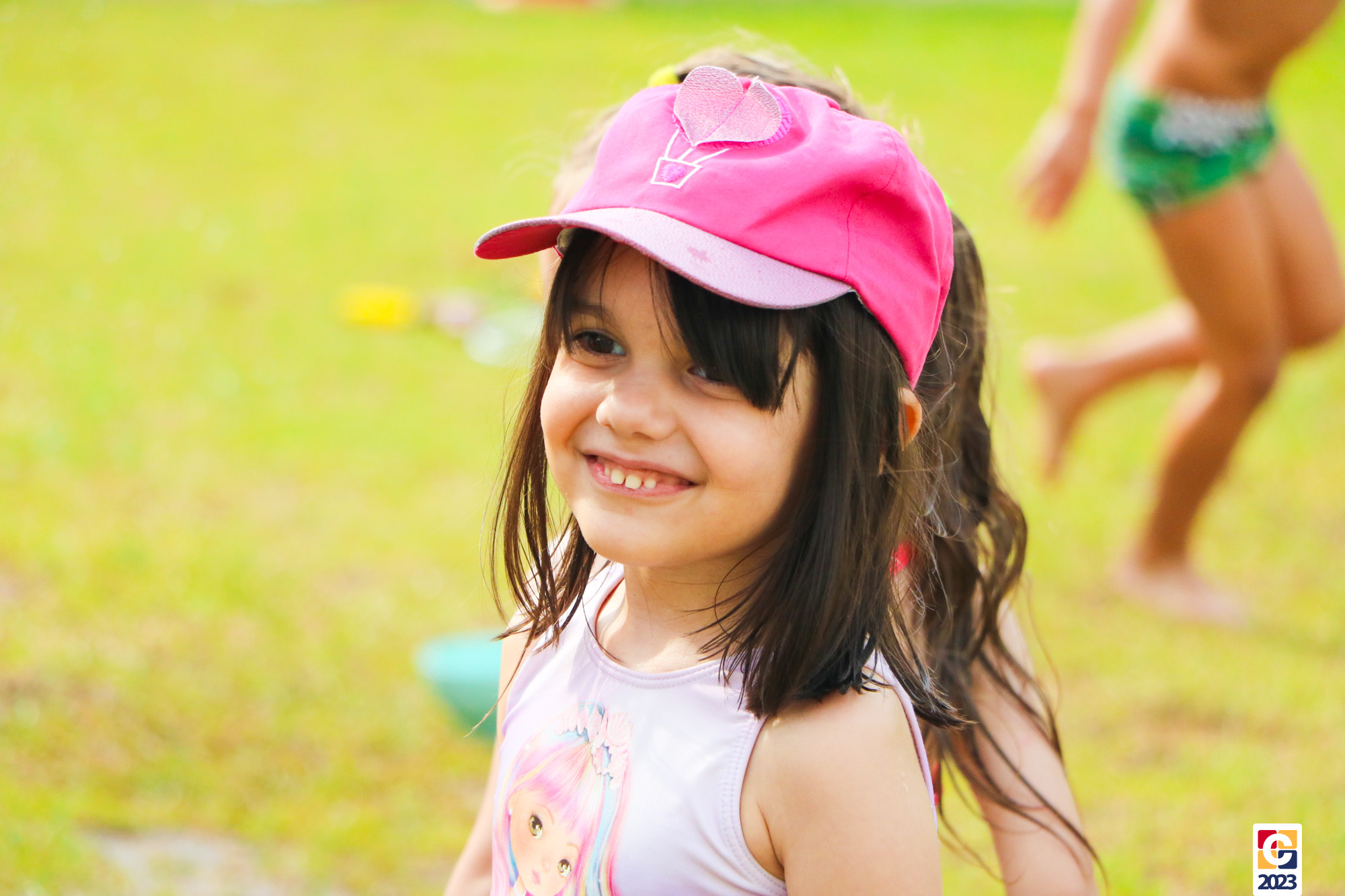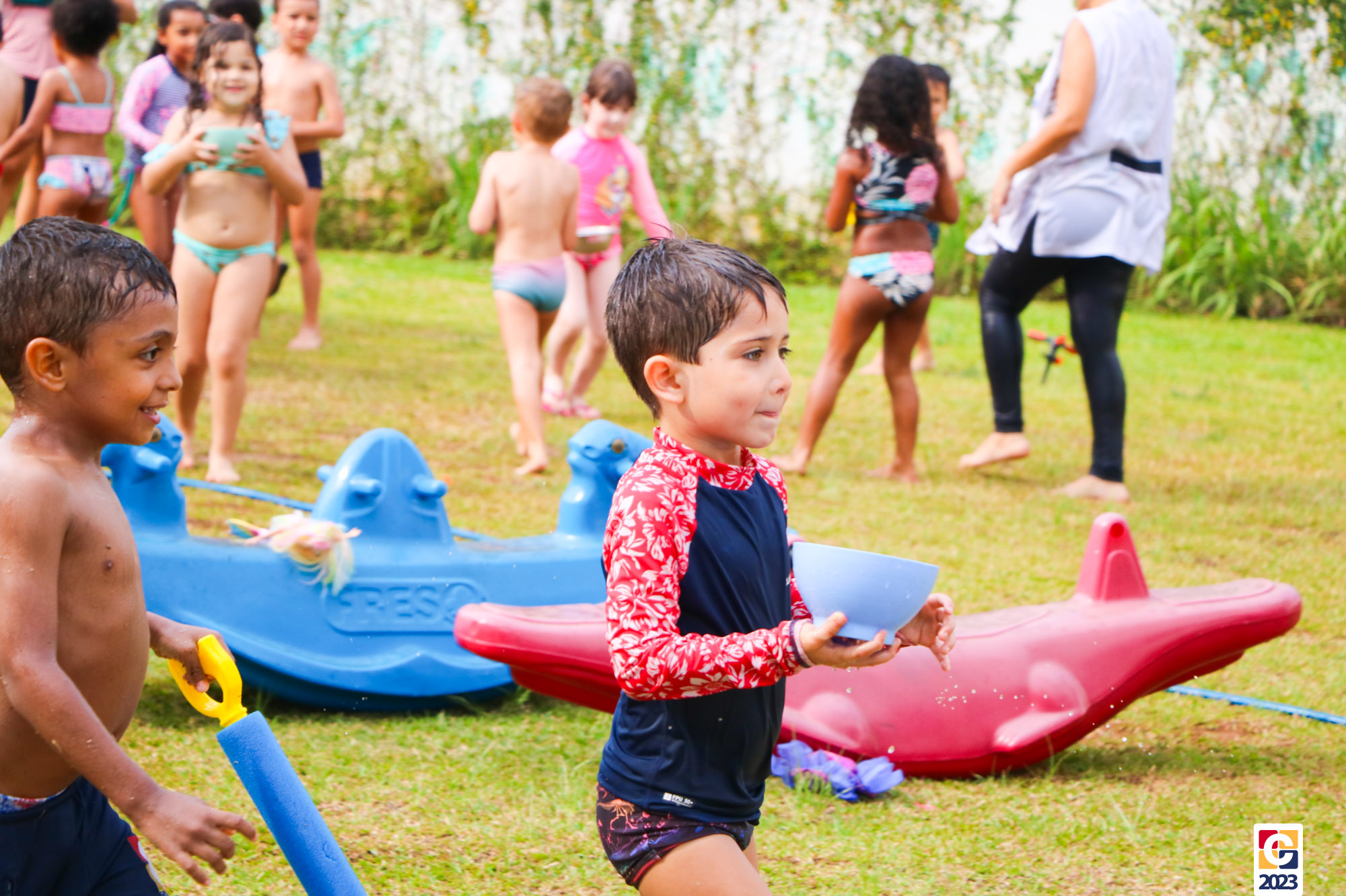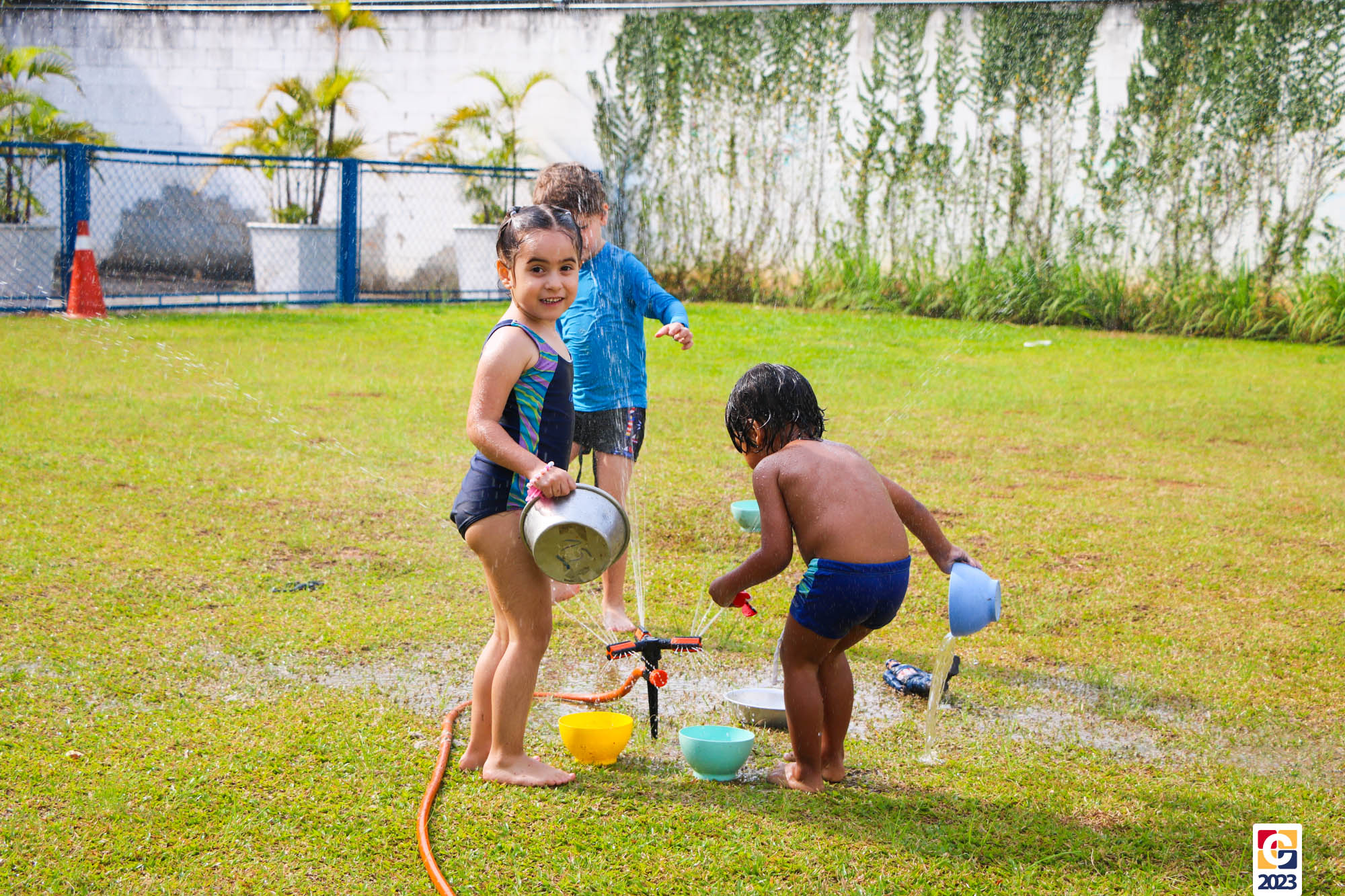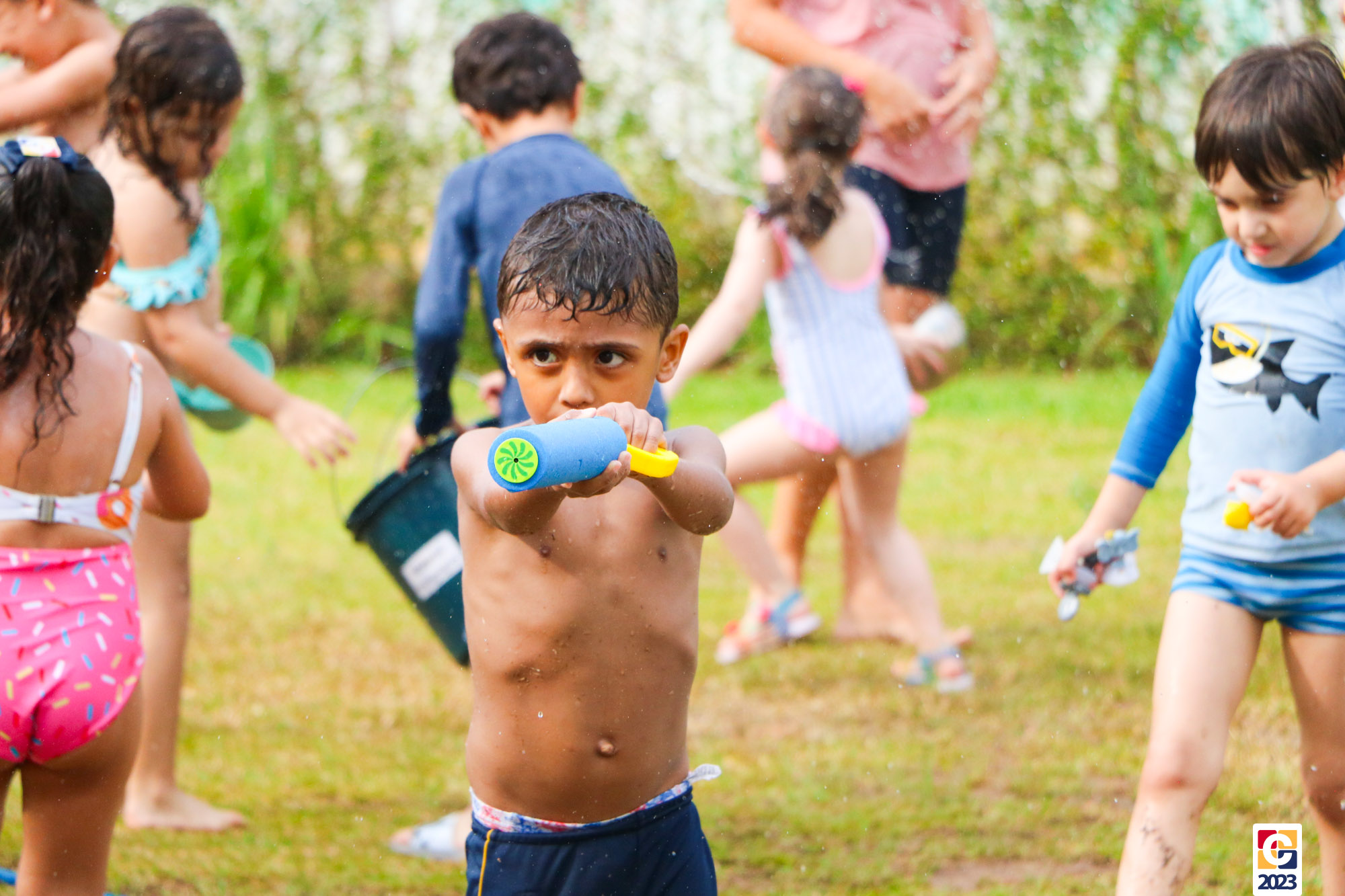 Professoras, assistentes e crianças, unidos pela alegria, esguichavam água uns nos outros em mais um dia mágico, desses que ficam gravados para sempre nas memórias de infância. 💧
