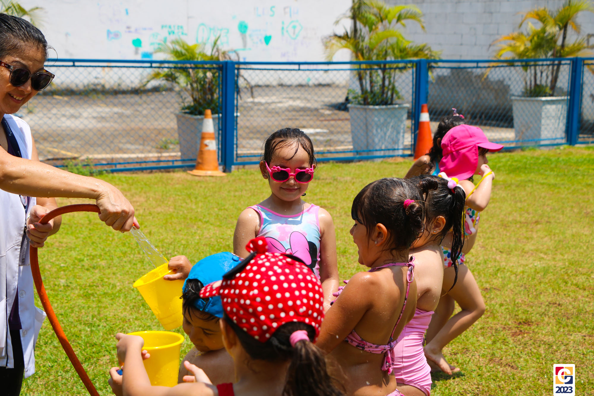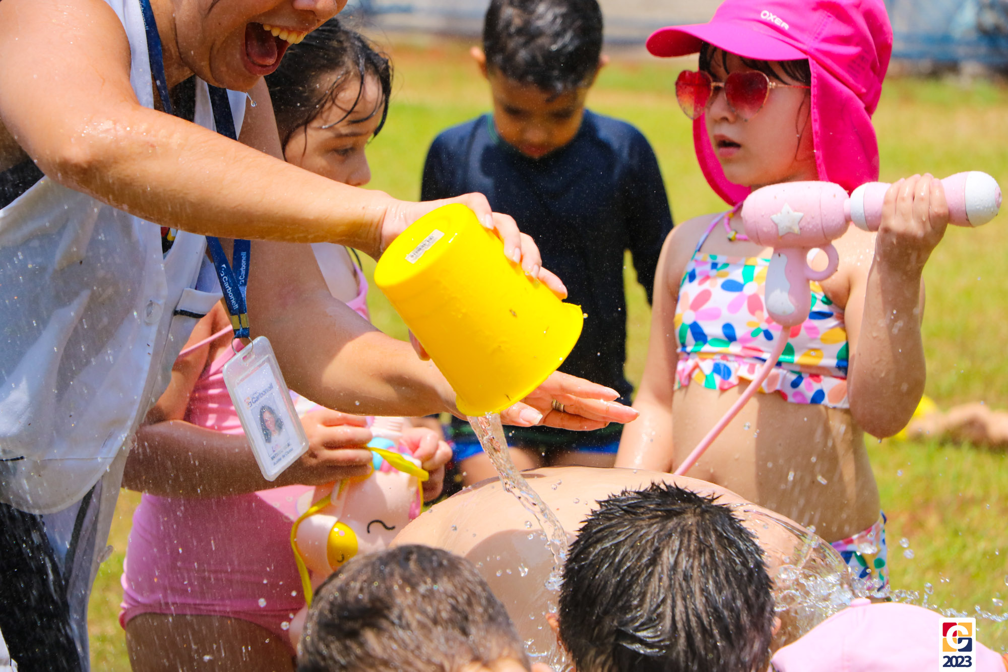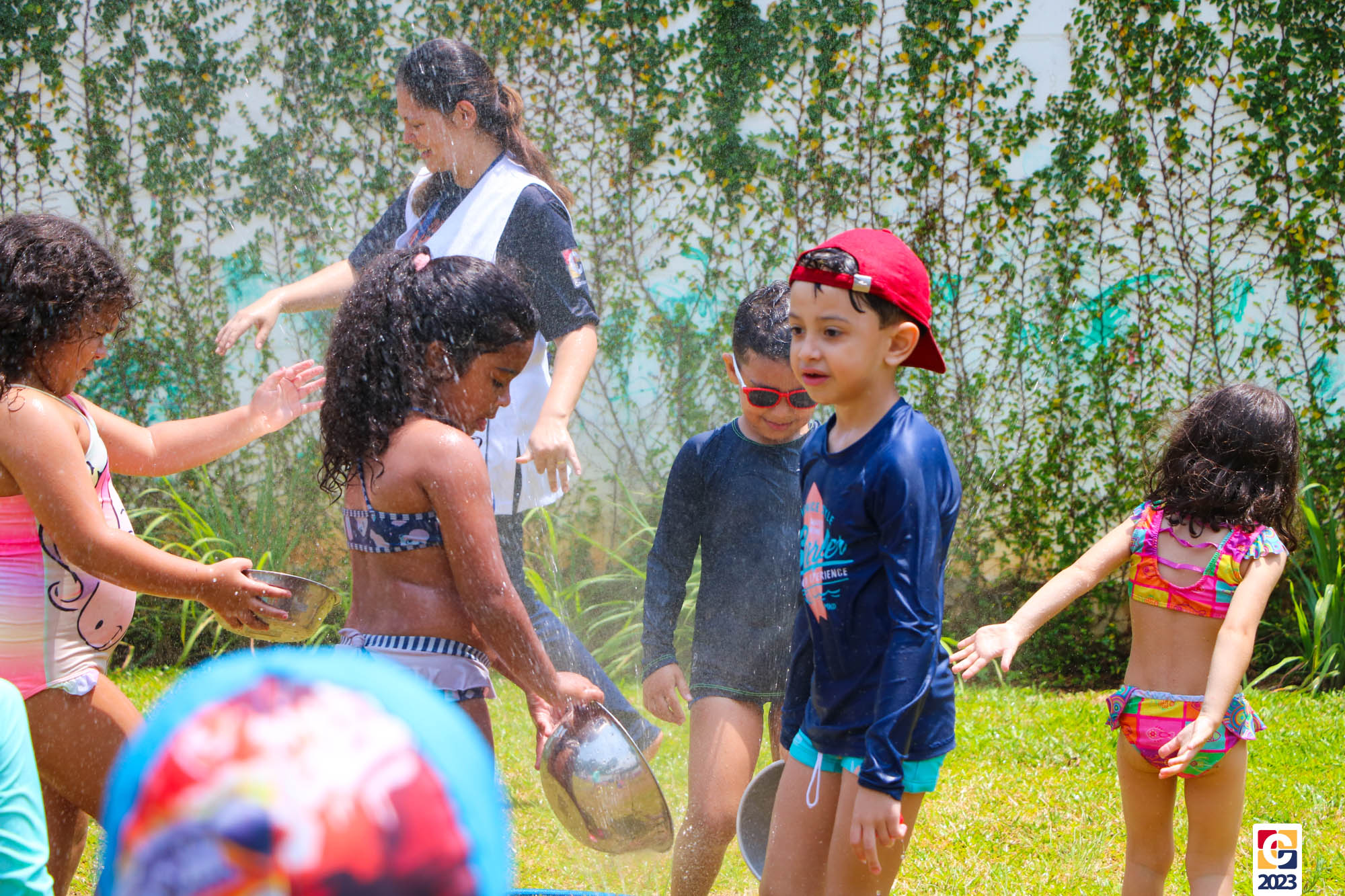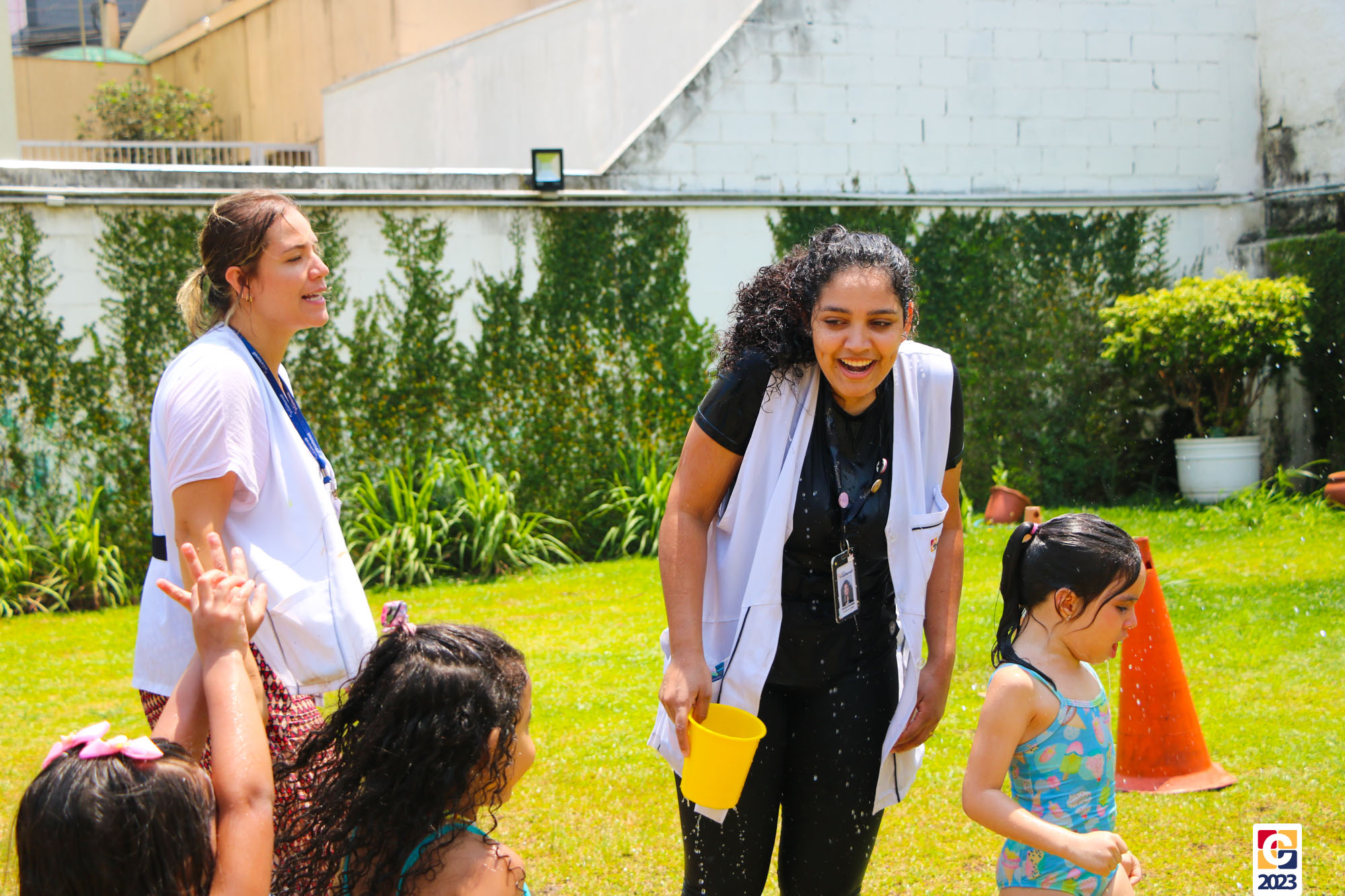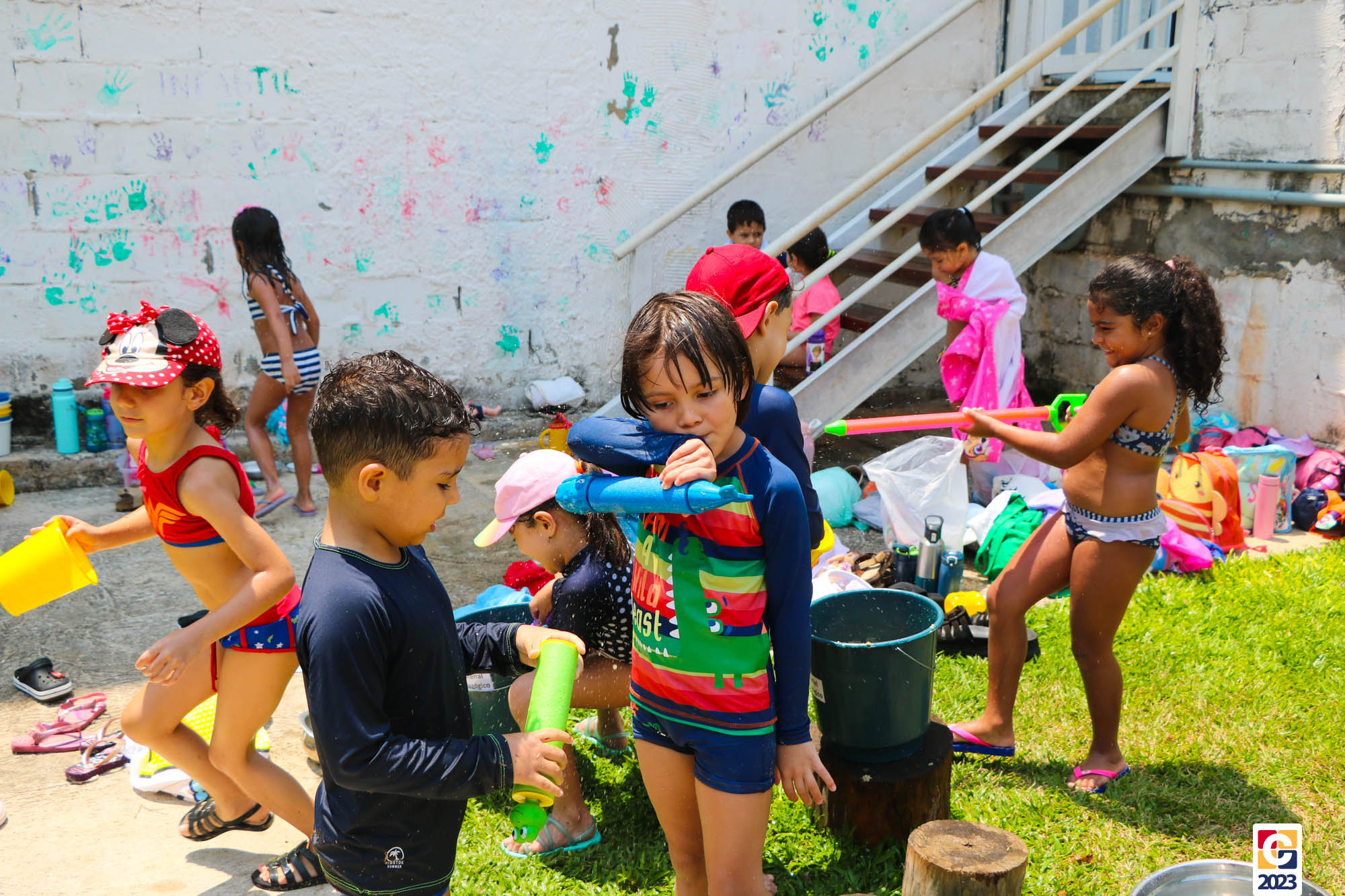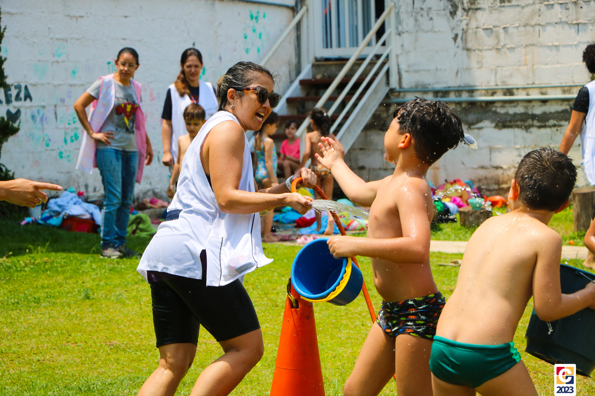 Professoras, assistentes e crianças, unidos pela alegria, esguichavam água uns nos outros em mais um dia mágico, desses que ficam gravados para sempre nas memórias de infância. 💧
