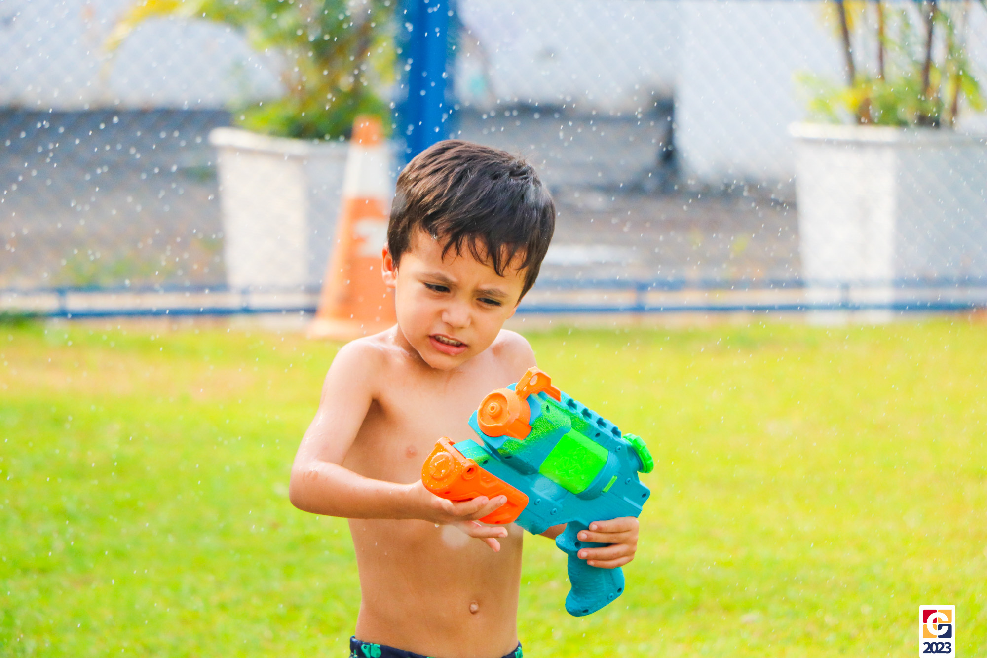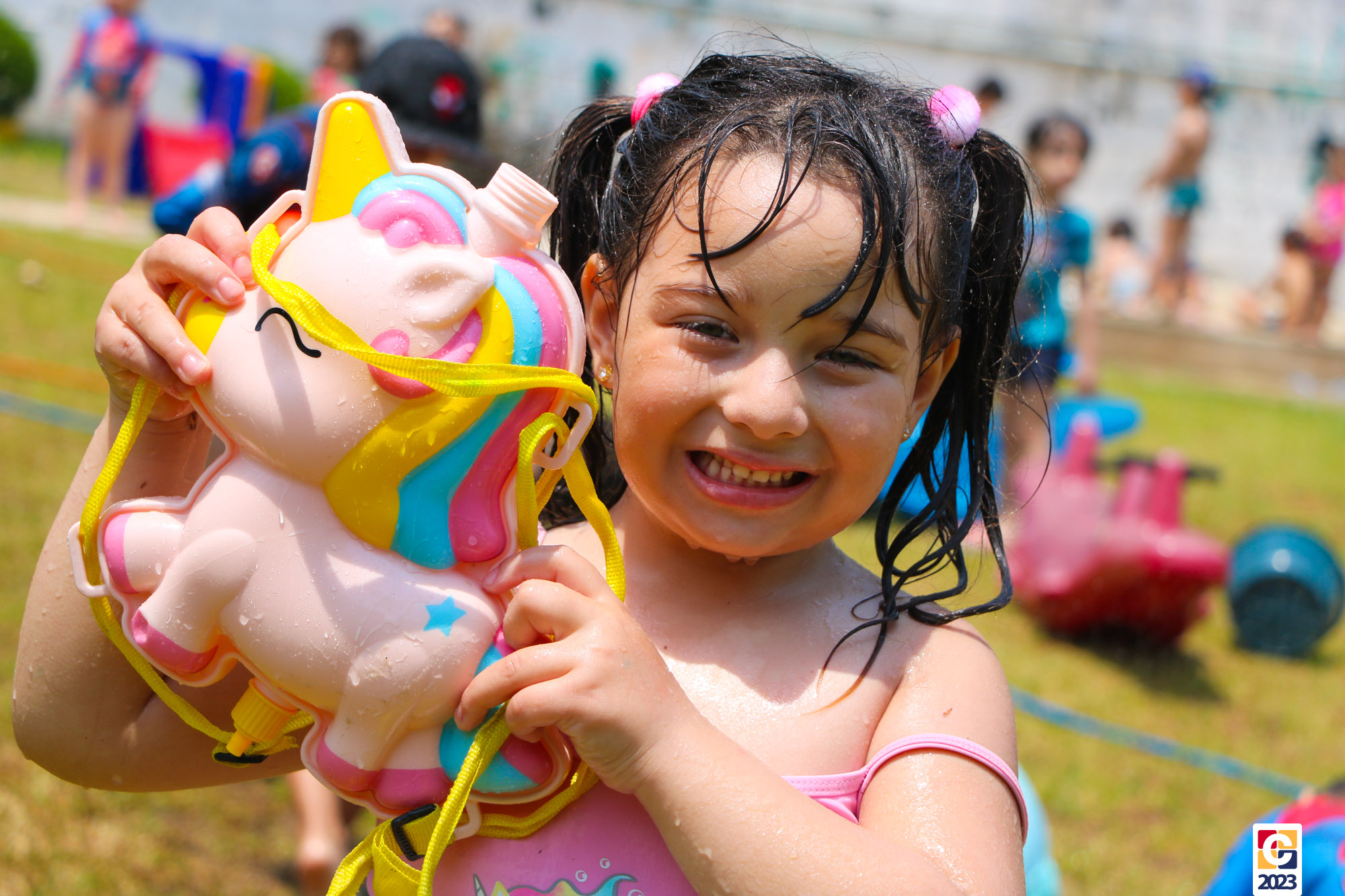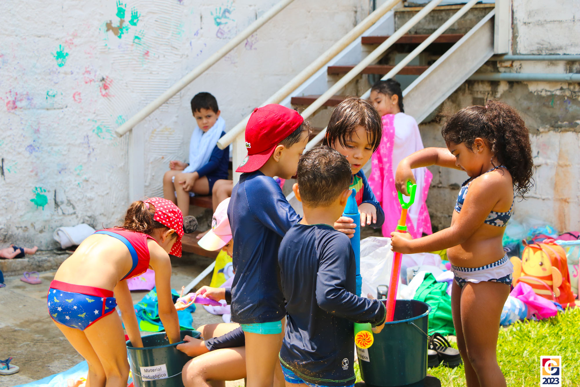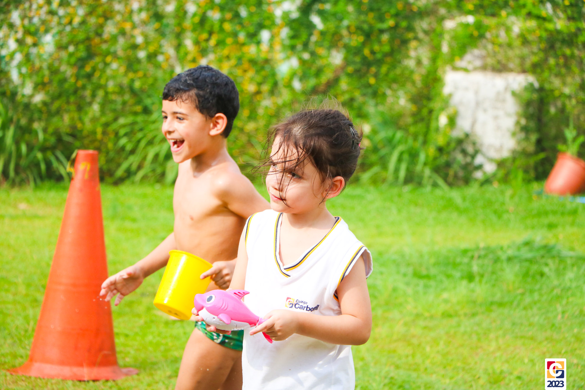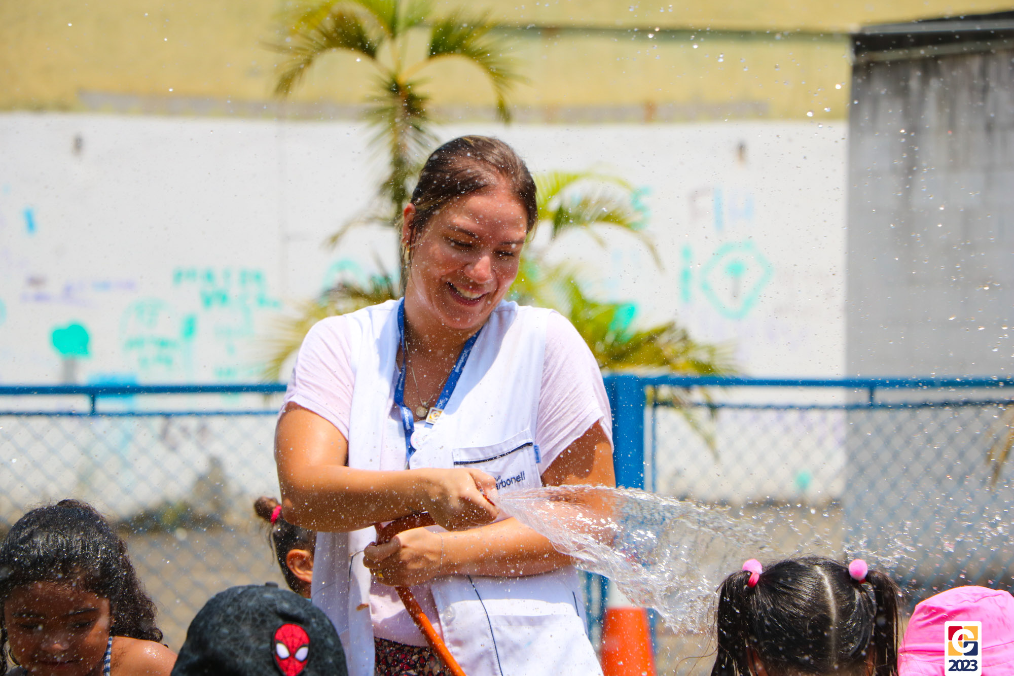 Professoras, assistentes e crianças, unidos pela alegria, esguichavam água uns nos outros em mais um dia mágico, desses que ficam gravados para sempre nas memórias de infância. 💧
