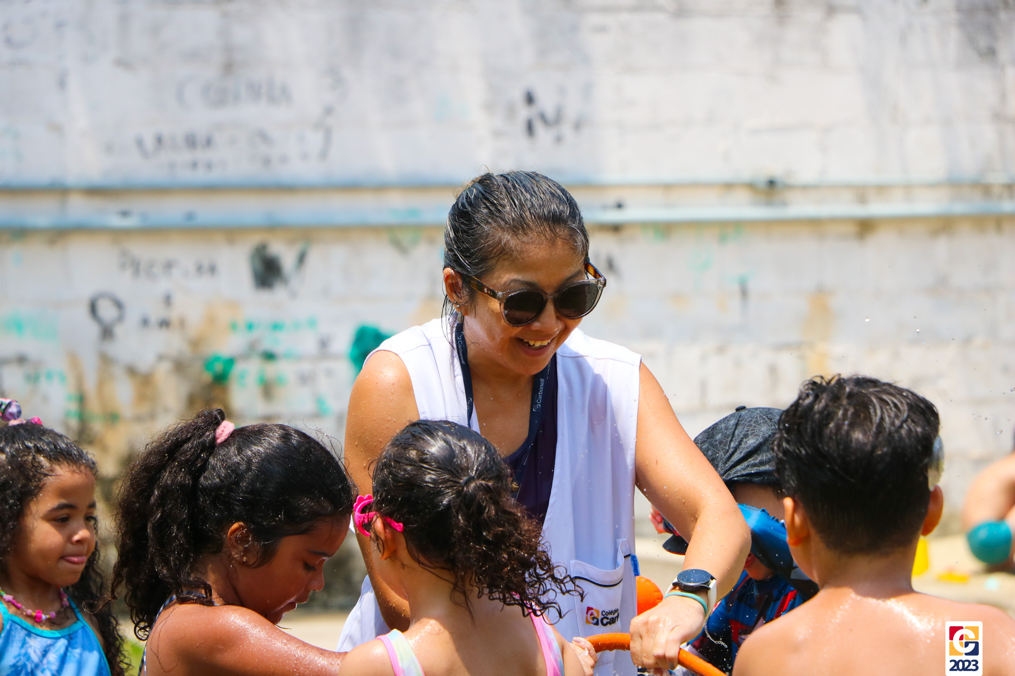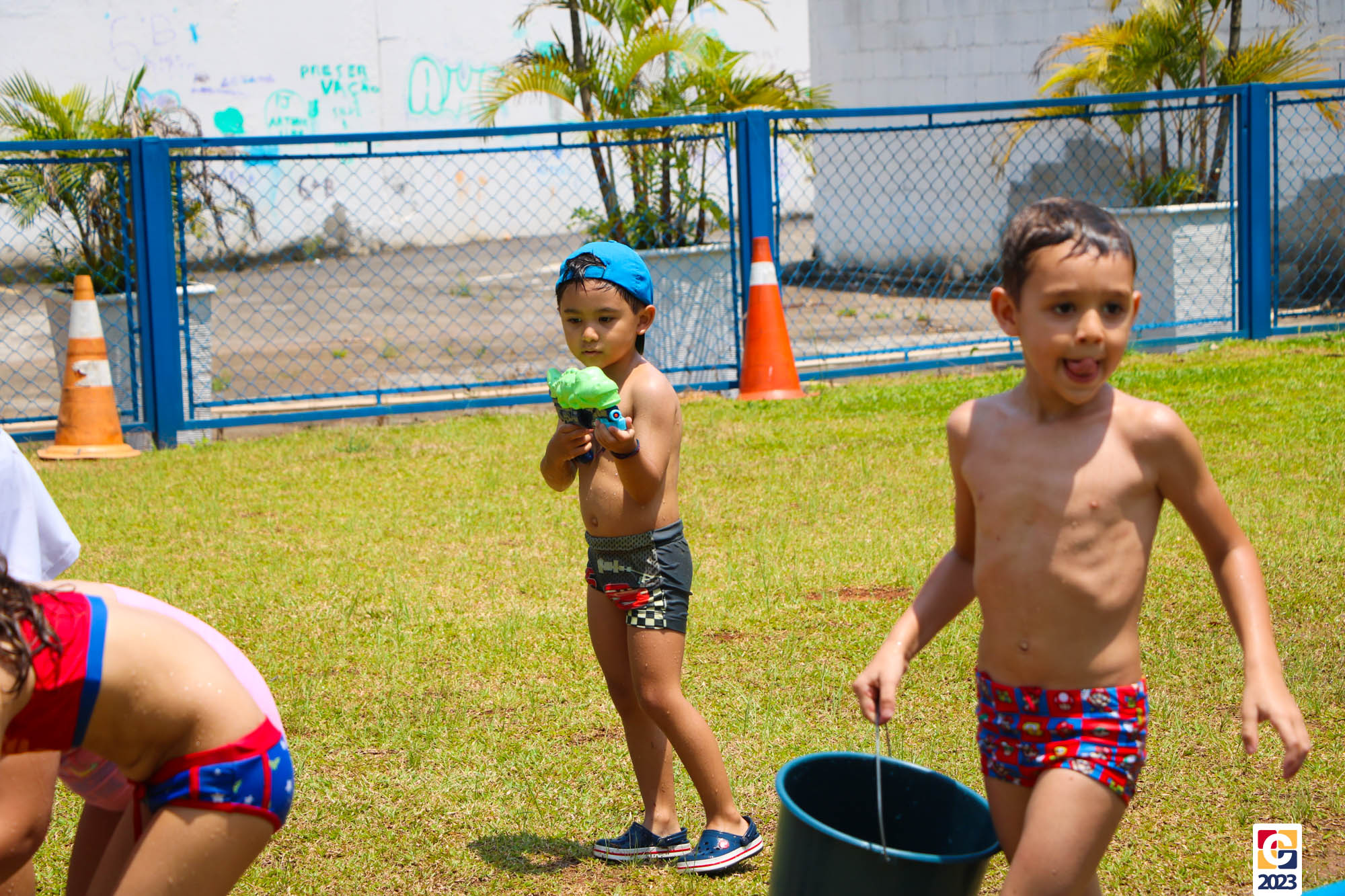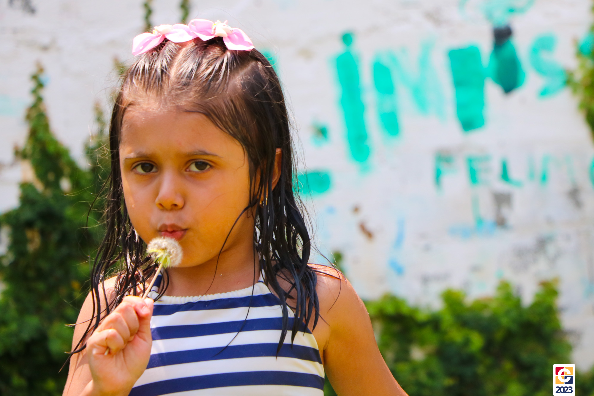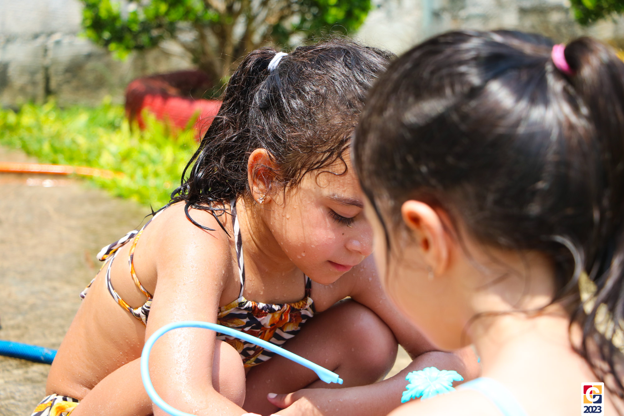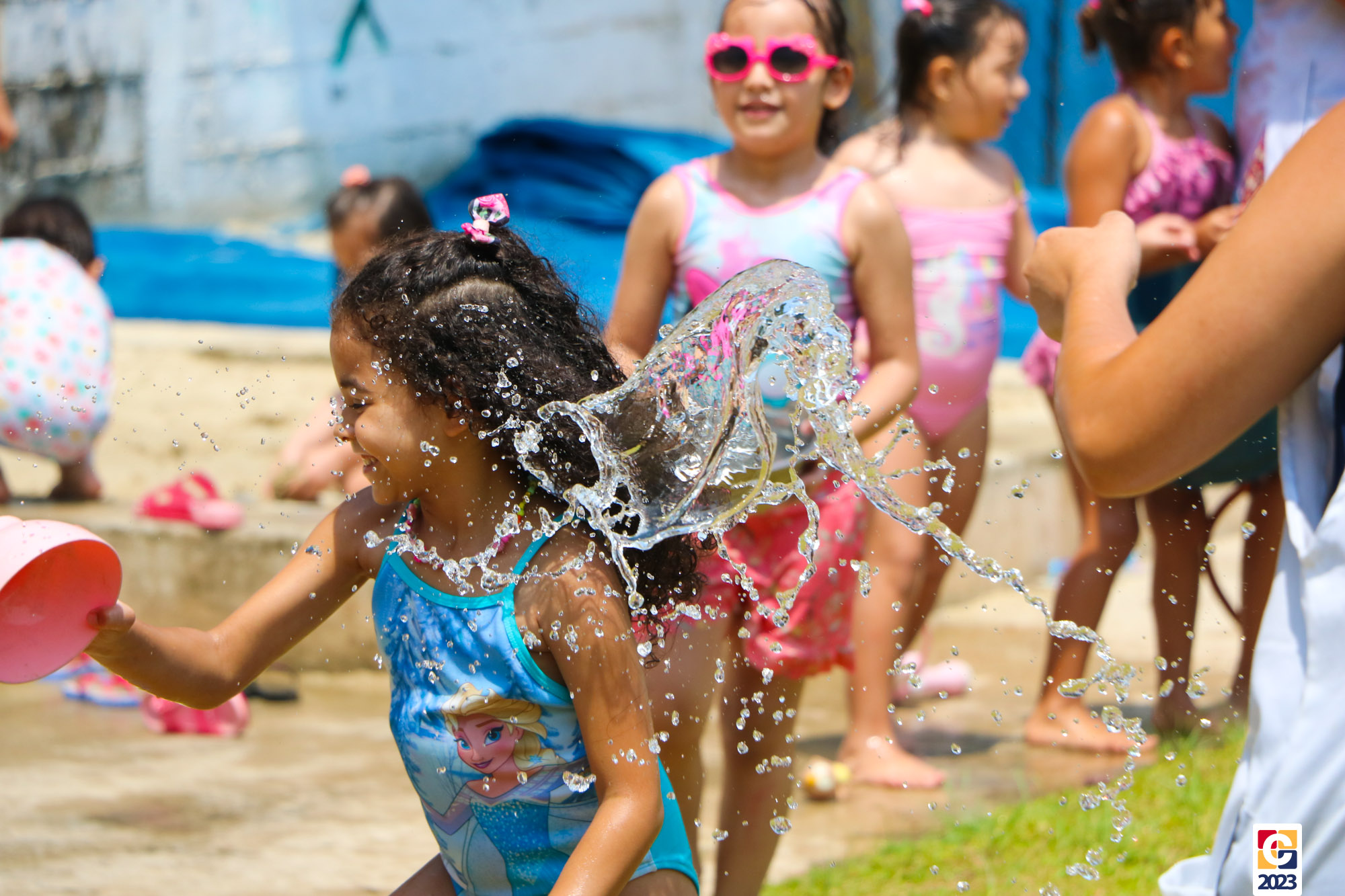 Professoras, assistentes e crianças, unidos pela alegria, esguichavam água uns nos outros em mais um dia mágico, desses que ficam gravados para sempre nas memórias de infância. 💧