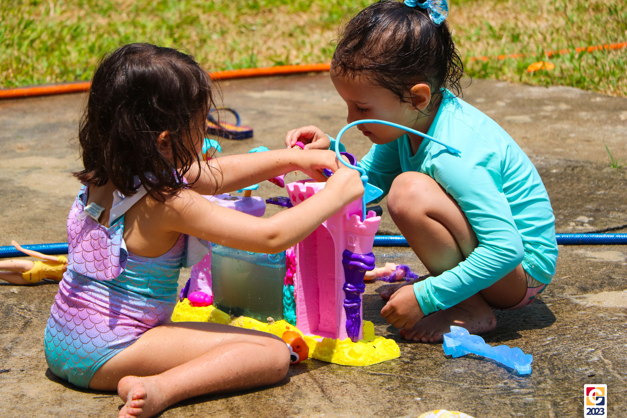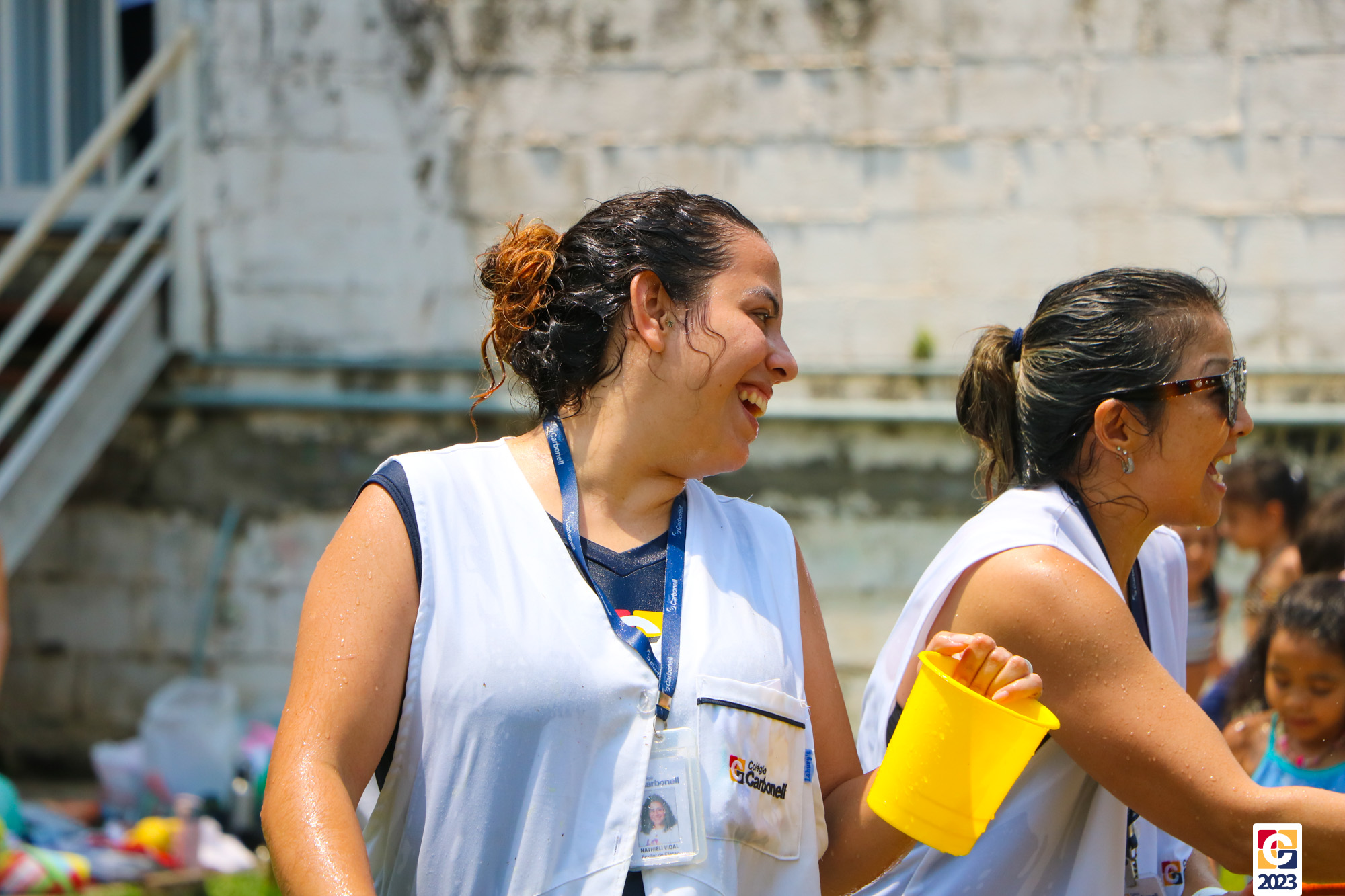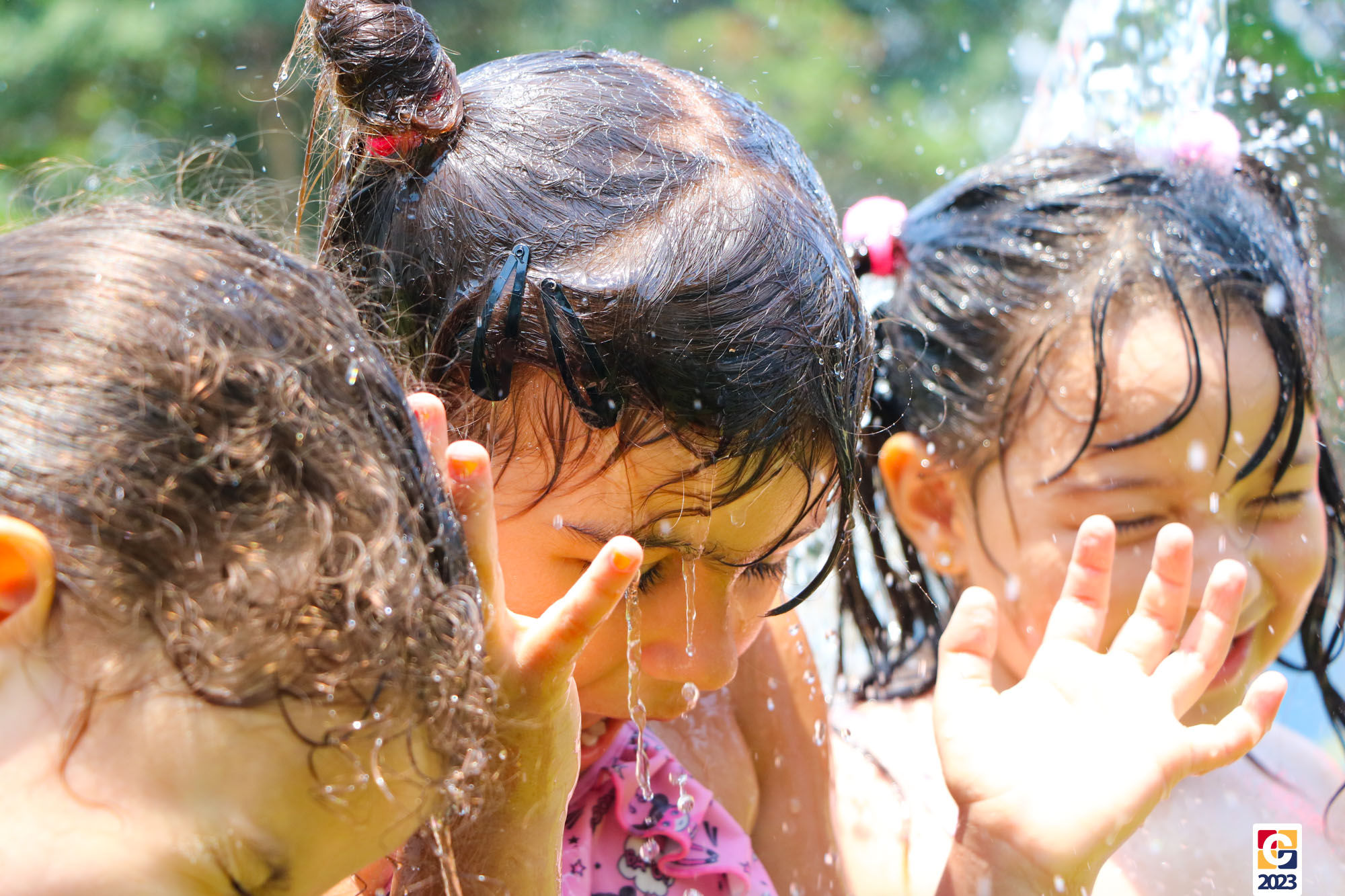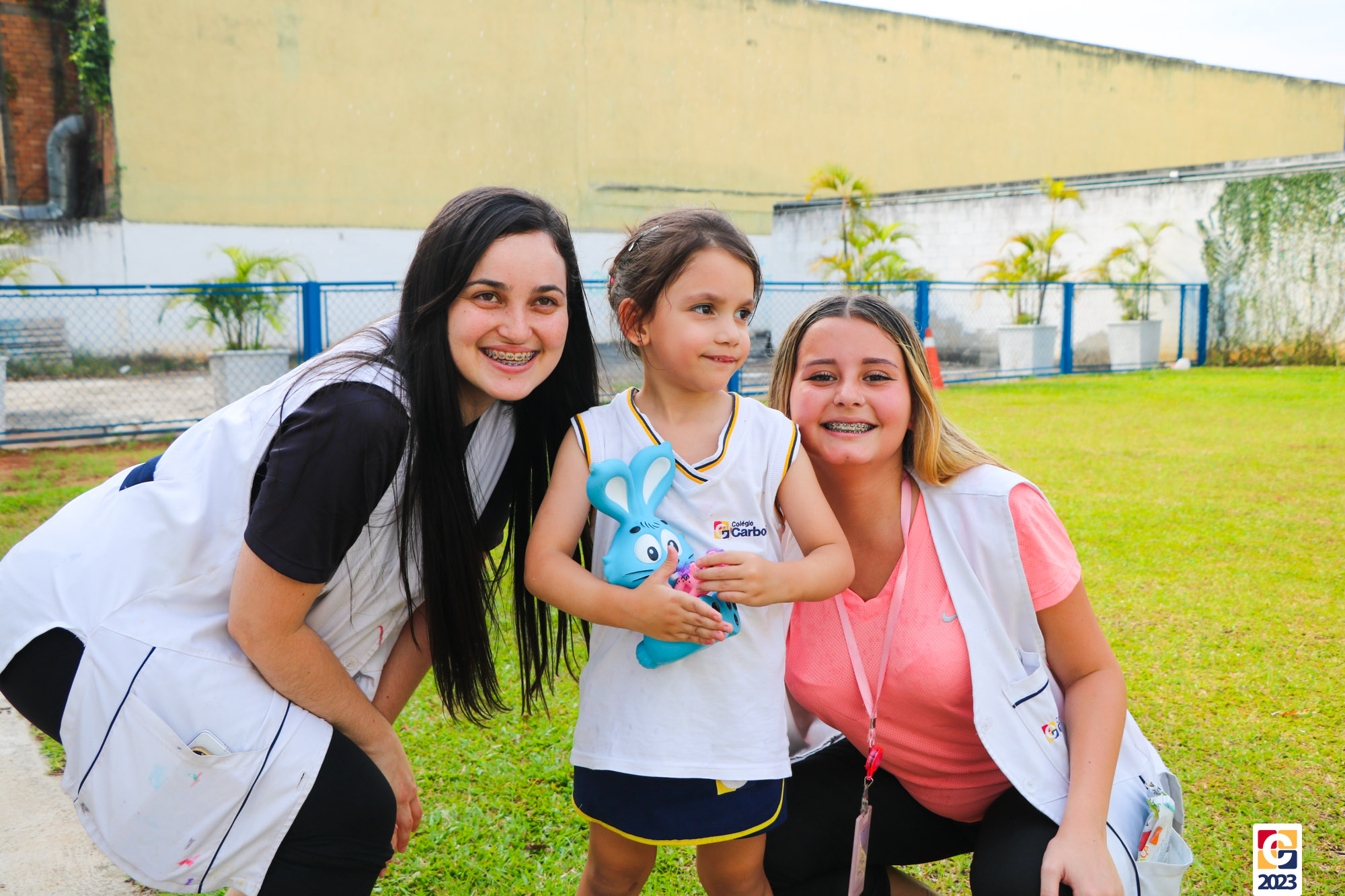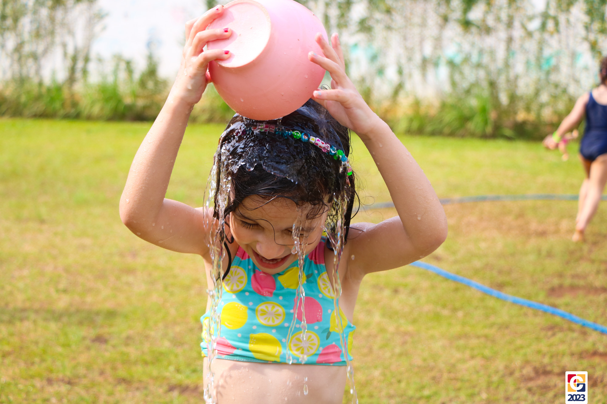 Professoras, assistentes e crianças, unidos pela alegria, esguichavam água uns nos outros em mais um dia mágico, desses que ficam gravados para sempre nas memórias de infância. 💧