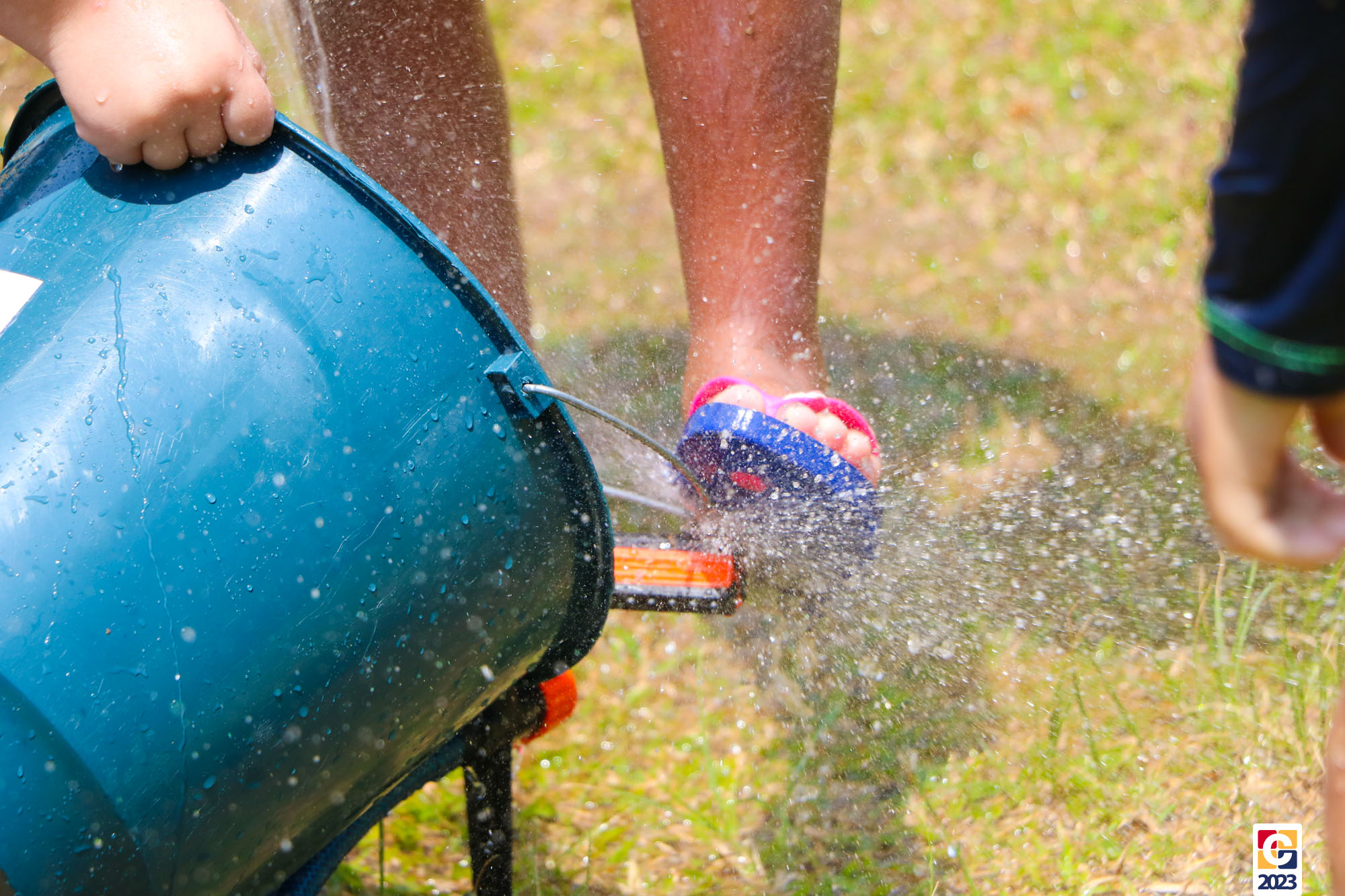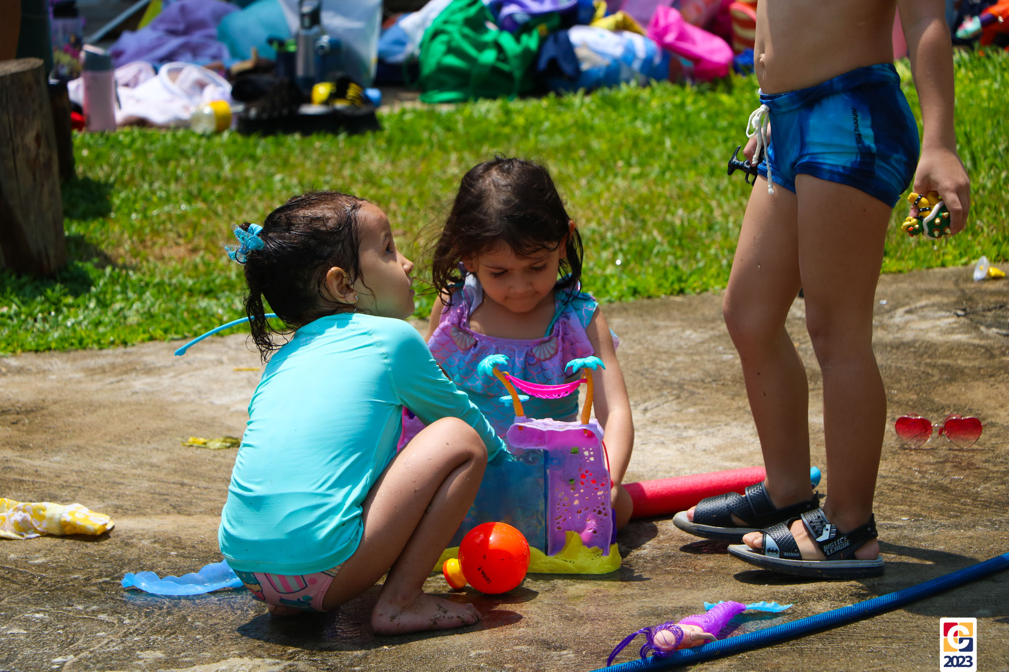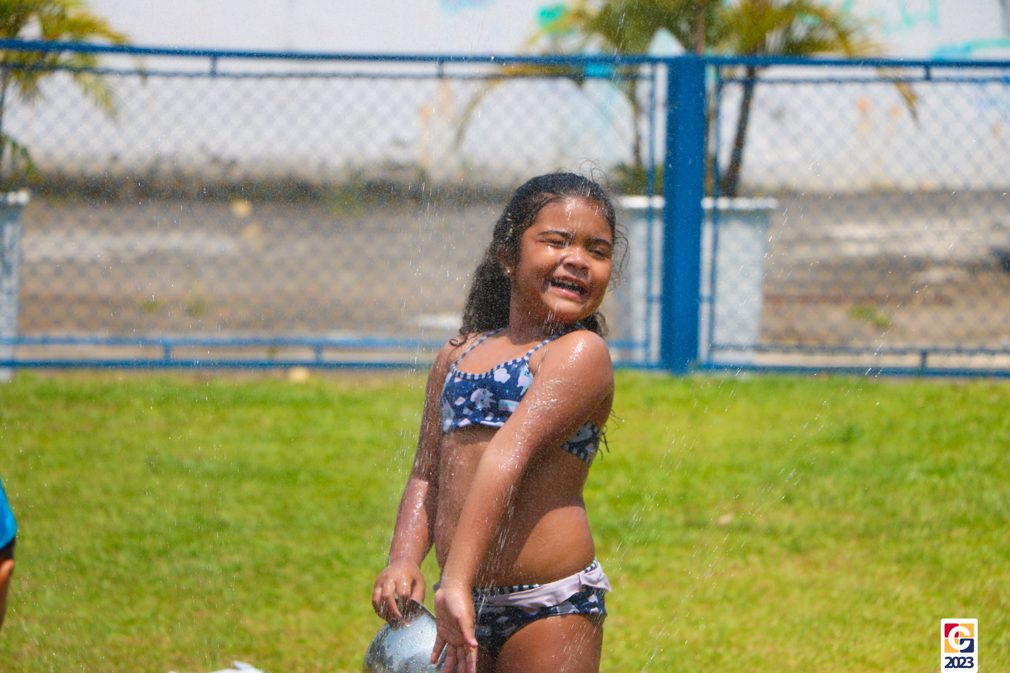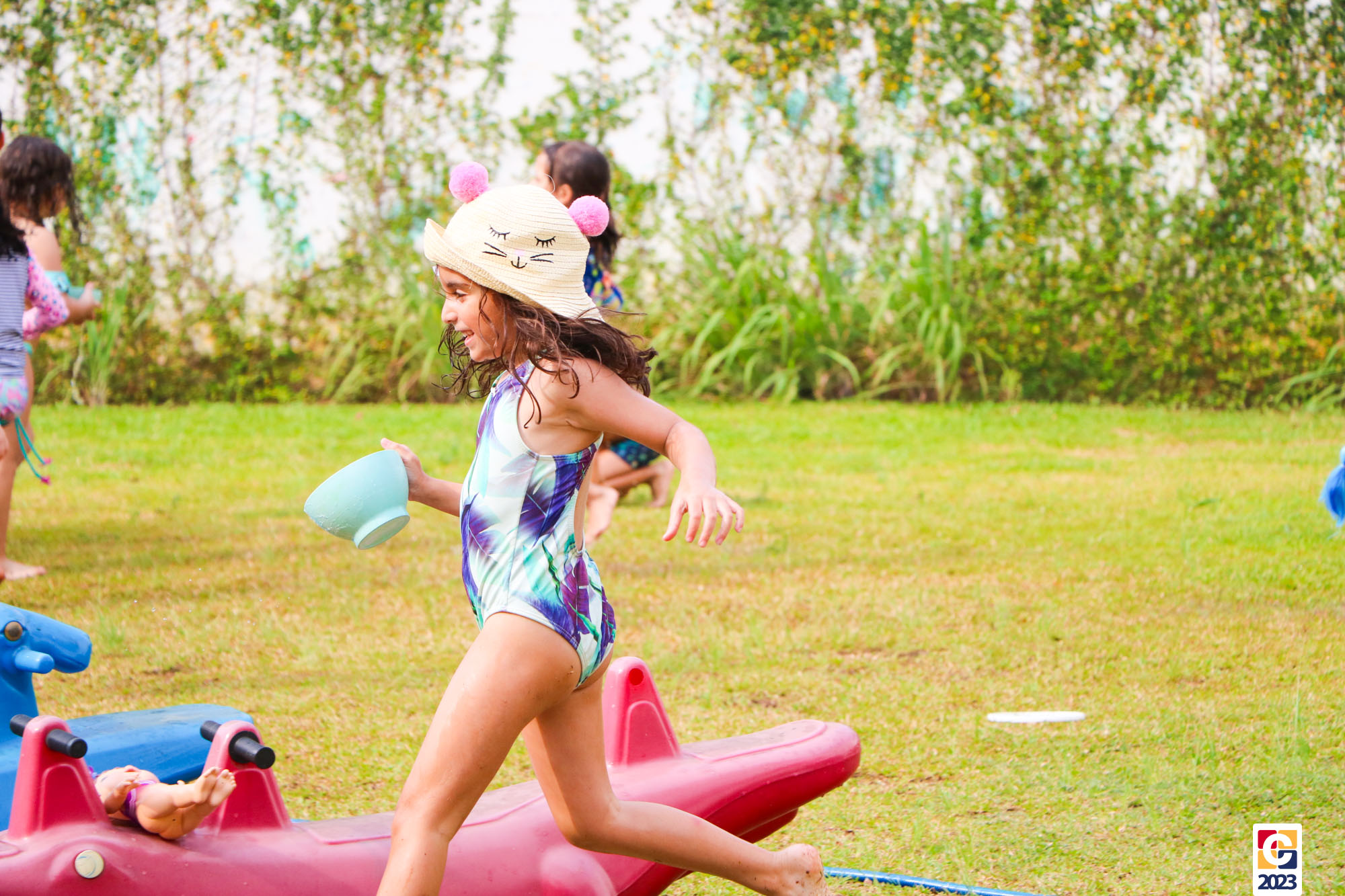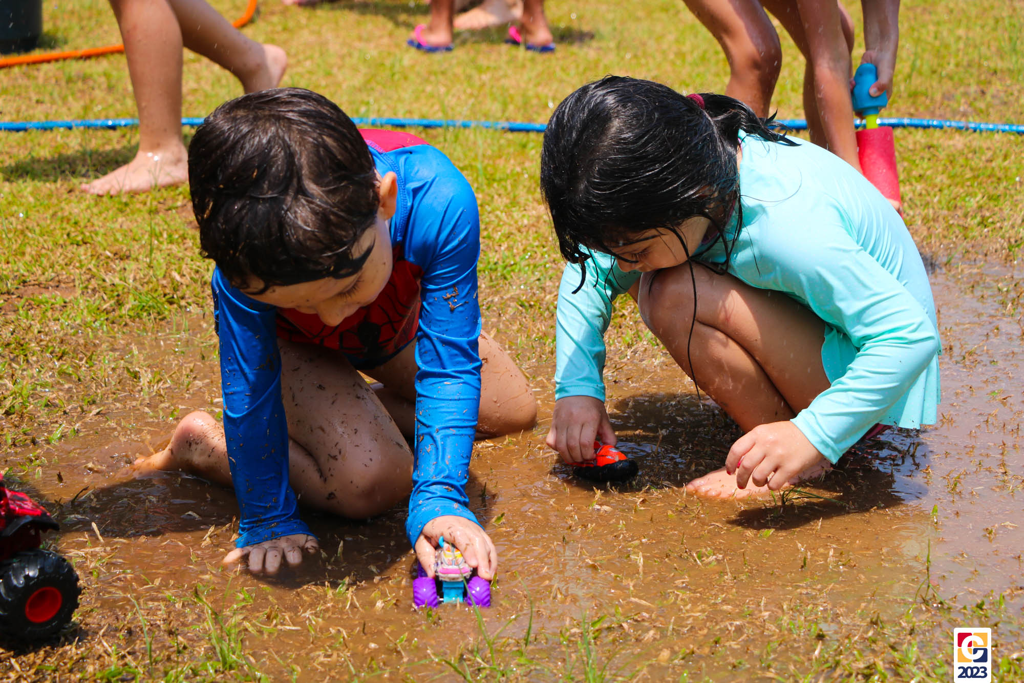 Professoras, assistentes e crianças, unidos pela alegria, esguichavam água uns nos outros em mais um dia mágico, desses que ficam gravados para sempre nas memórias de infância. 💧