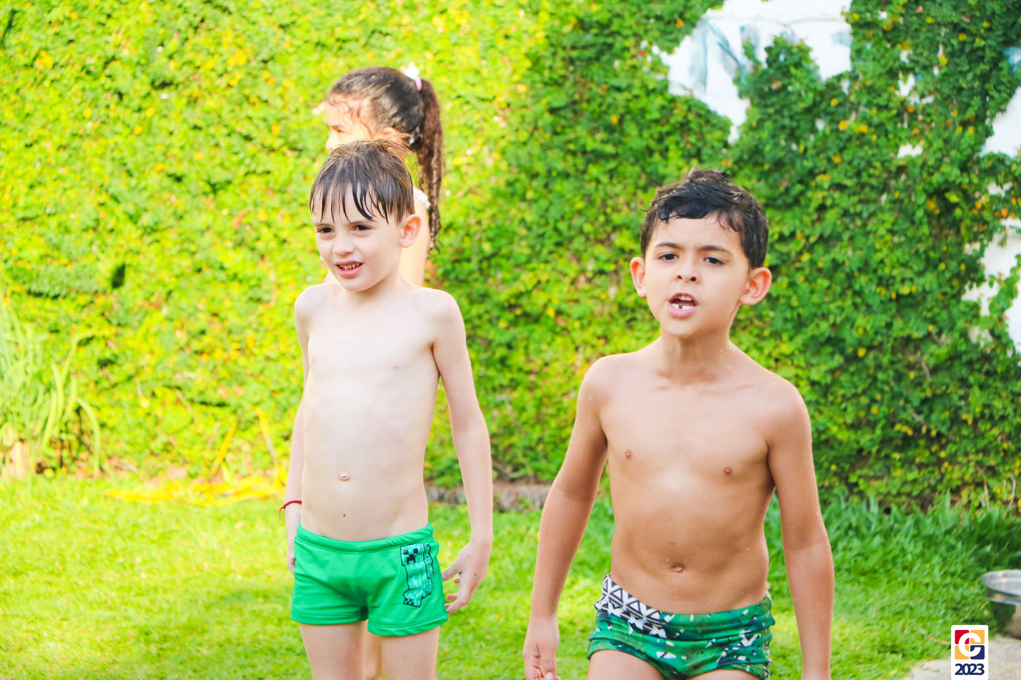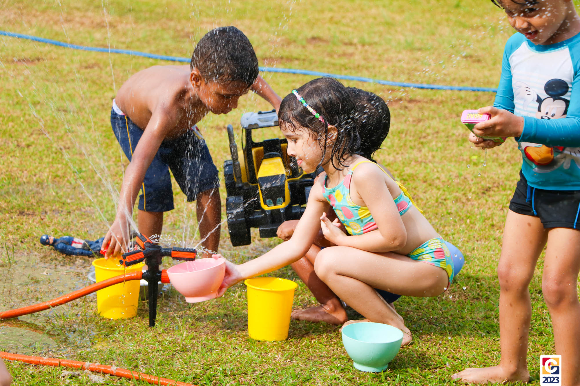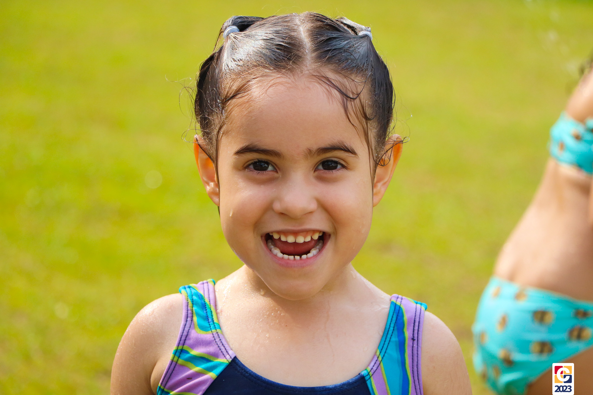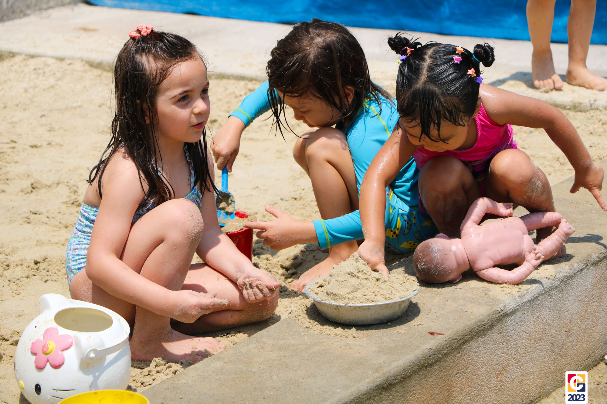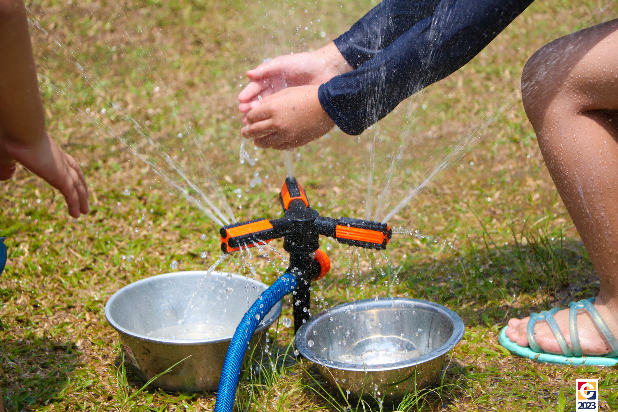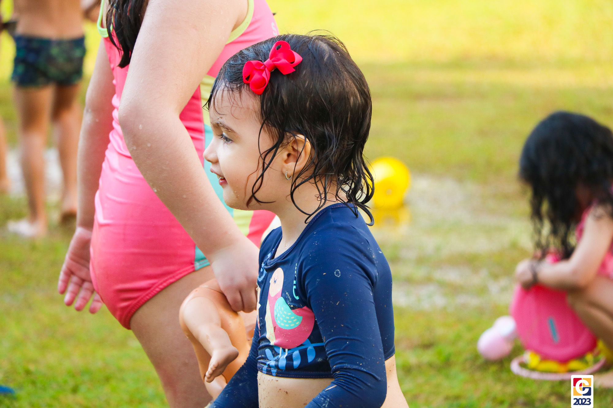 Professoras, assistentes e crianças, unidos pela alegria, esguichavam água uns nos outros em mais um dia mágico, desses que ficam gravados para sempre nas memórias de infância. 💧