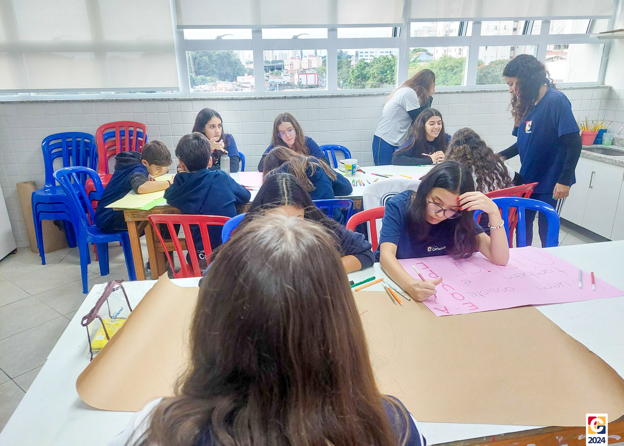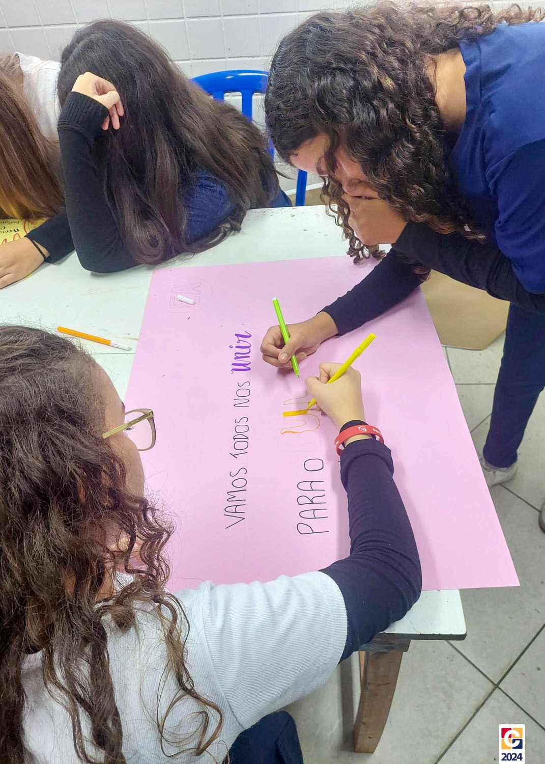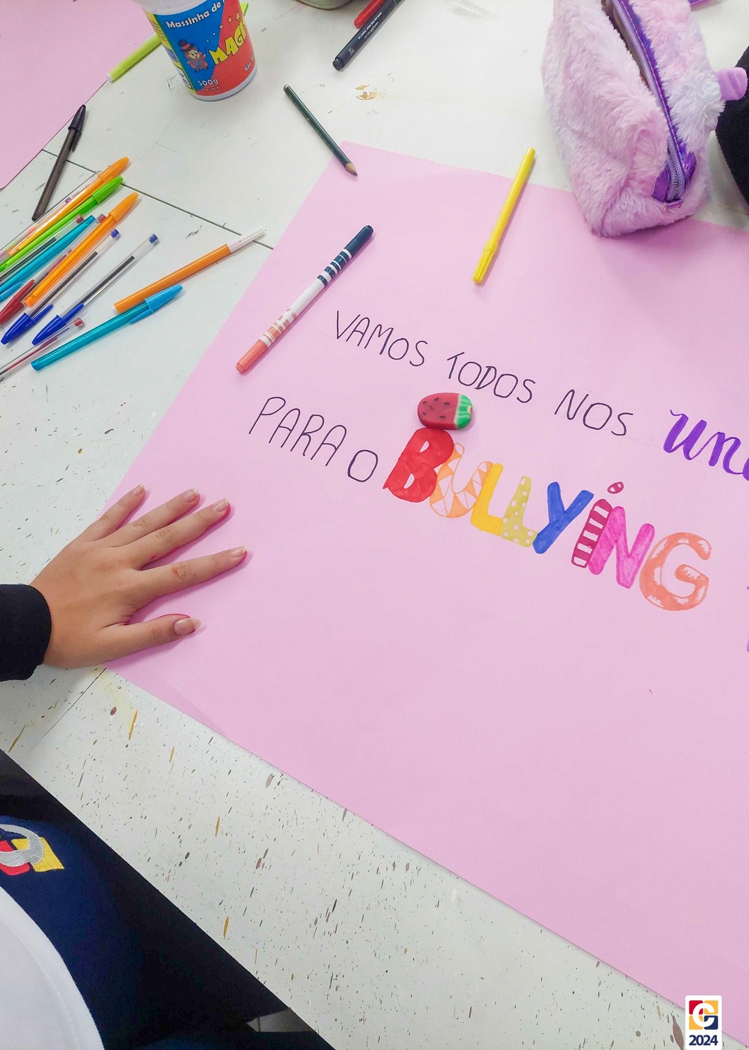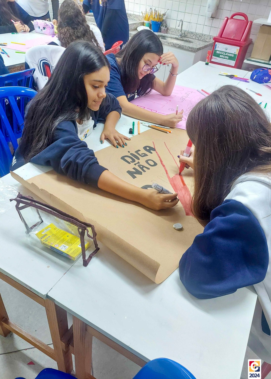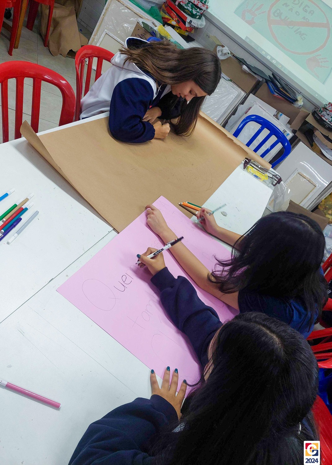 Os cartazes, dedicados ao combate ao bullying, foram espalhados pelos andares dos Anos Finais, reforçando um ambiente escolar mais seguro e acolhedor. A oficina permitiu que os estudantes expressassem suas ideias e sentimentos, destacando a importância de um comportamento respeitoso e empático entre os colegas. 🙅