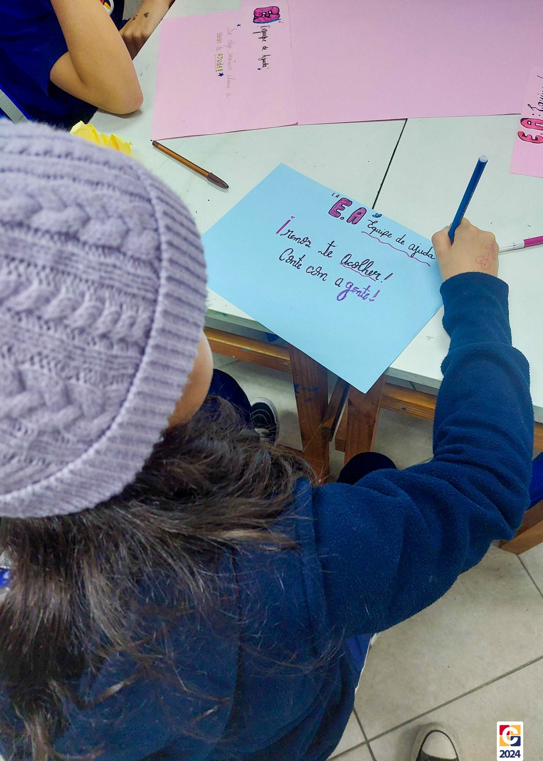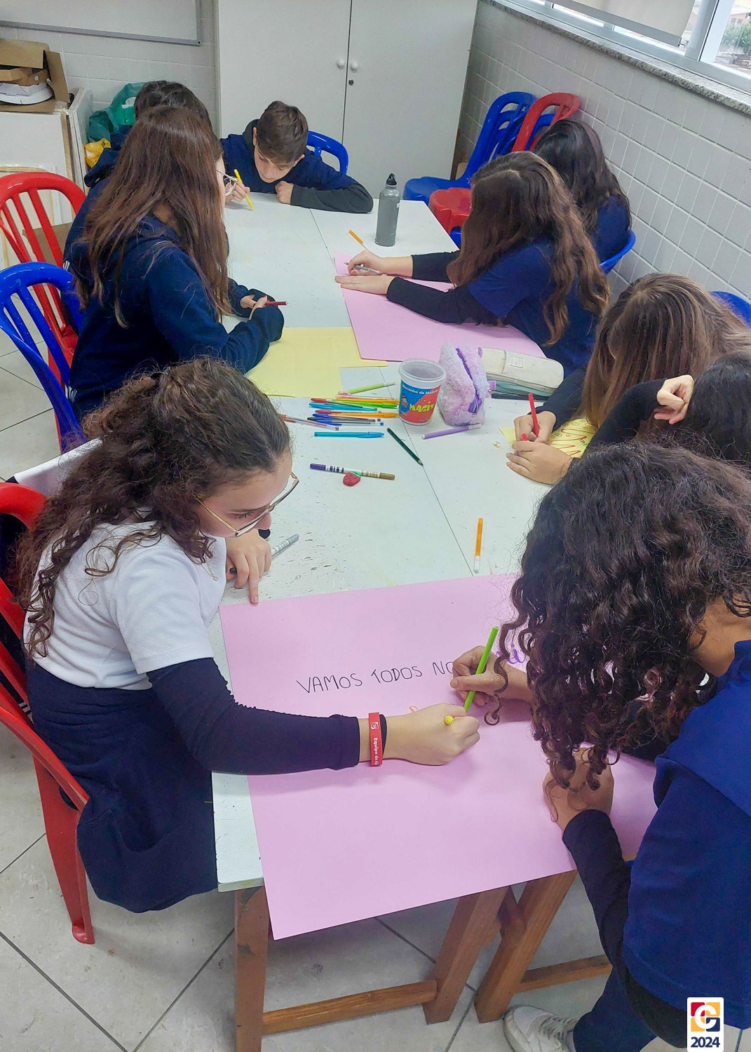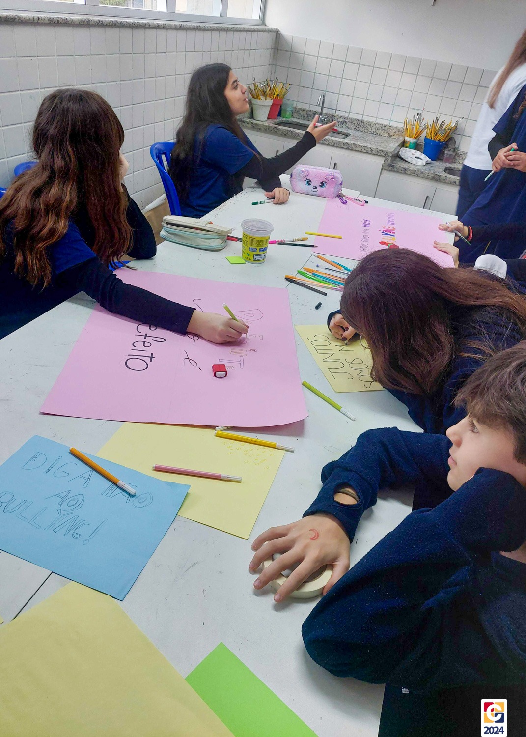 A equipe de apoio dos Anos Finais está empenhada em promover respeito e empatia. Os estudantes participaram de uma oficina para criar cartazes com mensagens sobre um ambiente escolar harmonioso e o combate ao bullying. Essa ação integra as iniciativas da escola para educar e sensibilizar sobre convivência positiva e enfrentamento do bullying. 🏫
