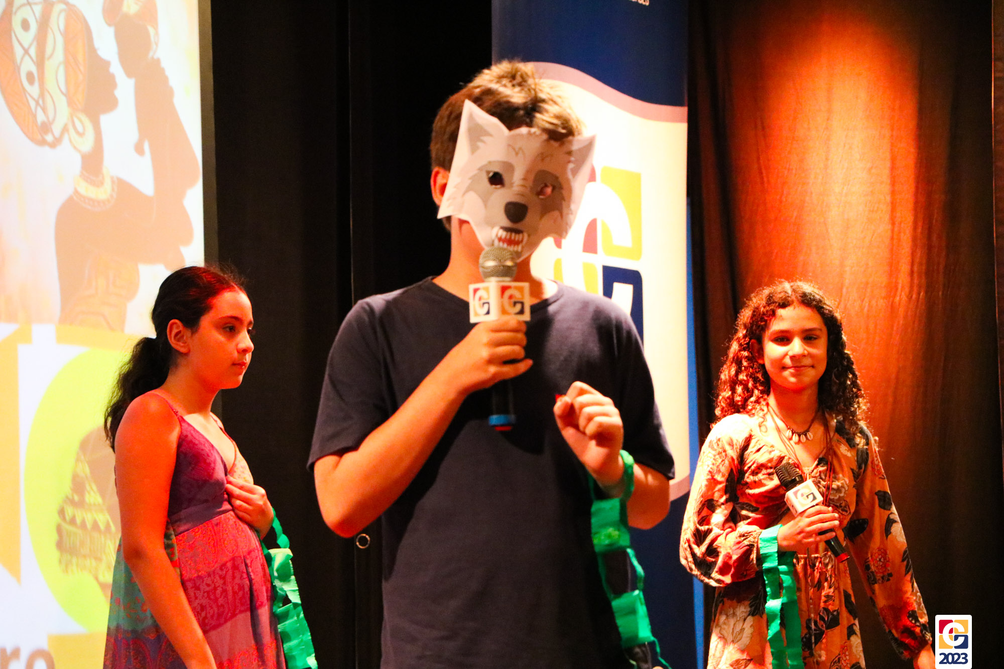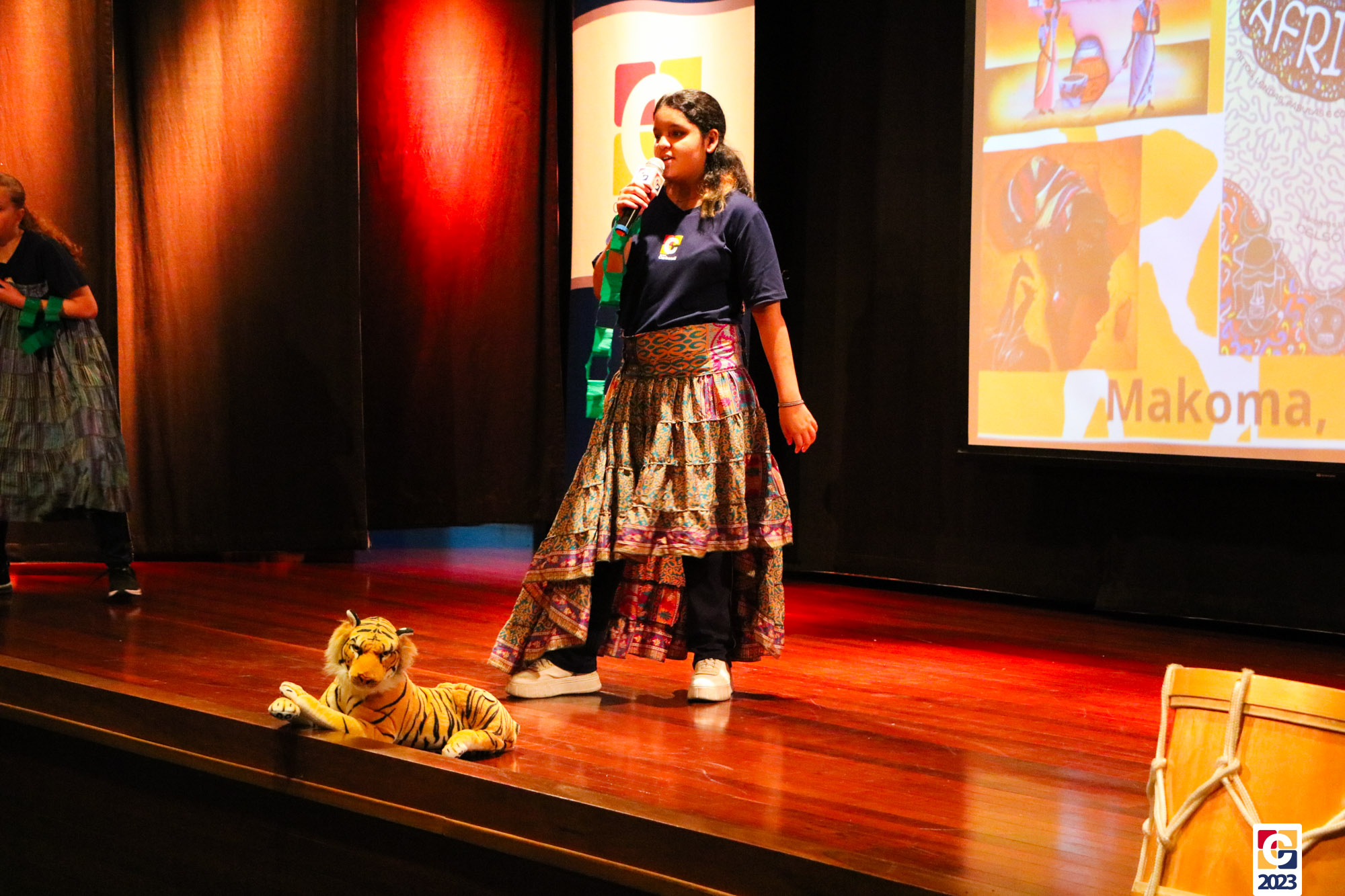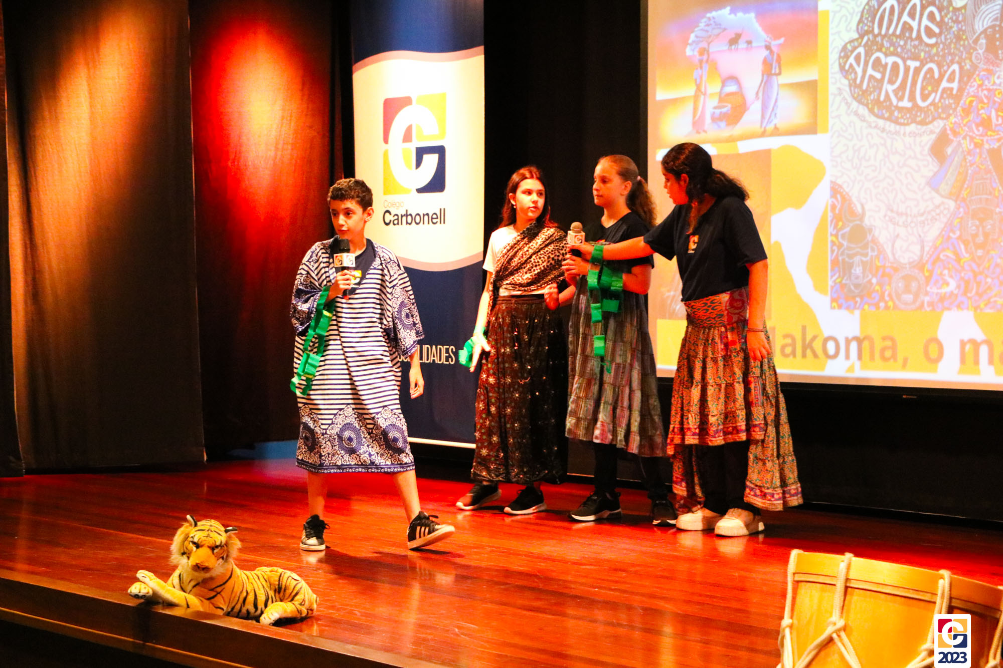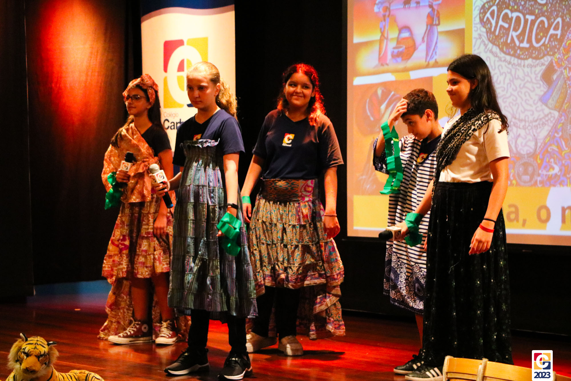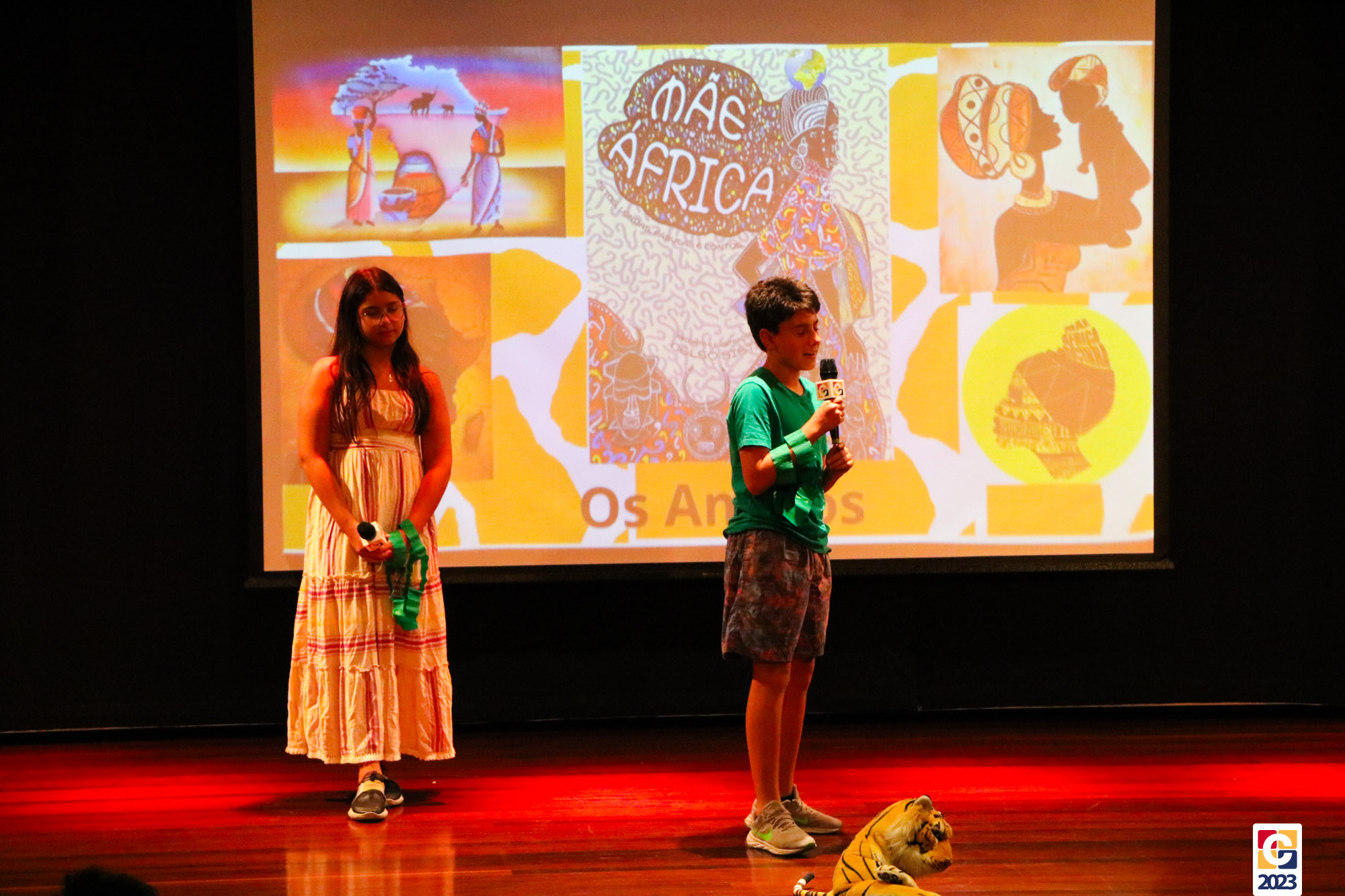 Turmas de 6º ano apresentaram poemas baseados em contos africanos que eles mesmos produziram, reforçando, assim, a aprendizagem e a absorção das leituras. A abordagem proporcionou uma perspectiva da cultura africana que contribui para promover o entendimento e o respeito pela diversidade. Já o 7º ano tomou conta do palco e apresentou um espetáculo teatral também baseado nos contos africanos. Nas peças, salas de aula onde o professor narrava o conto eram retratadas, enquanto os atores encenavam a história caracterizados com roupas típicas. 🎭