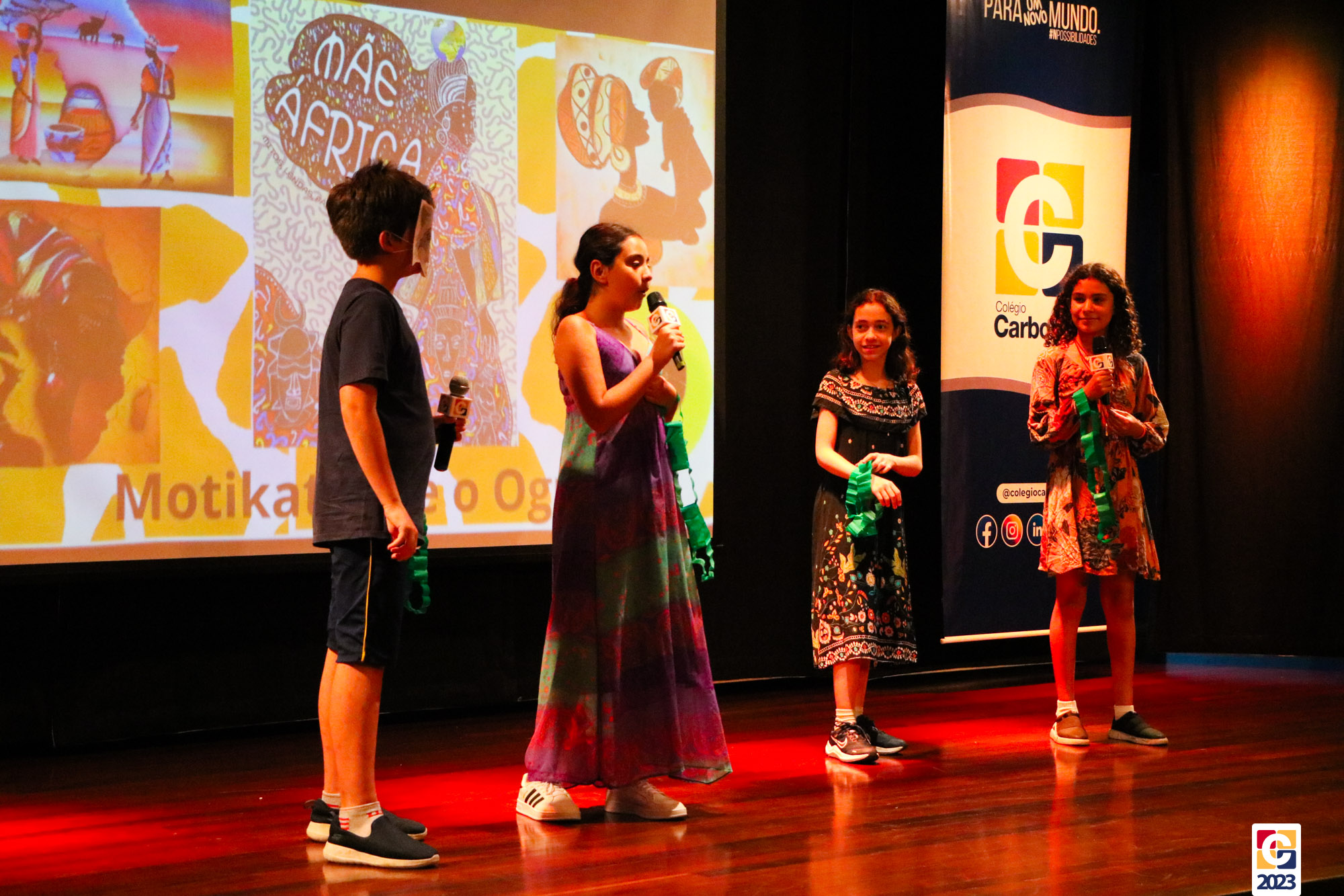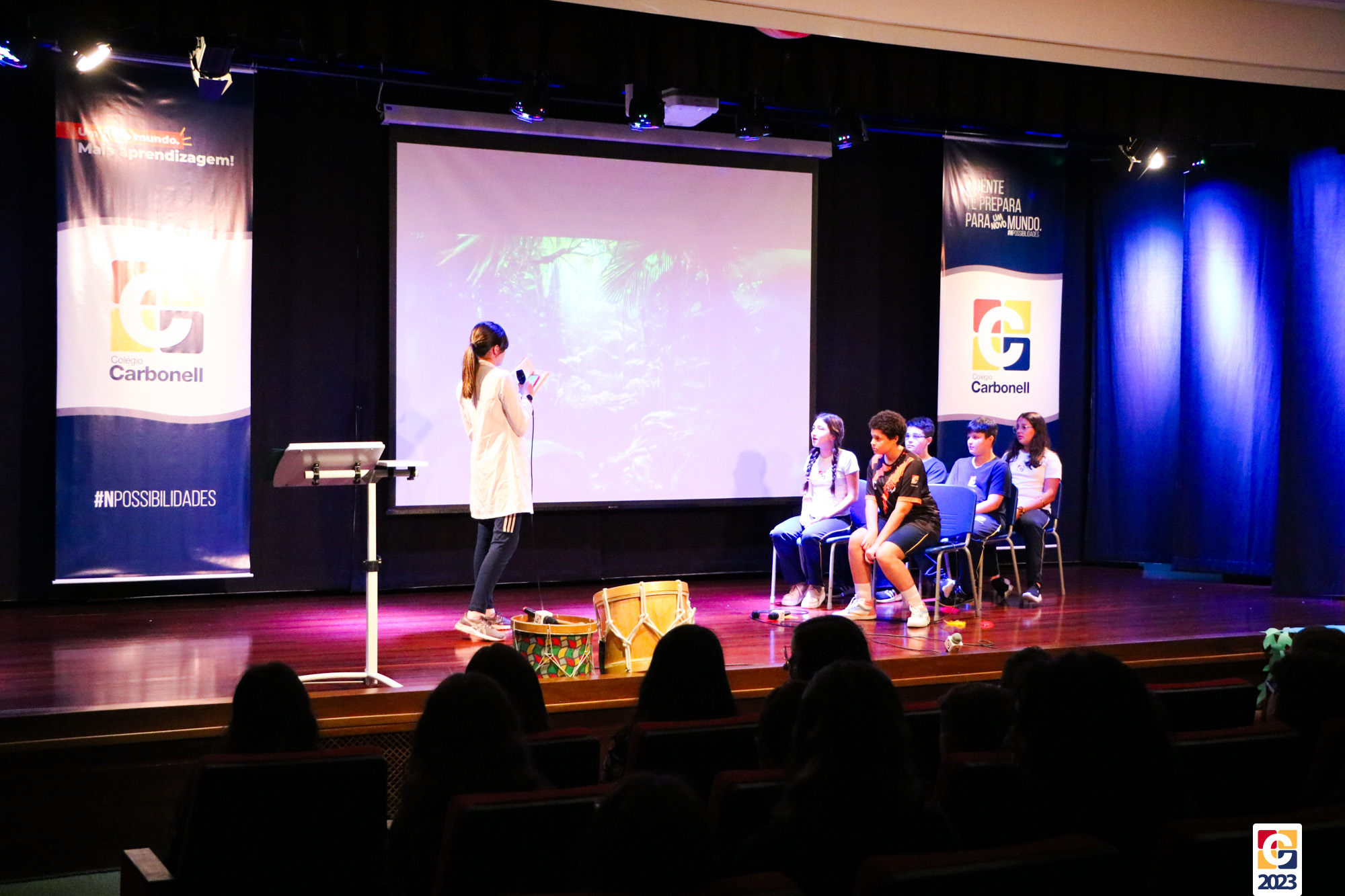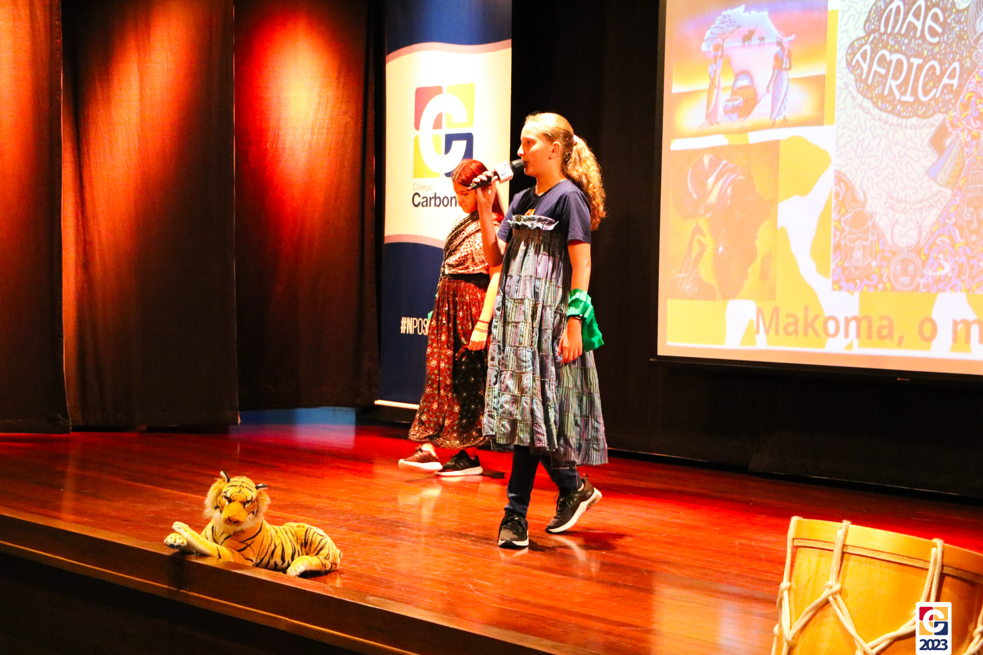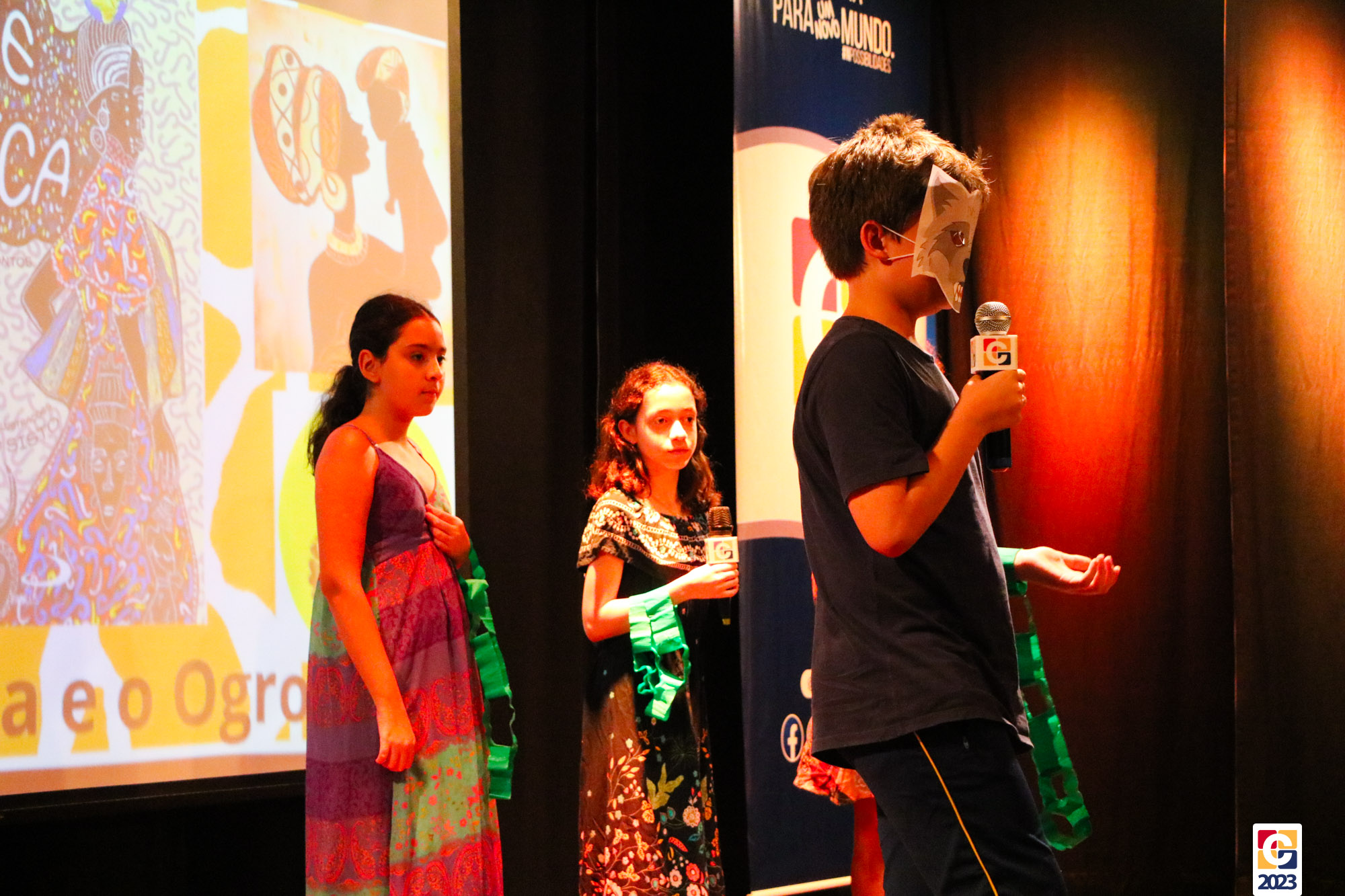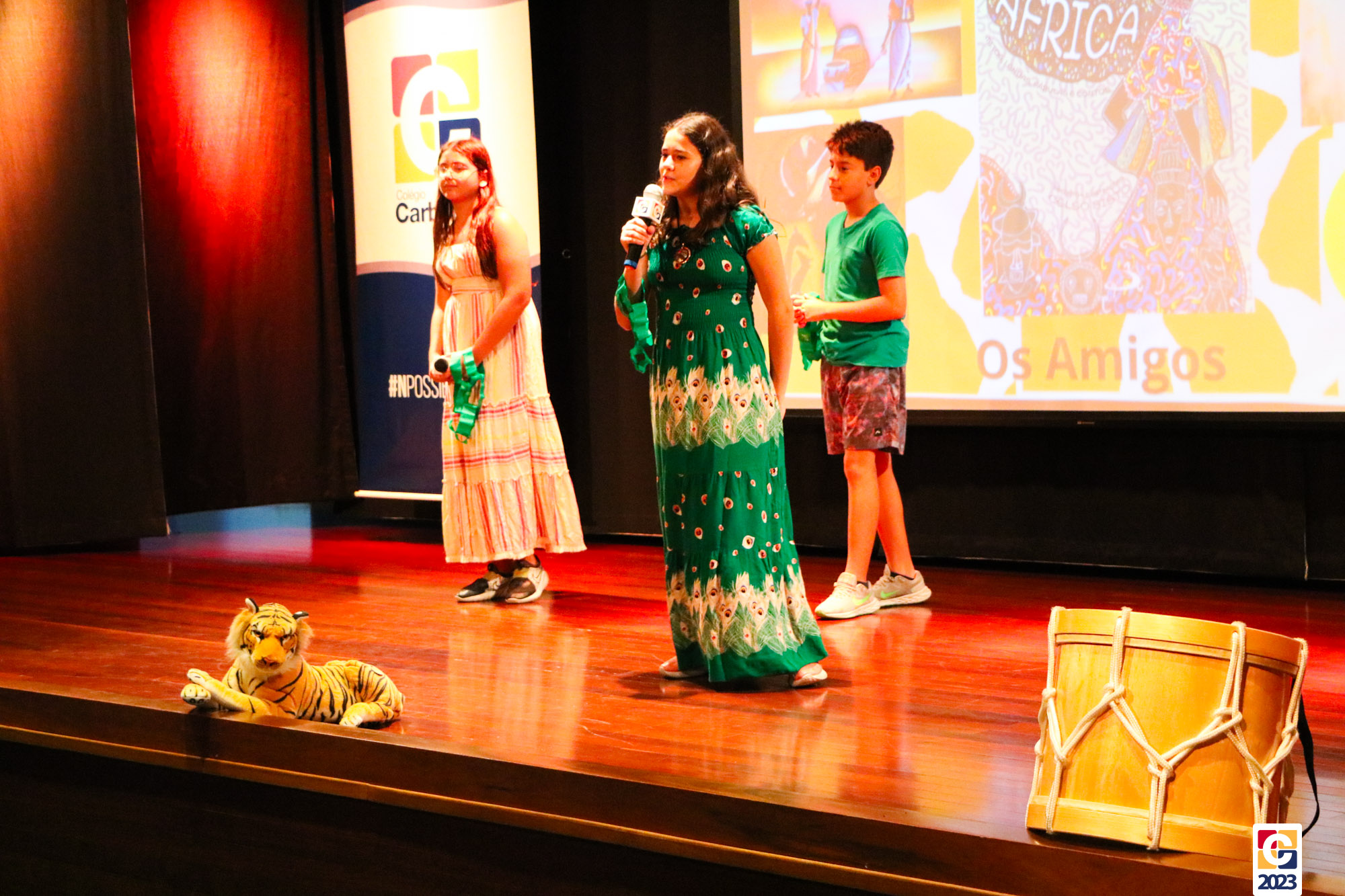 Turmas de 6º ano apresentaram poemas baseados em contos africanos que eles mesmos produziram, reforçando, assim, a aprendizagem e a absorção das leituras. A abordagem proporcionou uma perspectiva da cultura africana que contribui para promover o entendimento e o respeito pela diversidade. Já o 7º ano tomou conta do palco e apresentou um espetáculo teatral também baseado nos contos africanos. Nas peças, salas de aula onde o professor narrava o conto eram retratadas, enquanto os atores encenavam a história caracterizados com roupas típicas. 🎭