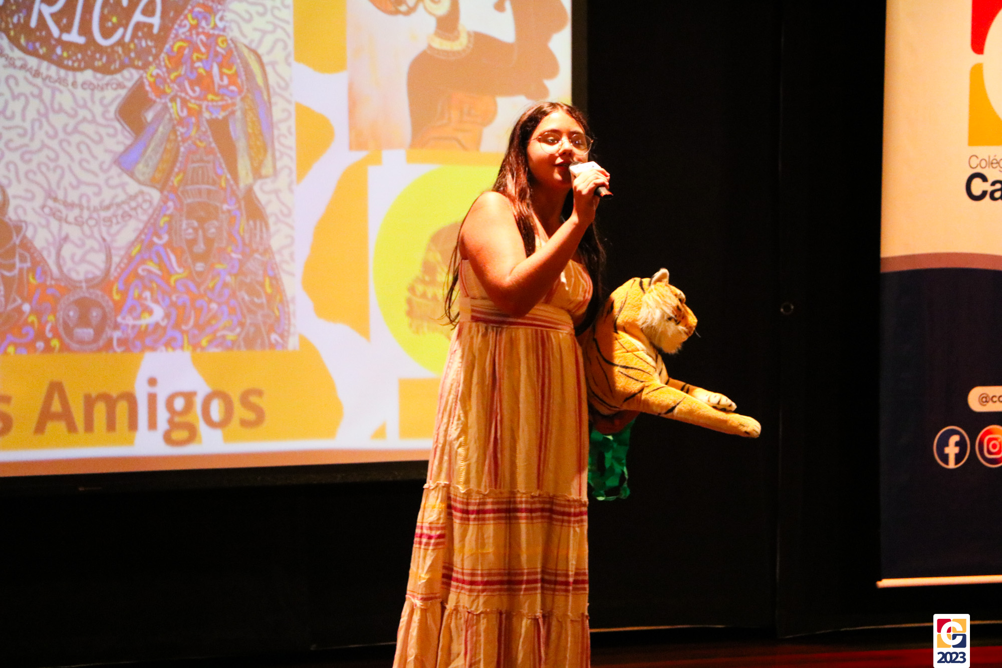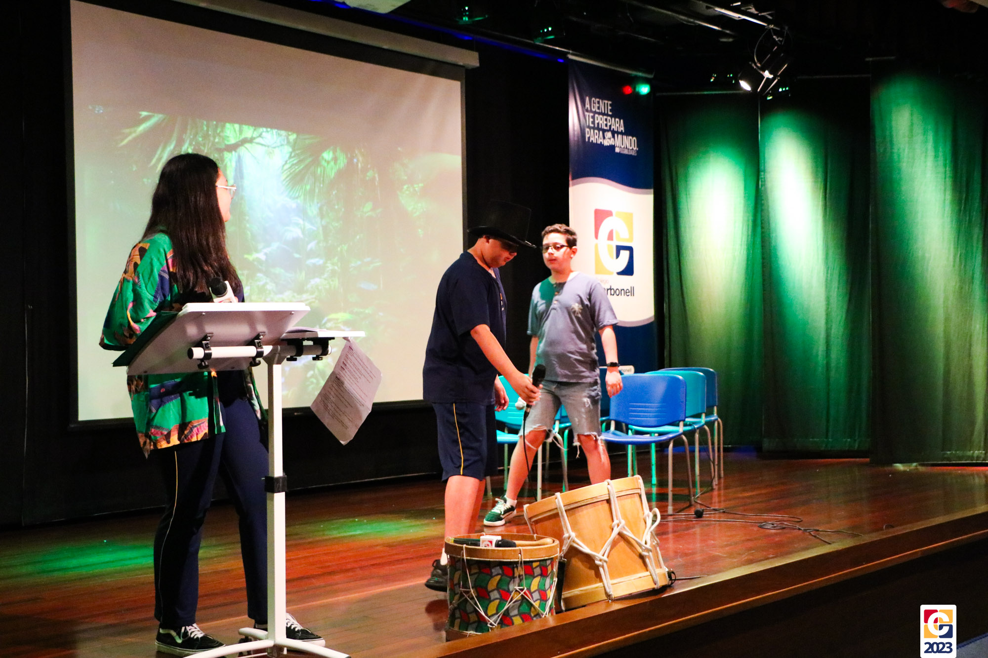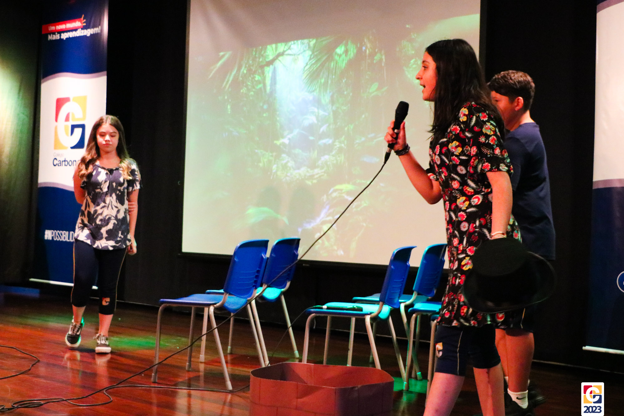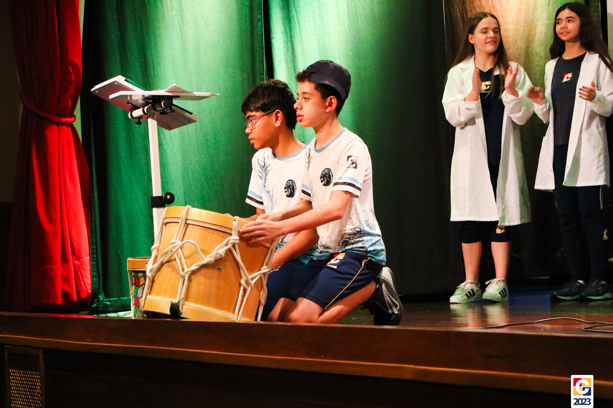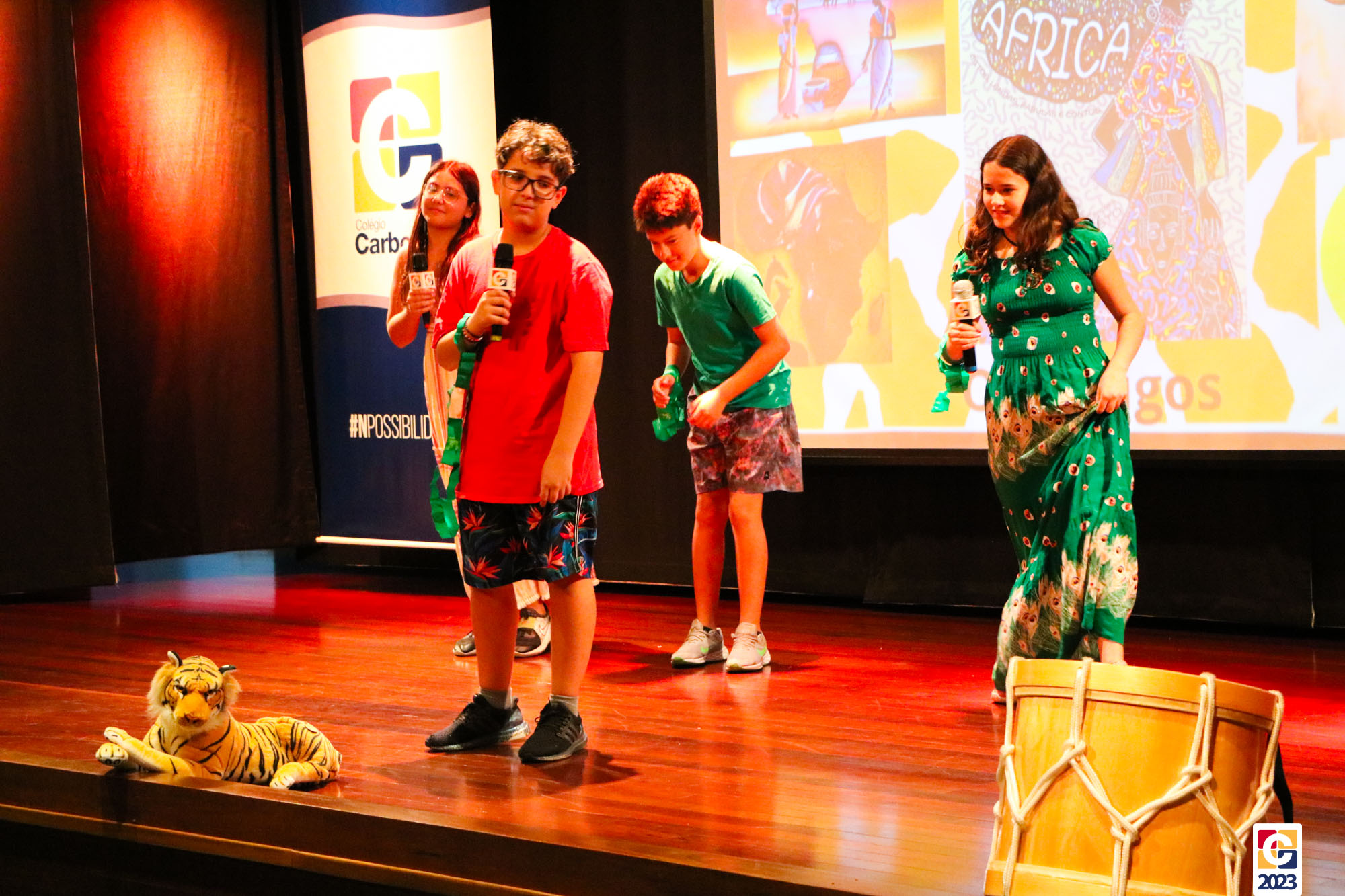 Turmas de 6º ano apresentaram poemas baseados em contos africanos que eles mesmos produziram, reforçando, assim, a aprendizagem e a absorção das leituras. A abordagem proporcionou uma perspectiva da cultura africana que contribui para promover o entendimento e o respeito pela diversidade. Já o 7º ano tomou conta do palco e apresentou um espetáculo teatral também baseado nos contos africanos. Nas peças, salas de aula onde o professor narrava o conto eram retratadas, enquanto os atores encenavam a história caracterizados com roupas típicas. 🎭