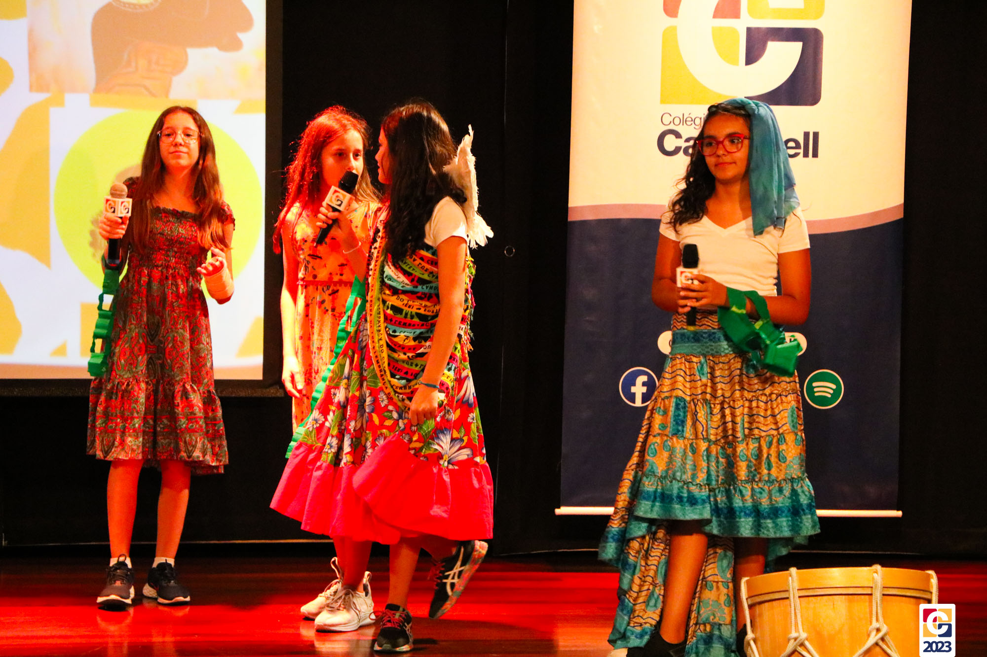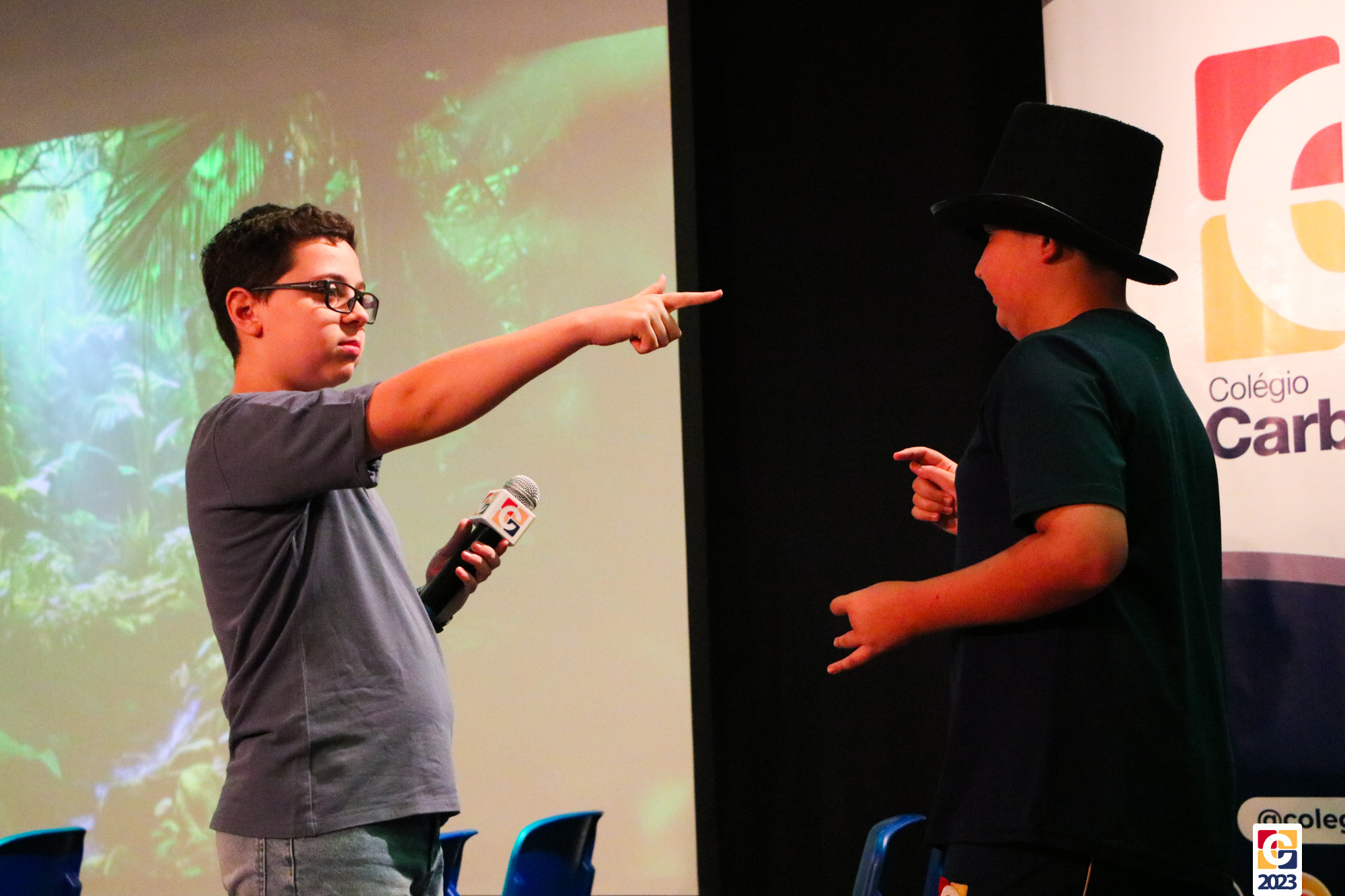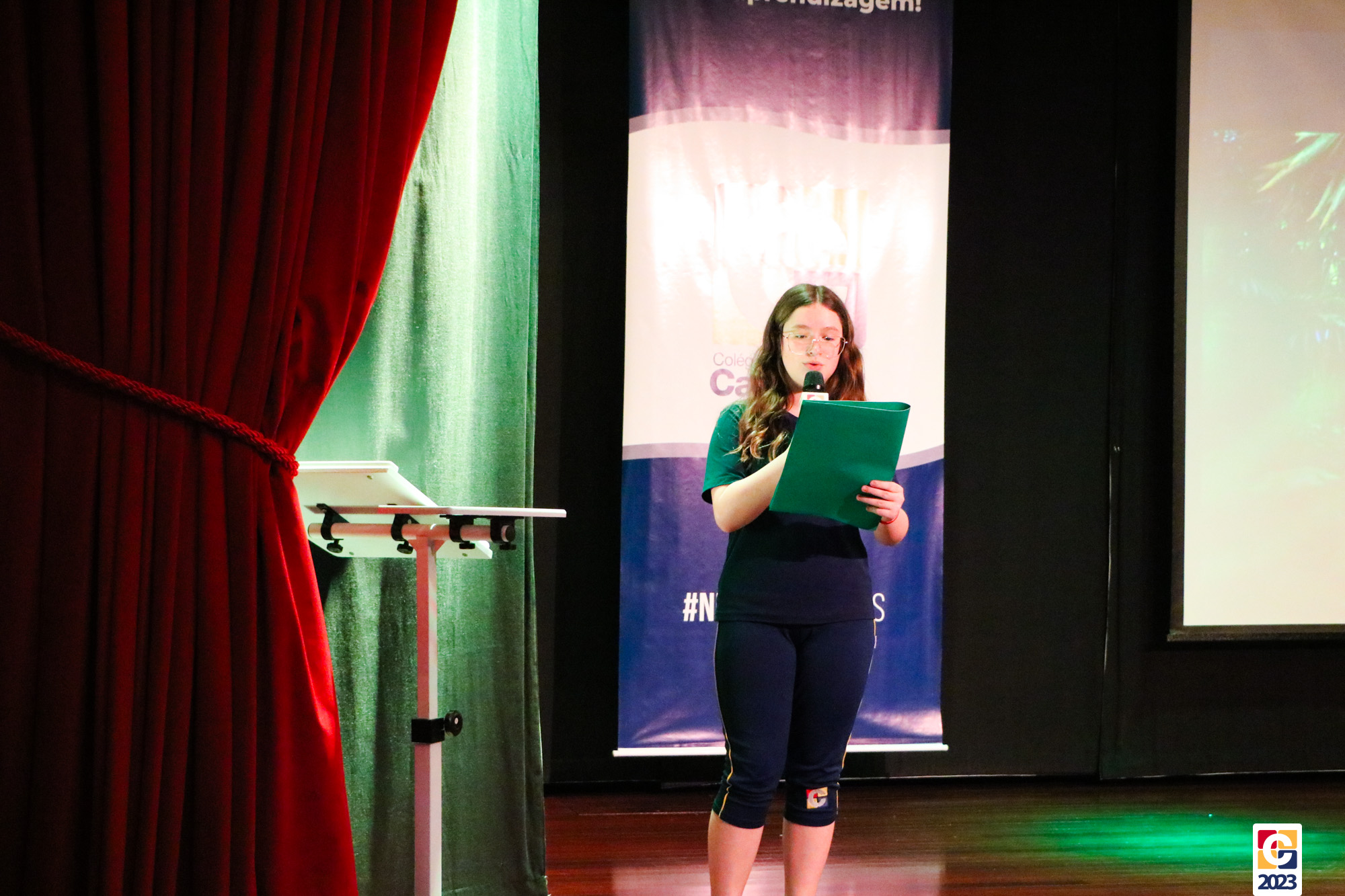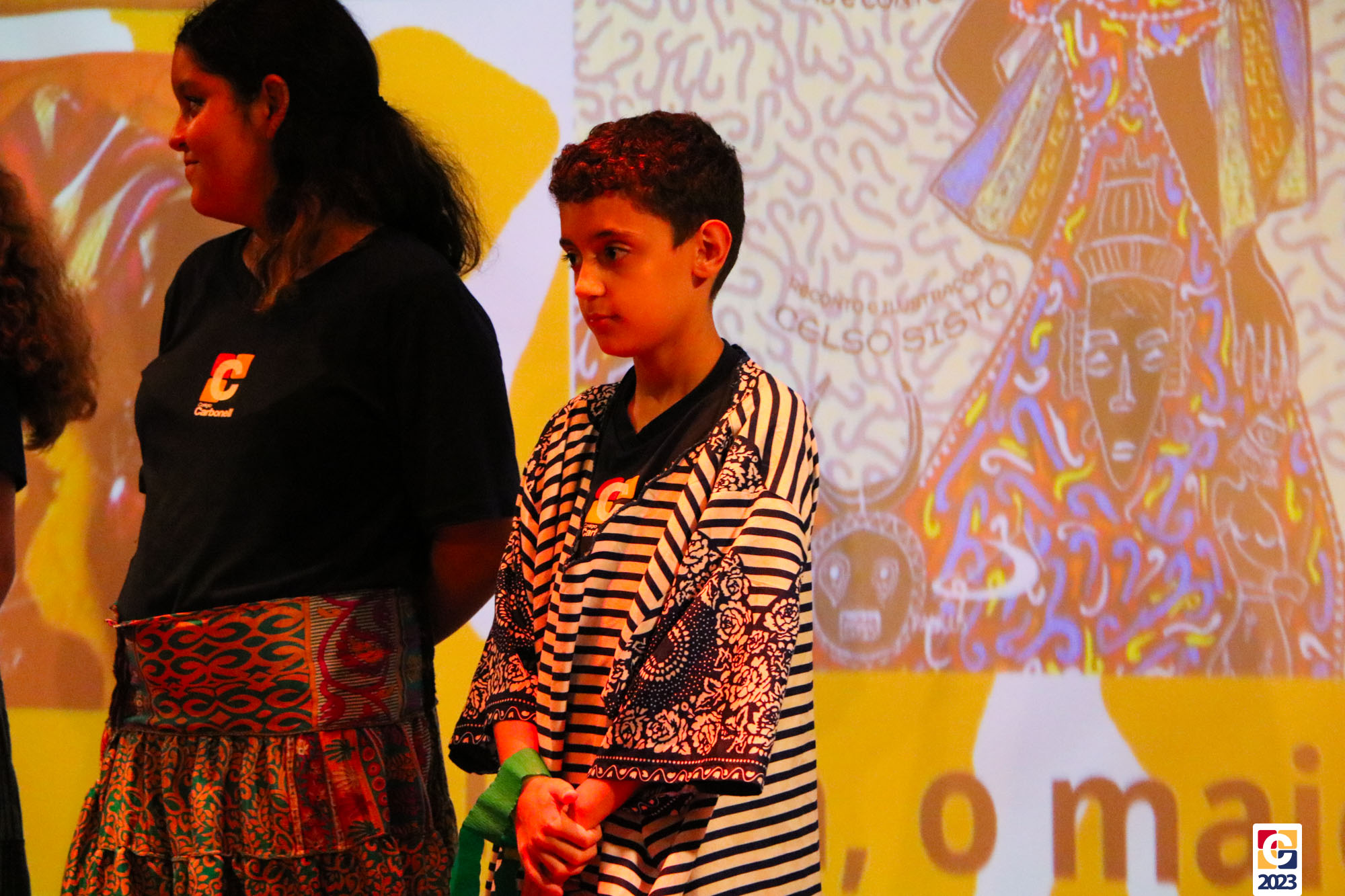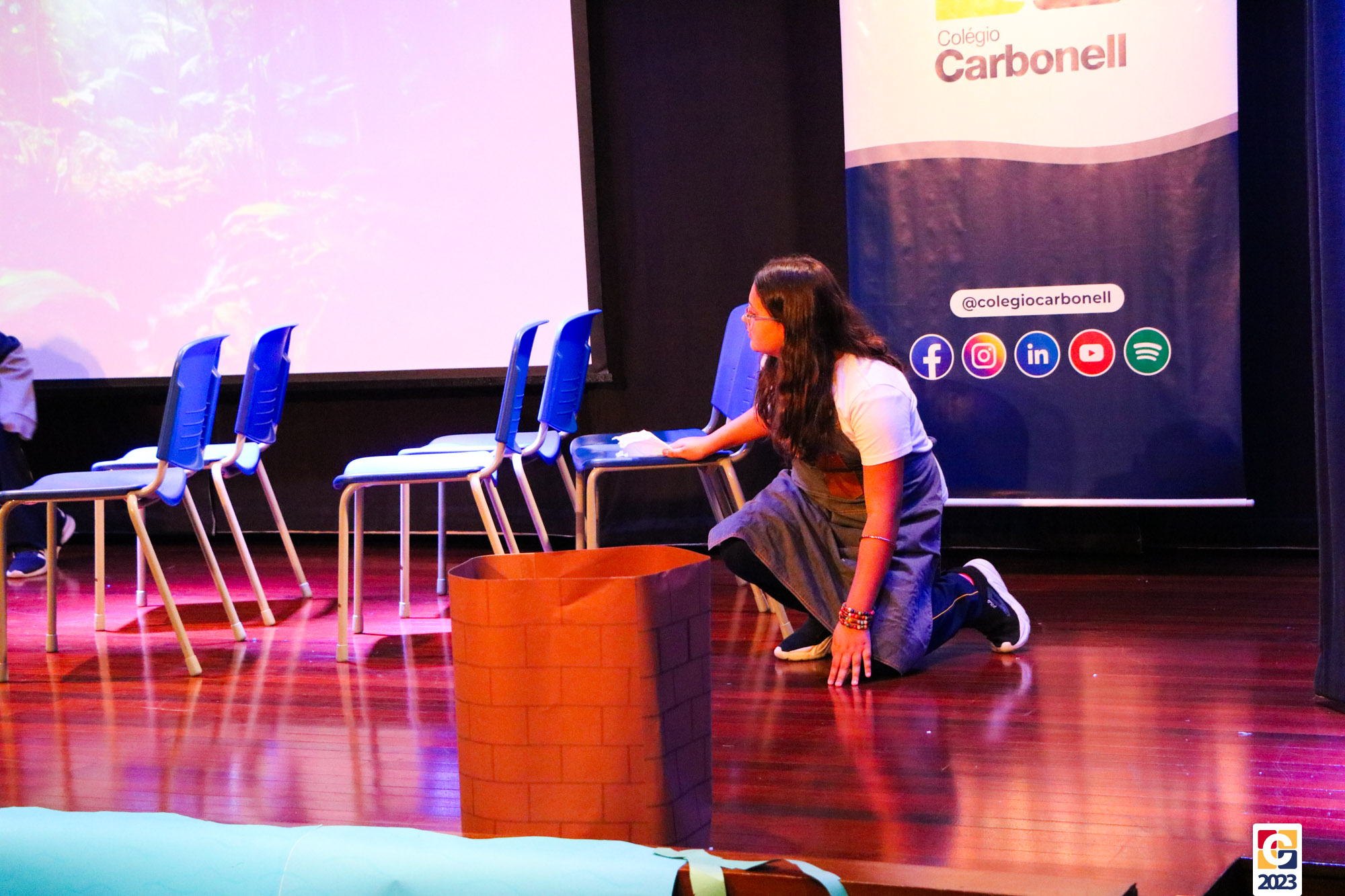 Turmas de 6º ano apresentaram poemas baseados em contos africanos que eles mesmos produziram, reforçando, assim, a aprendizagem e a absorção das leituras. A abordagem proporcionou uma perspectiva da cultura africana que contribui para promover o entendimento e o respeito pela diversidade. Já o 7º ano tomou conta do palco e apresentou um espetáculo teatral também baseado nos contos africanos. Nas peças, salas de aula onde o professor narrava o conto eram retratadas, enquanto os atores encenavam a história caracterizados com roupas típicas. 🎭