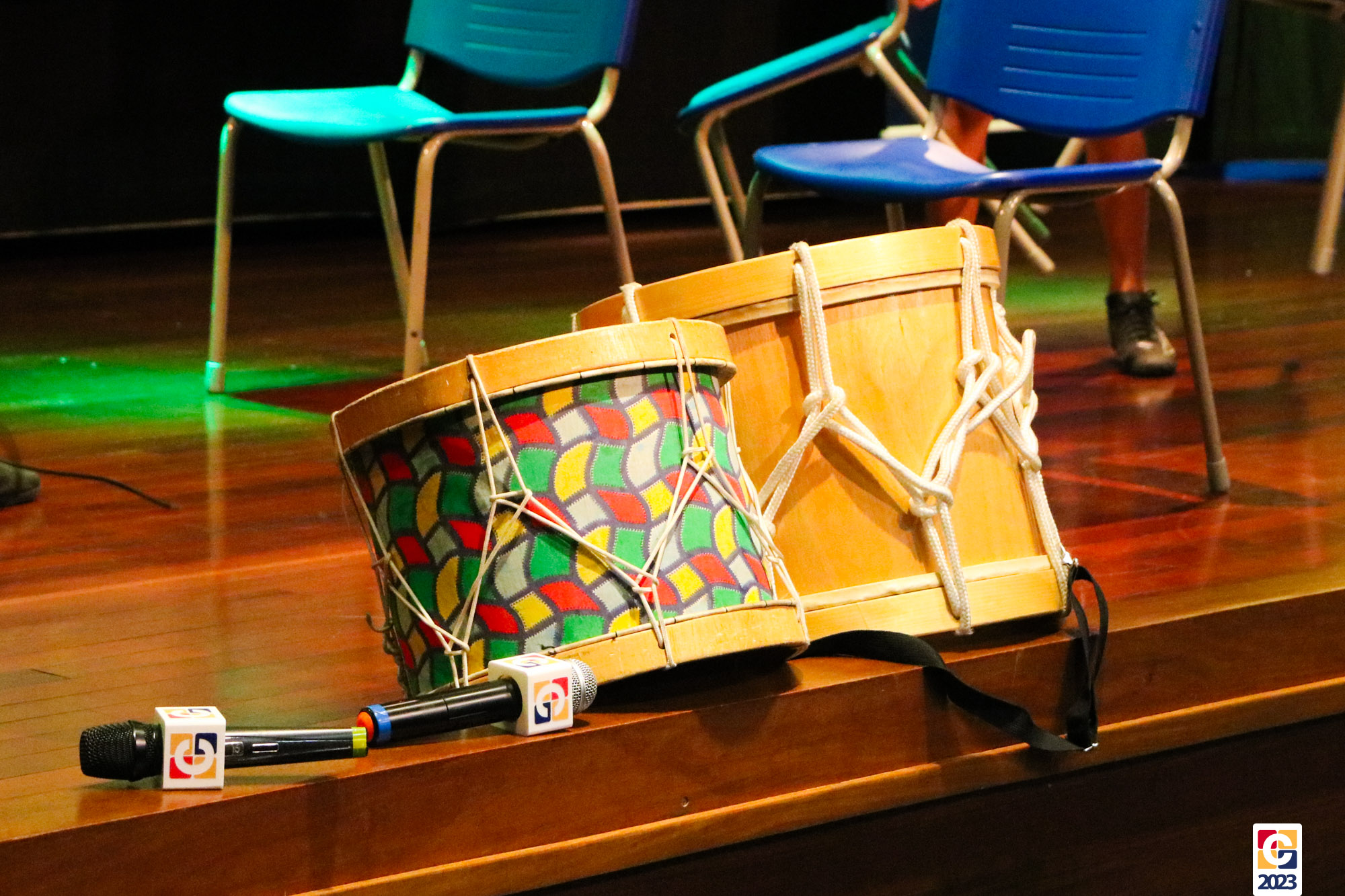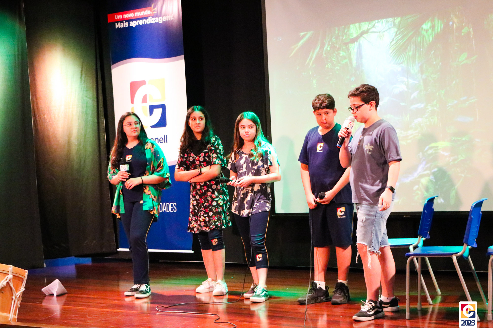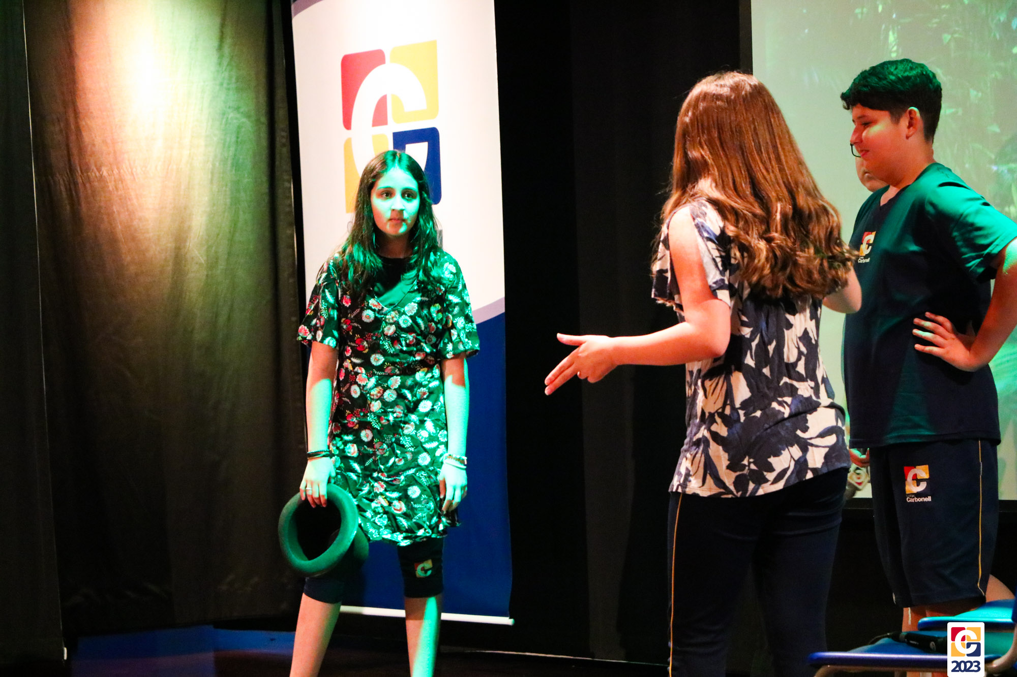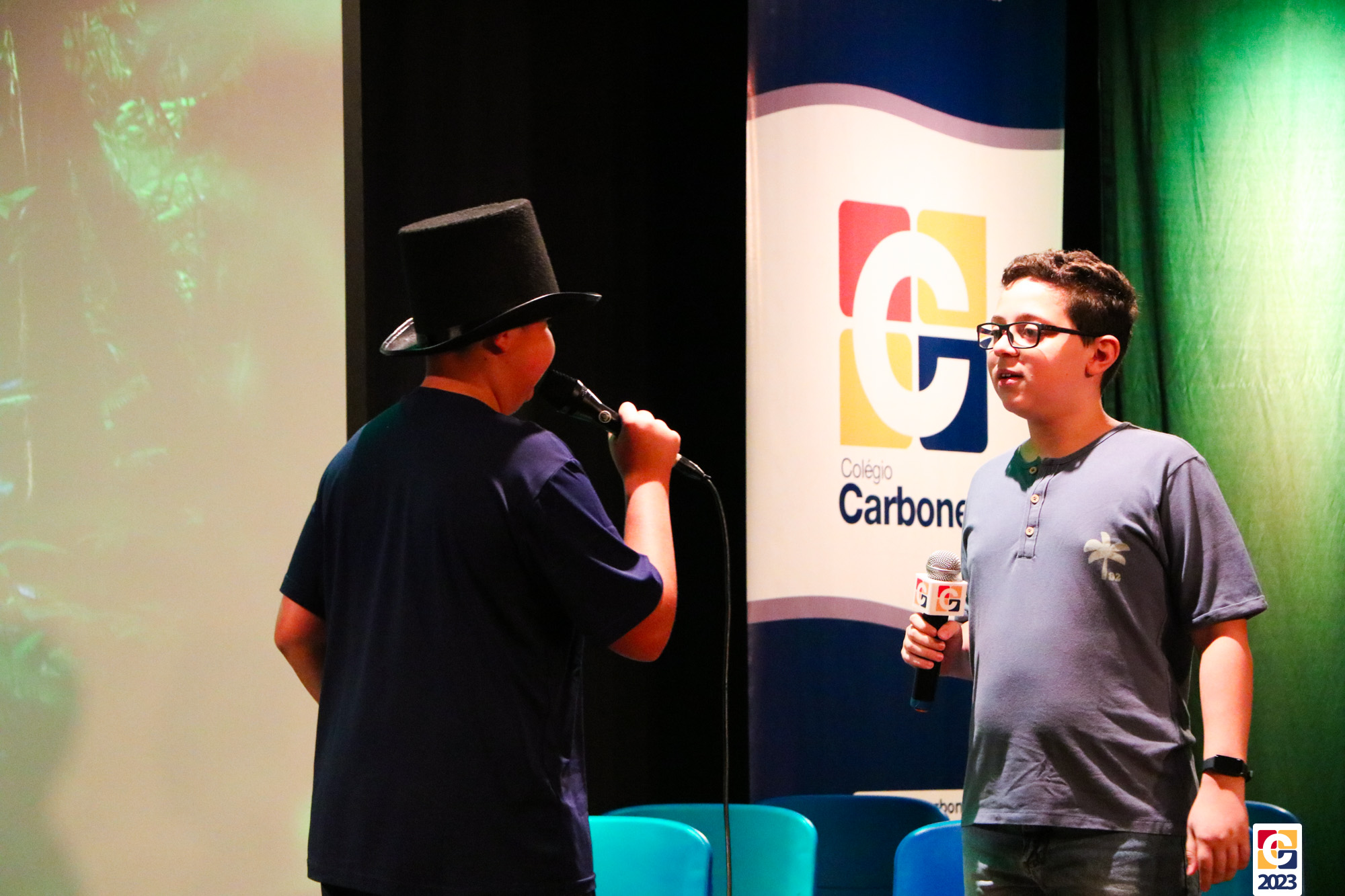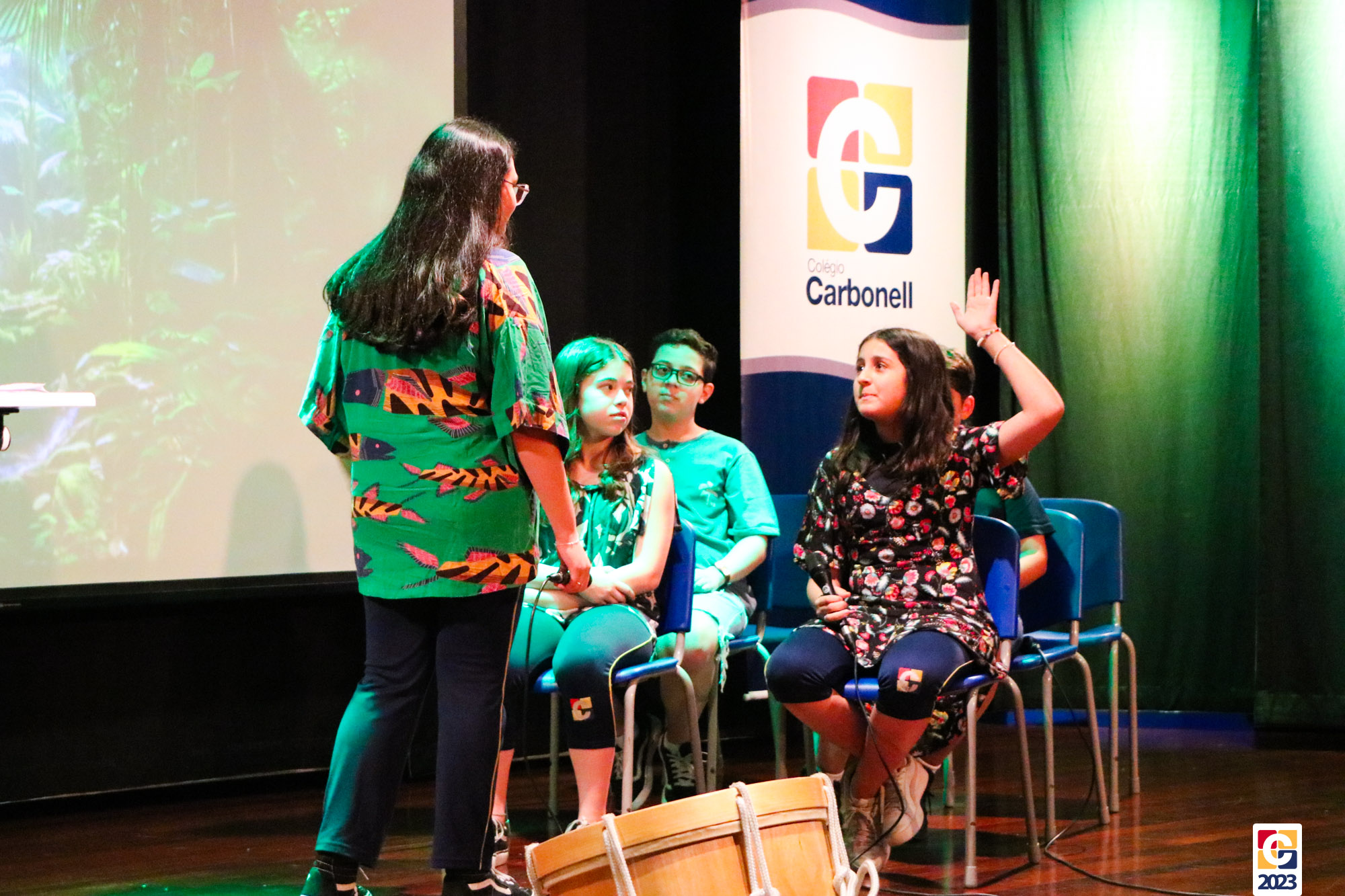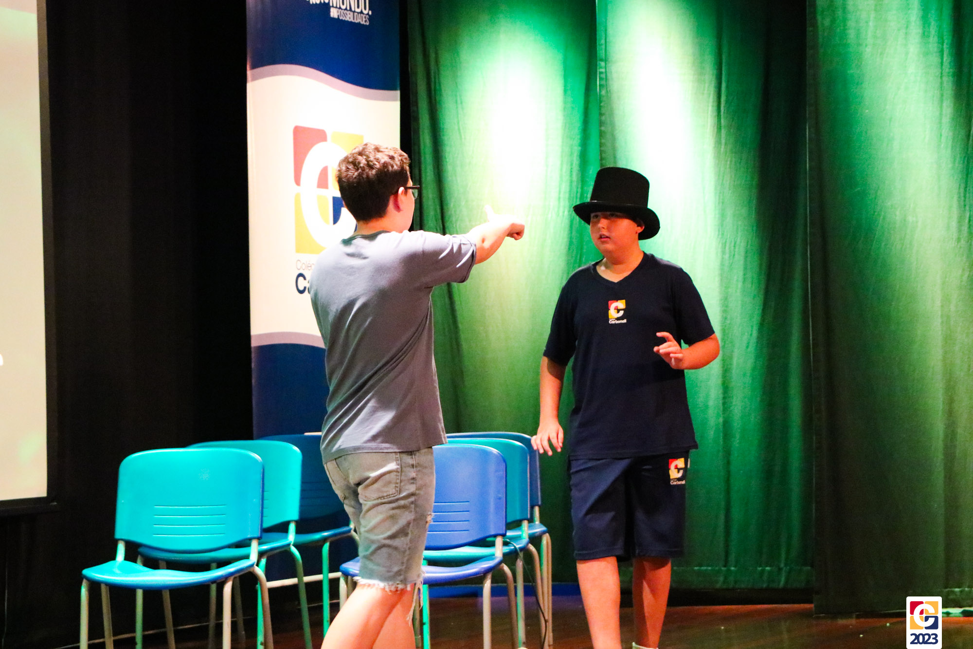 Turmas de 6º ano apresentaram poemas baseados em contos africanos que eles mesmos produziram, reforçando, assim, a aprendizagem e a absorção das leituras. A abordagem proporcionou uma perspectiva da cultura africana que contribui para promover o entendimento e o respeito pela diversidade. Já o 7º ano tomou conta do palco e apresentou um espetáculo teatral também baseado nos contos africanos. Nas peças, salas de aula onde o professor narrava o conto eram retratadas, enquanto os atores encenavam a história caracterizados com roupas típicas. 🎭