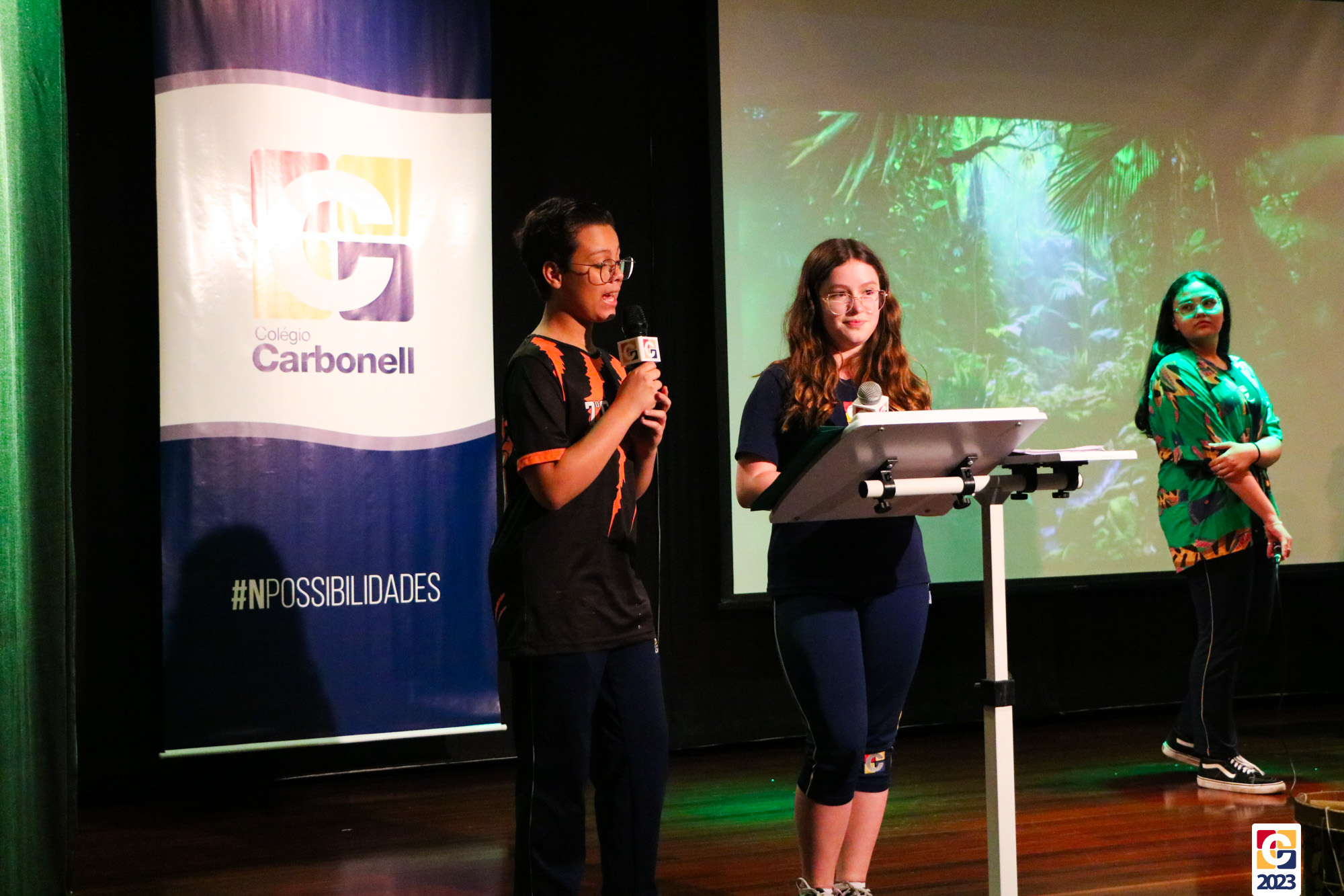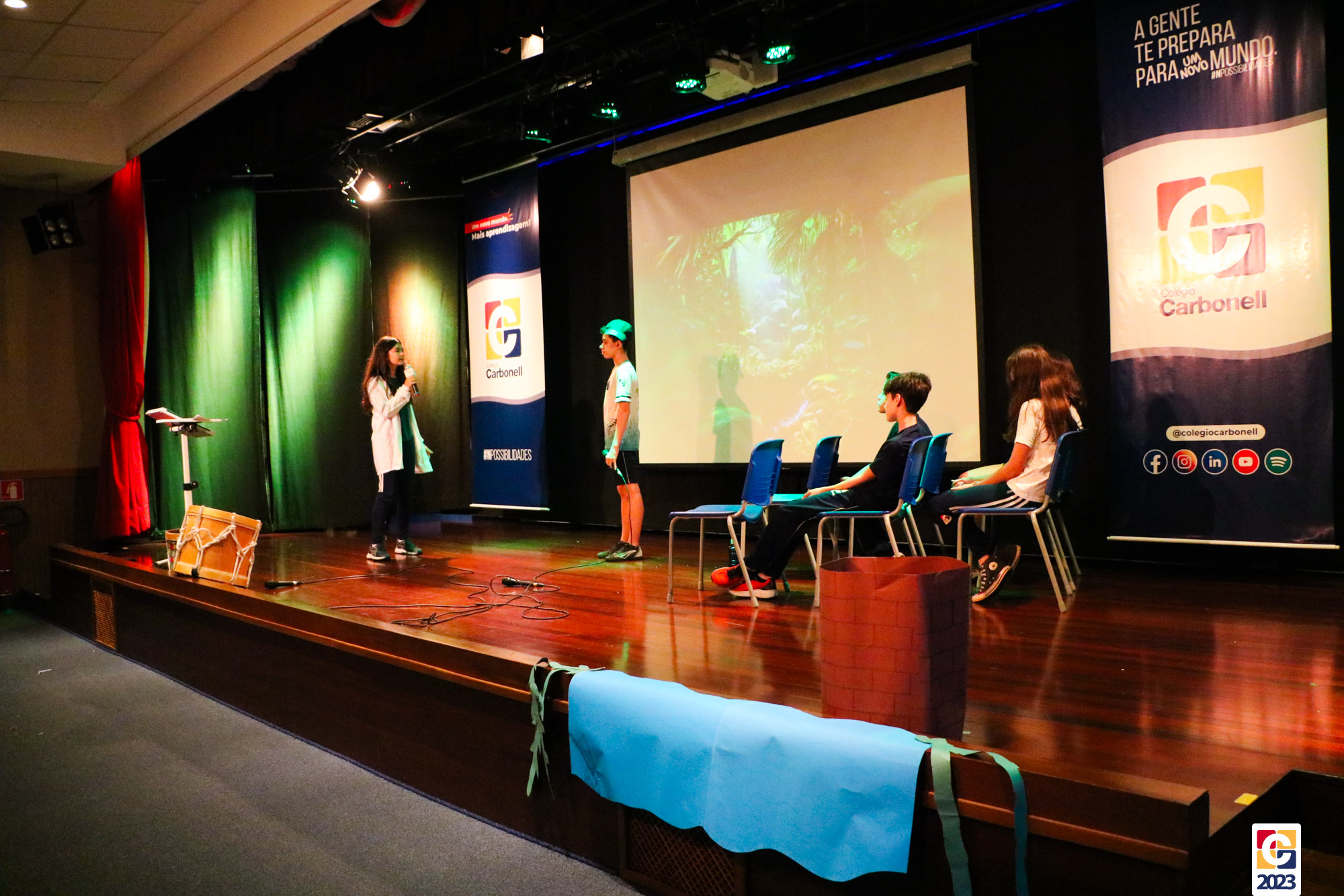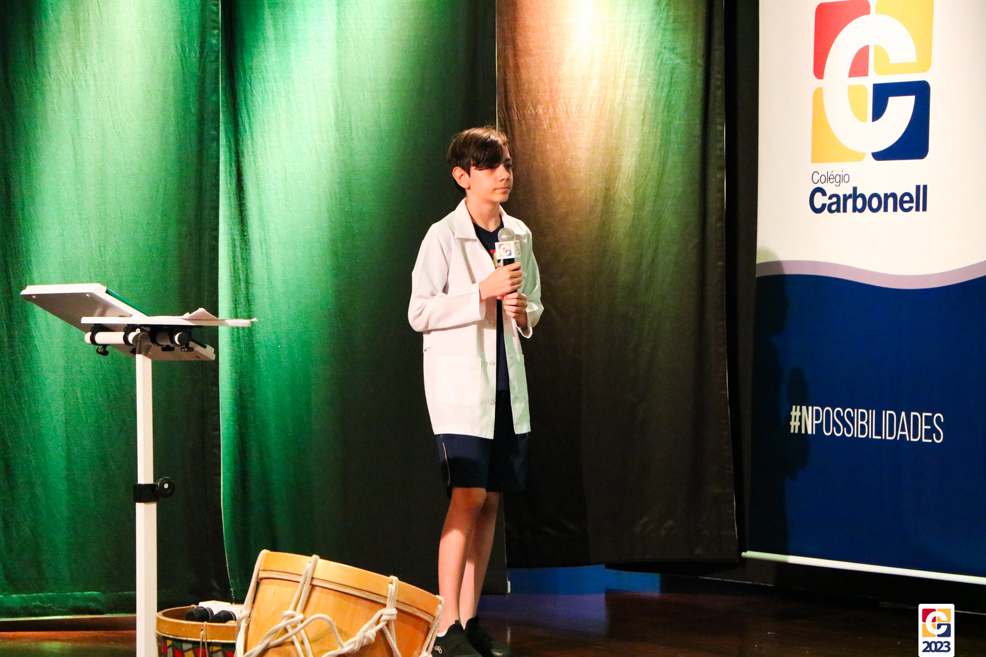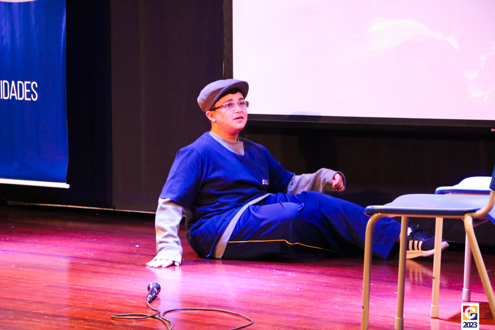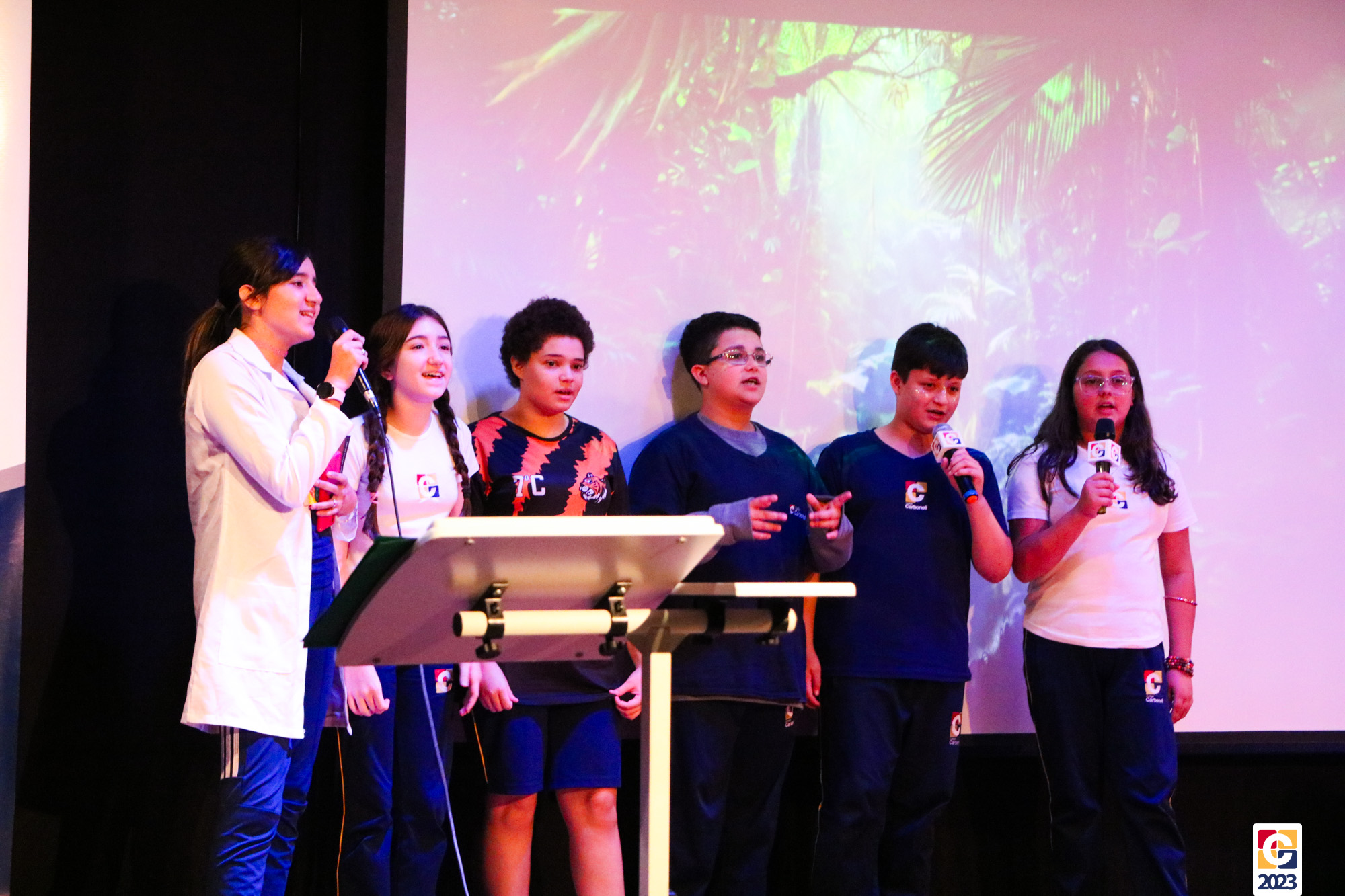 Turmas de 6º ano apresentaram poemas baseados em contos africanos que eles mesmos produziram, reforçando, assim, a aprendizagem e a absorção das leituras. A abordagem proporcionou uma perspectiva da cultura africana que contribui para promover o entendimento e o respeito pela diversidade. Já o 7º ano tomou conta do palco e apresentou um espetáculo teatral também baseado nos contos africanos. Nas peças, salas de aula onde o professor narrava o conto eram retratadas, enquanto os atores encenavam a história caracterizados com roupas típicas. 🎭