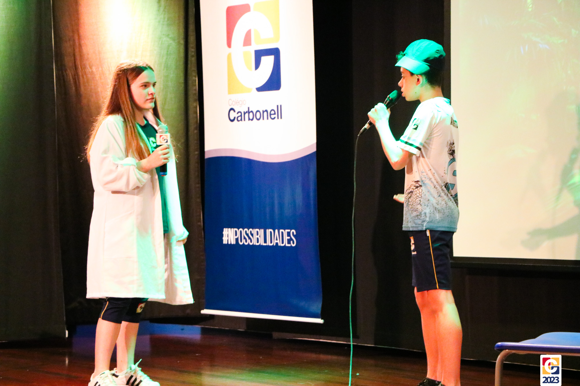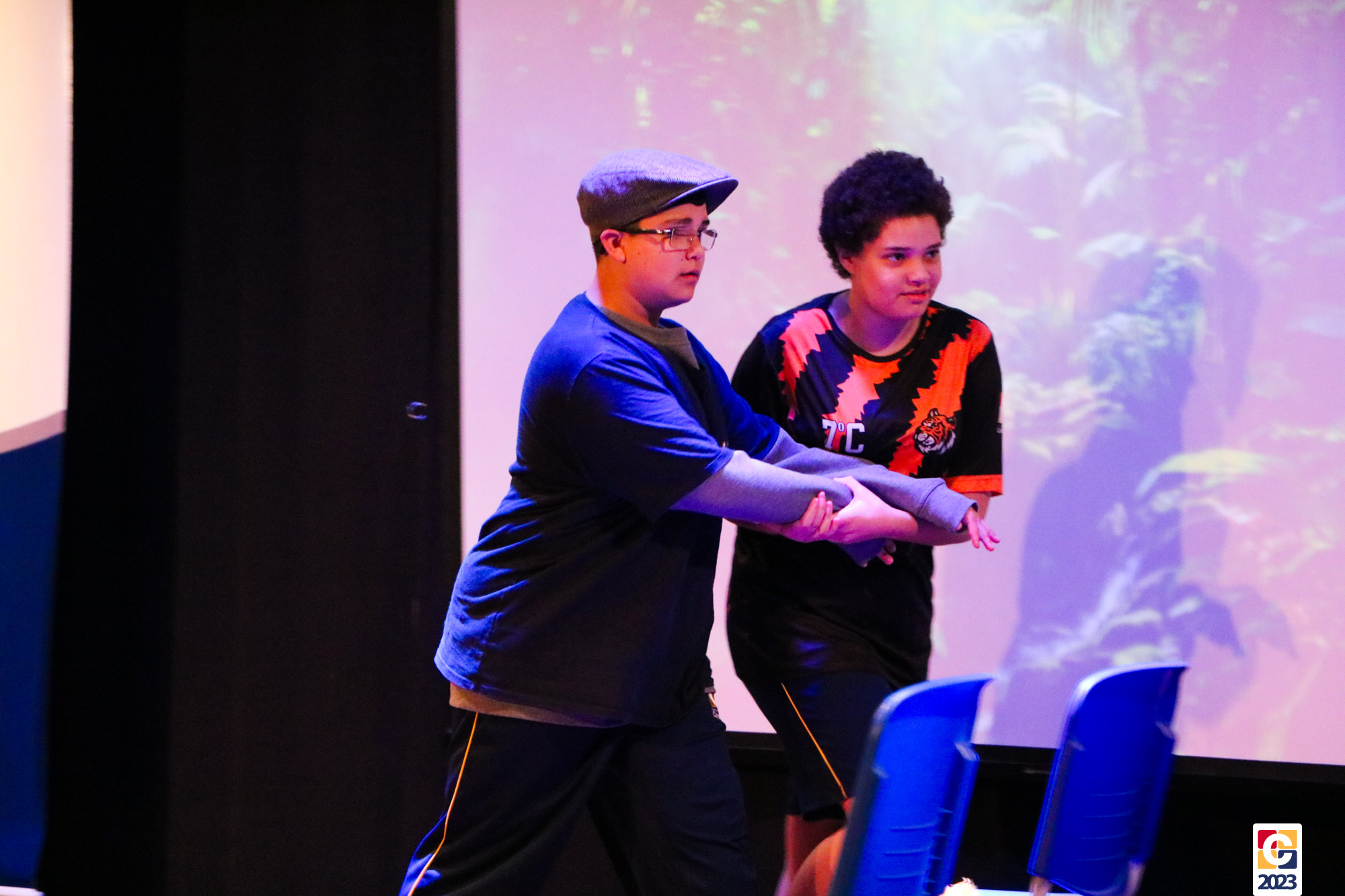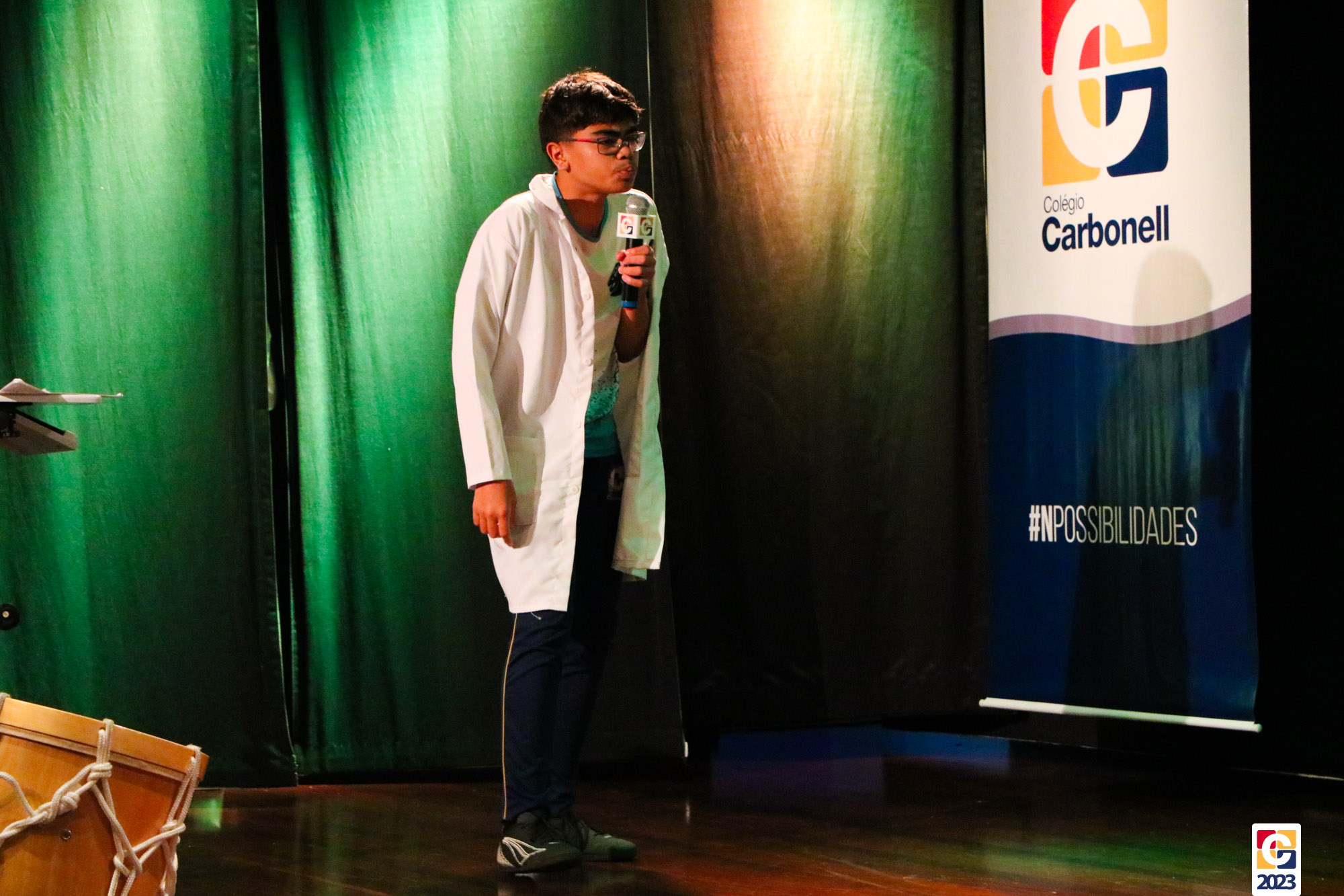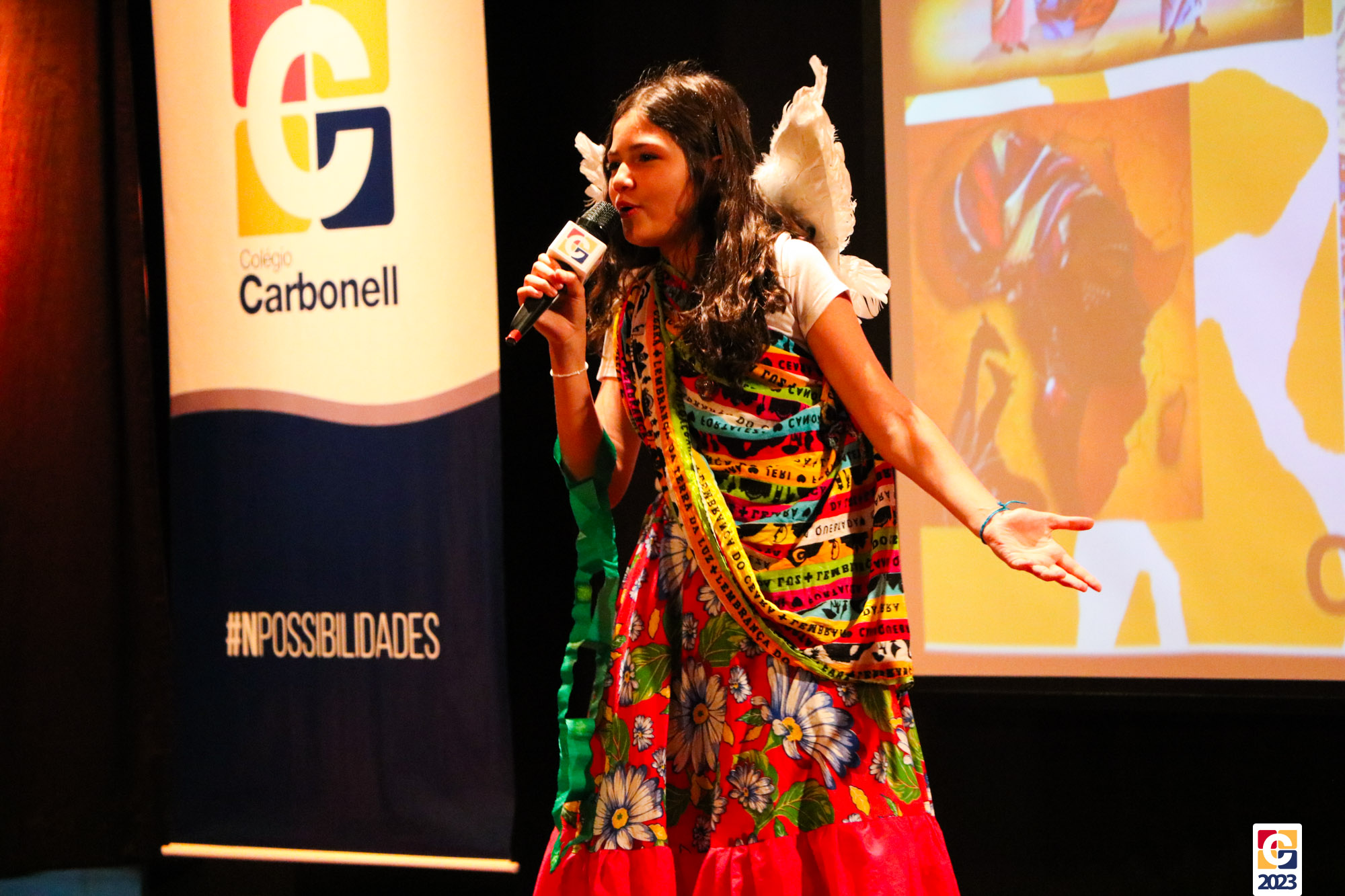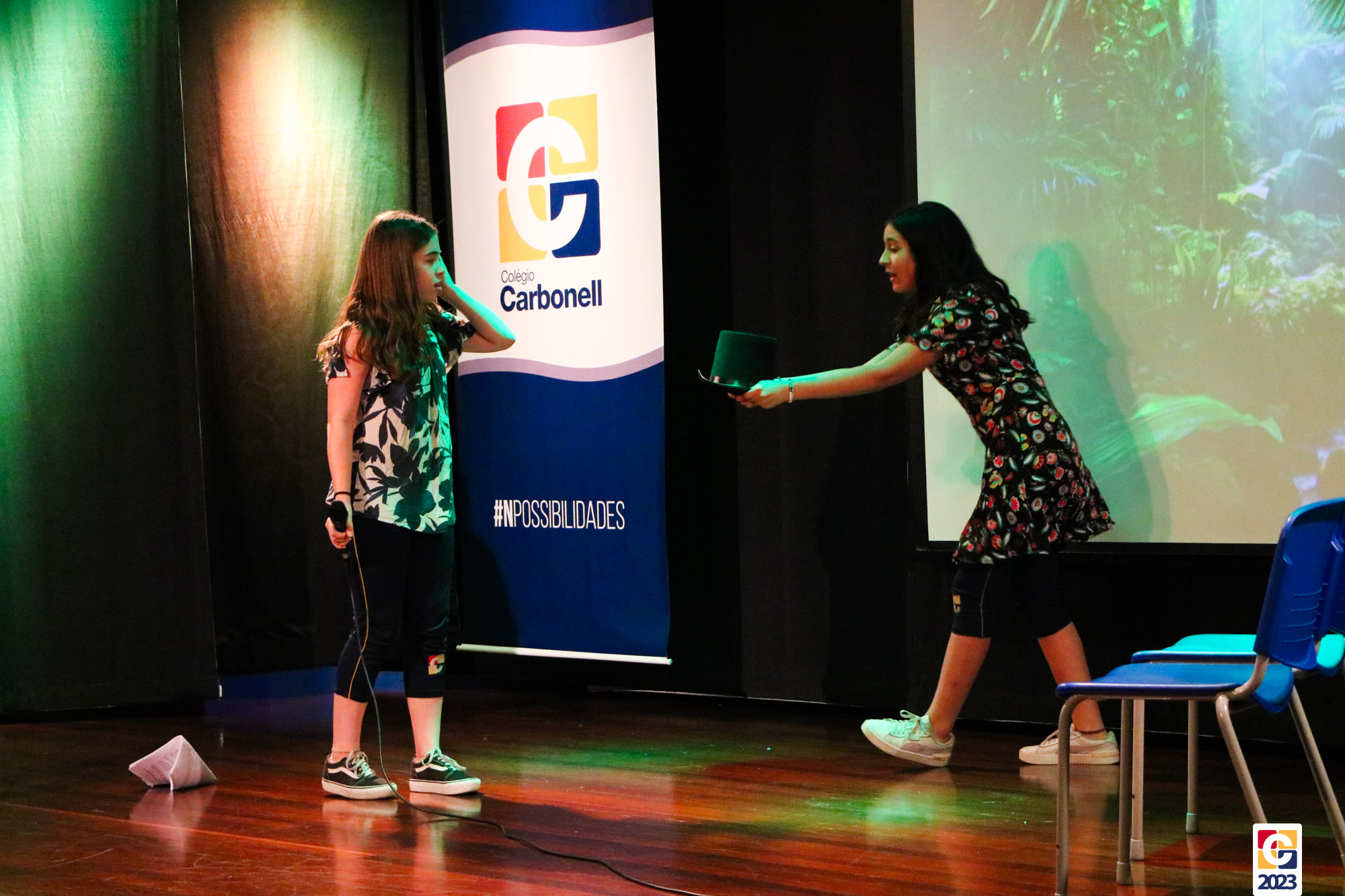 Turmas de 6º ano apresentaram poemas baseados em contos africanos que eles mesmos produziram, reforçando, assim, a aprendizagem e a absorção das leituras. A abordagem proporcionou uma perspectiva da cultura africana que contribui para promover o entendimento e o respeito pela diversidade. Já o 7º ano tomou conta do palco e apresentou um espetáculo teatral também baseado nos contos africanos. Nas peças, salas de aula onde o professor narrava o conto eram retratadas, enquanto os atores encenavam a história caracterizados com roupas típicas. 🎭