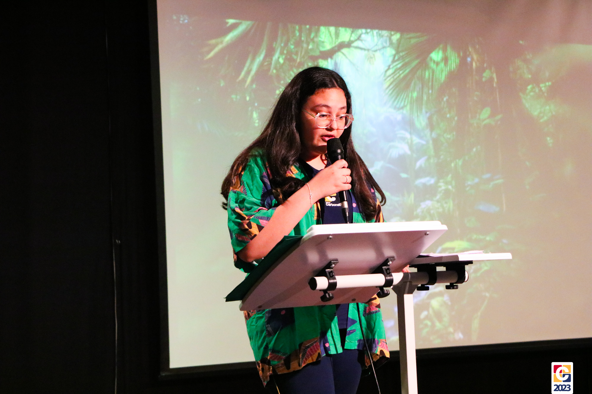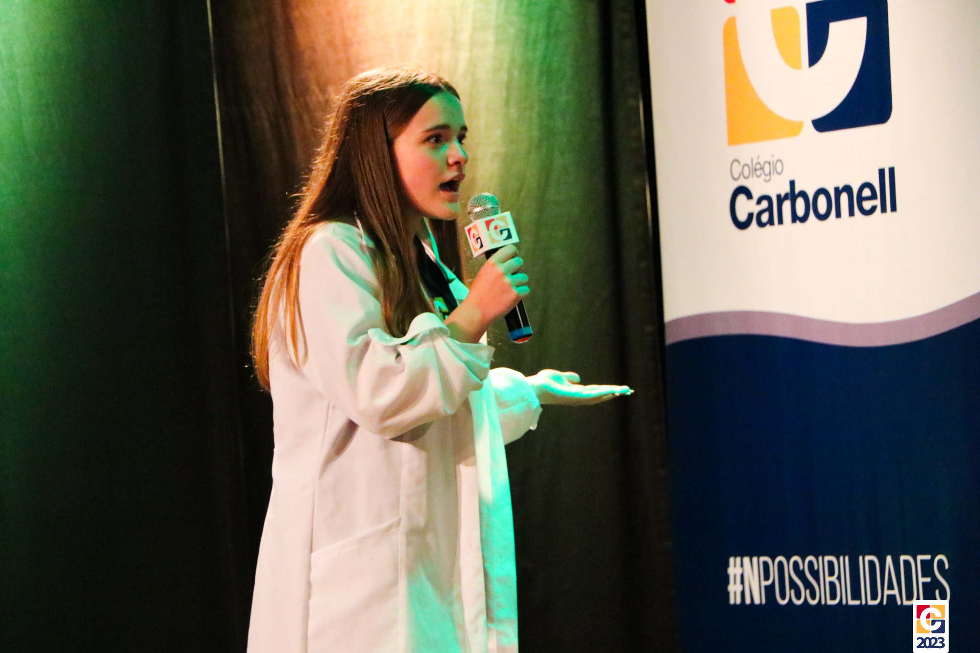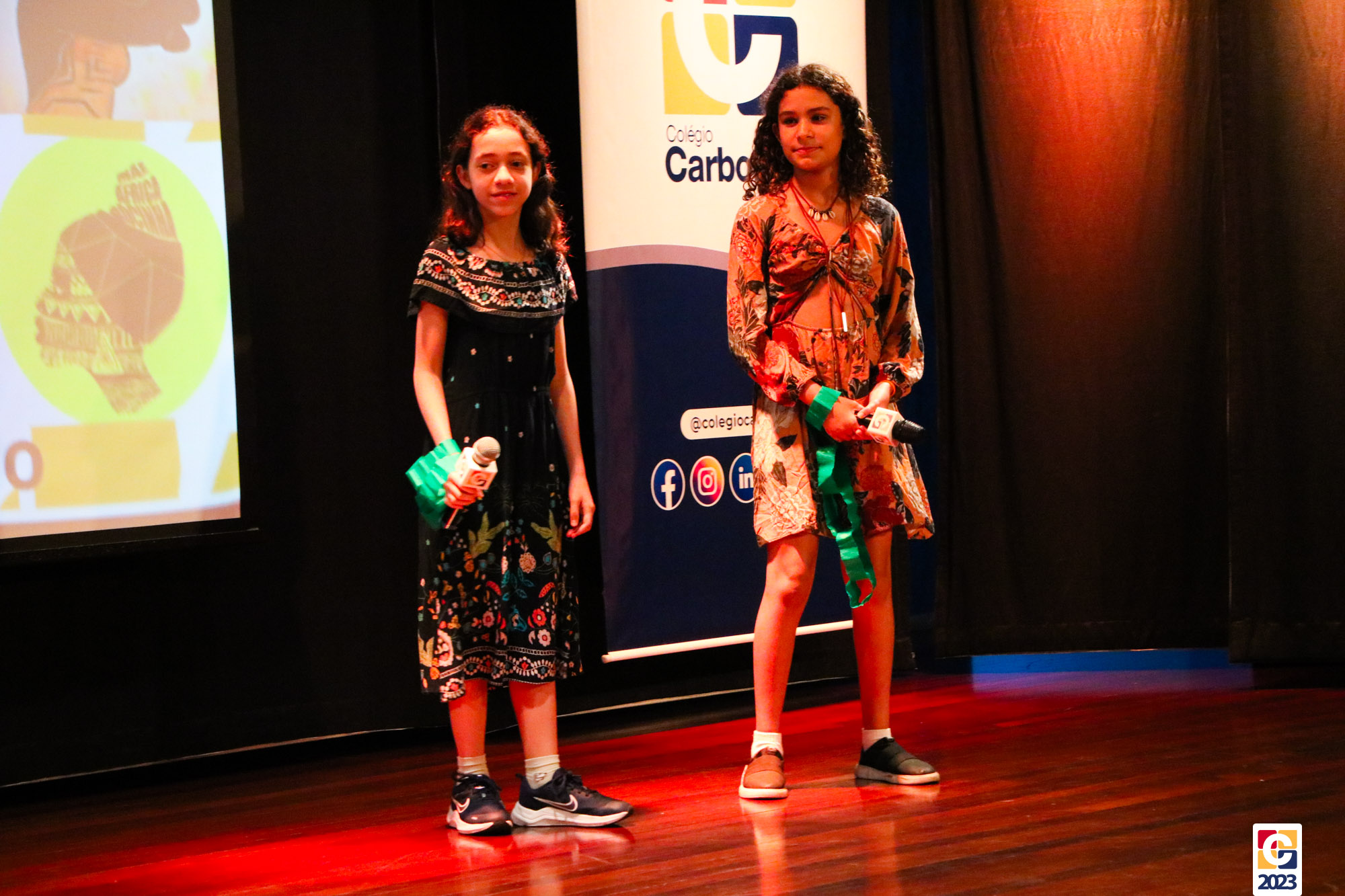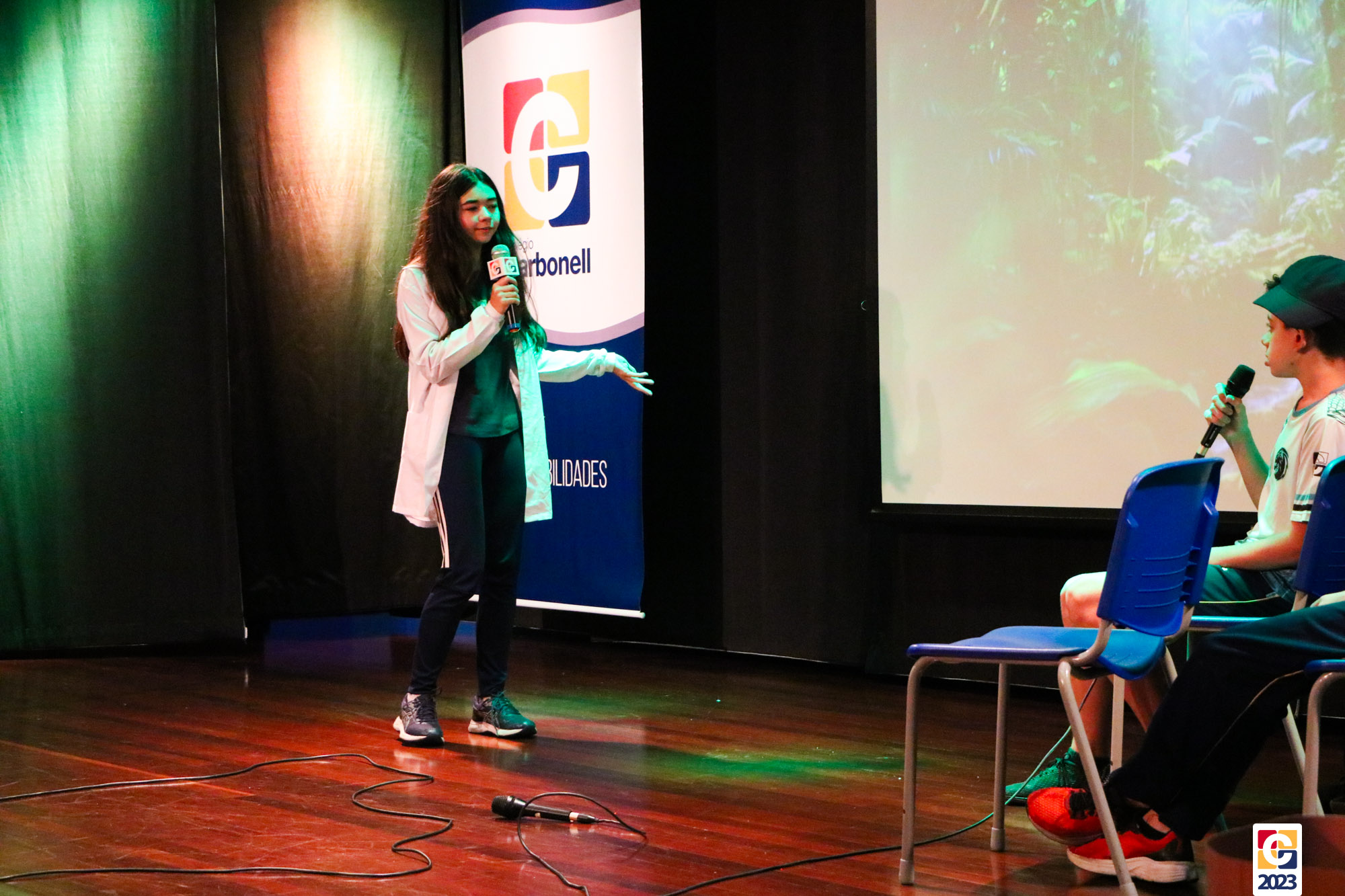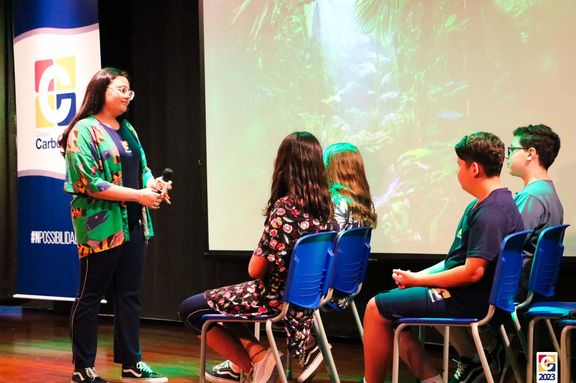 Turmas de 6º ano apresentaram poemas baseados em contos africanos que eles mesmos produziram, reforçando, assim, a aprendizagem e a absorção das leituras. A abordagem proporcionou uma perspectiva da cultura africana que contribui para promover o entendimento e o respeito pela diversidade. Já o 7º ano tomou conta do palco e apresentou um espetáculo teatral também baseado nos contos africanos. Nas peças, salas de aula onde o professor narrava o conto eram retratadas, enquanto os atores encenavam a história caracterizados com roupas típicas. 🎭