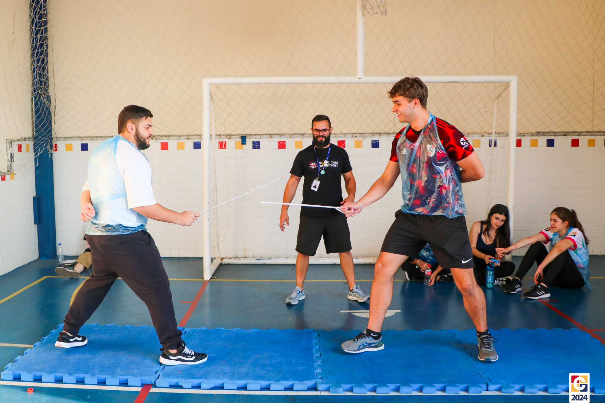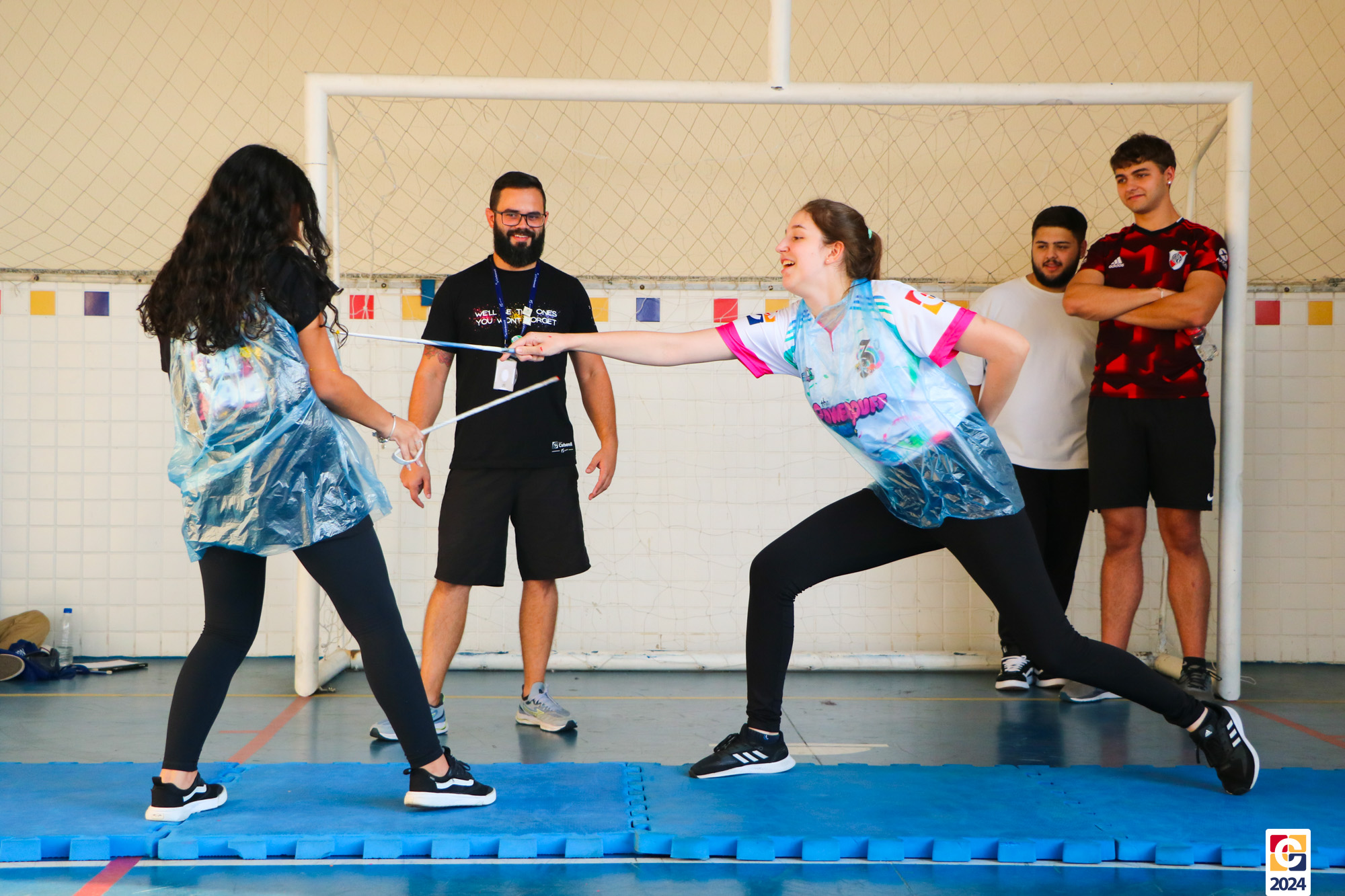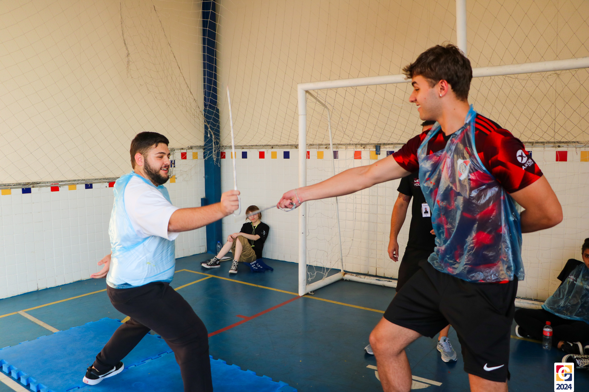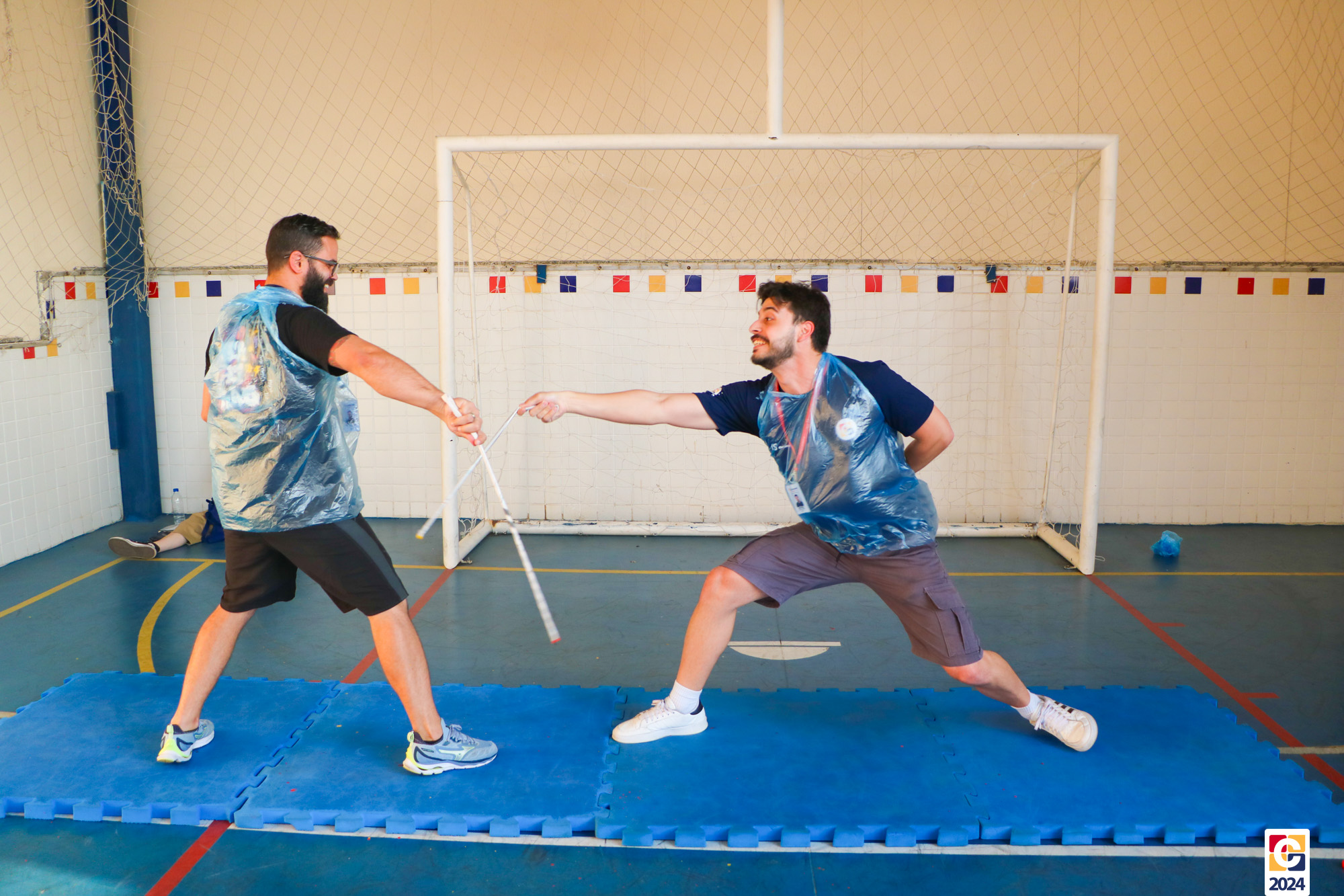 Para garantir a segurança dos participantes, foram utilizados floretes confeccionados com jornal reciclado. As pontas dos floretes foram pintadas para marcar os acertos no adversário durante as simulações. ♻