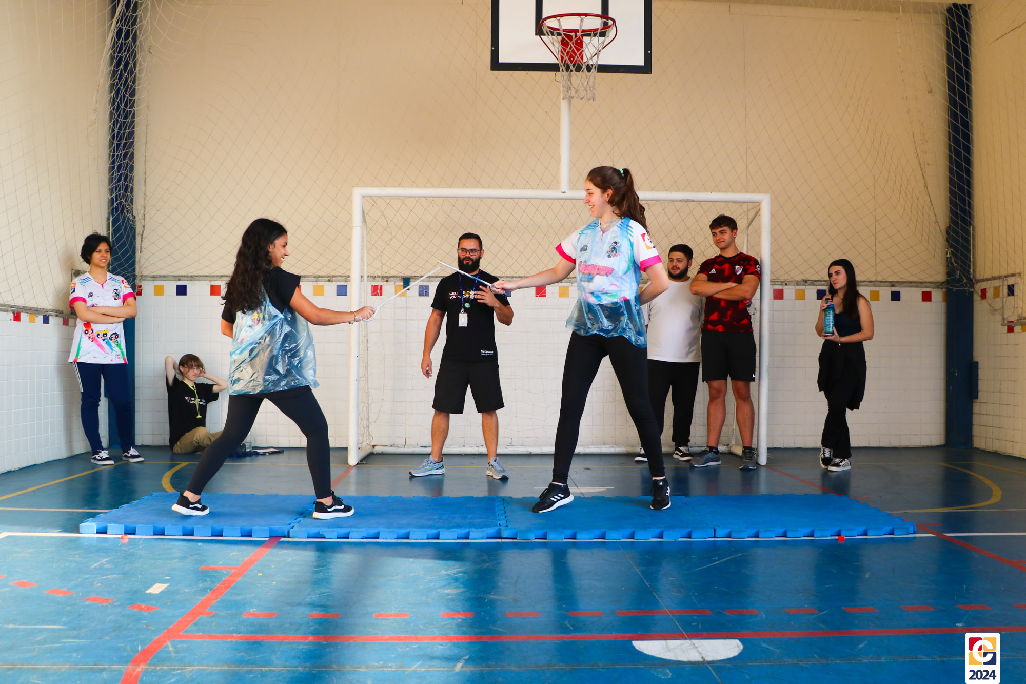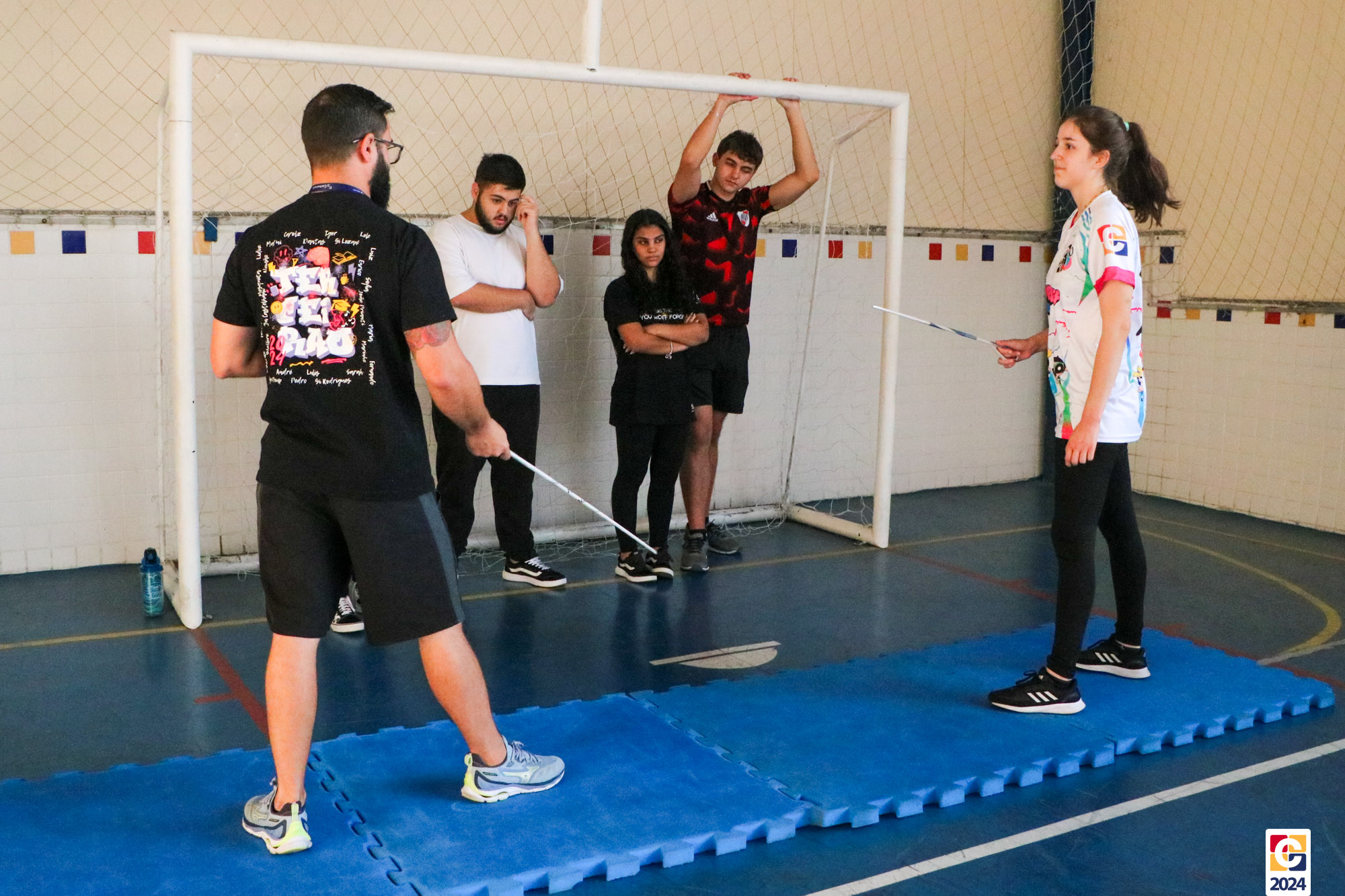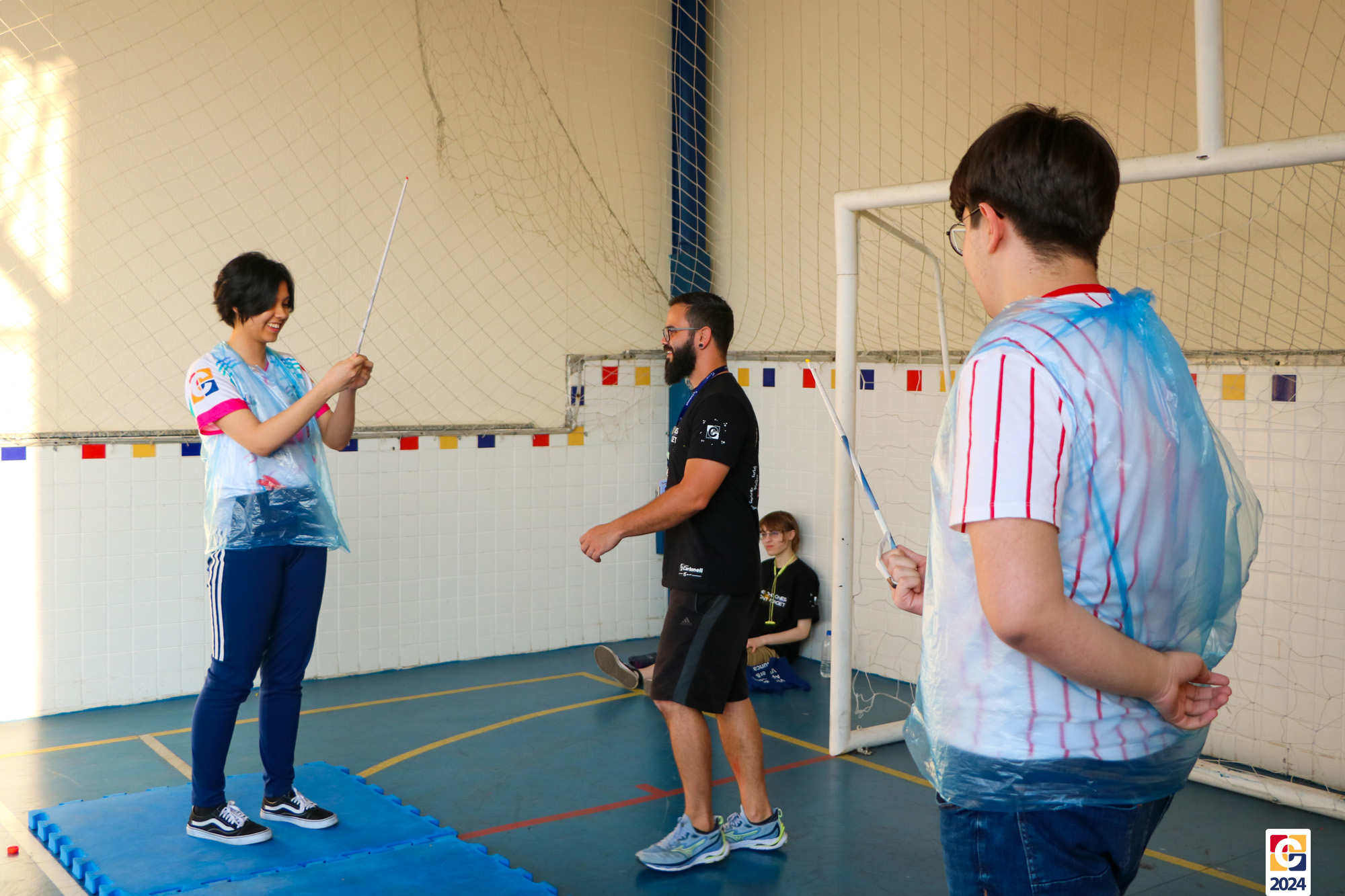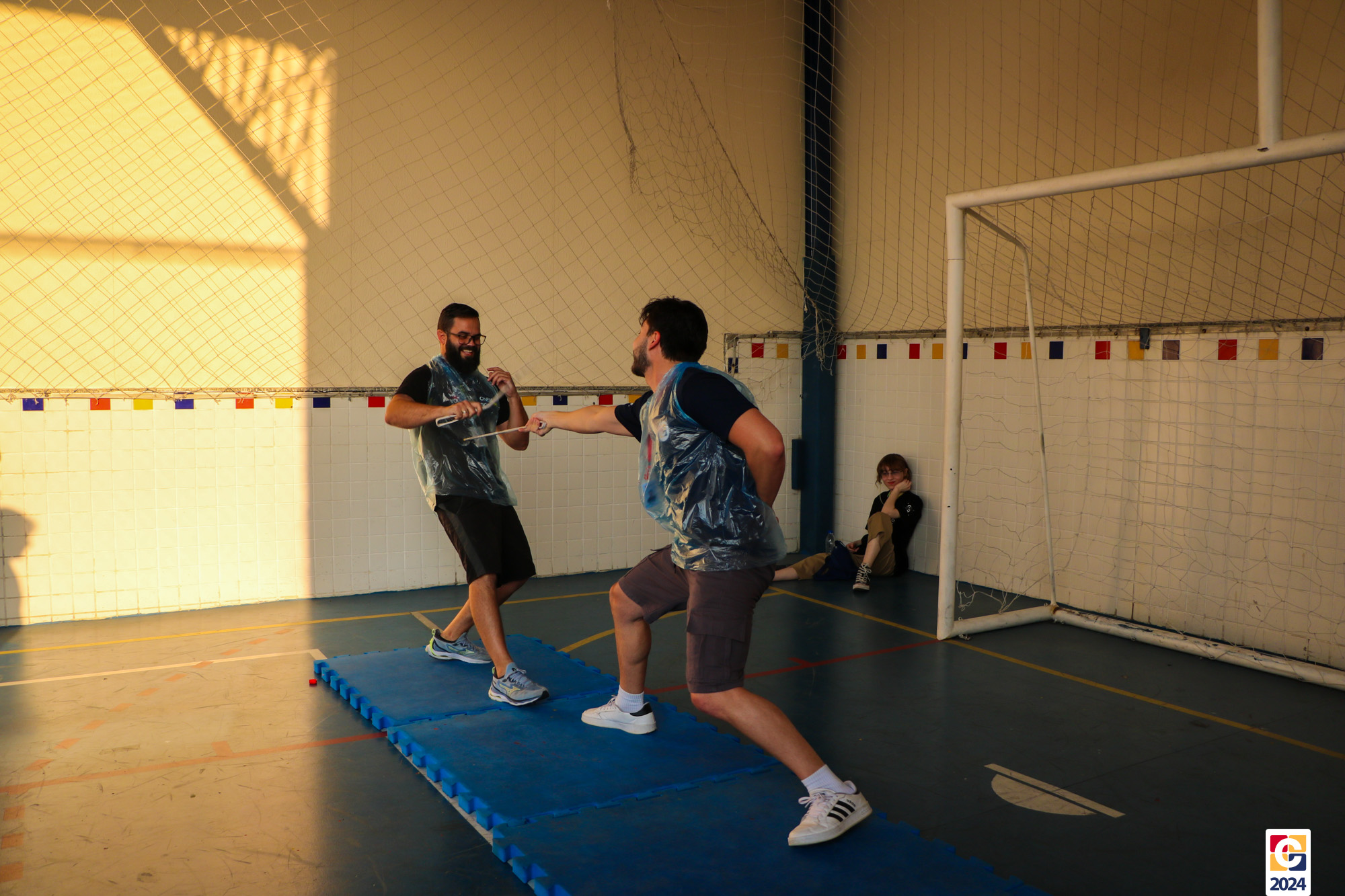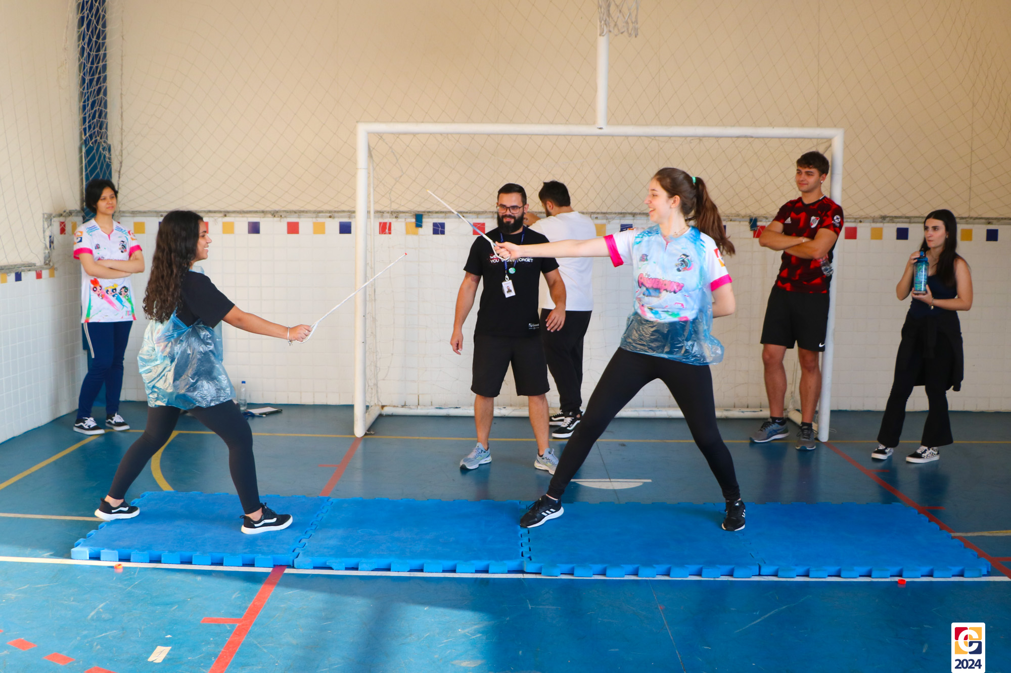 Para garantir a segurança dos participantes, foram utilizados floretes confeccionados com jornal reciclado. As pontas dos floretes foram pintadas para marcar os acertos no adversário durante as simulações. ♻