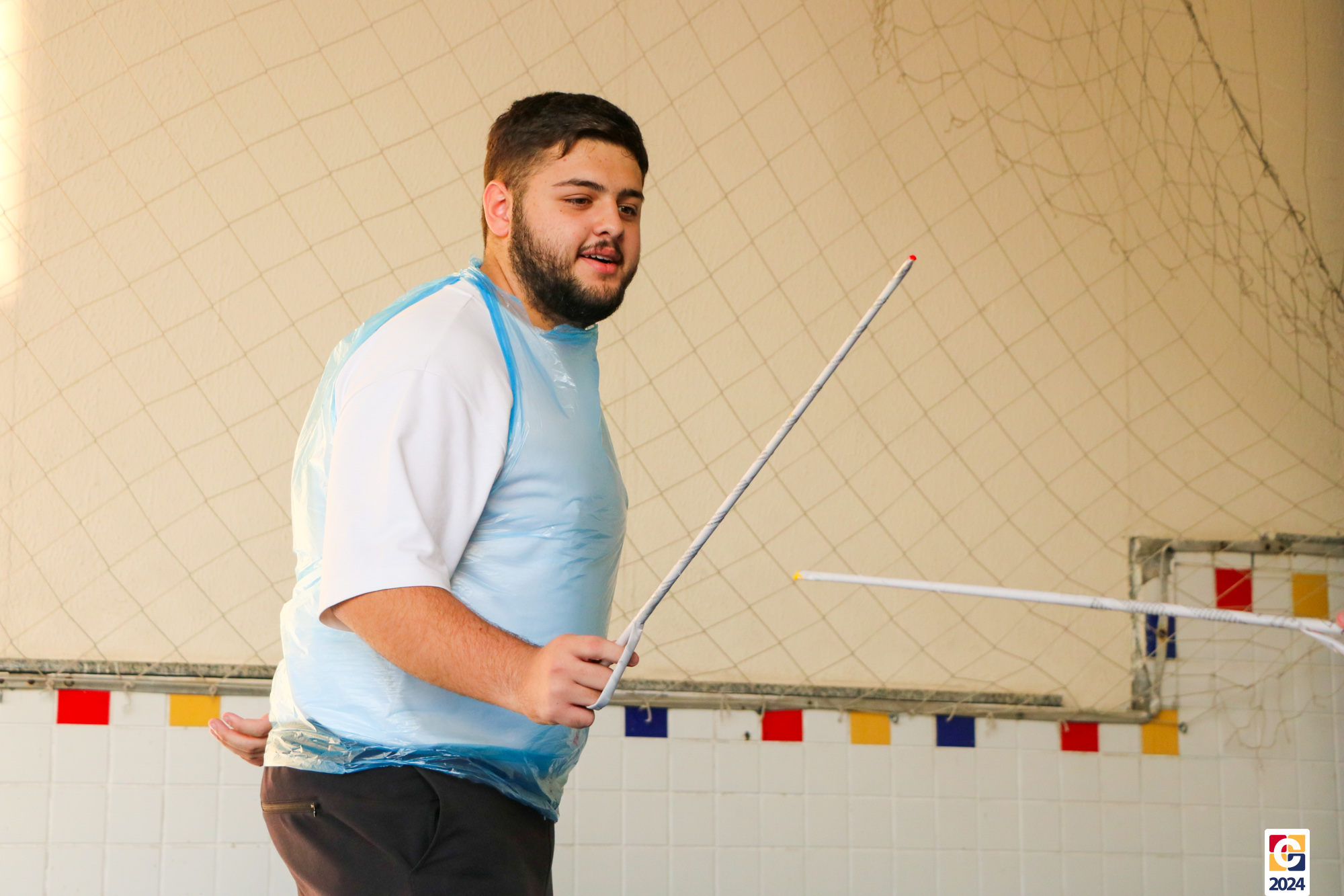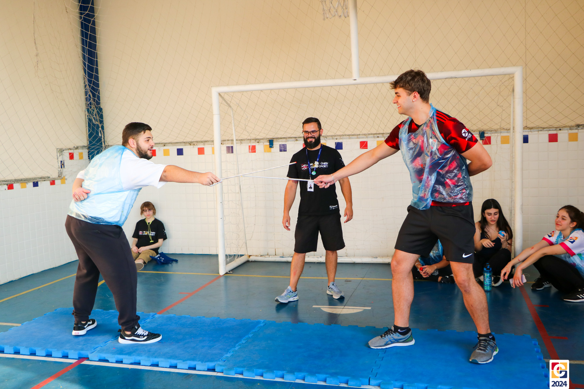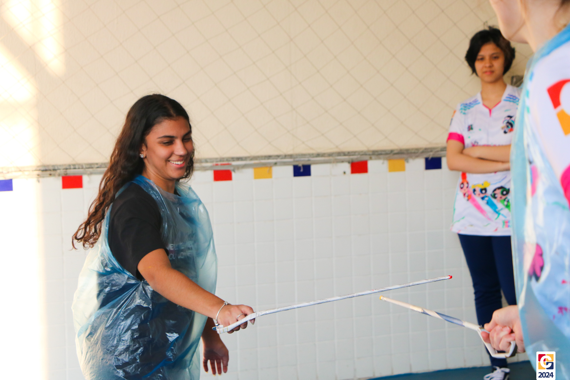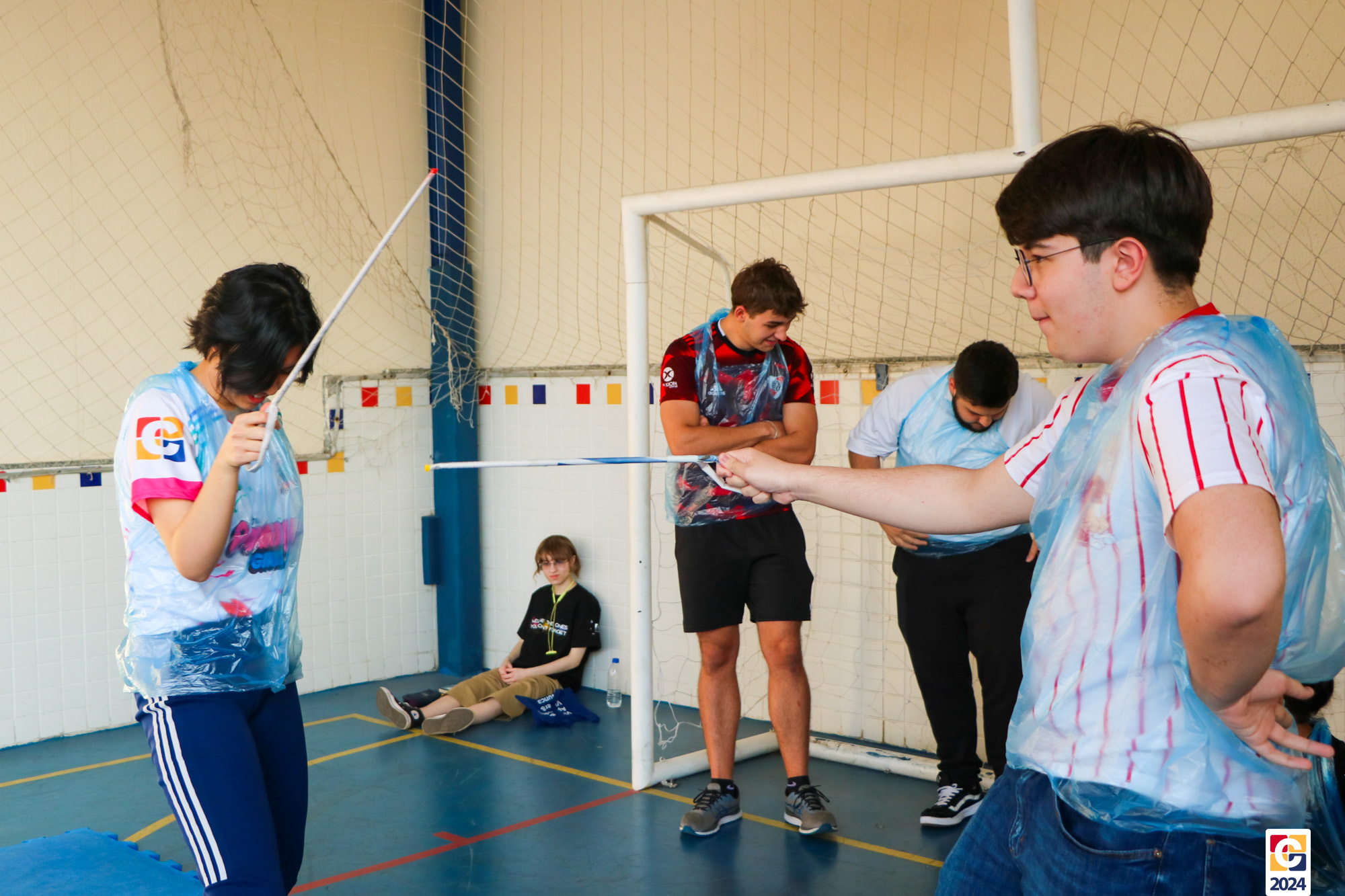 Para garantir a segurança dos participantes, foram utilizados floretes confeccionados com jornal reciclado. As pontas dos floretes foram pintadas para marcar os acertos no adversário durante as simulações. ♻