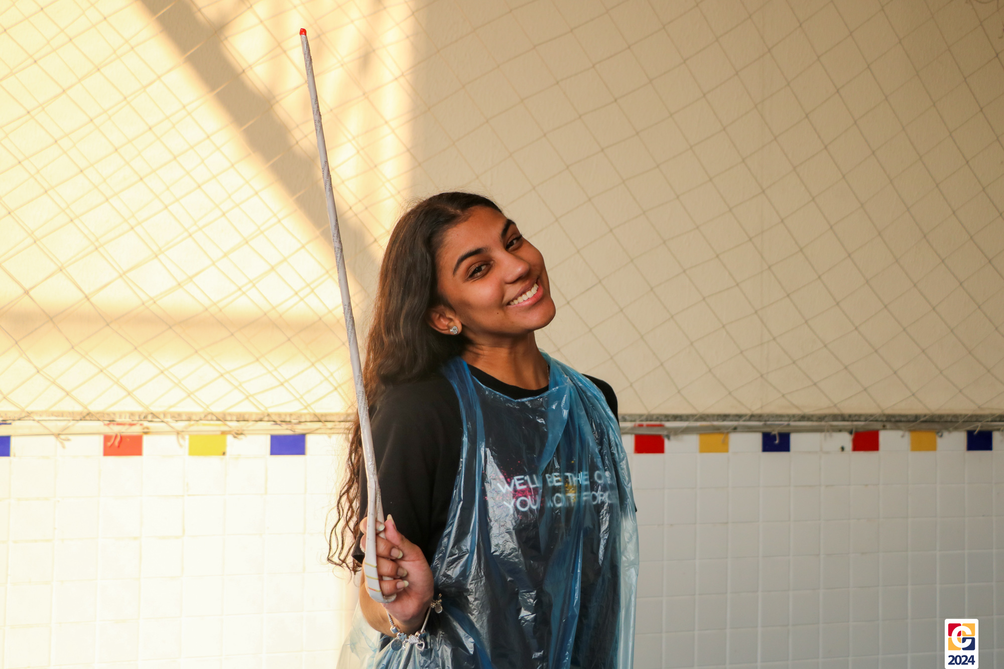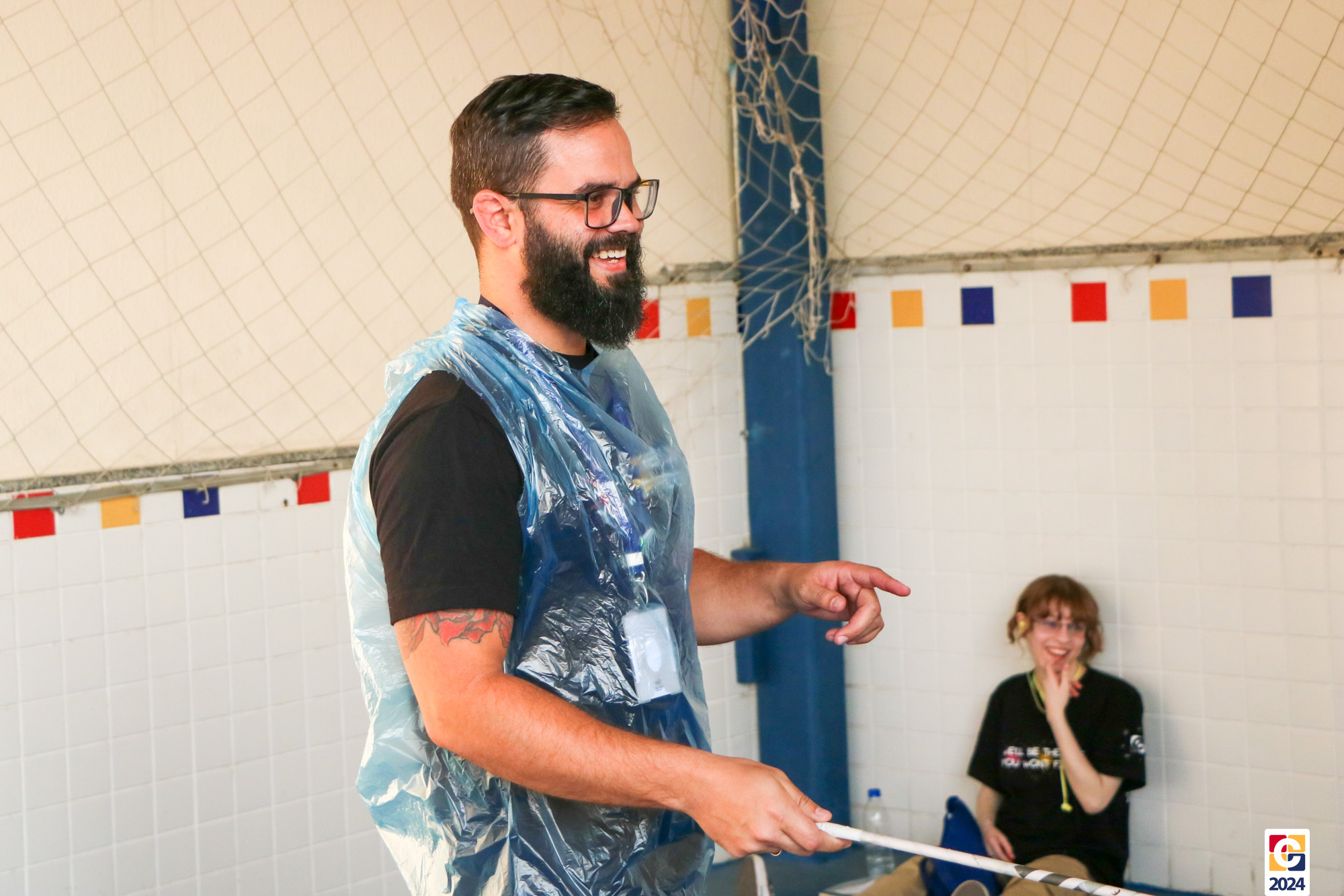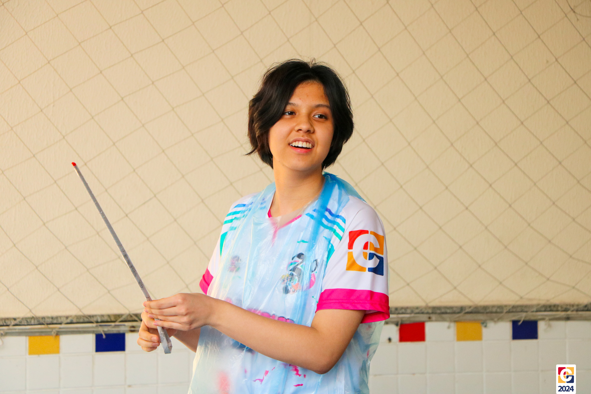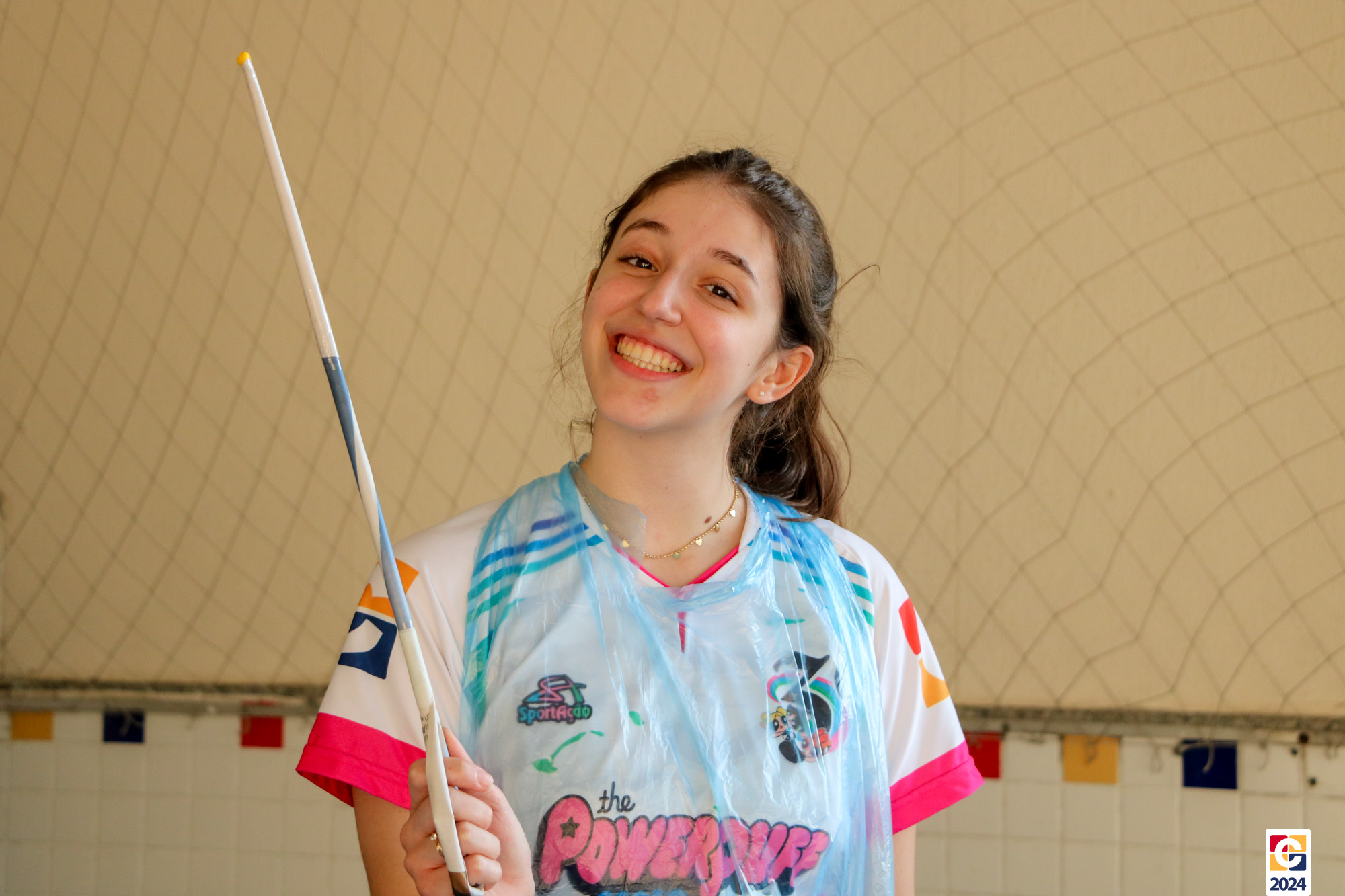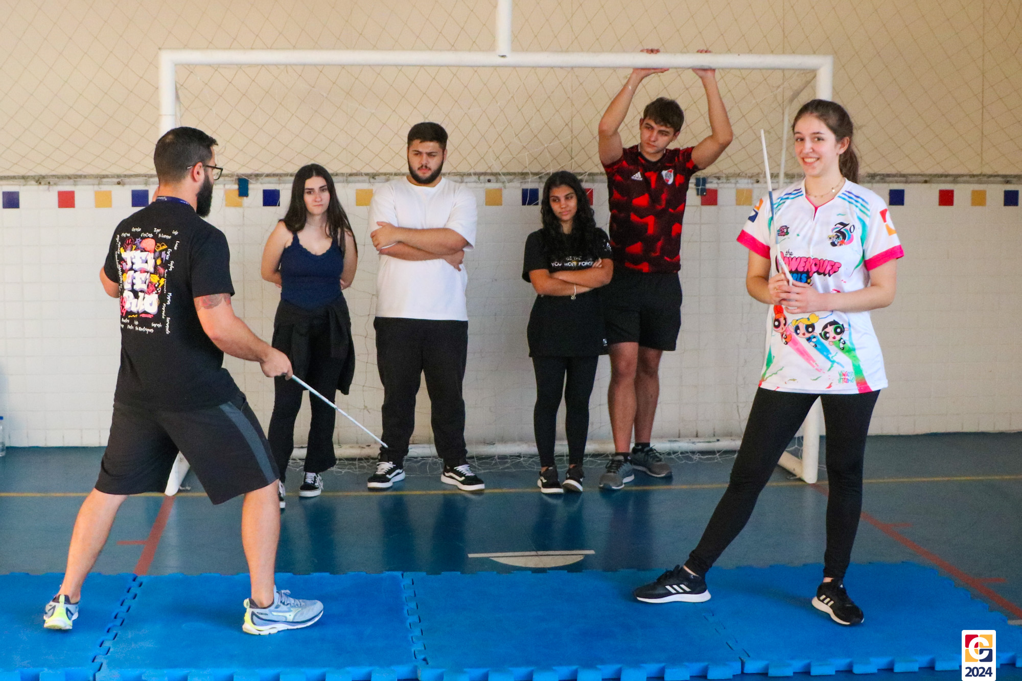 Para garantir a segurança dos participantes, foram utilizados floretes confeccionados com jornal reciclado. As pontas dos floretes foram pintadas para marcar os acertos no adversário durante as simulações. ♻