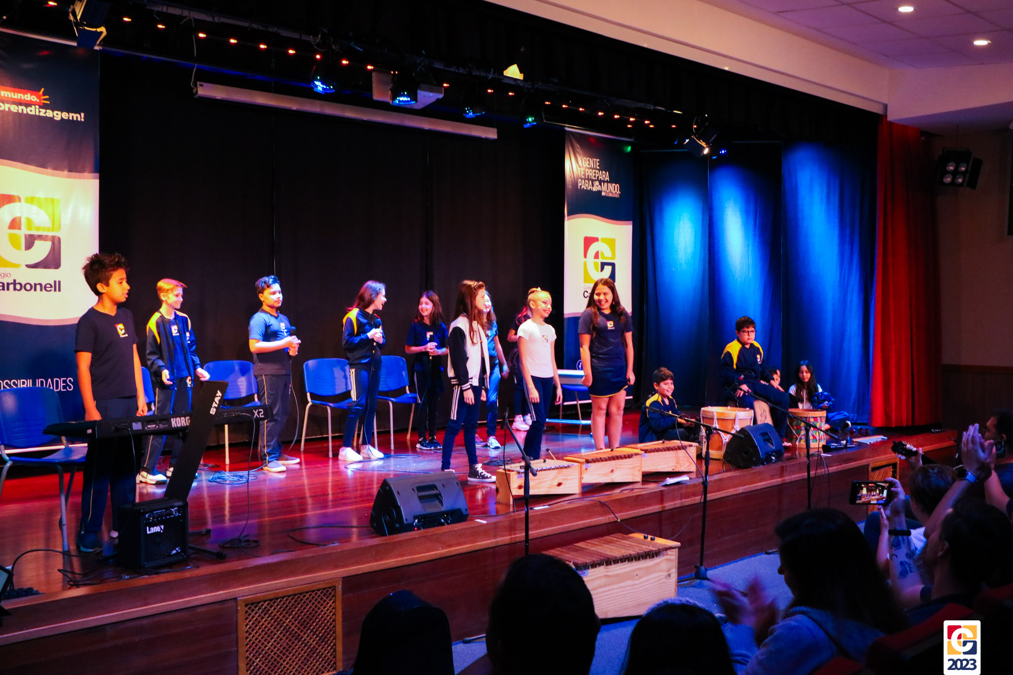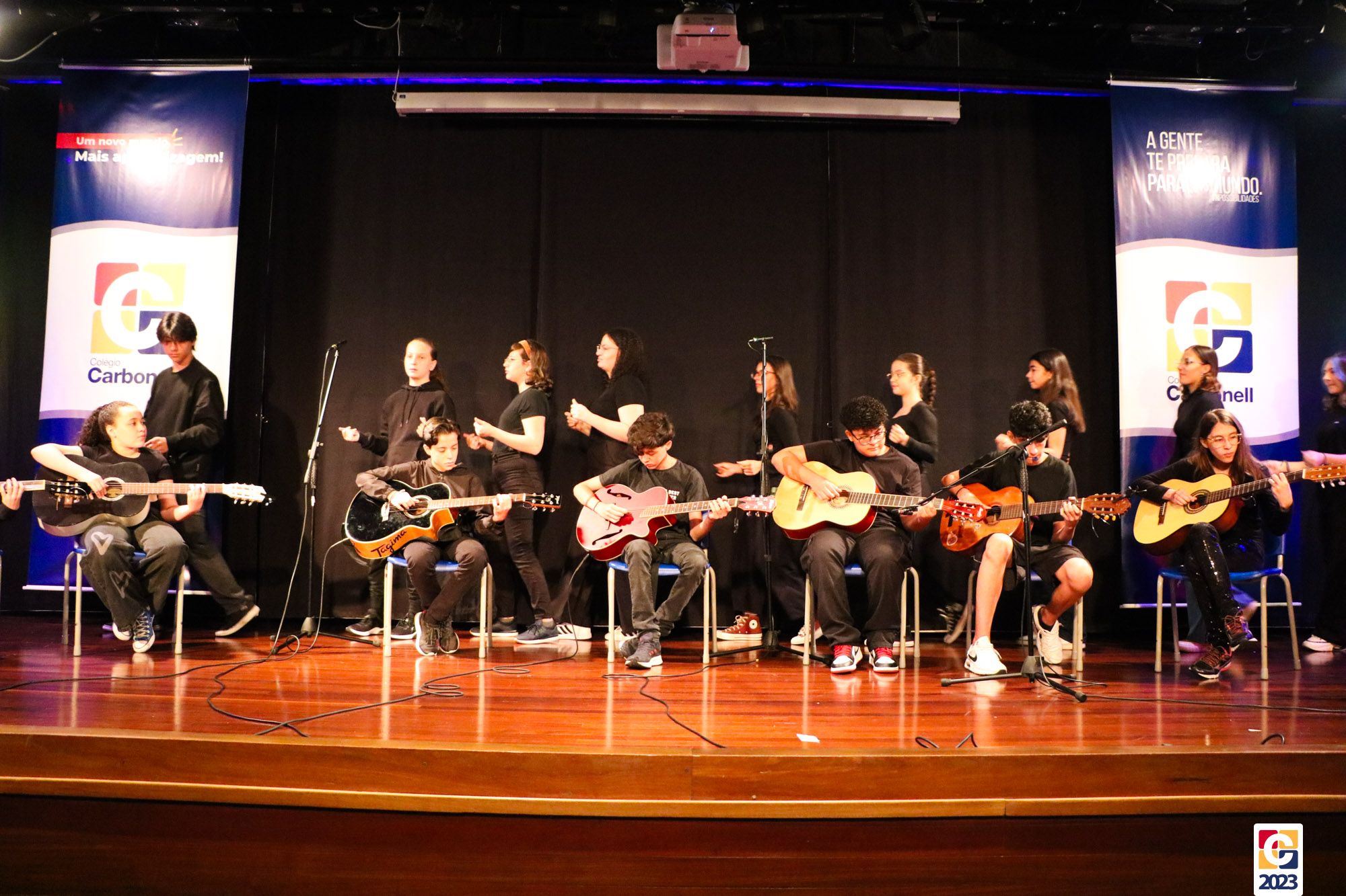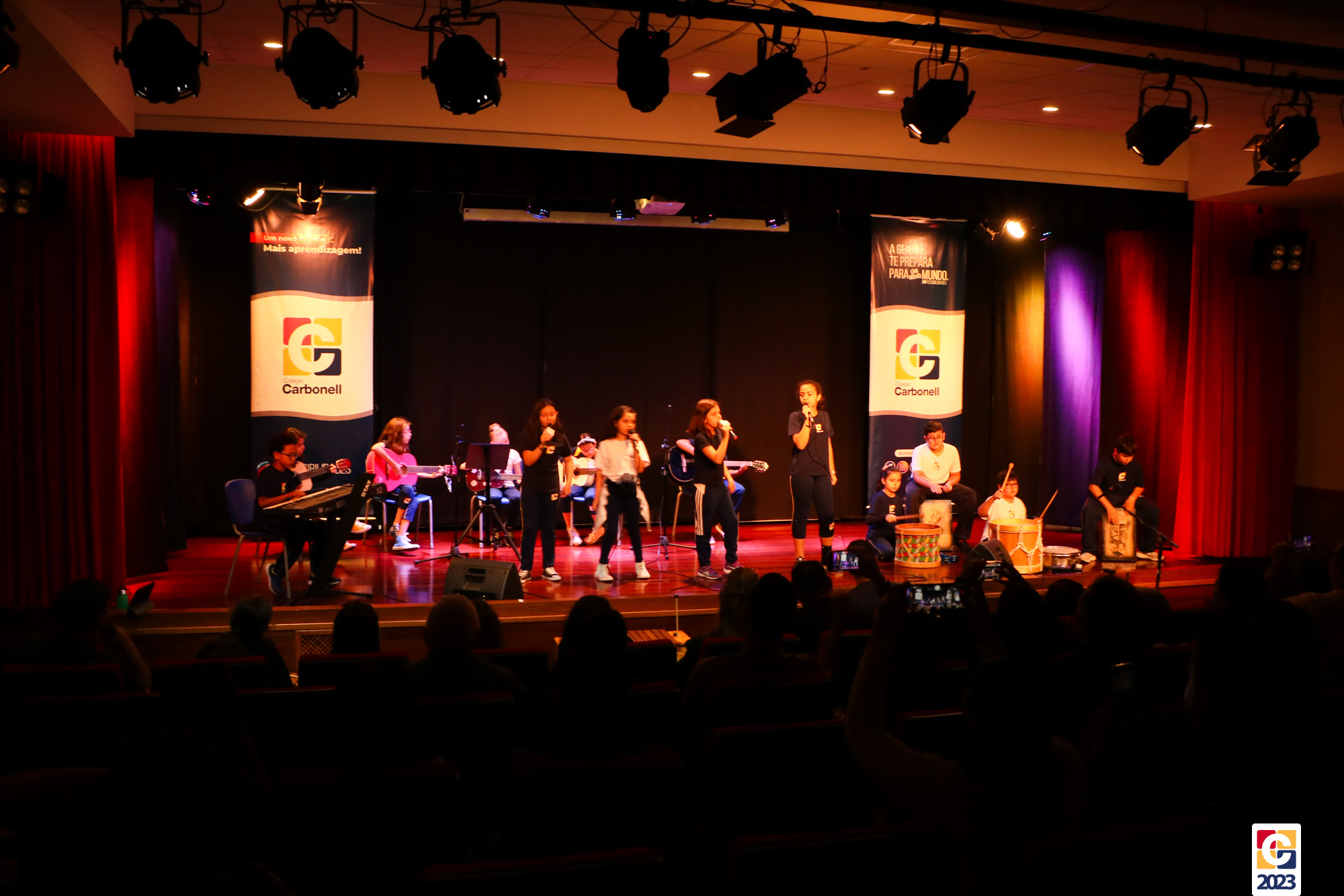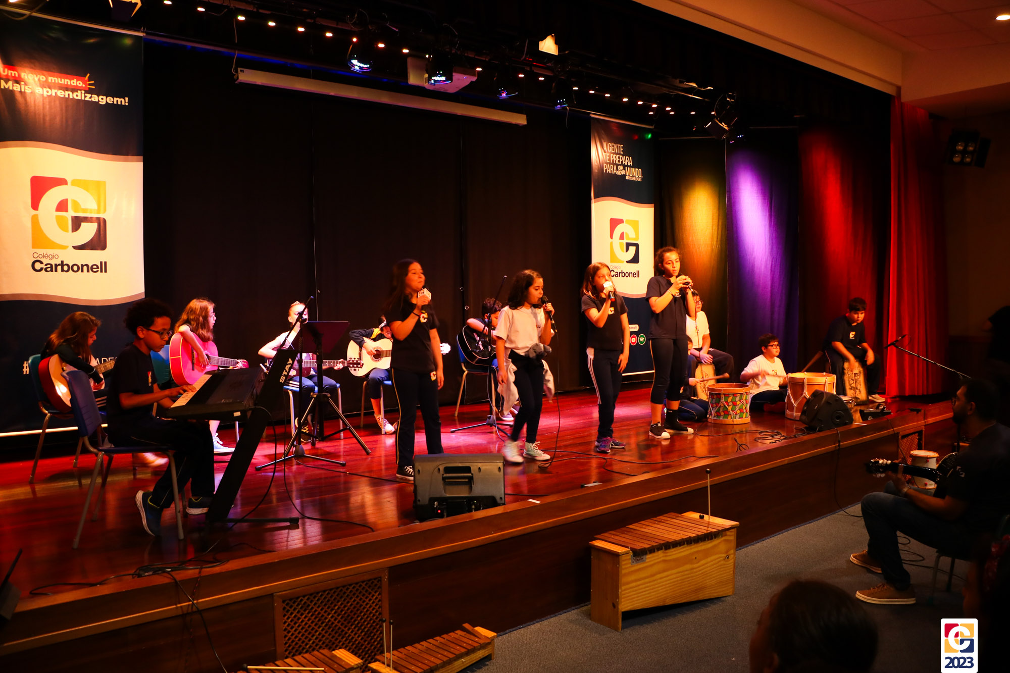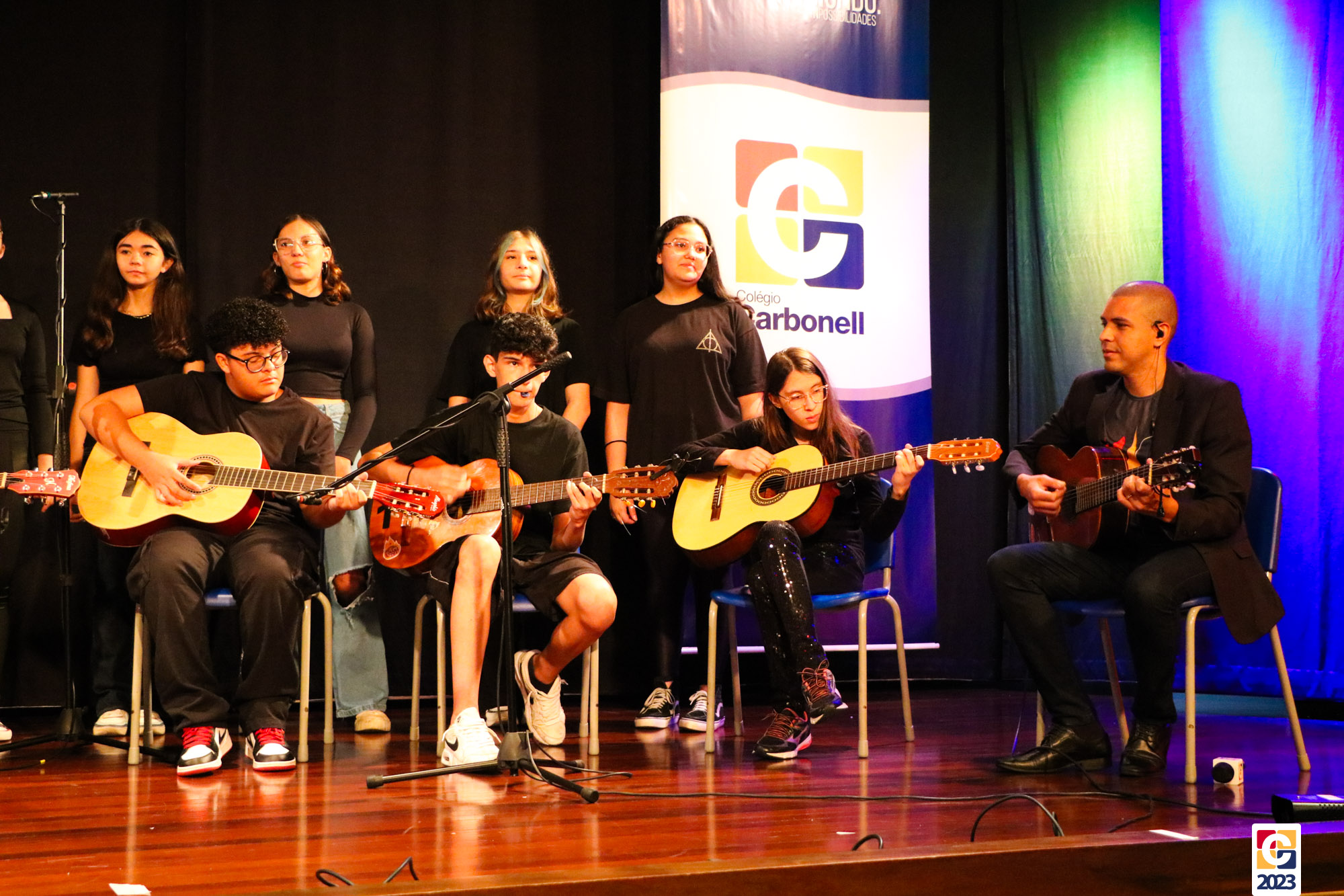 Muita dedicação e ensaios resultaram em apresentações teatrais, de música e de dança, duetos vocais e de violão, uma colorida exposição que decorou todo o colégio e até algumas sessões especiais com as famílias! Foram meses de preparo nos clubes de violão, dança, música (CarboMusic) e coral. 👩🏽‍🎤