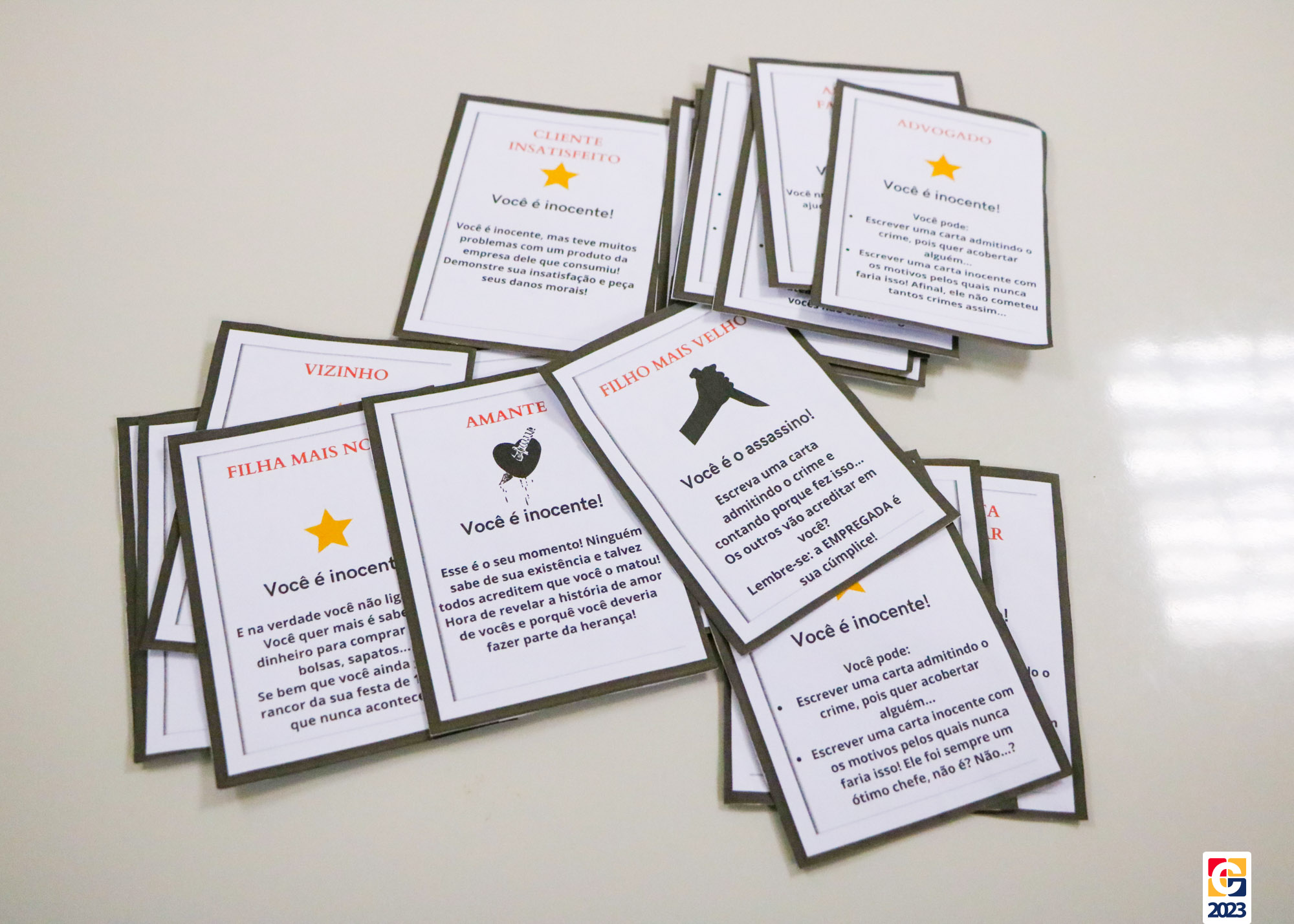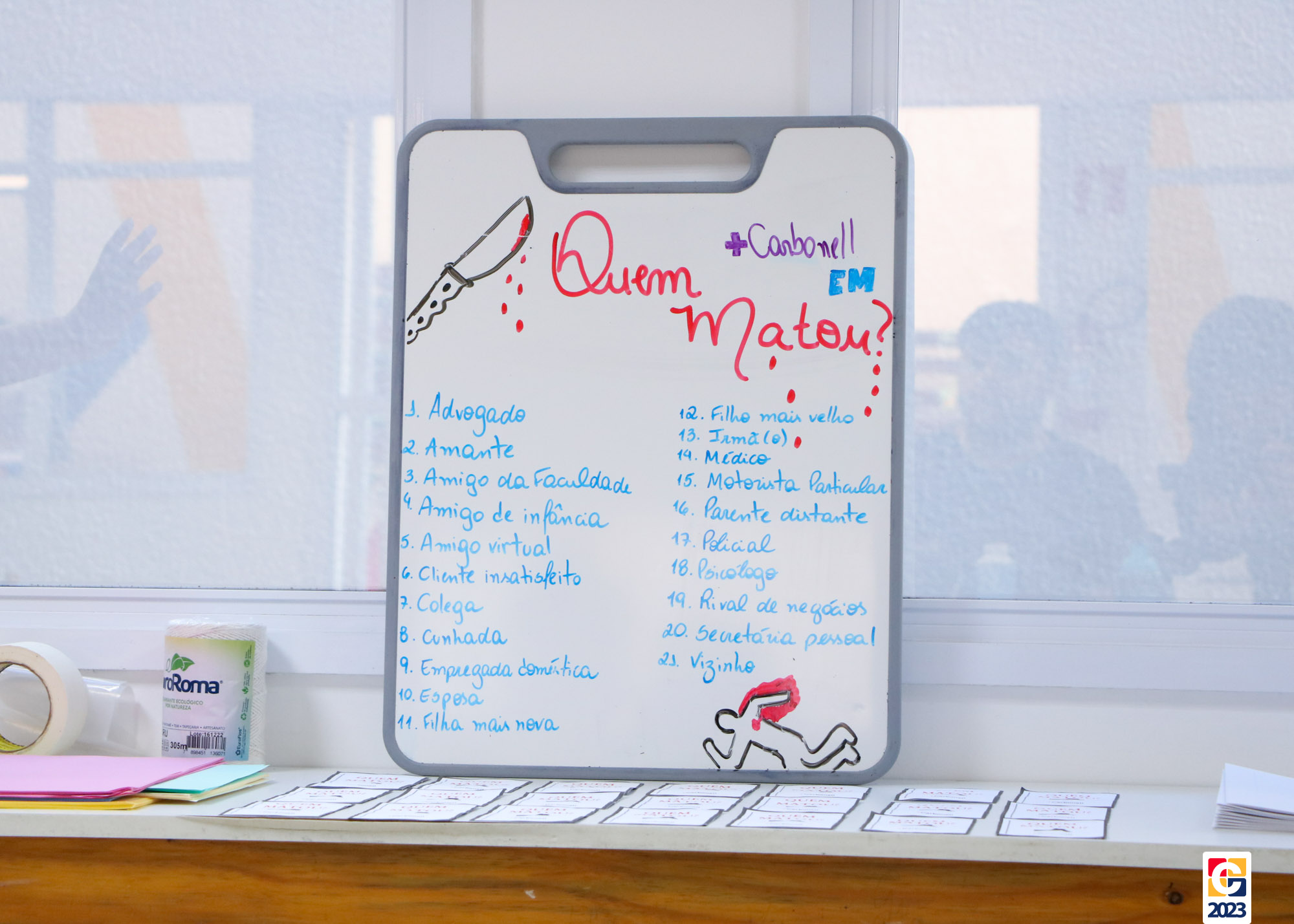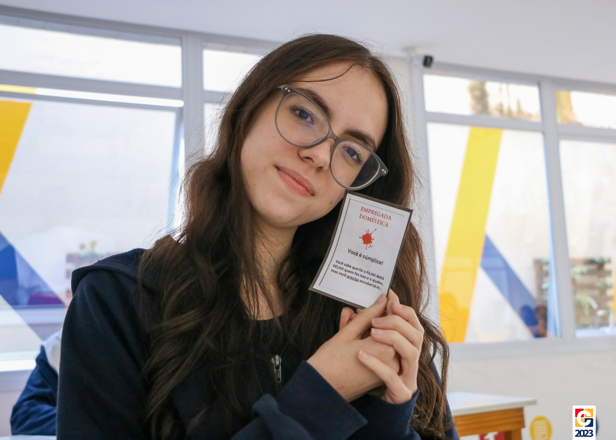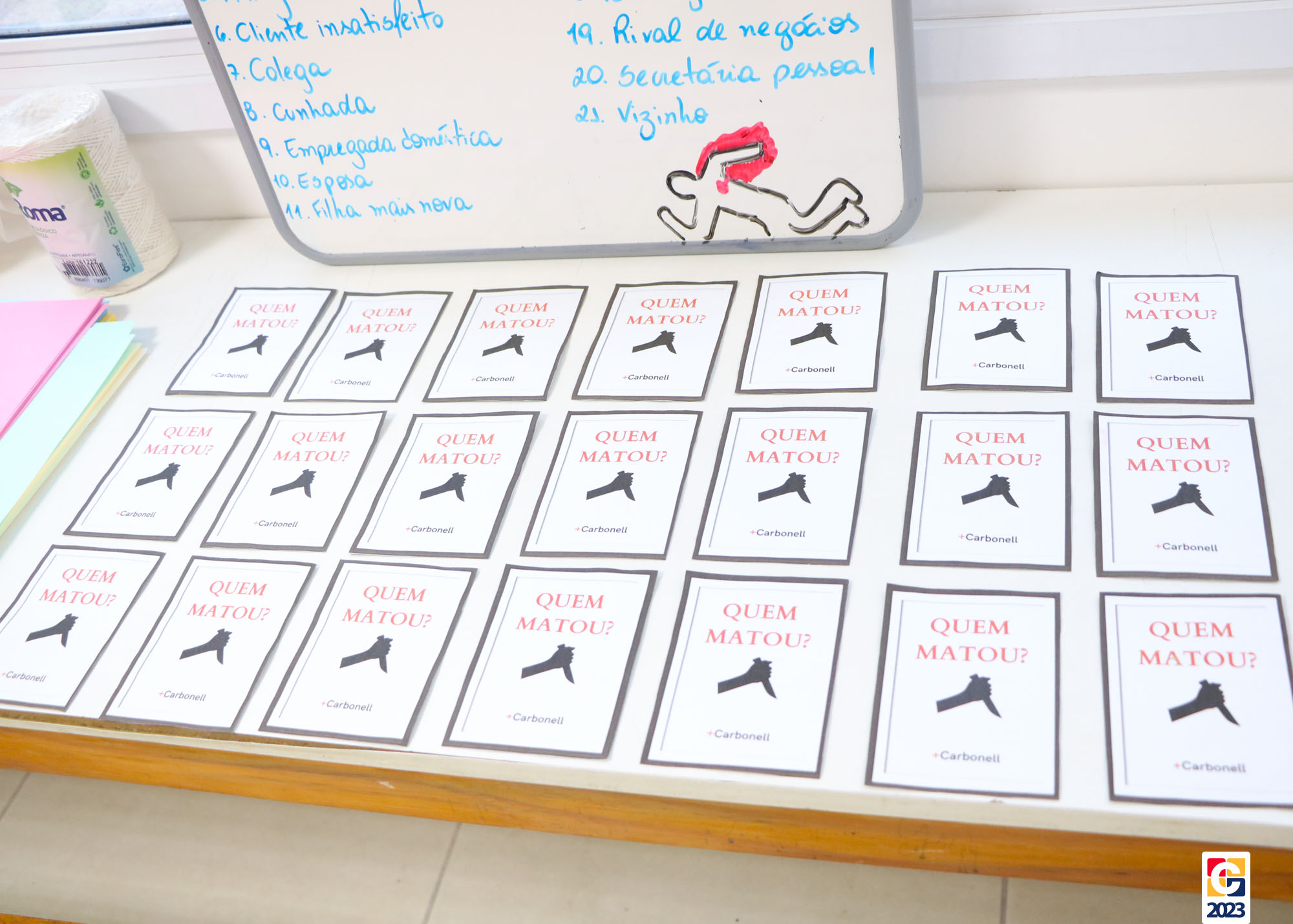No cenário do assassinato de um empresário milionário de Guarulhos, nossos estudantes receberam um cartão, cada um contendo um personagem importante para a história do caso. A tarefa era escrever uma carta aprimorando o personagem para defendê-lo ou mesmo entregar outro personagem como acusado. Ao fim, as cartas foram lidas por todos a fim de solucionar o caso. 🧐