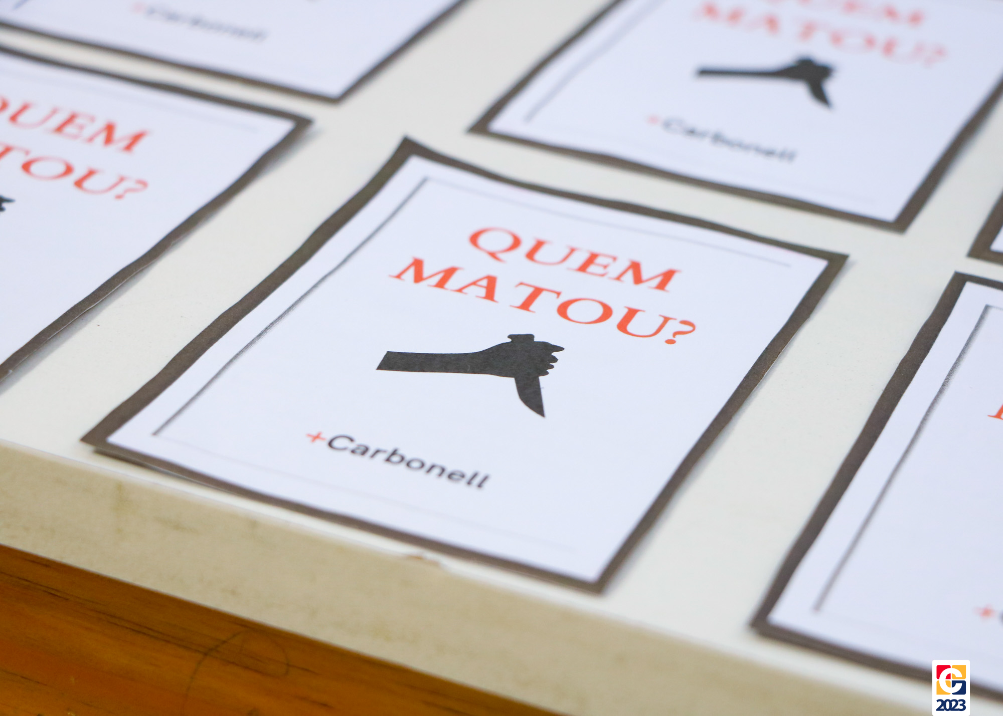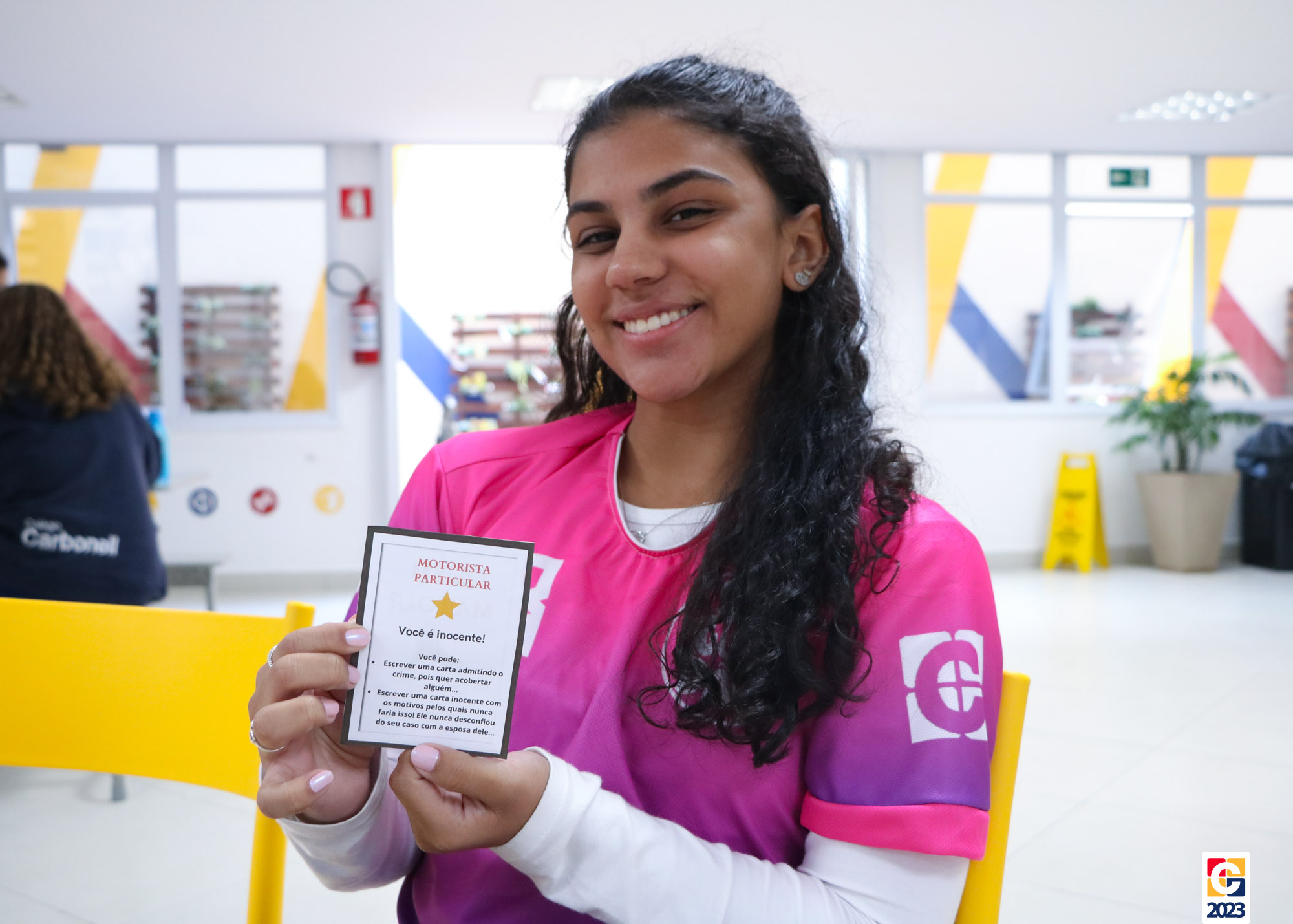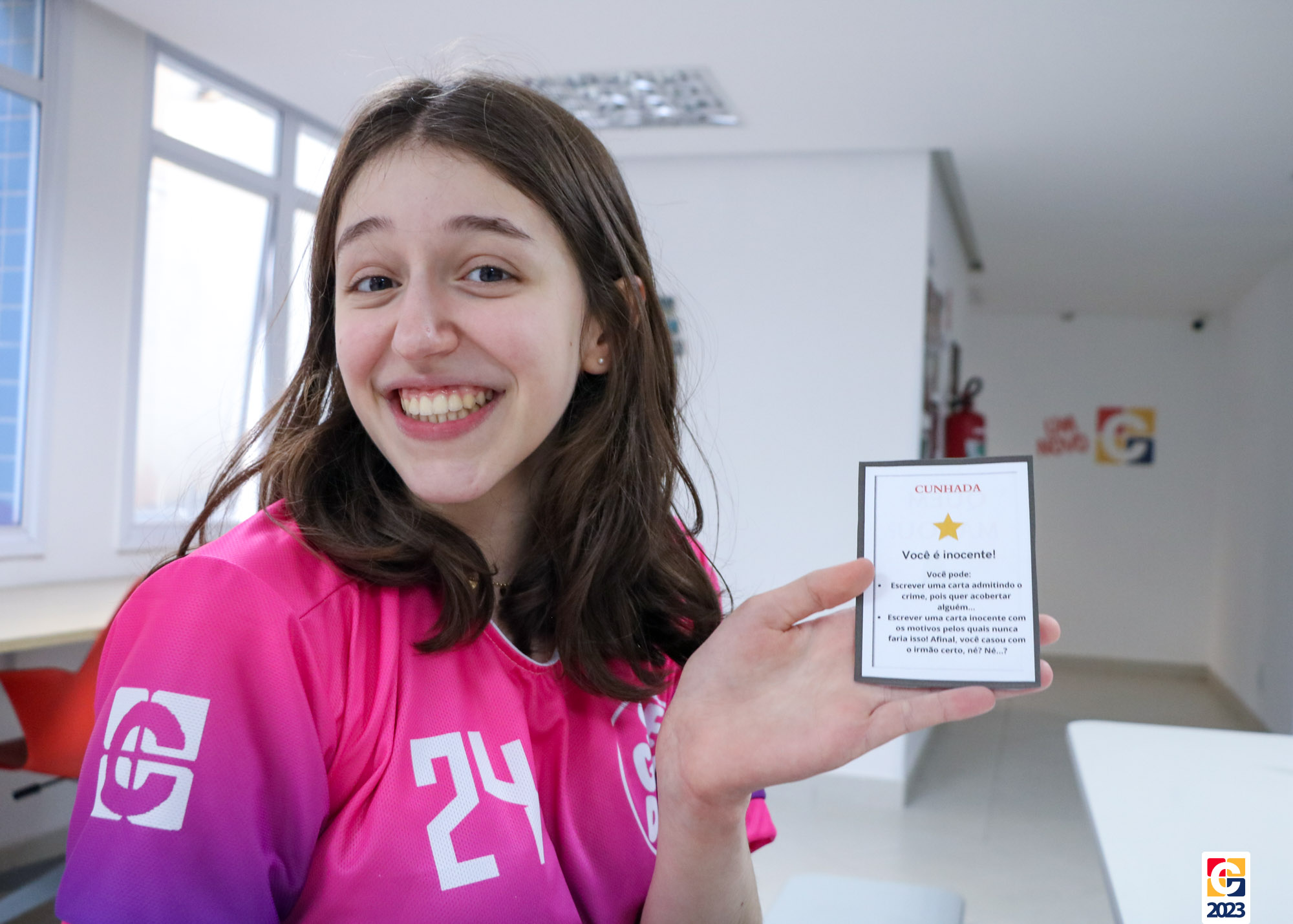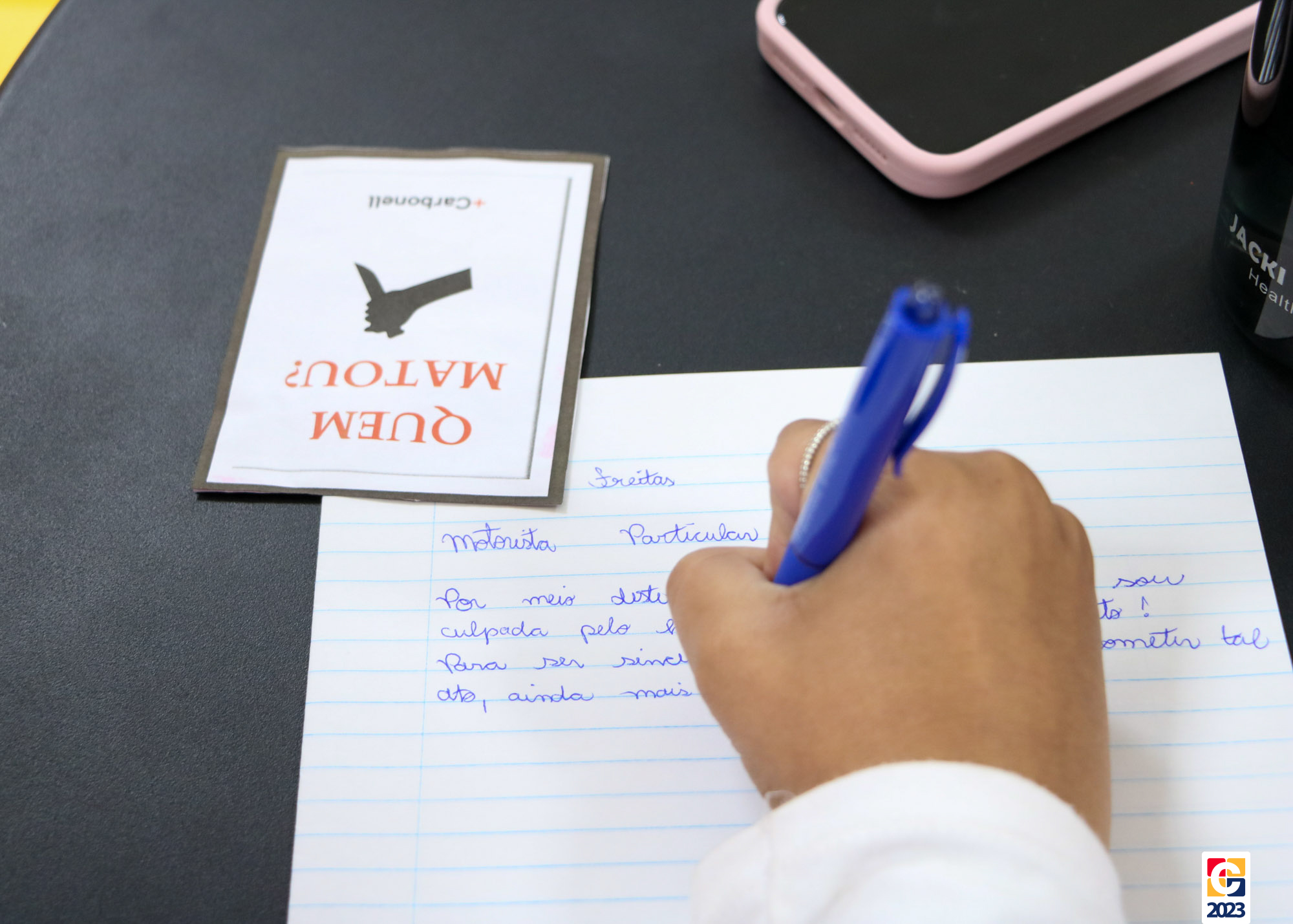No cenário do assassinato de um empresário milionário de Guarulhos, nossos estudantes receberam um cartão, cada um contendo um personagem importante para a história do caso. A tarefa era escrever uma carta aprimorando o personagem para defendê-lo ou mesmo entregar outro personagem como acusado. Ao fim, as cartas foram lidas por todos a fim de solucionar o caso. 🧐