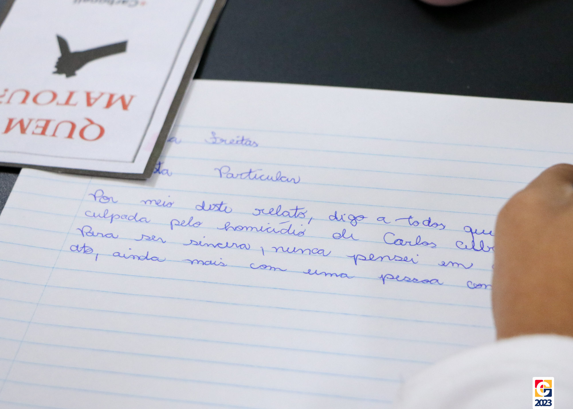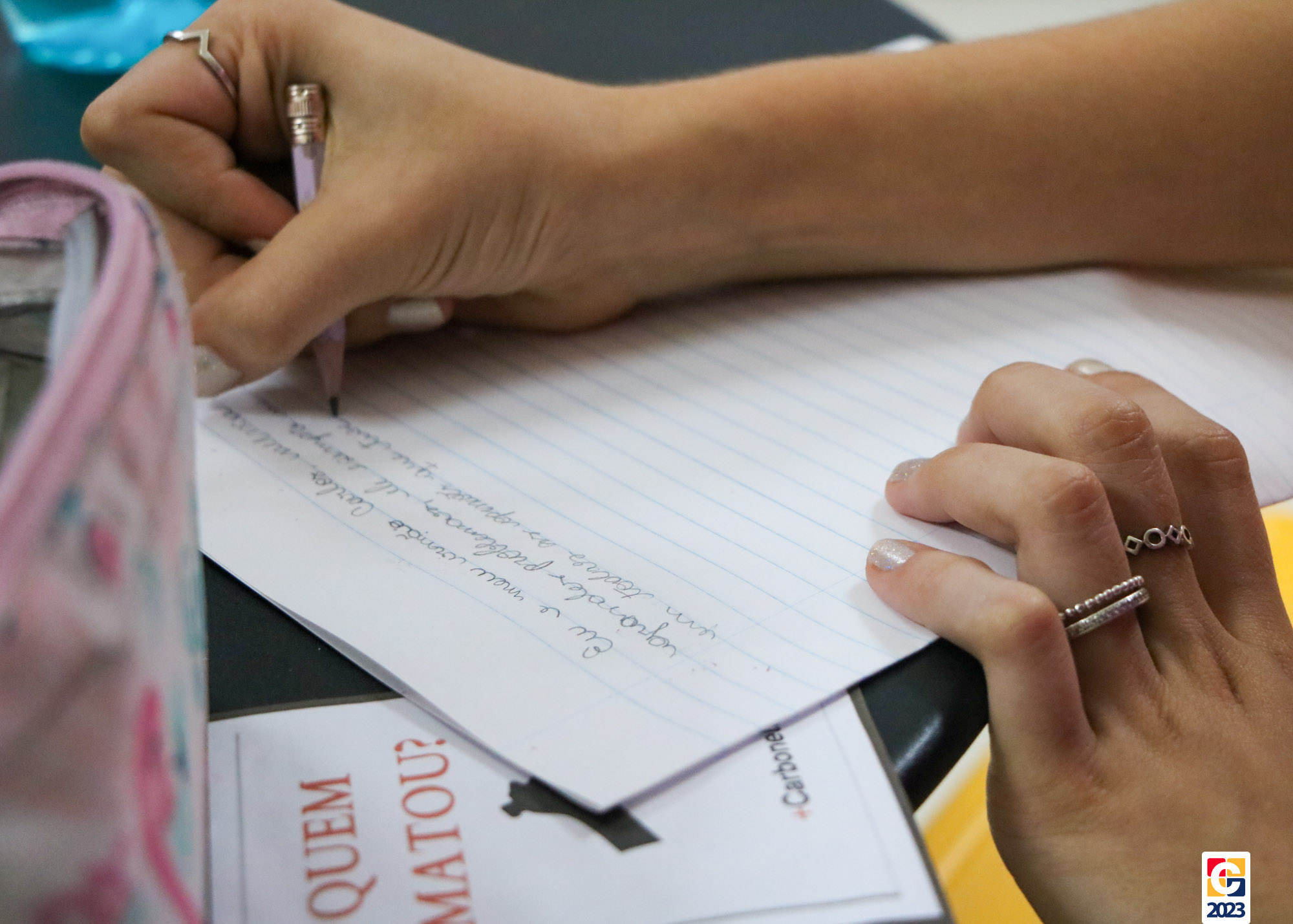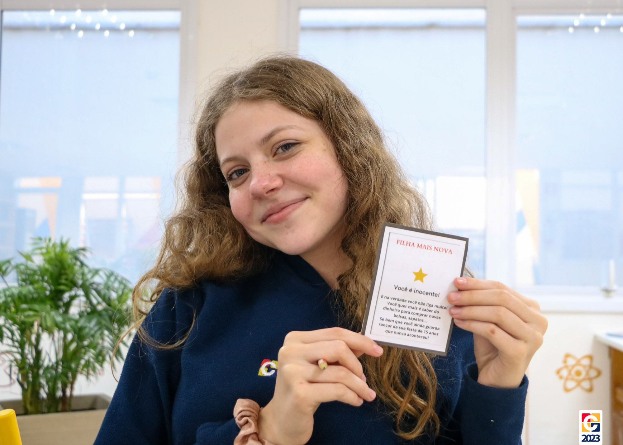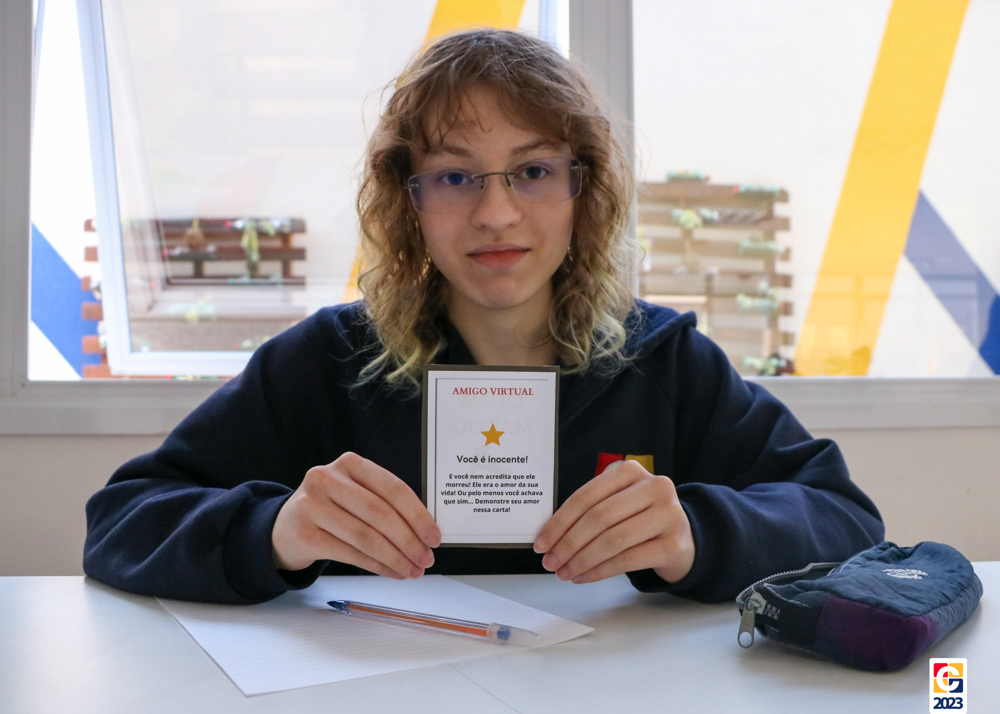 No cenário do assassinato de um empresário milionário de Guarulhos, nossos estudantes receberam um cartão, cada um contendo um personagem importante para a história do caso. A tarefa era escrever uma carta aprimorando o personagem para defendê-lo ou mesmo entregar outro personagem como acusado. Ao fim, as cartas foram lidas por todos a fim de solucionar o caso. 🧐