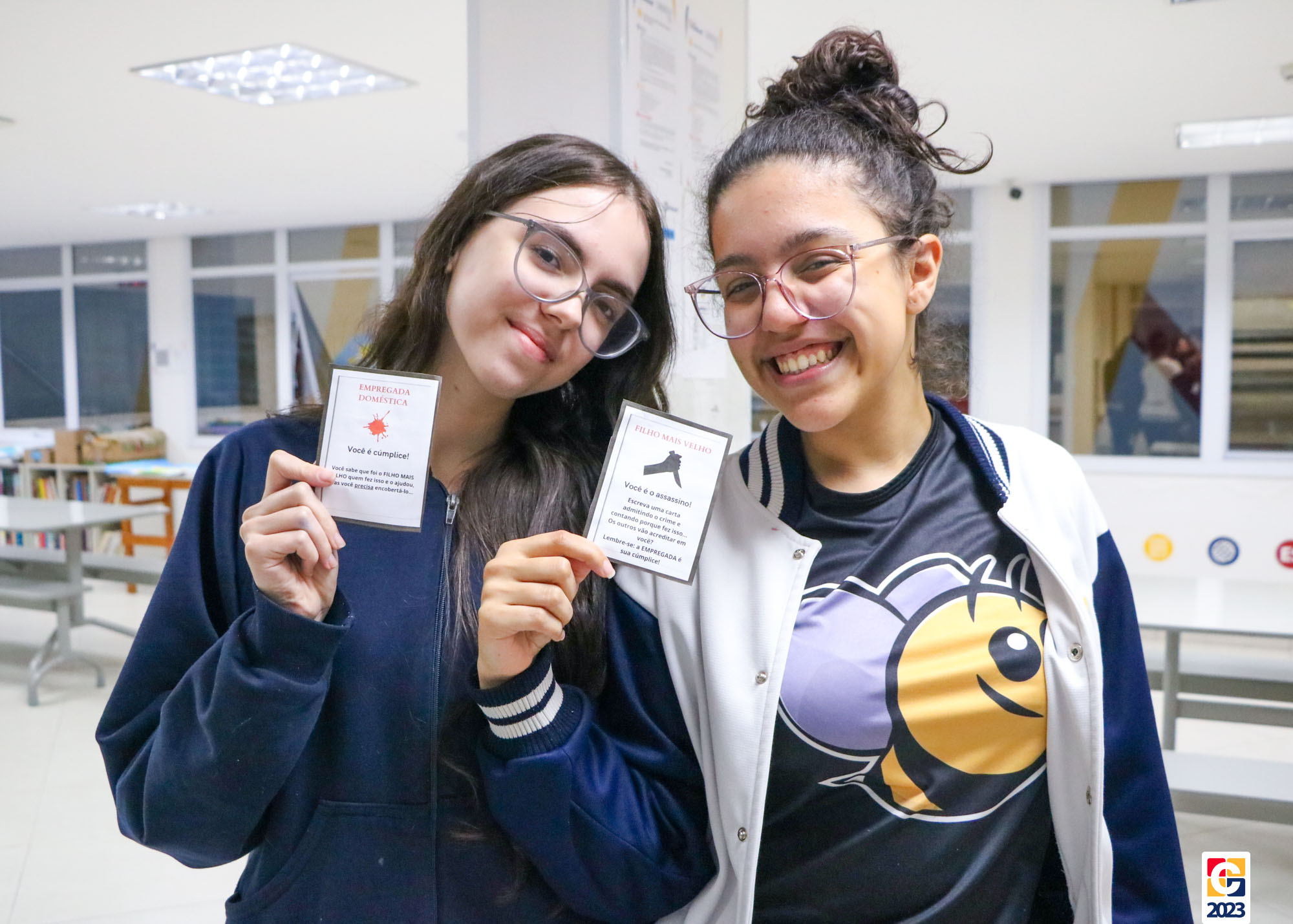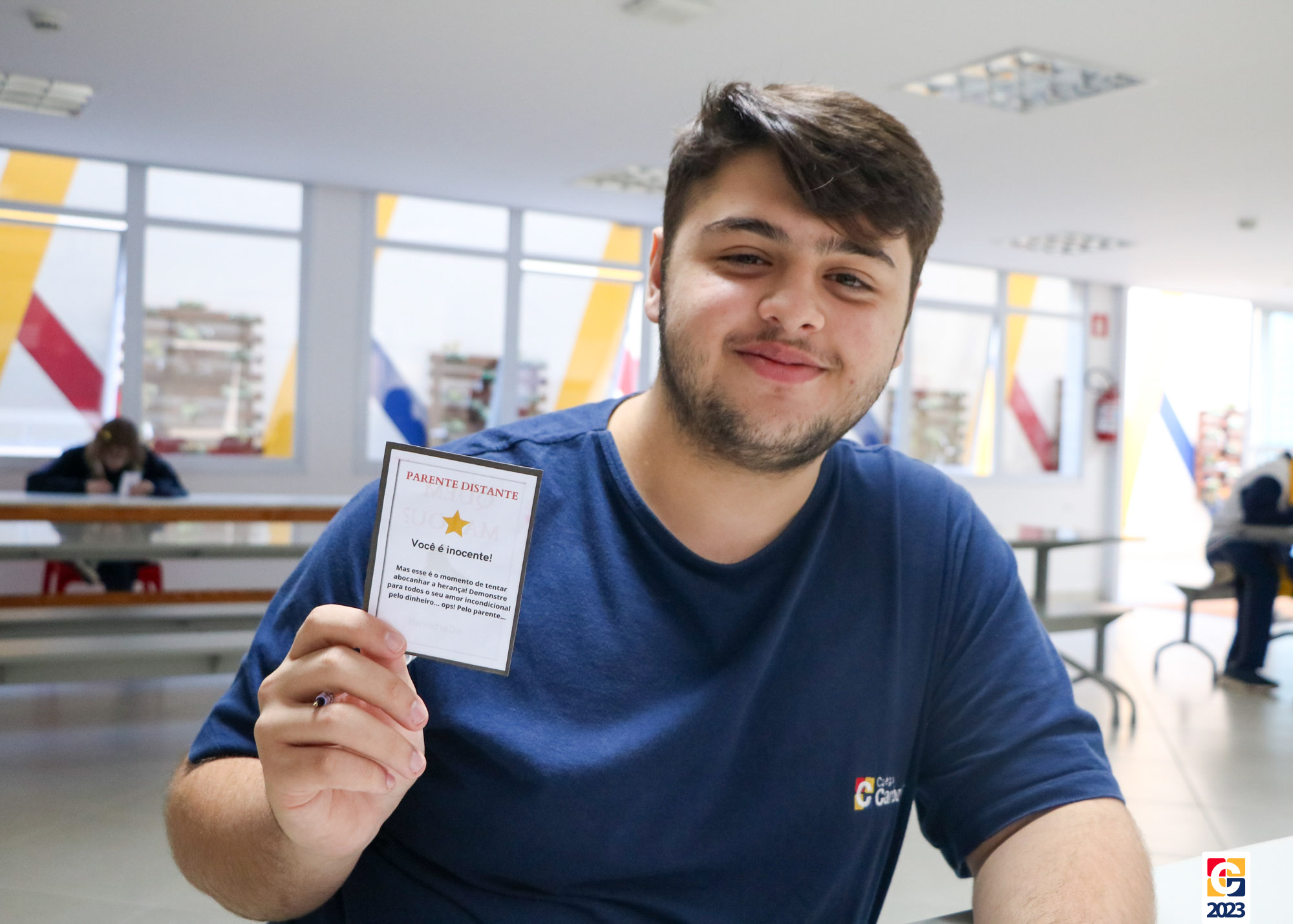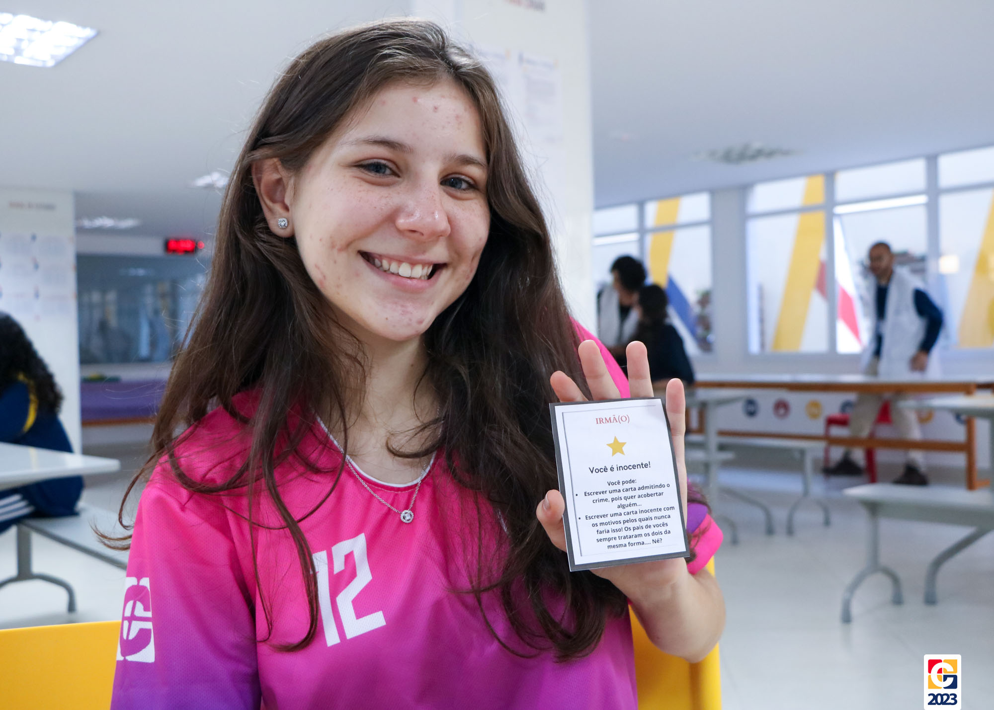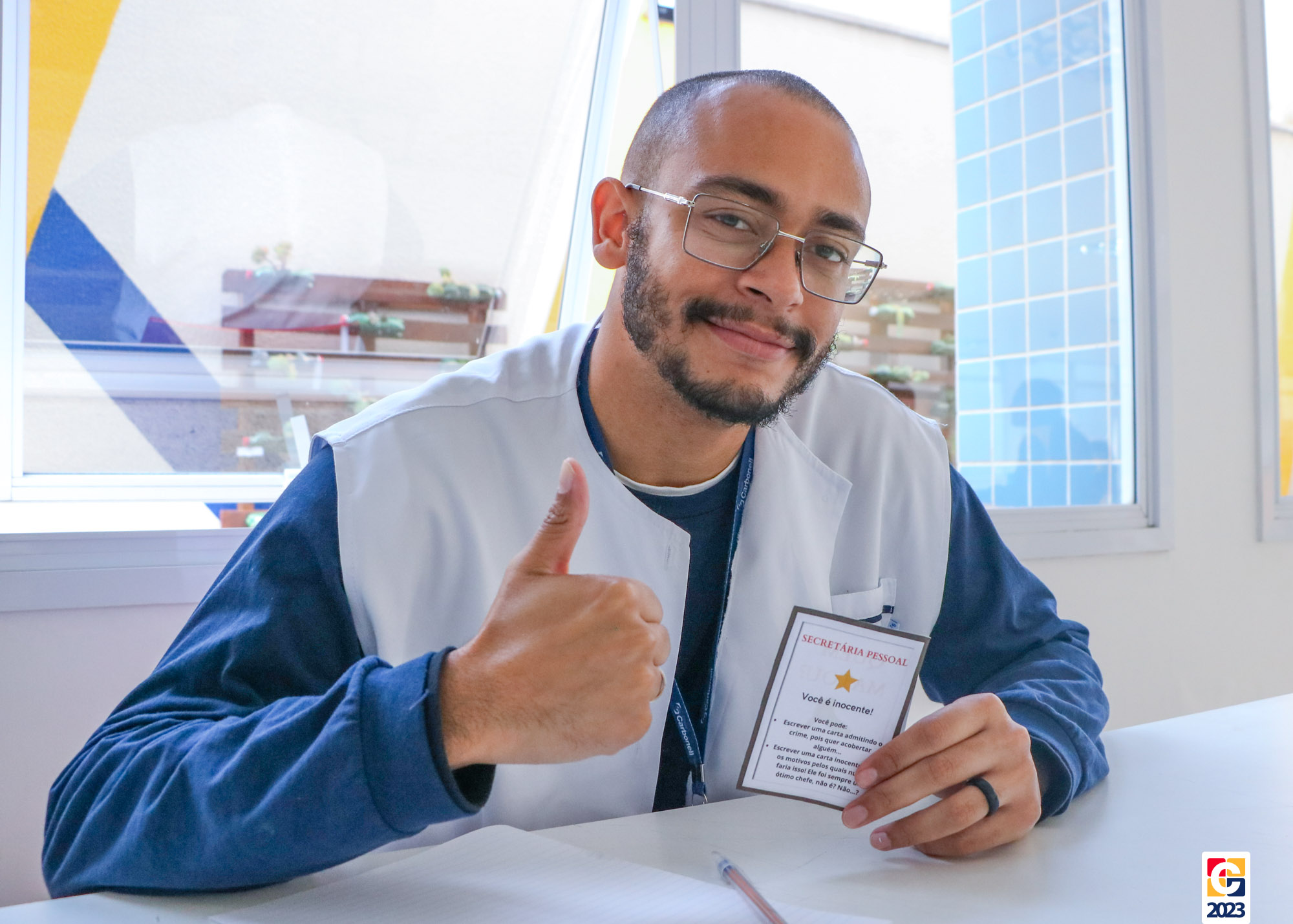 No cenário do assassinato de um empresário milionário de Guarulhos, nossos estudantes receberam um cartão, cada um contendo um personagem importante para a história do caso. A tarefa era escrever uma carta aprimorando o personagem para defendê-lo ou mesmo entregar outro personagem como acusado. Ao fim, as cartas foram lidas por todos a fim de solucionar o caso. 🧐