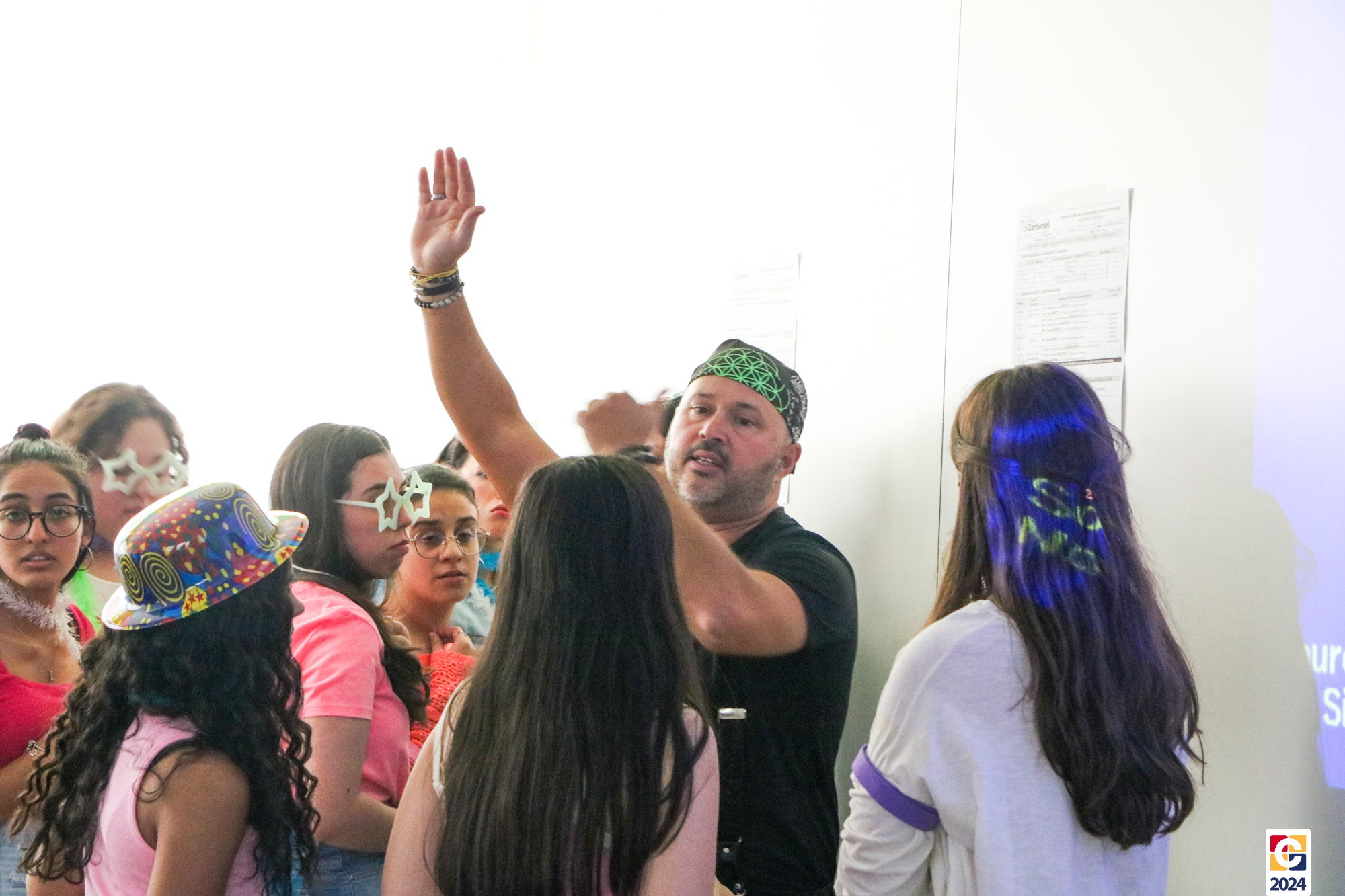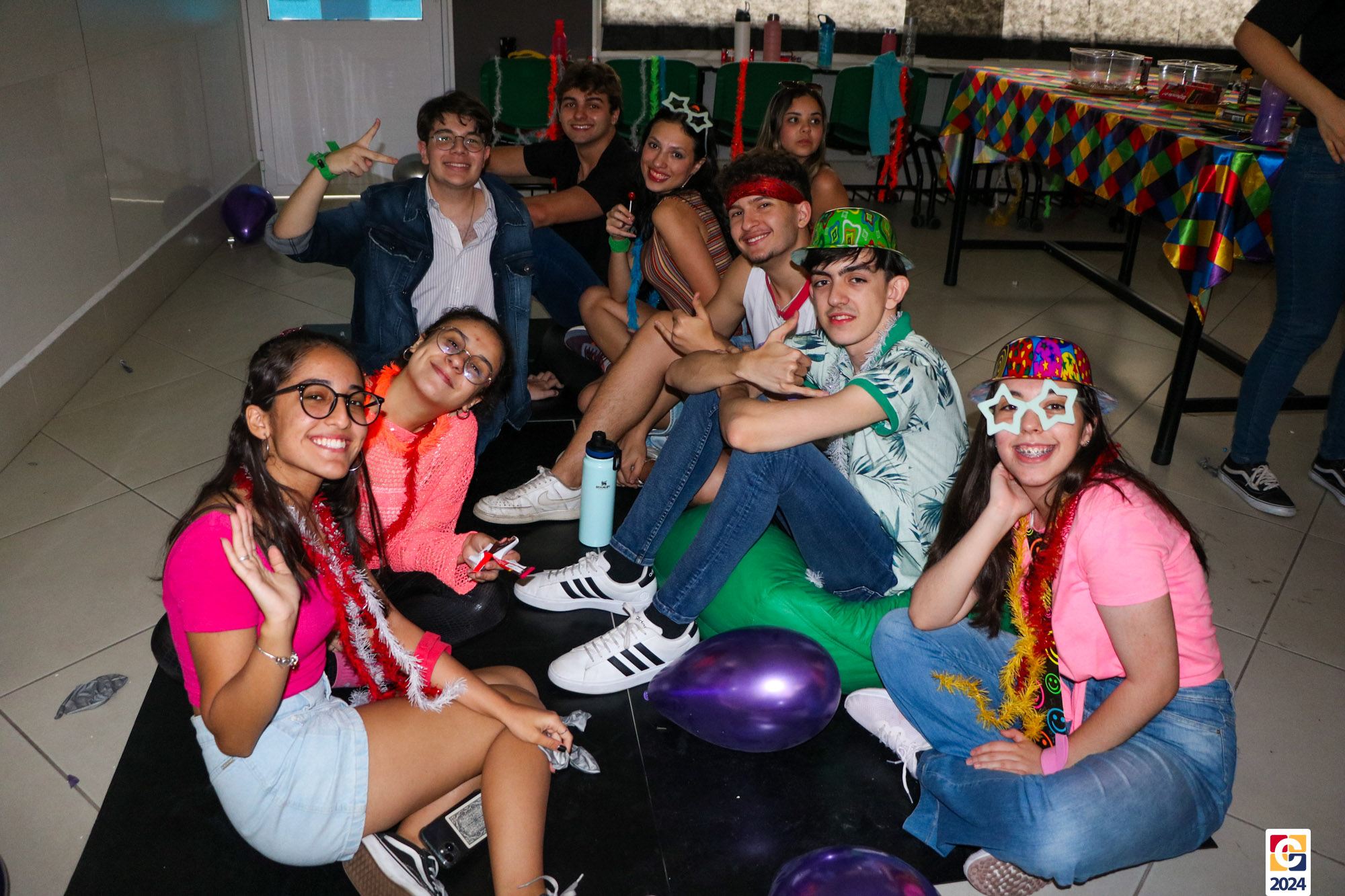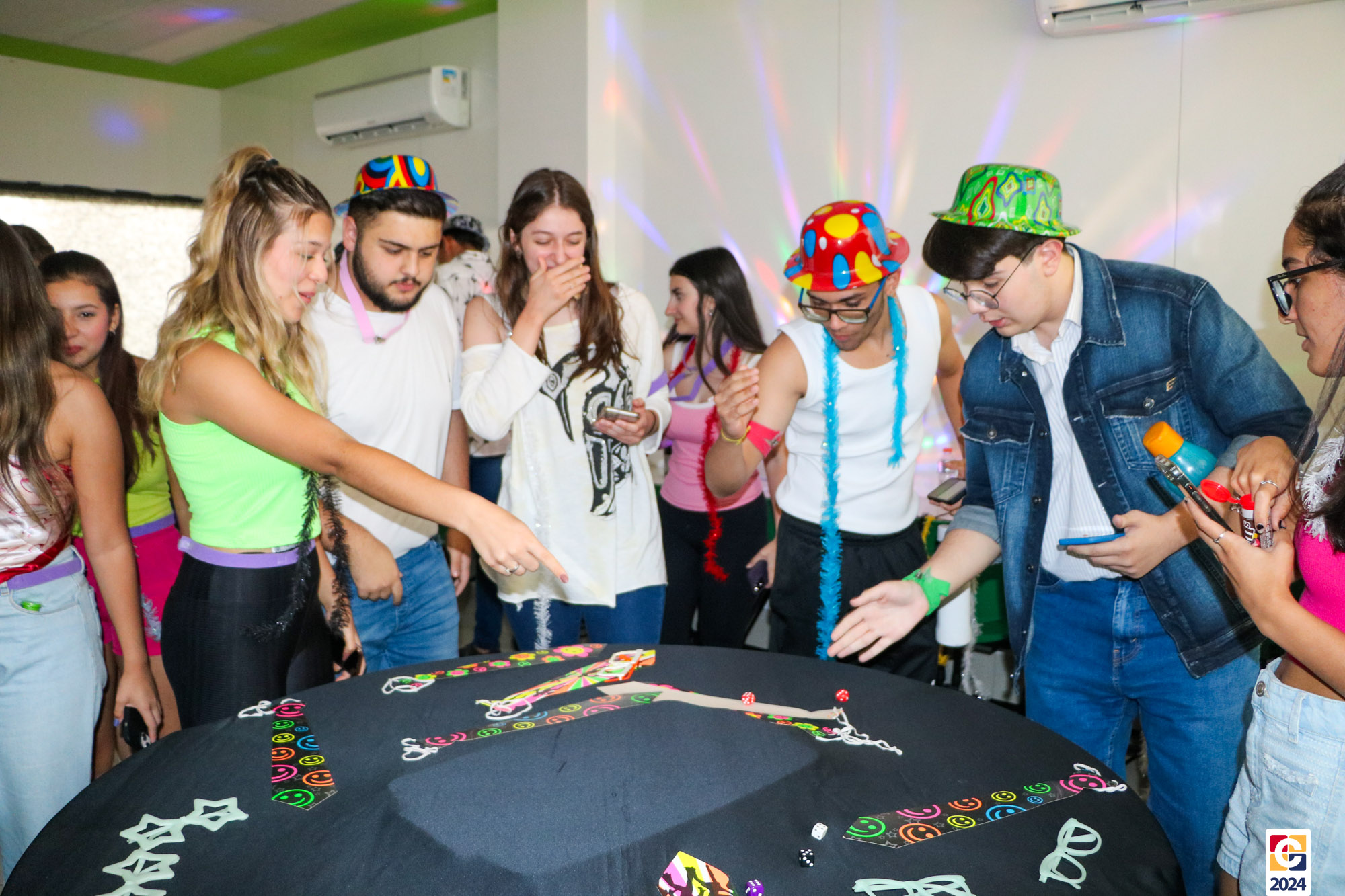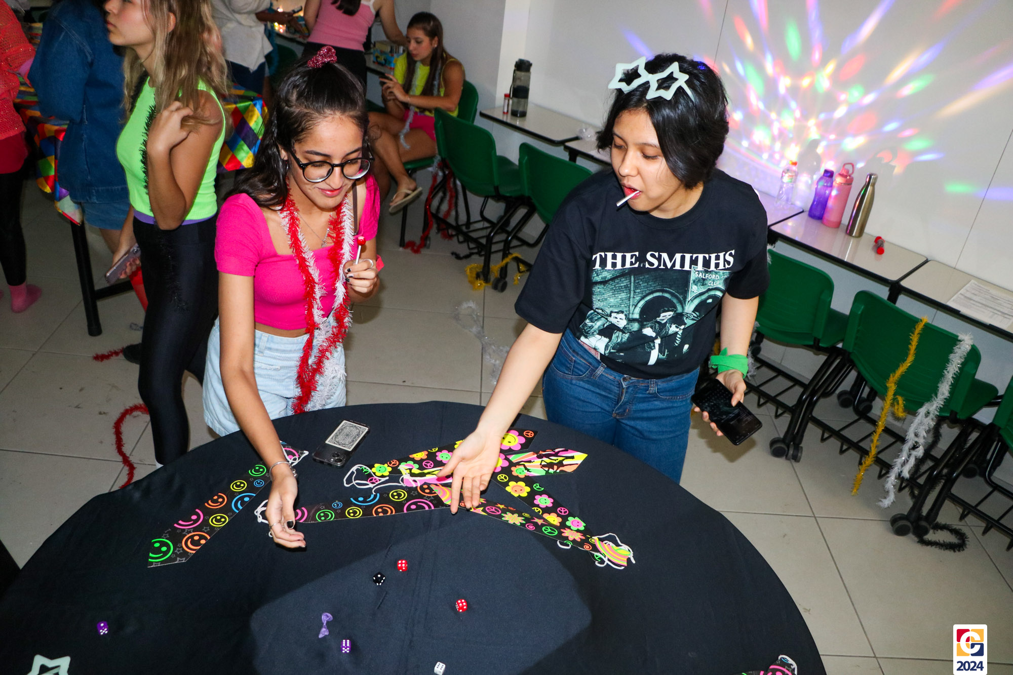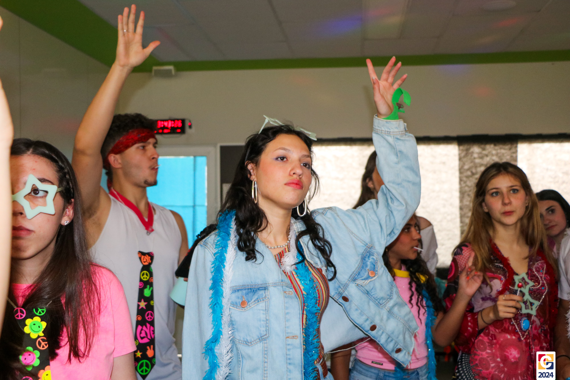 Uma projeção com videoclipes de bandas e cantores dos anos 80 e 90 que, juntamente com os tapetes e almofadas espalhados por todo o ambiente, compõem um cenário que traria saudosas lembranças aos pais desses meninos e meninas que estão prestes a submergir nesse universo. 🌈