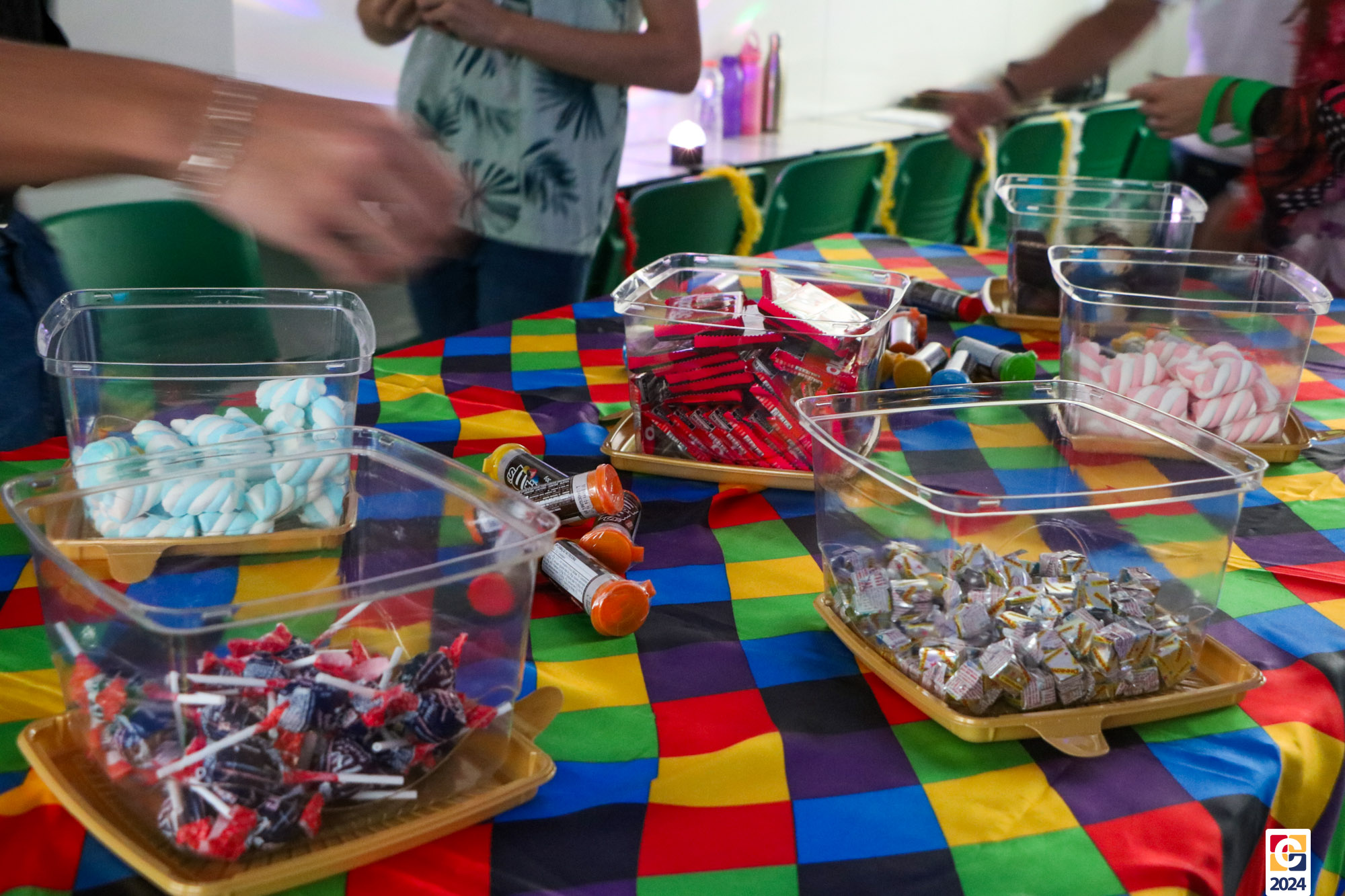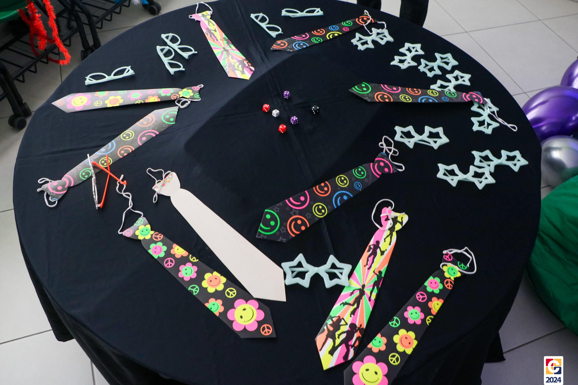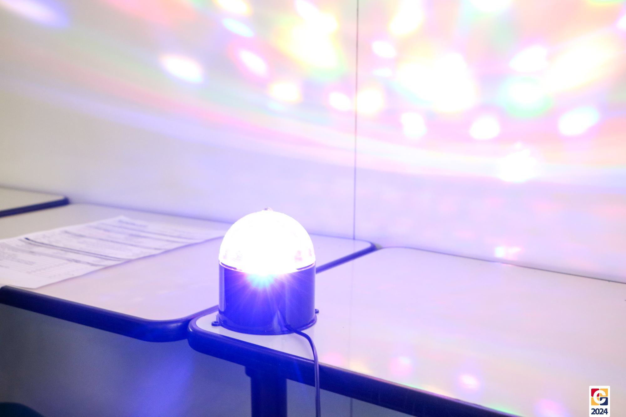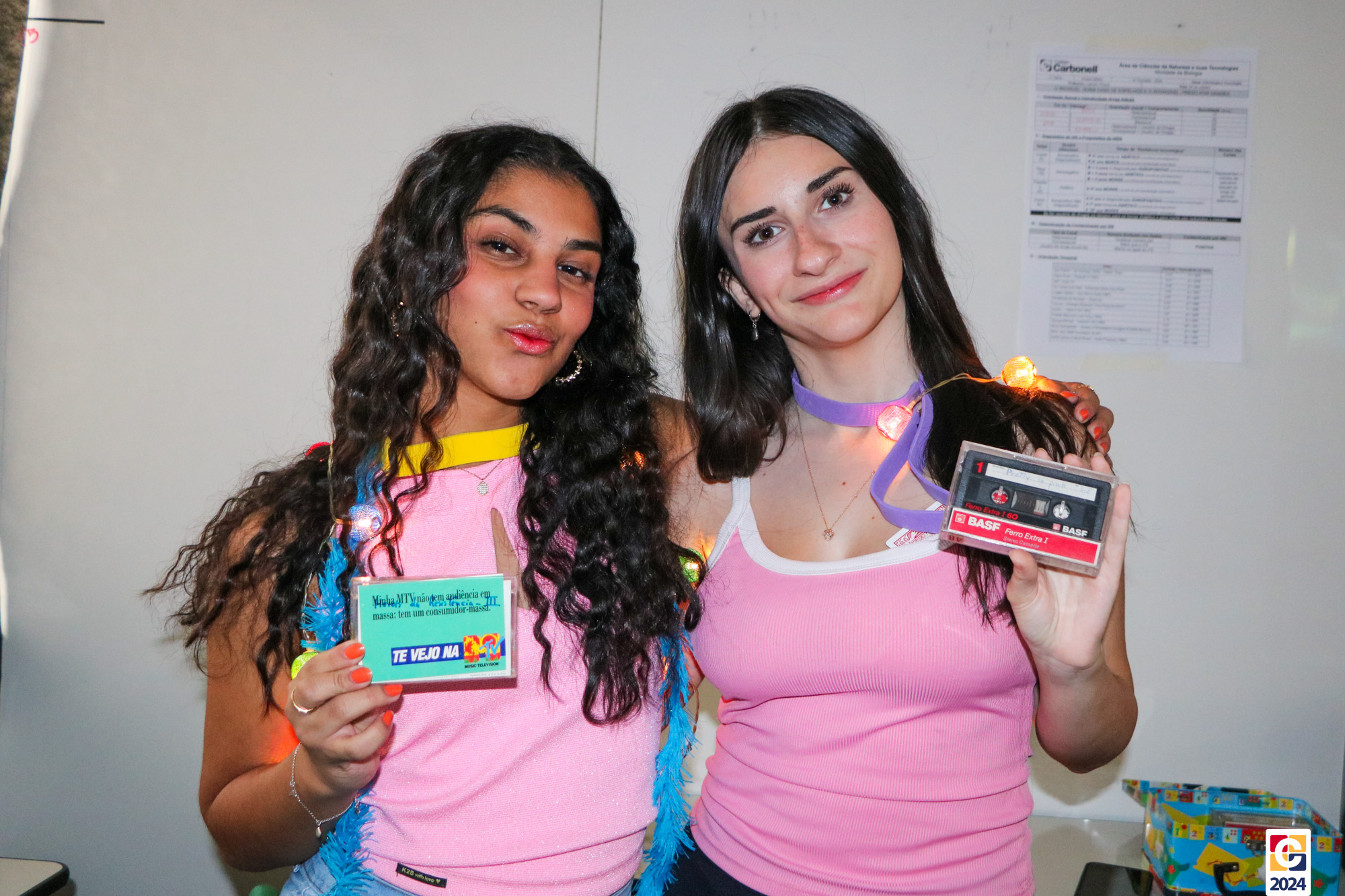 Acompanhando o frisson inicial de preparação, entramos na “sala de aula”. Todo o espaço foi adaptado para recriar o cenário de uma festa/casa dos anos 80 do século XX. Num dos cantos, um aparelho de som “3 em 1”; em outro, uma vitrola com LP’s de cantores, bandas e novelas do mesmo período, além, é claro, das inesquecíveis (para quem é dessa época) fitas cassete gravadas em casa e anotadas à mão. 📼