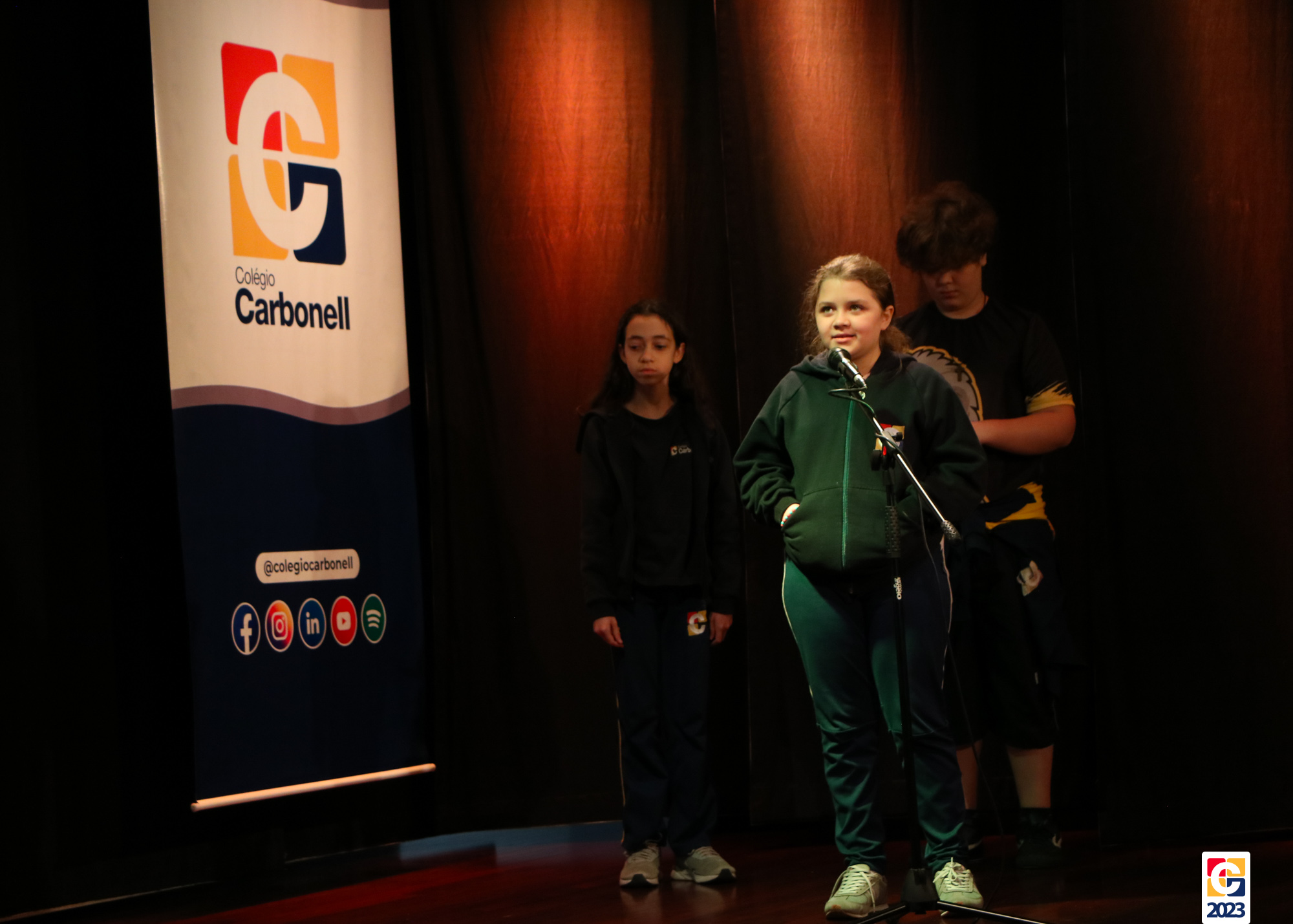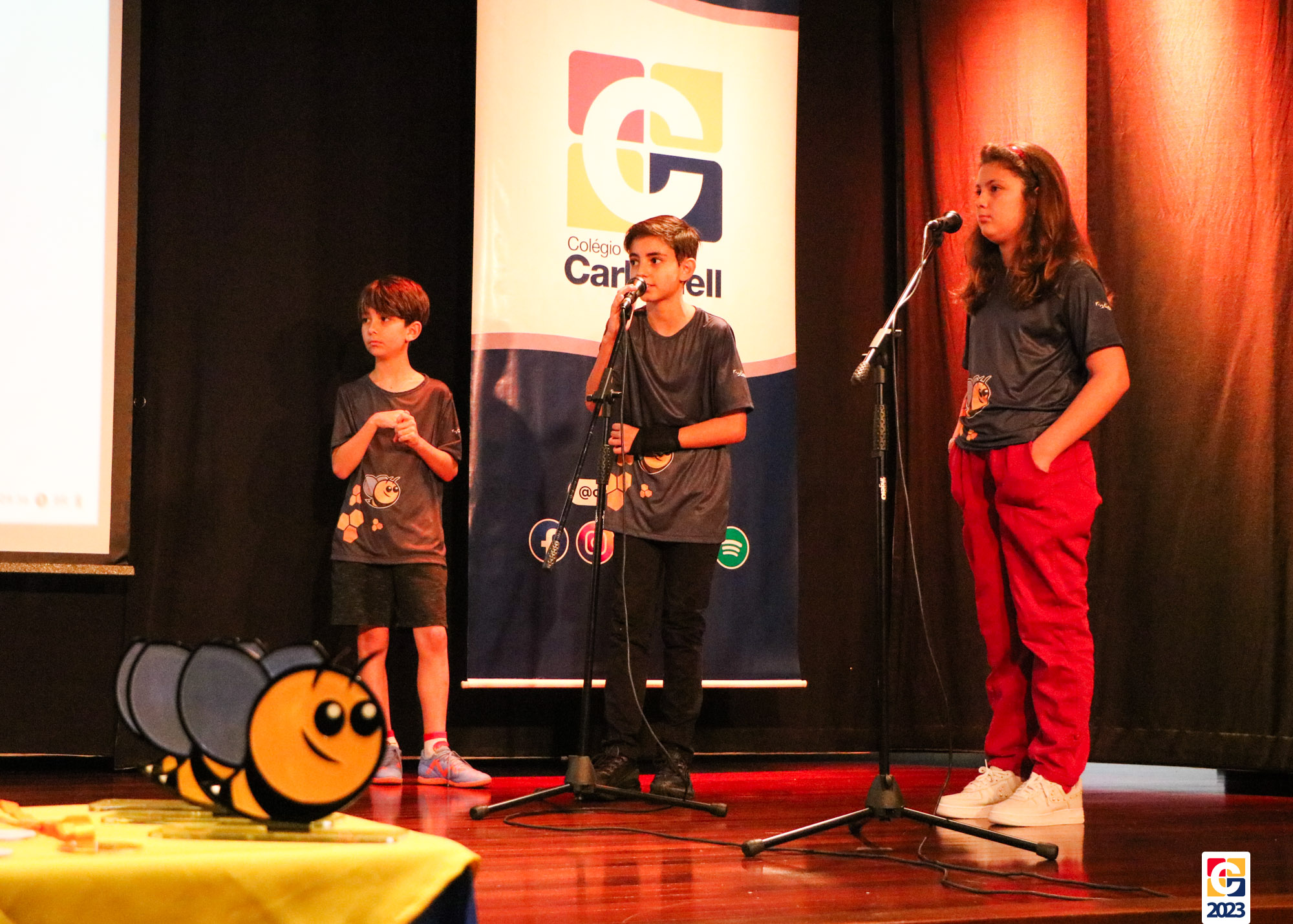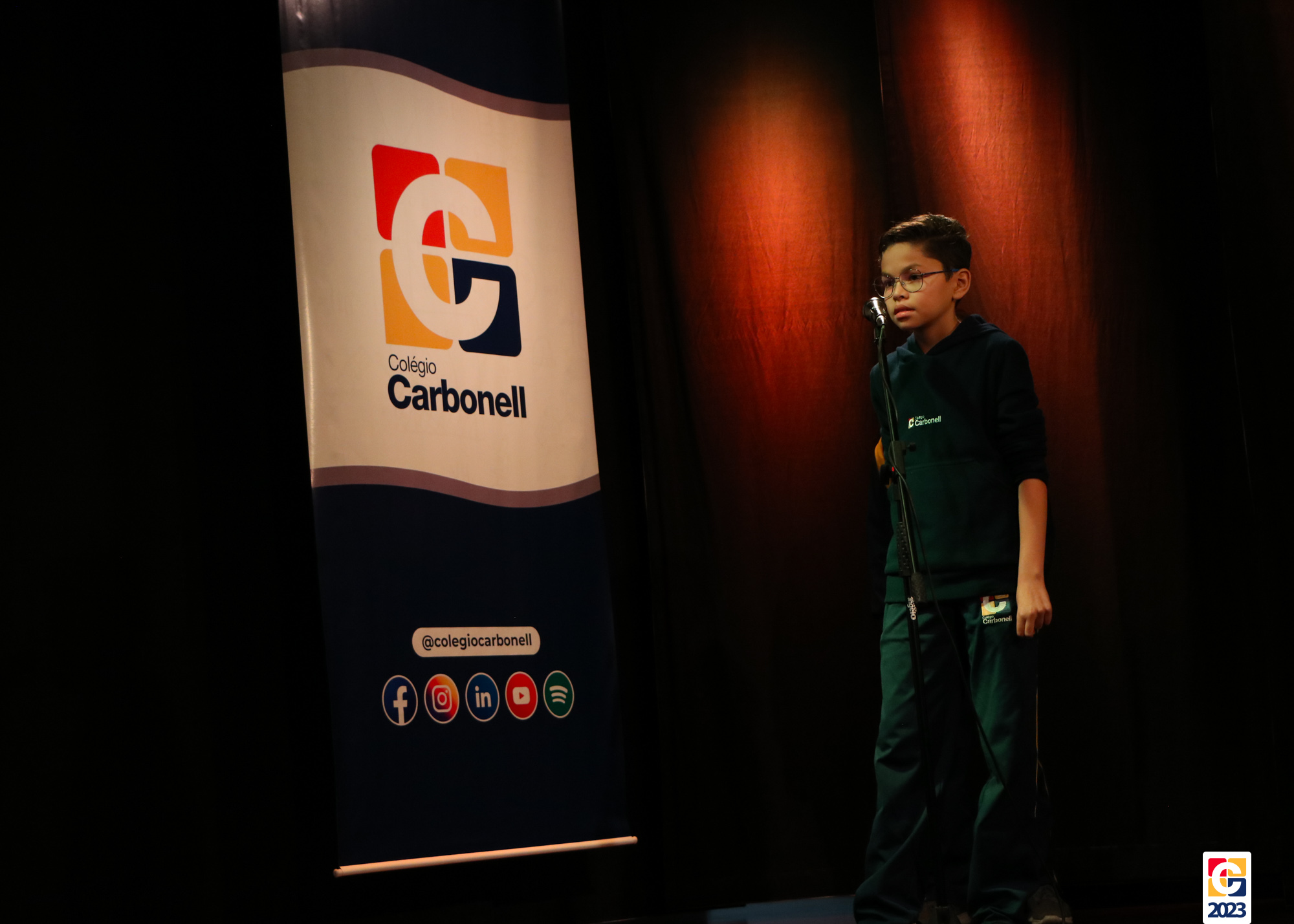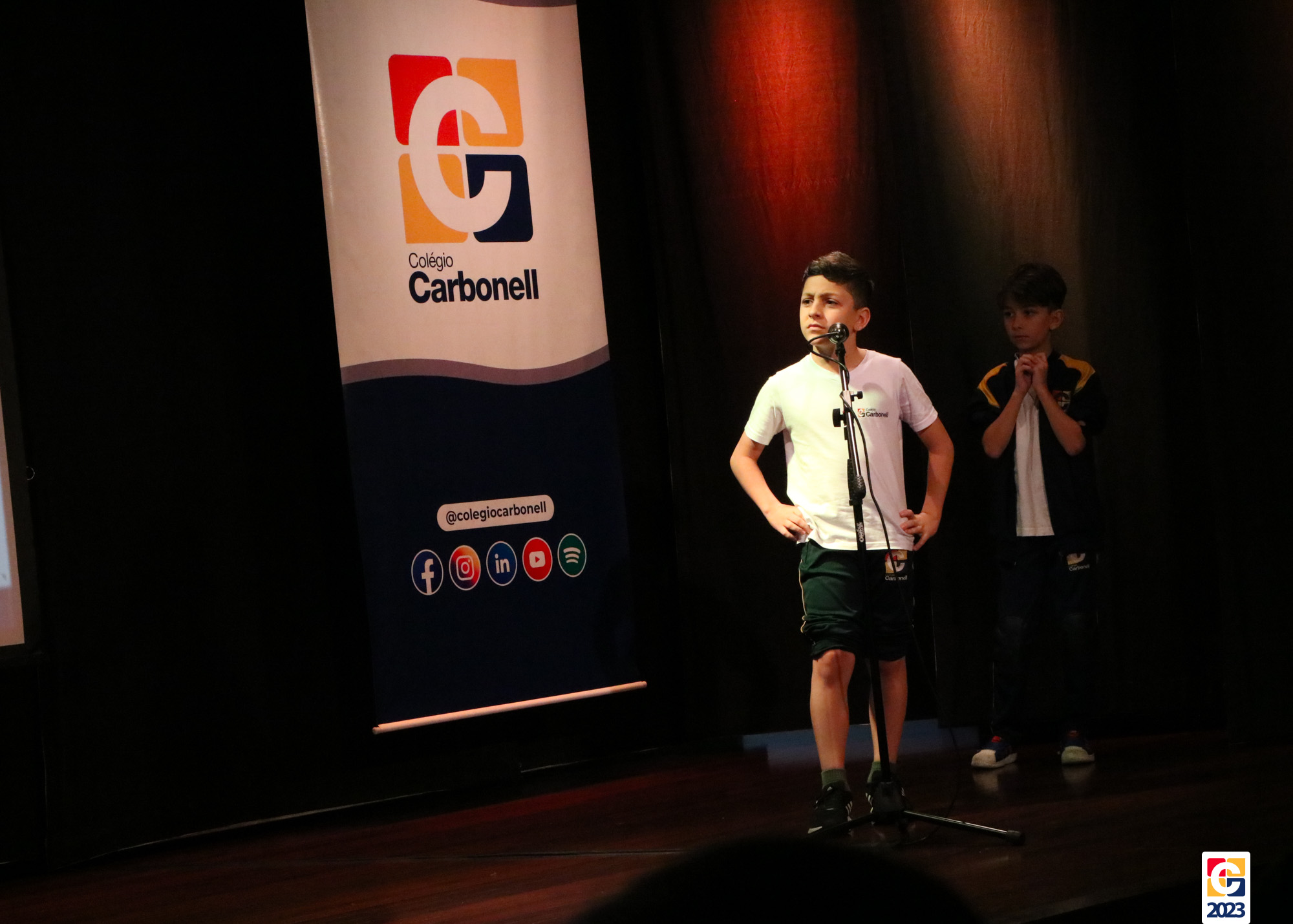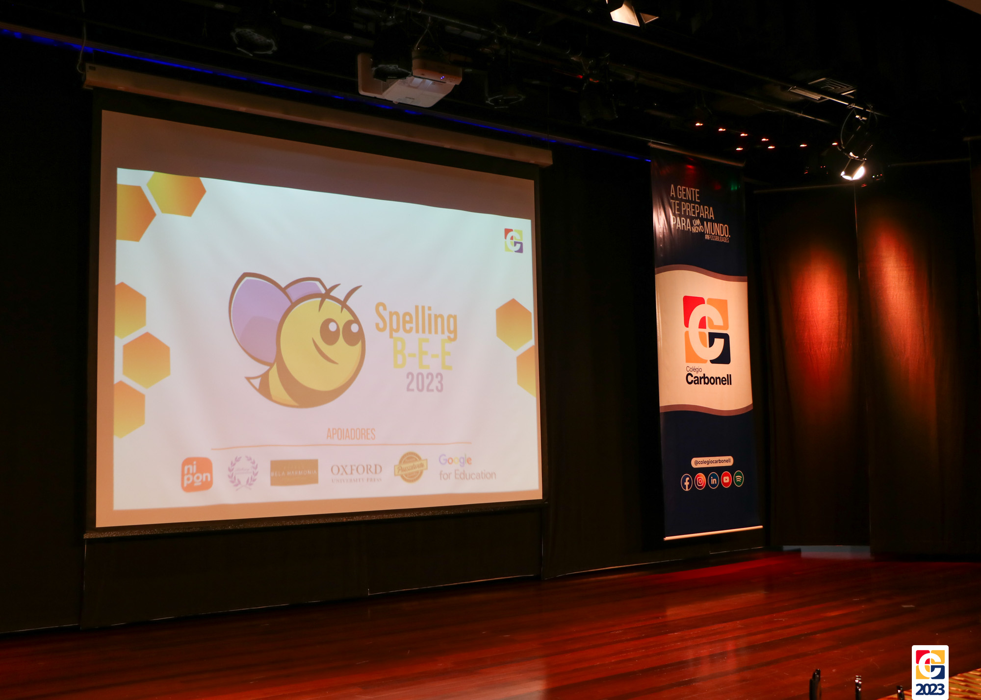 Mais uma vez, o Teatro Oswaldo Mazoni foi palco do Spelling Bee — competição de soletração em inglês para alunos dos Anos Iniciais ao Ensino Médio. A edição de 2023 aconteceu no último sábado (12), faz parte do currículo de inglês do Carbonell Language Program e foi iniciada já há alguns meses, em março, com etapas eliminatórias em grupos: 4º e 5º anos, 6º e 7º anos, 8º e 9º anos e, por fim, jovens do Ensino Médio. 💬